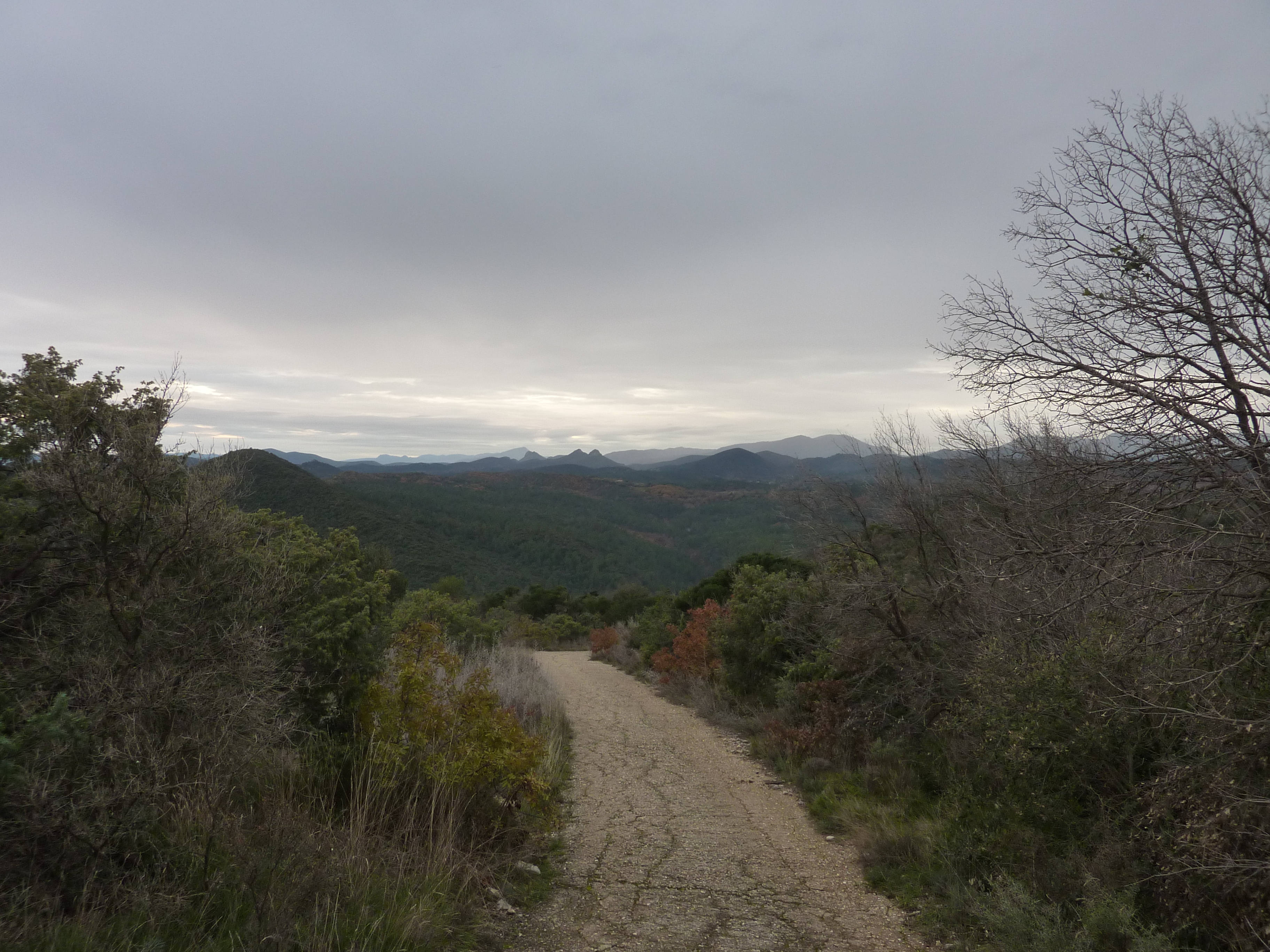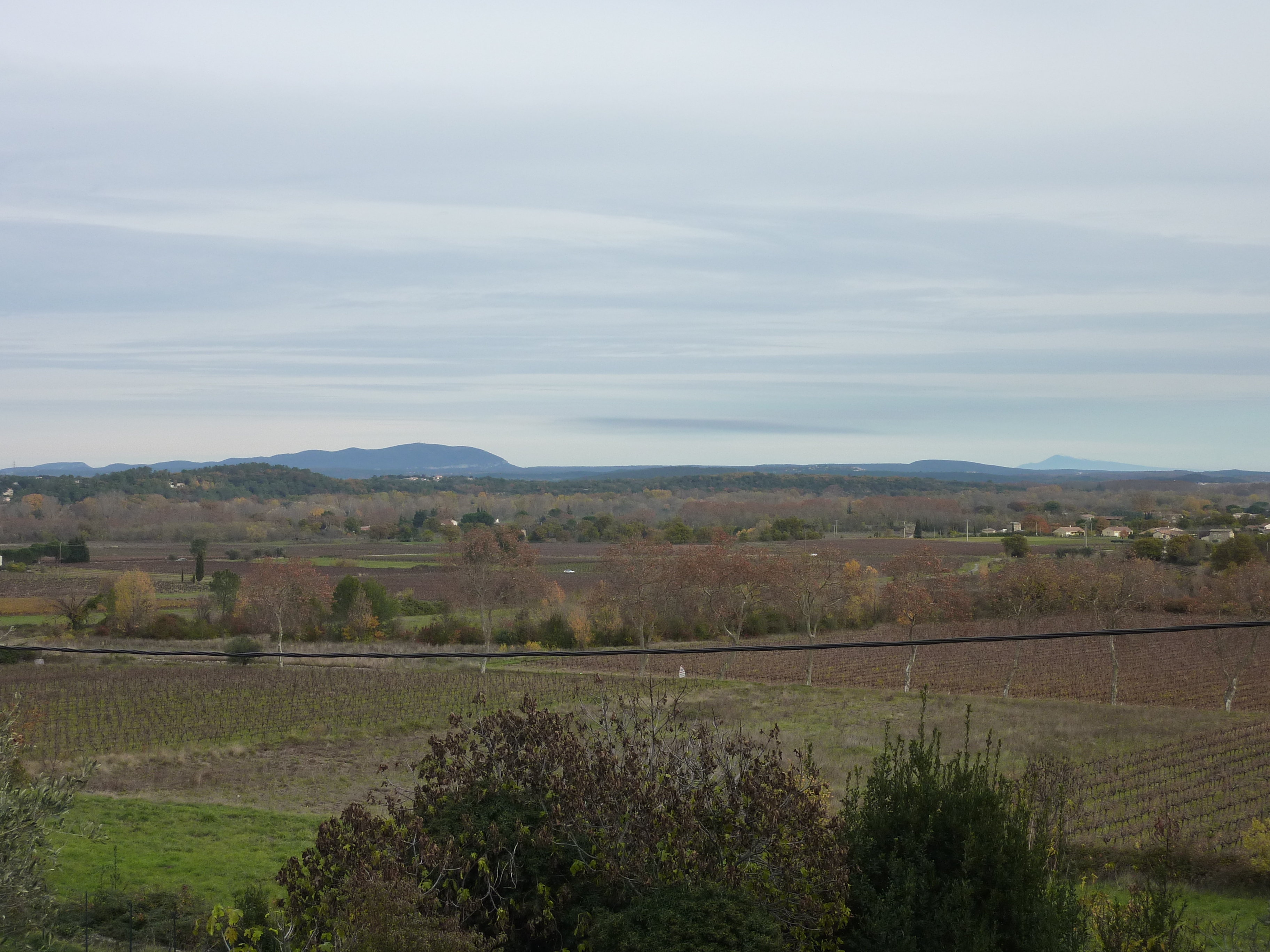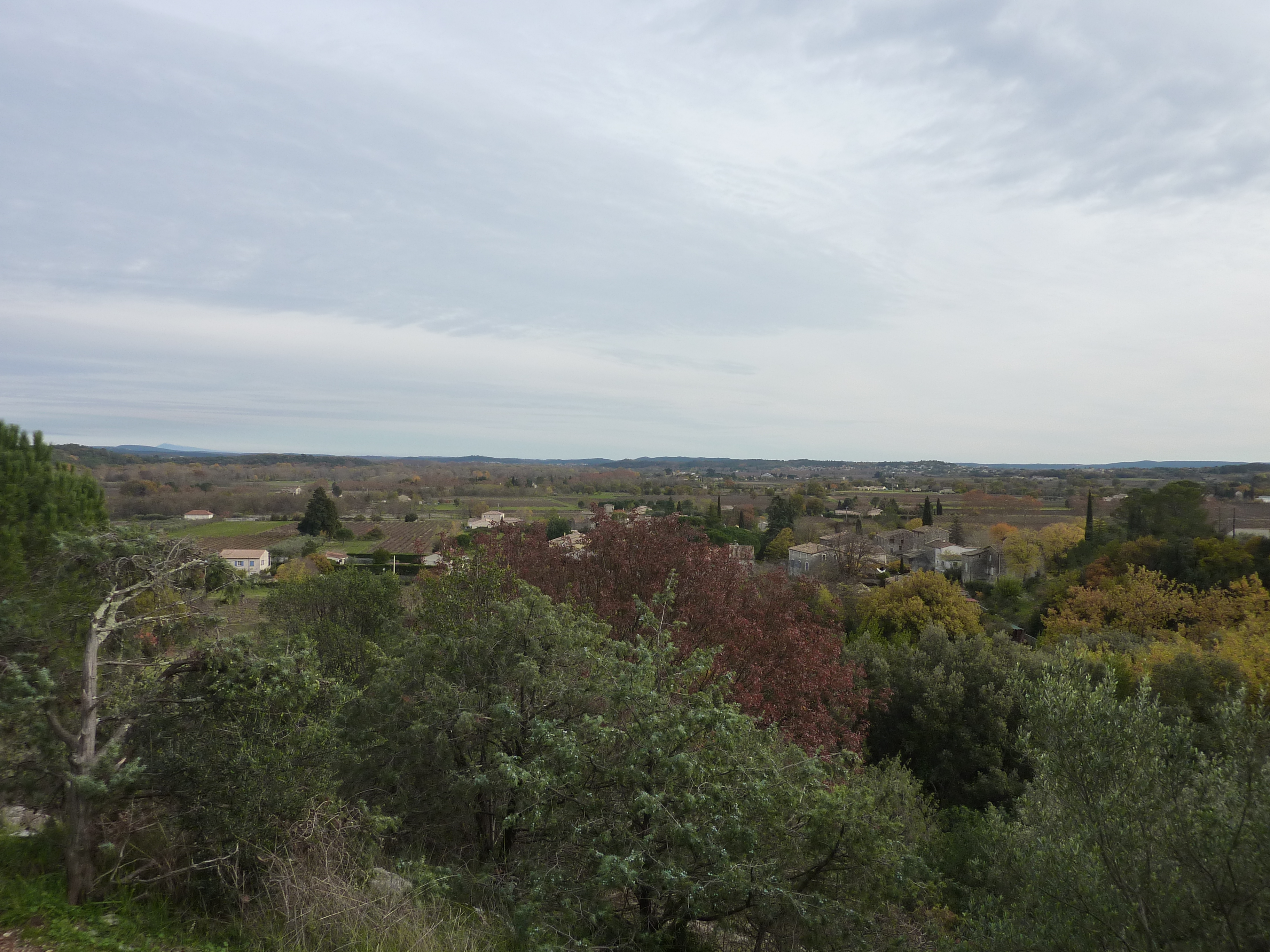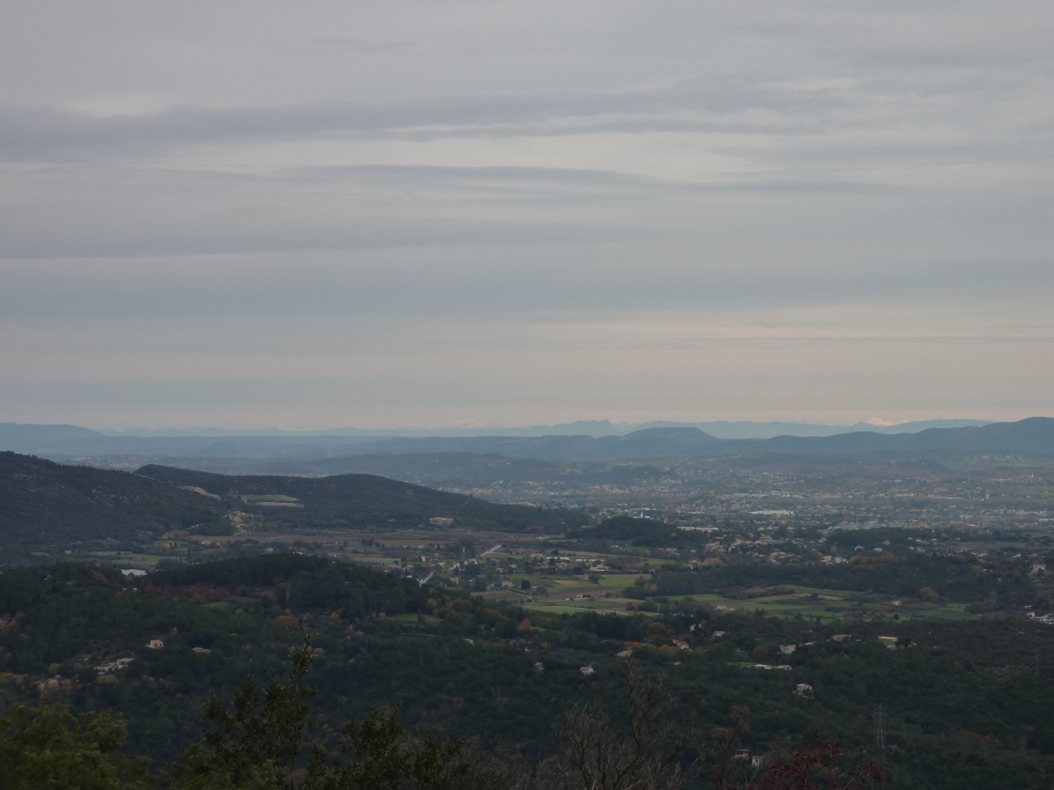 Arrivée au sommet de Lacan (424 m) : malgré le ciel gris, très belle vue sur les Cévennes et la plaine gardoise jusqu'au littoral ; le Ventoux ainsi que les Alpes enneigées lointaines sont également visibles !