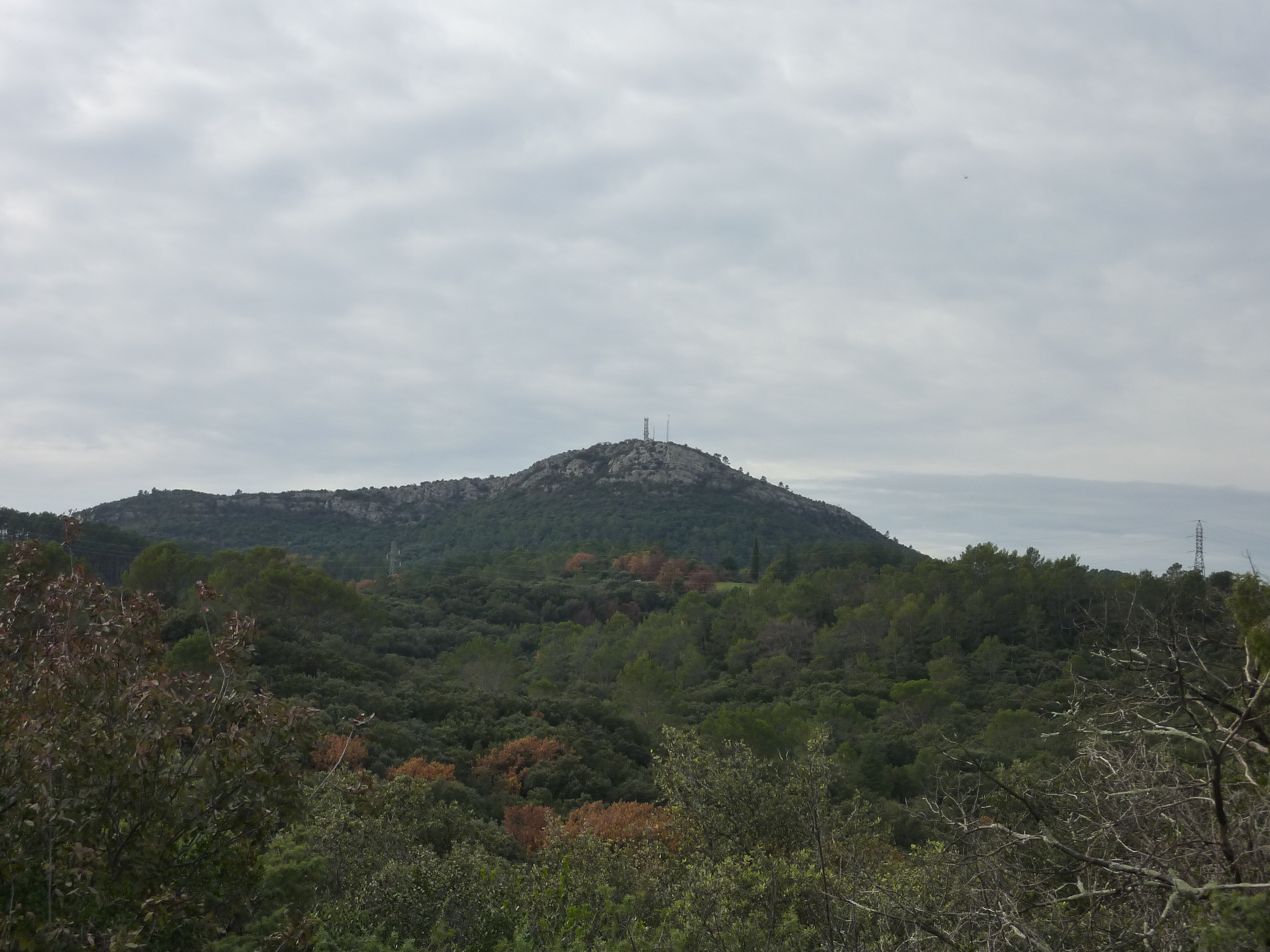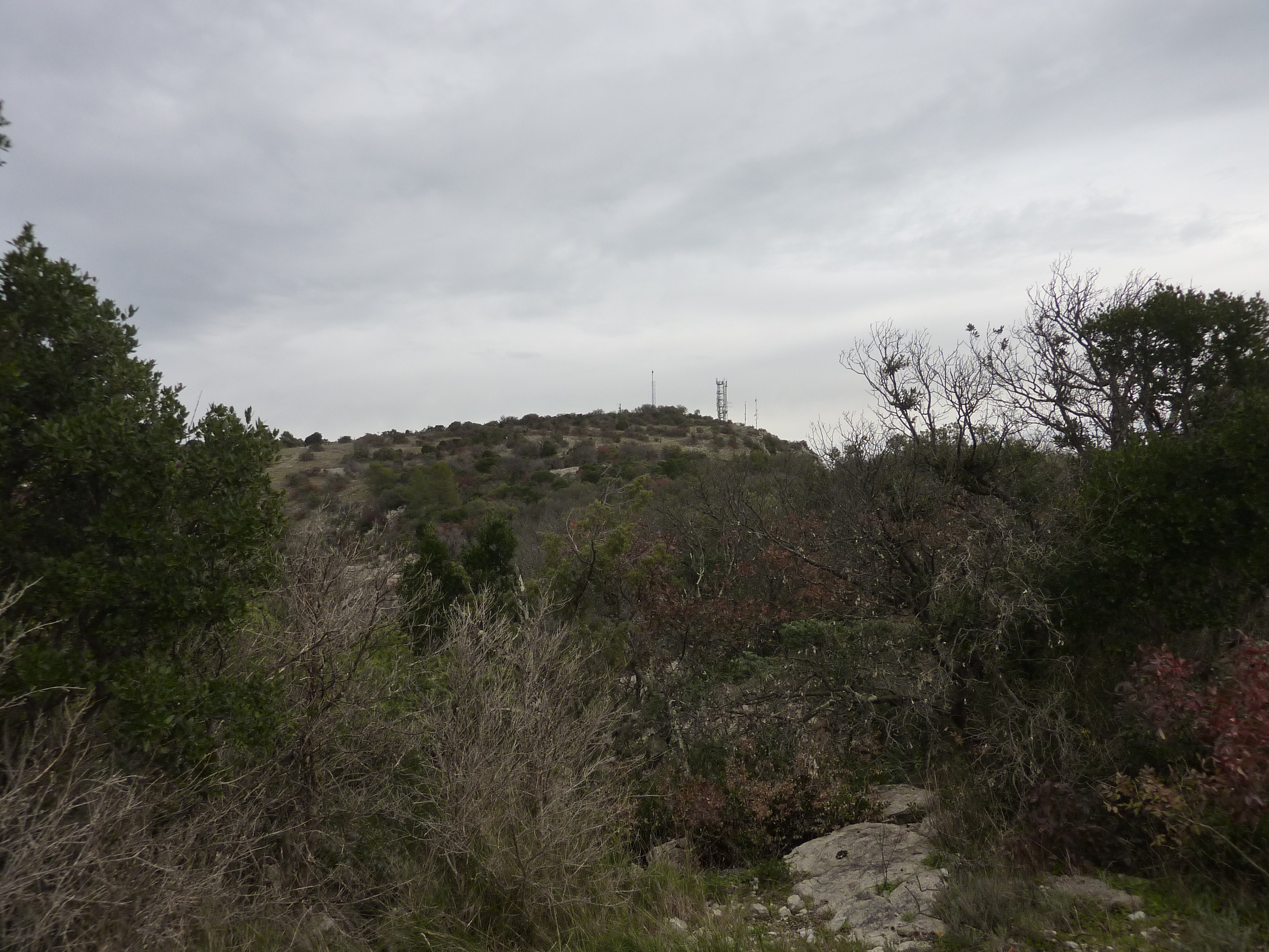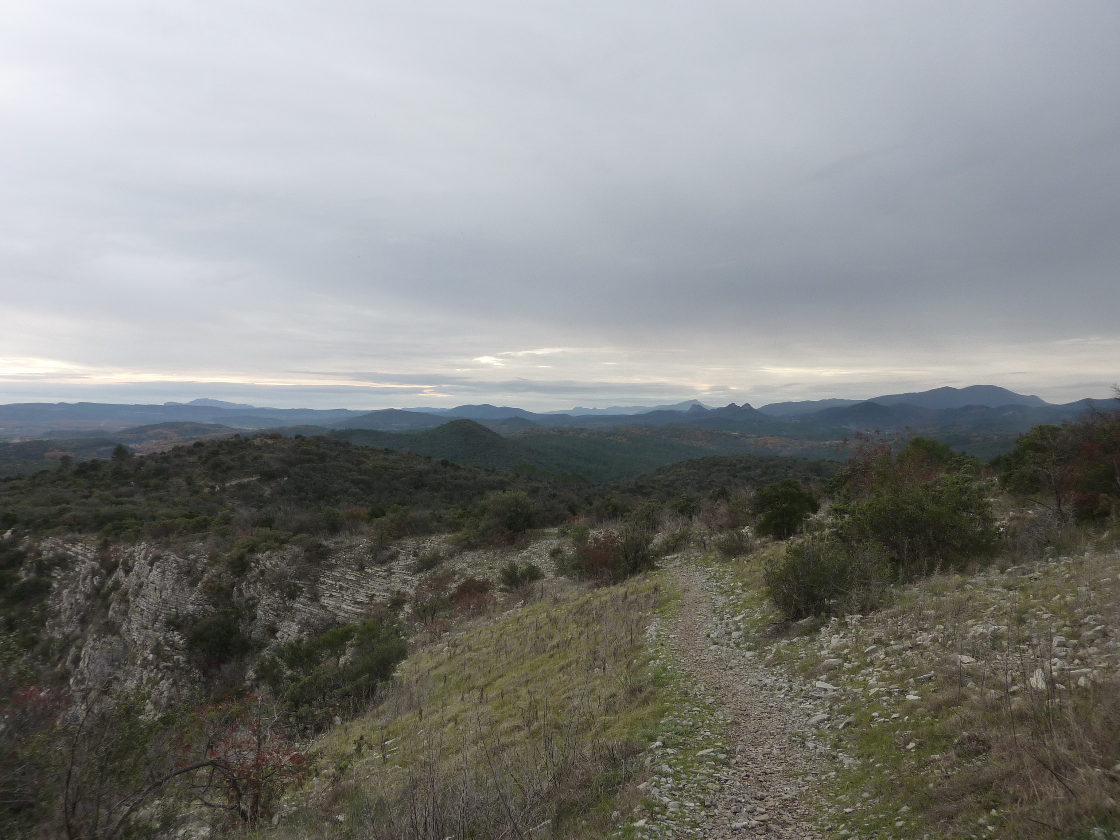Arrivée au sommet de Lacan (424 m) : malgré le ciel gris, très belle vue sur les Cévennes et la plaine gardoise jusqu'au littoral ; le Ventoux ainsi que les Alpes enneigées lointaines sont également visibles !