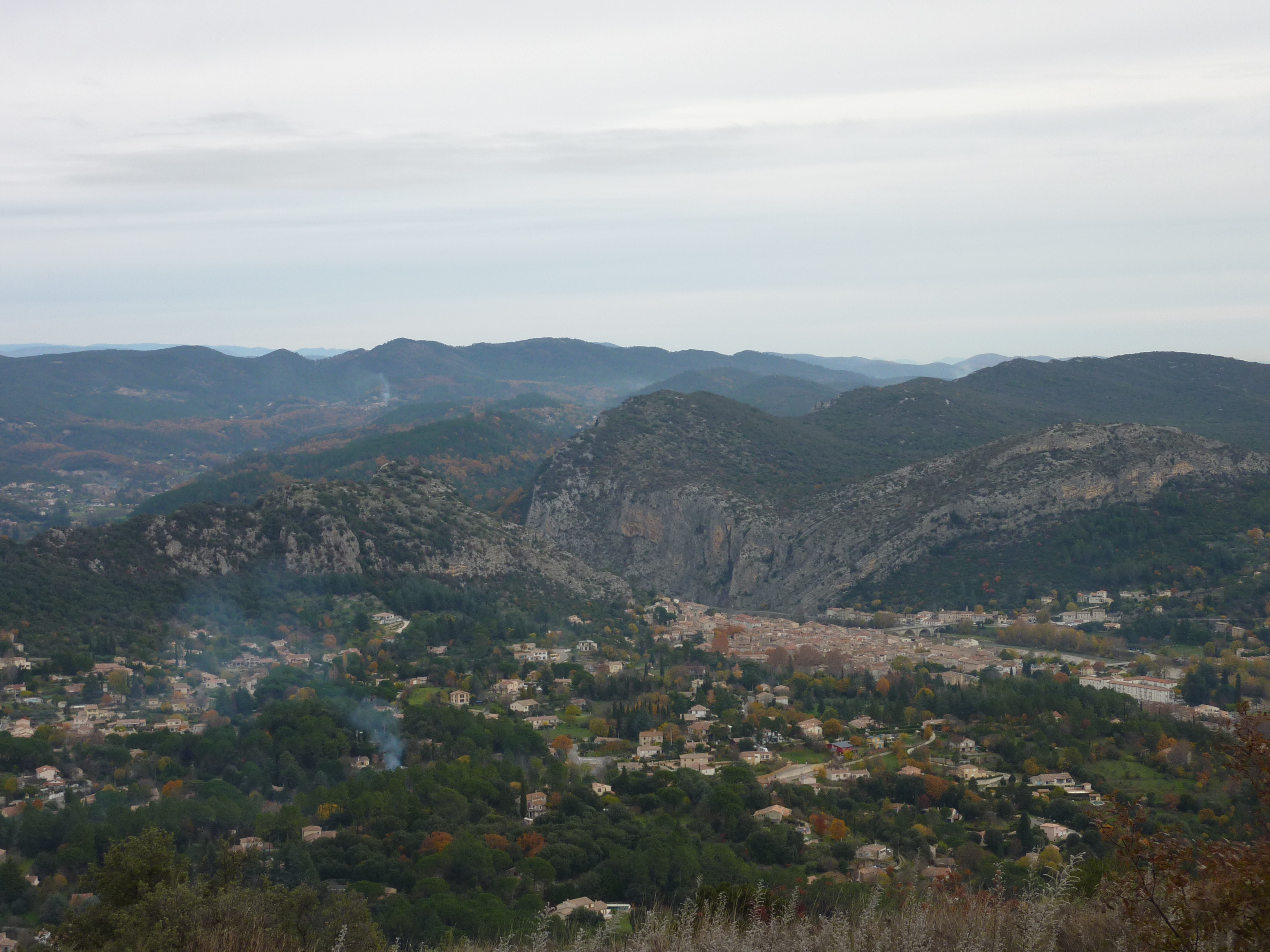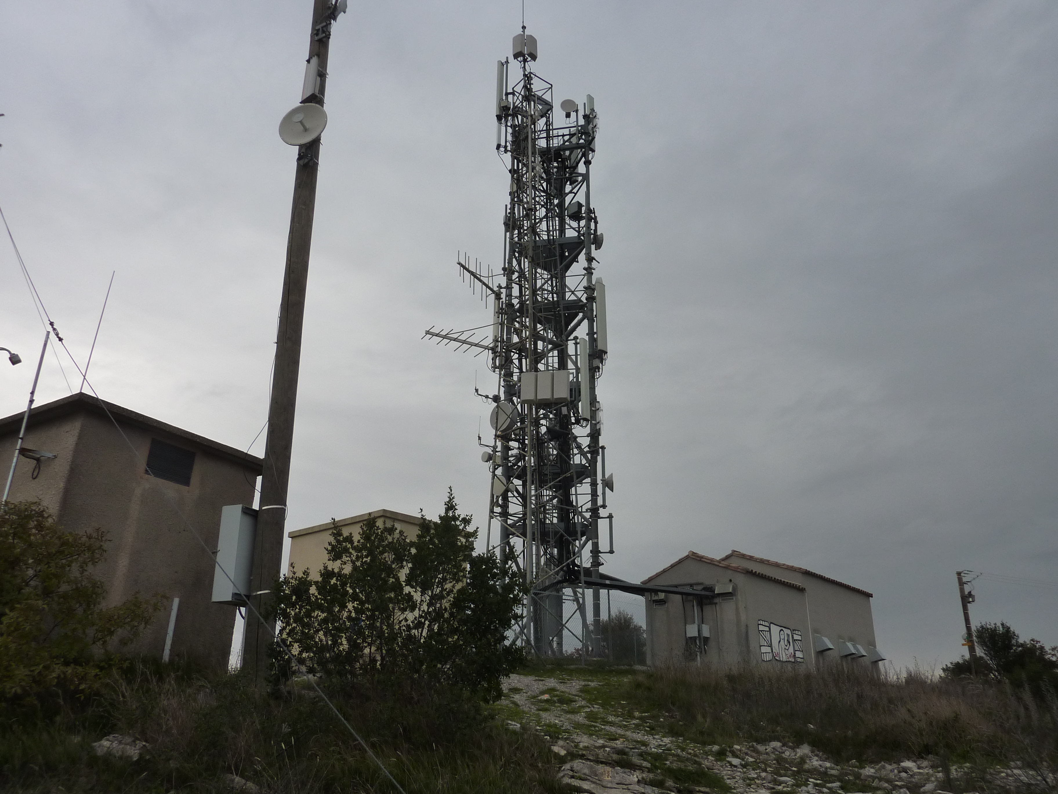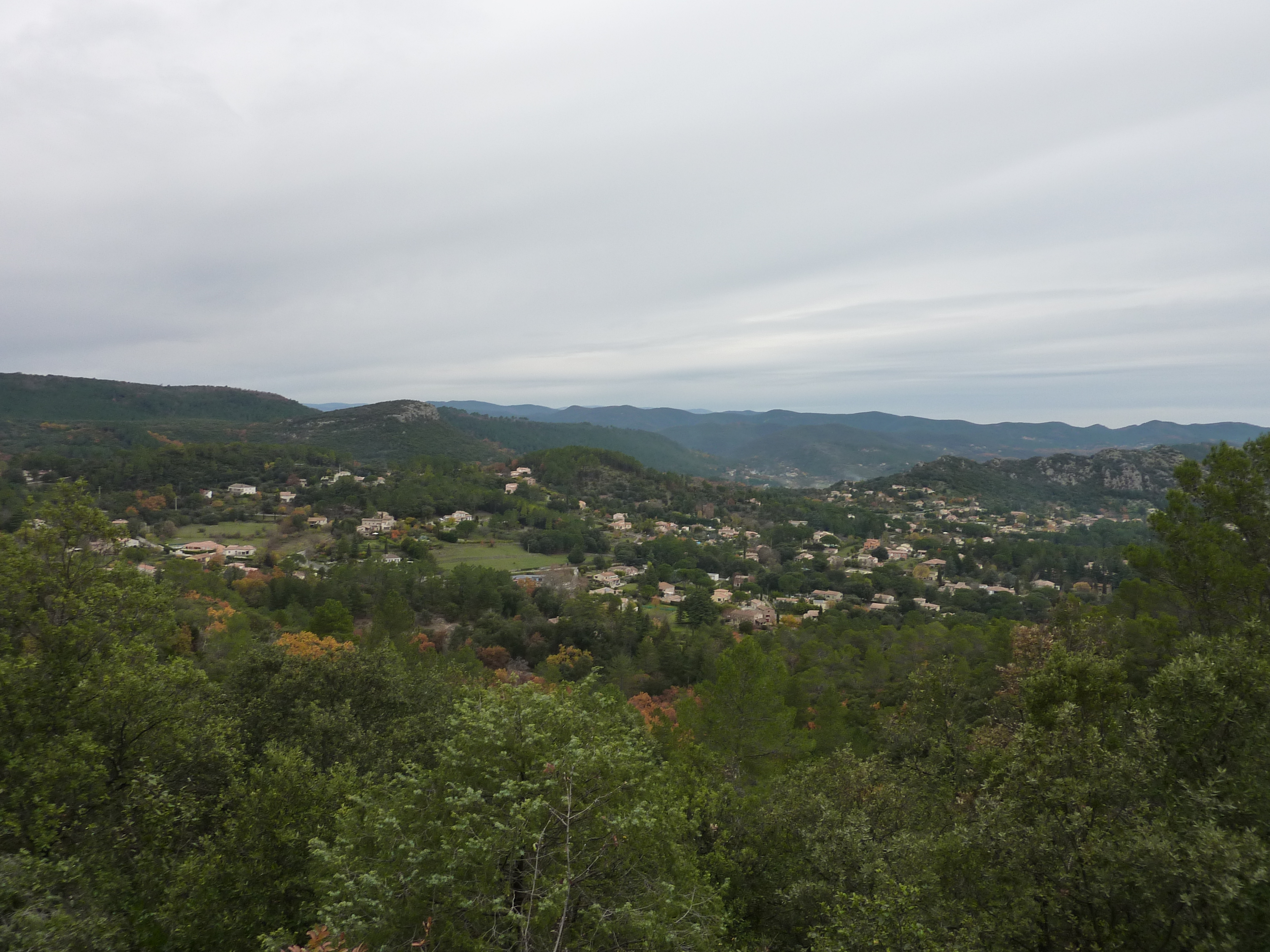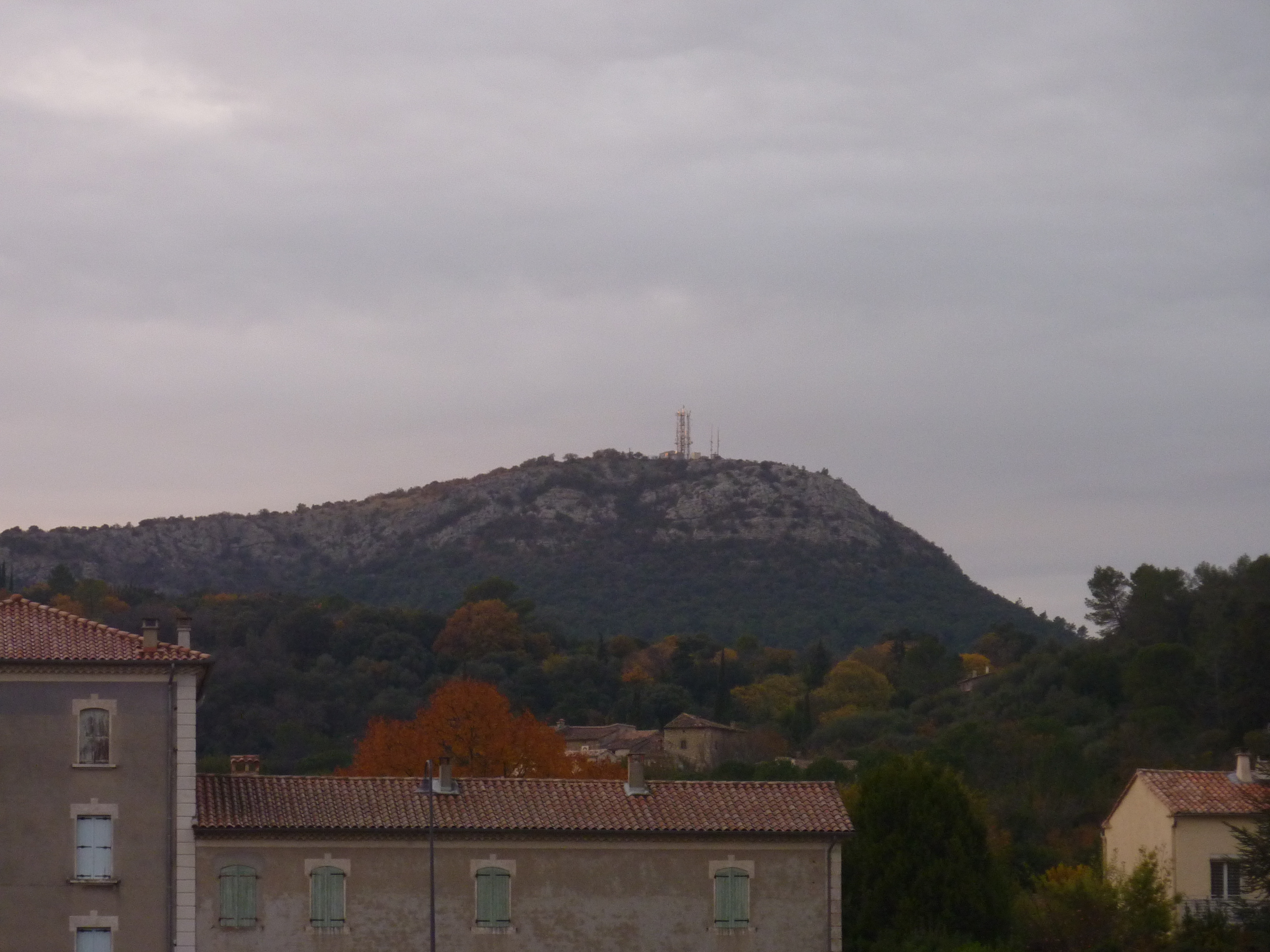 Arrivée au sommet de Lacan (424 m) : malgré le ciel gris, très belle vue sur les Cévennes et la plaine gardoise jusqu'au littoral ; le Ventoux ainsi que les Alpes enneigées lointaines sont également visibles !