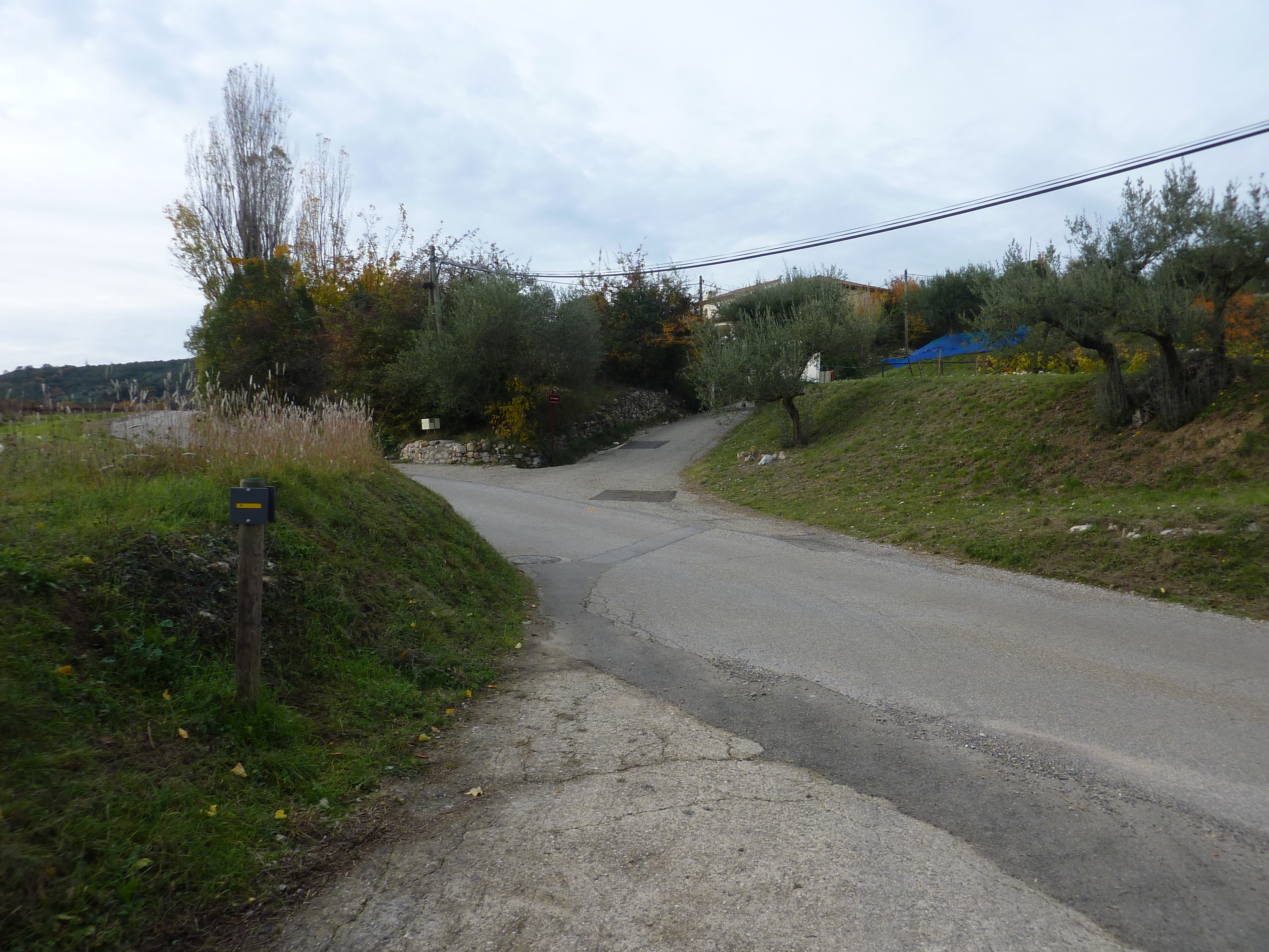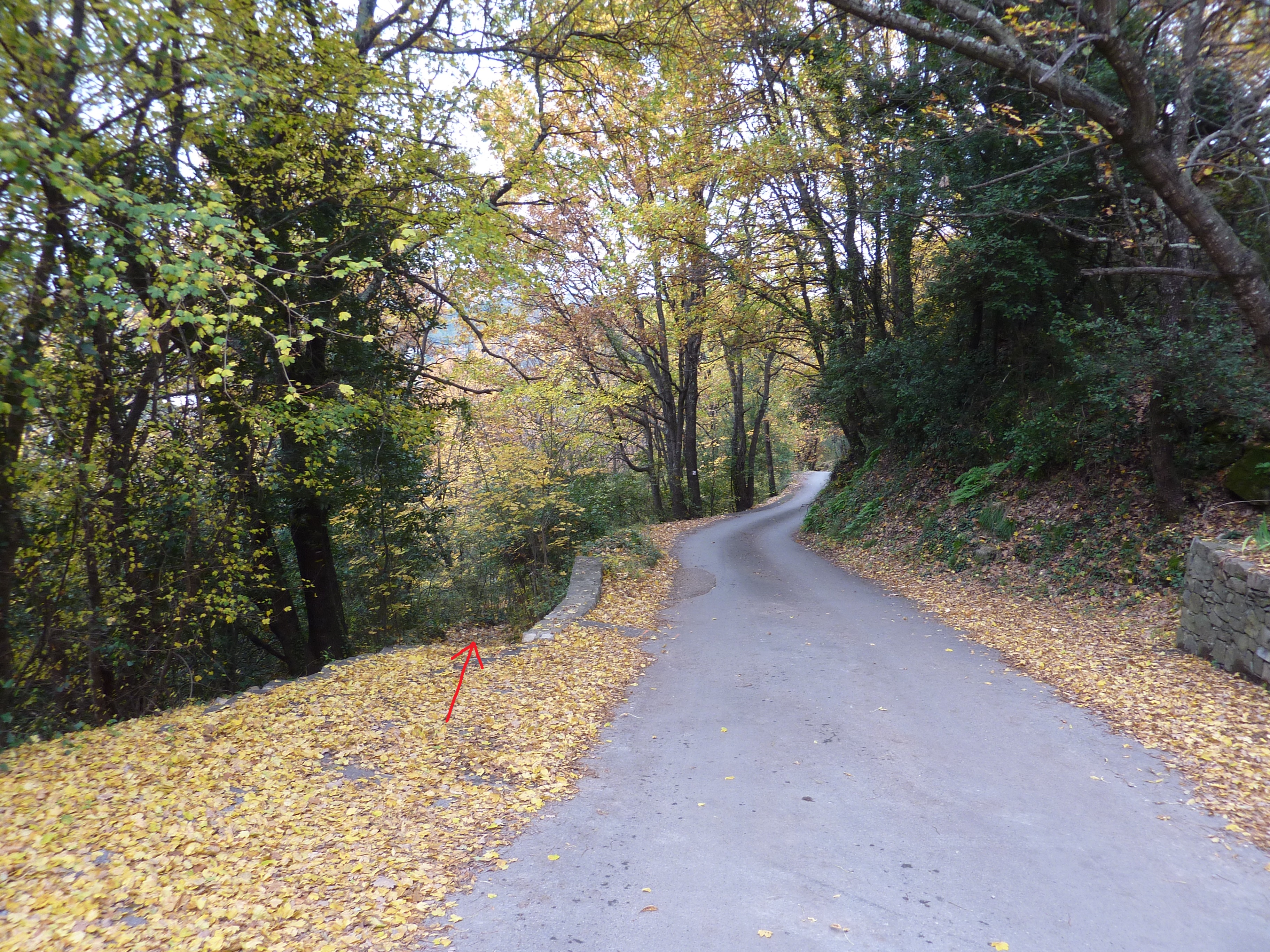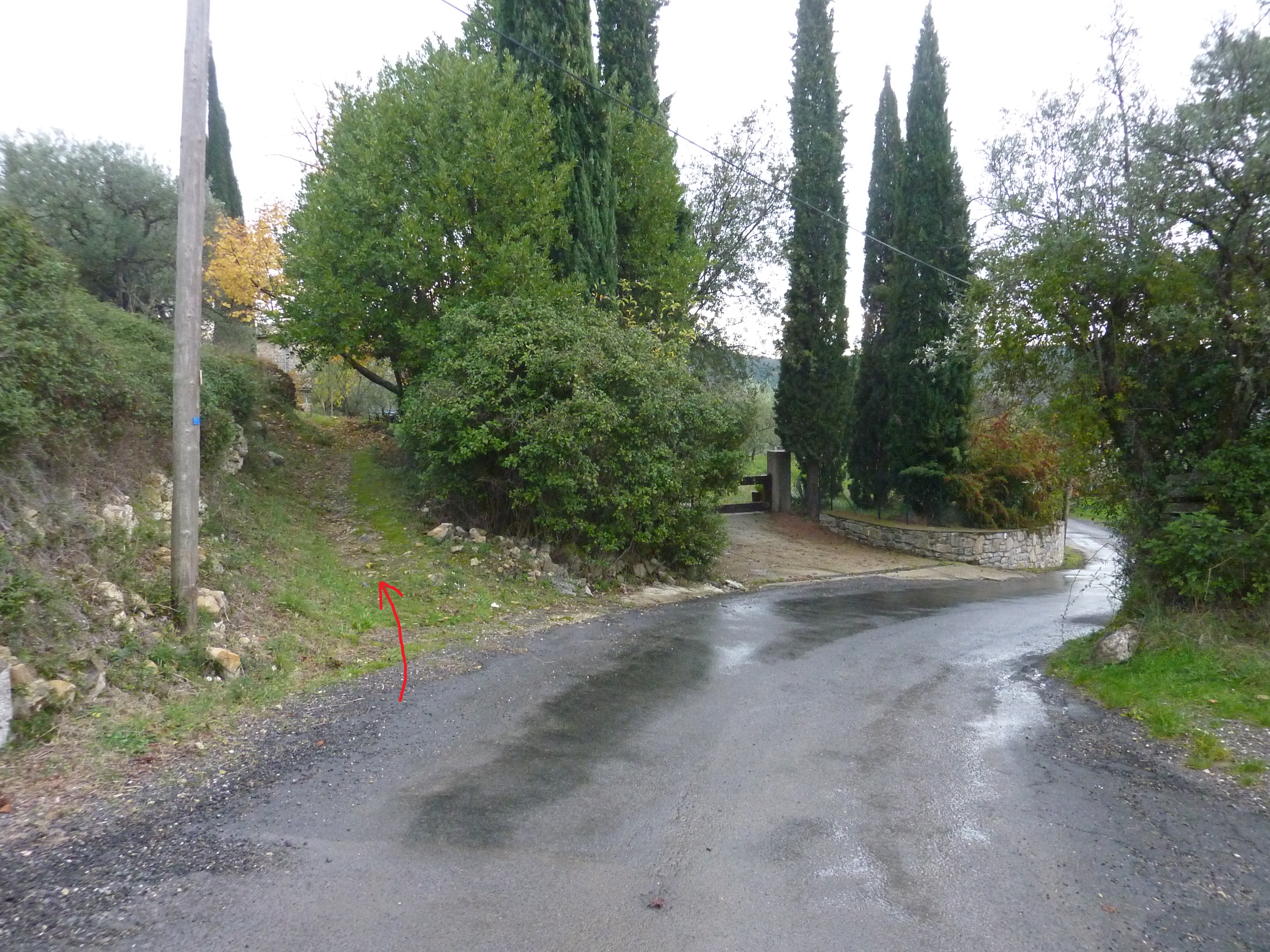 A cette intersection au bout de la raide descente (200 mètres après le lieu-dit "Tavion"), suivre la rue descendant sur la droite direction Anduze, balisé en rouge et blanc, et en jaune