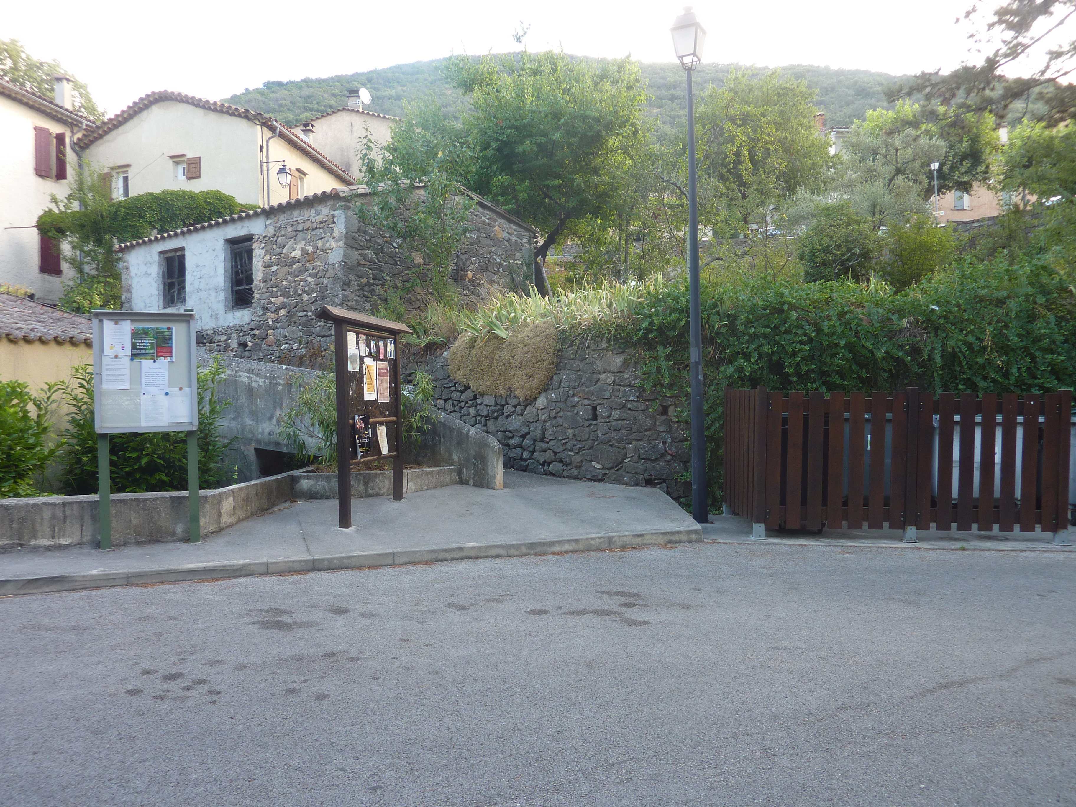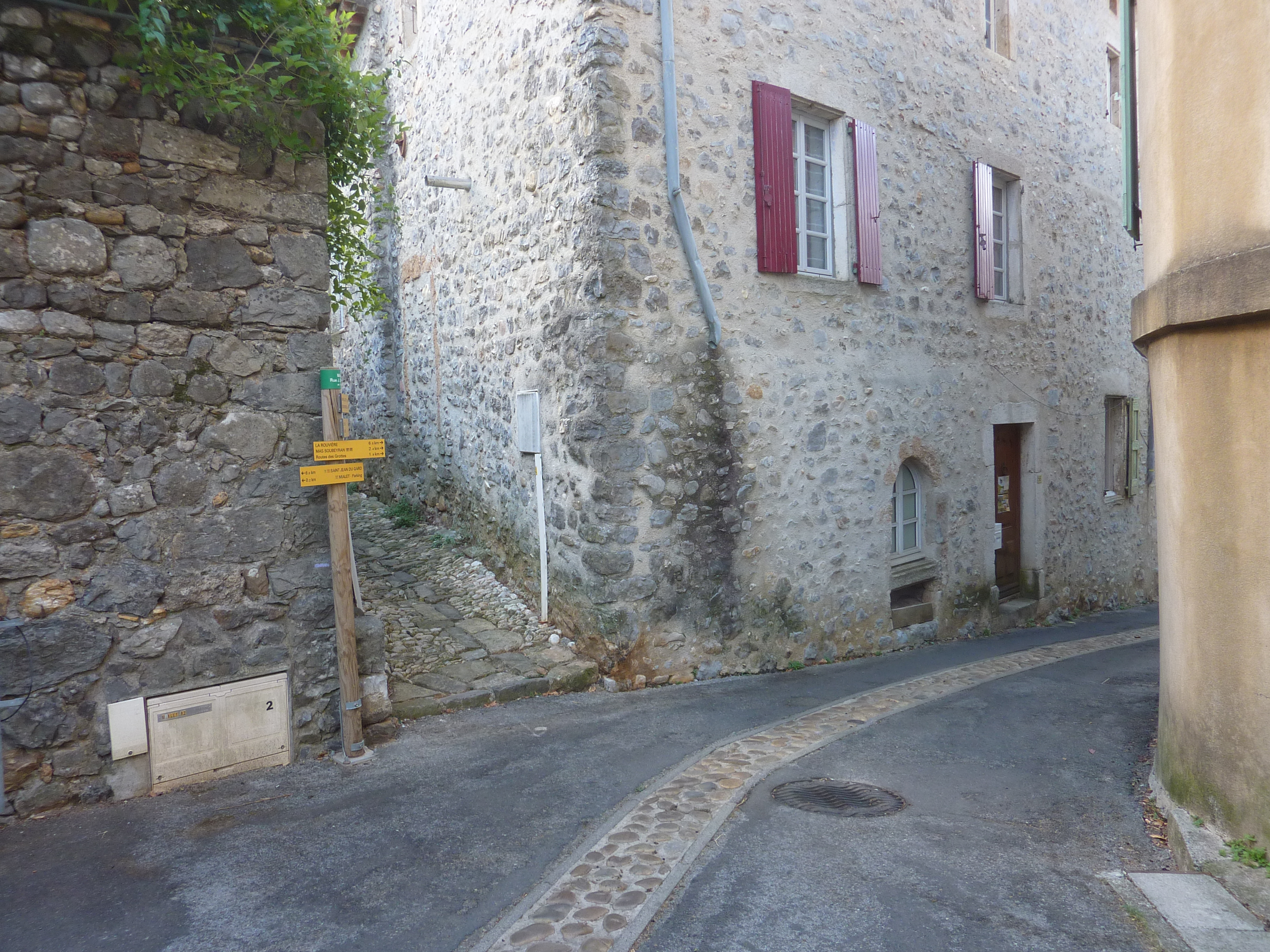 Le Temple (189 m) : suivre la ruelle partant tout droit direction l'Escoudas, balisé en rouge et blanc, et en jaune (il est possible d'écourter la boucle en partant directement sur la gauche et en suivant la direction "Combe Male")