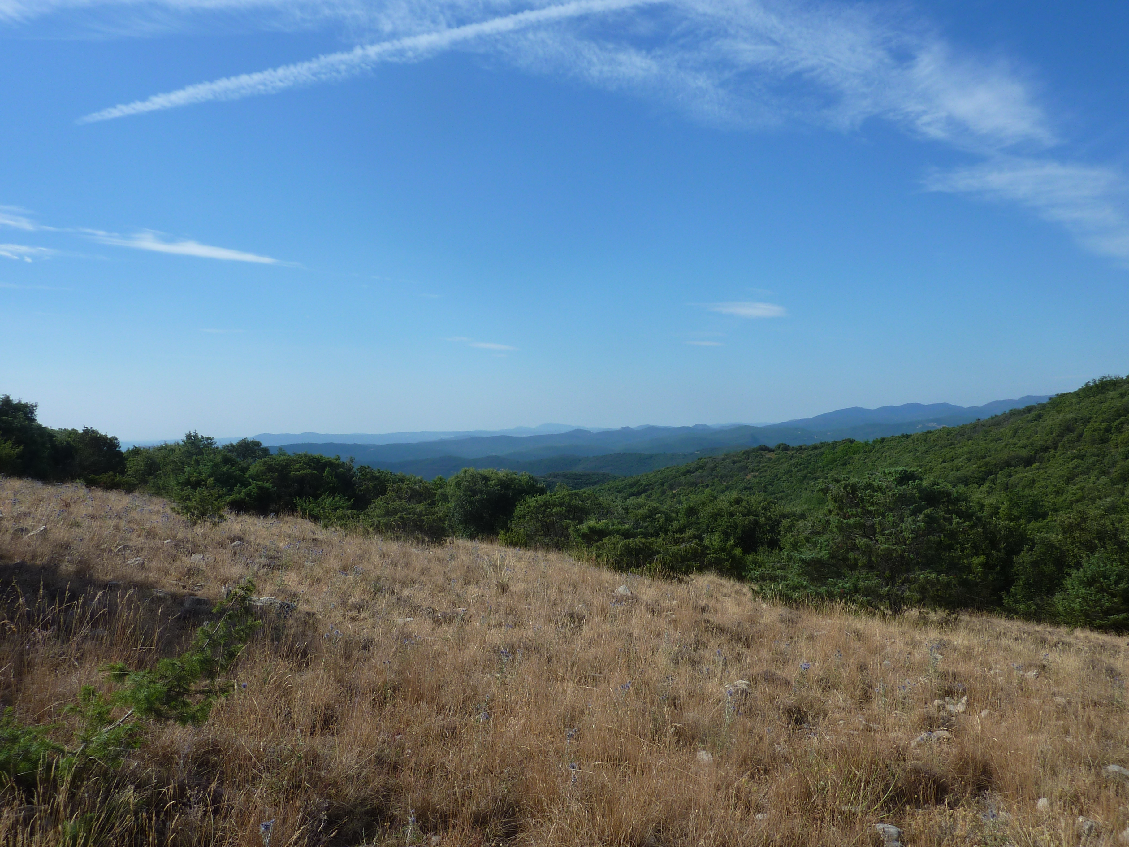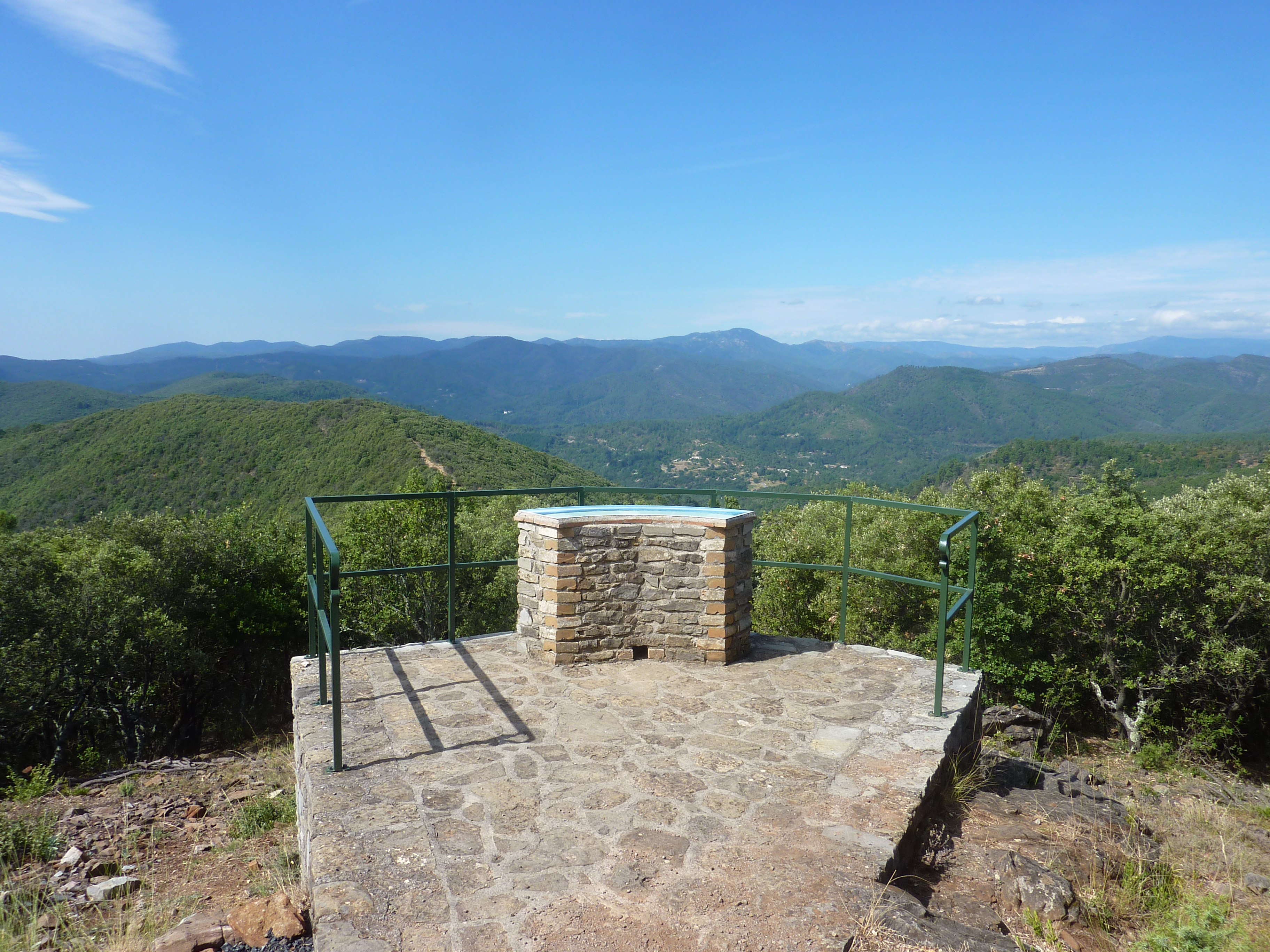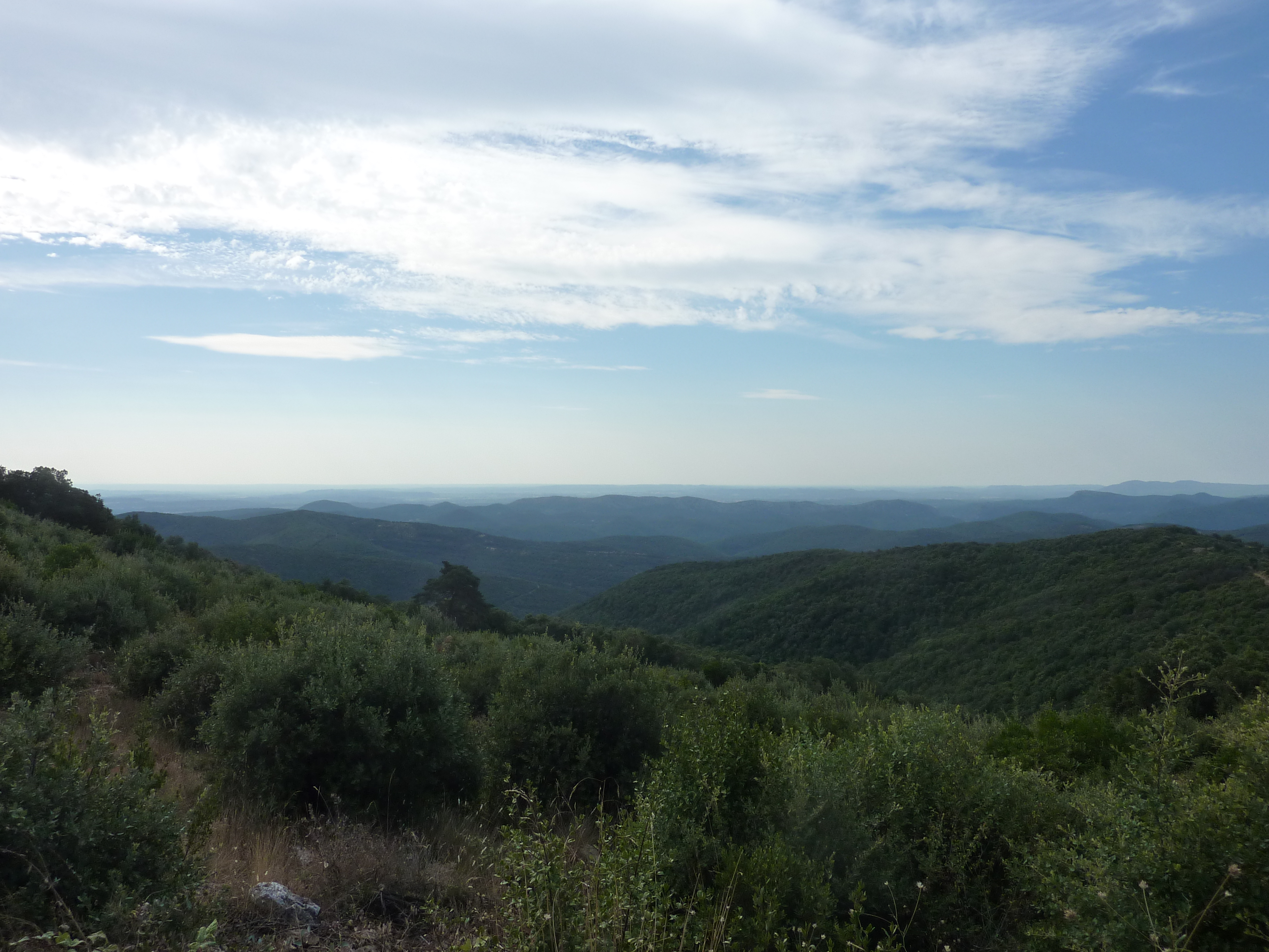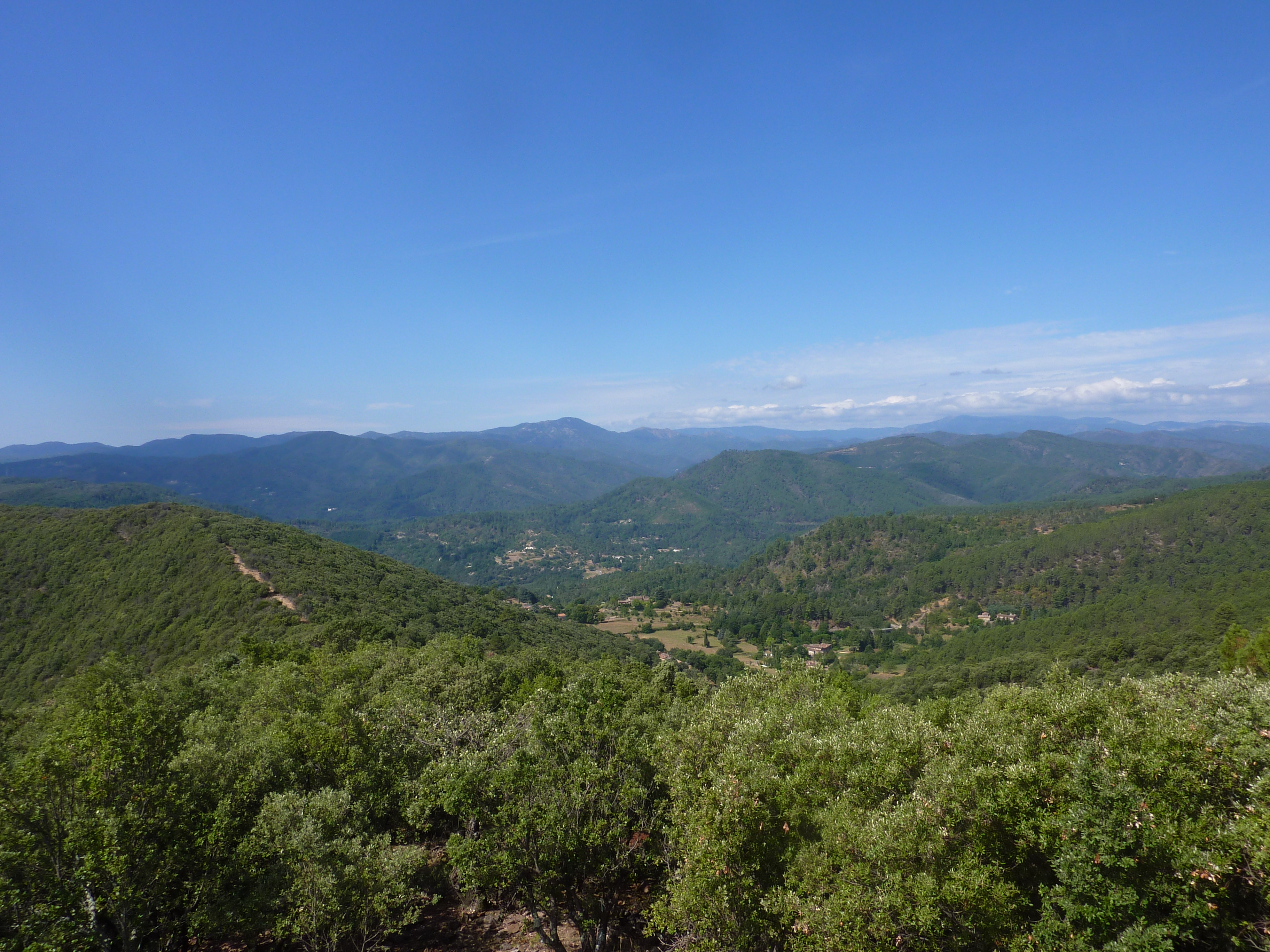 Arrivée au sommet des Suquets (558 m) : beau panorama sur les sommets de la Vallée Borgne et de la Haute Vallée de l'Hérault, sur le Piémont gardois et le Pic Saint-Loup, sur la Vallée de Mialet ...