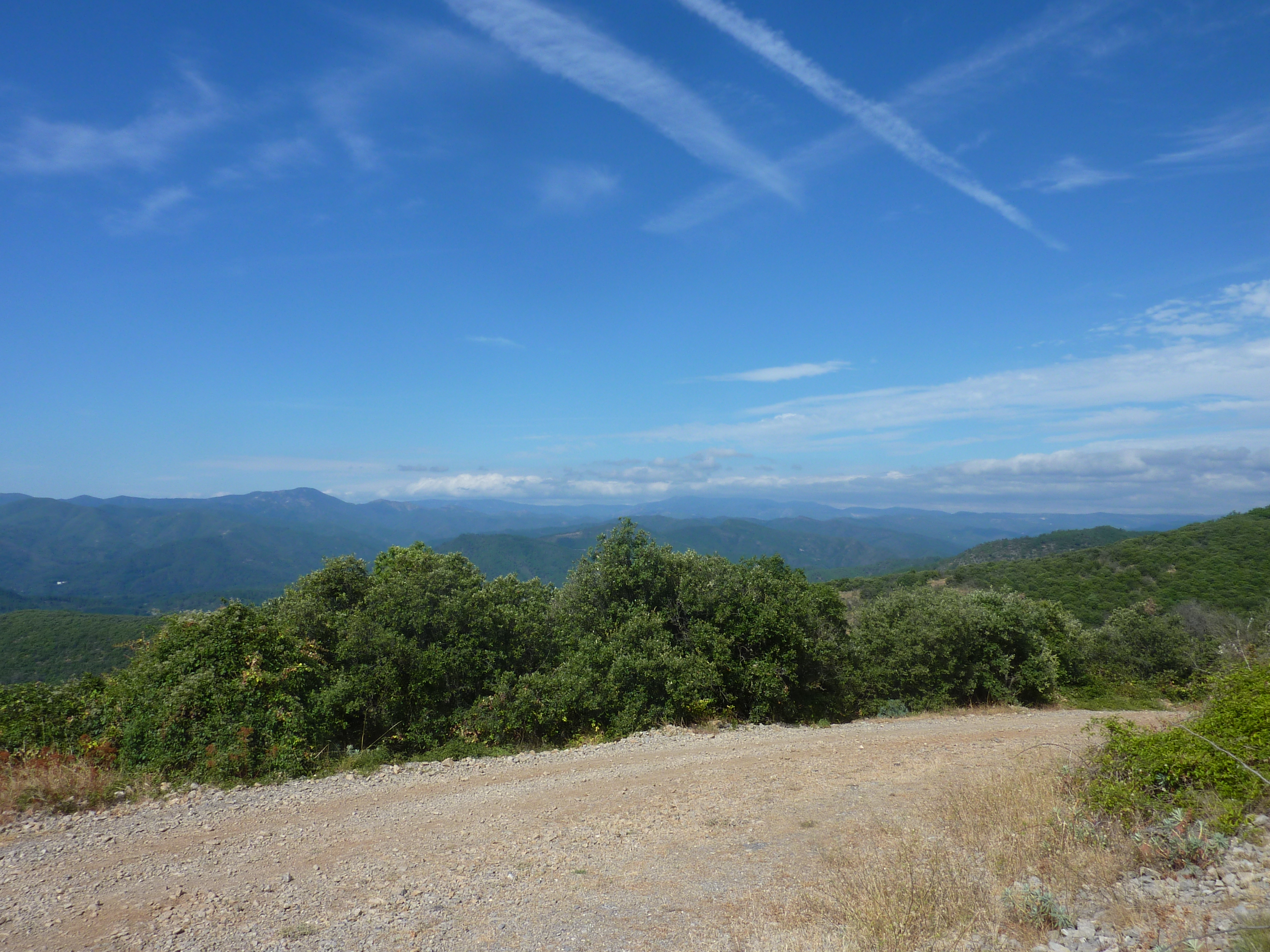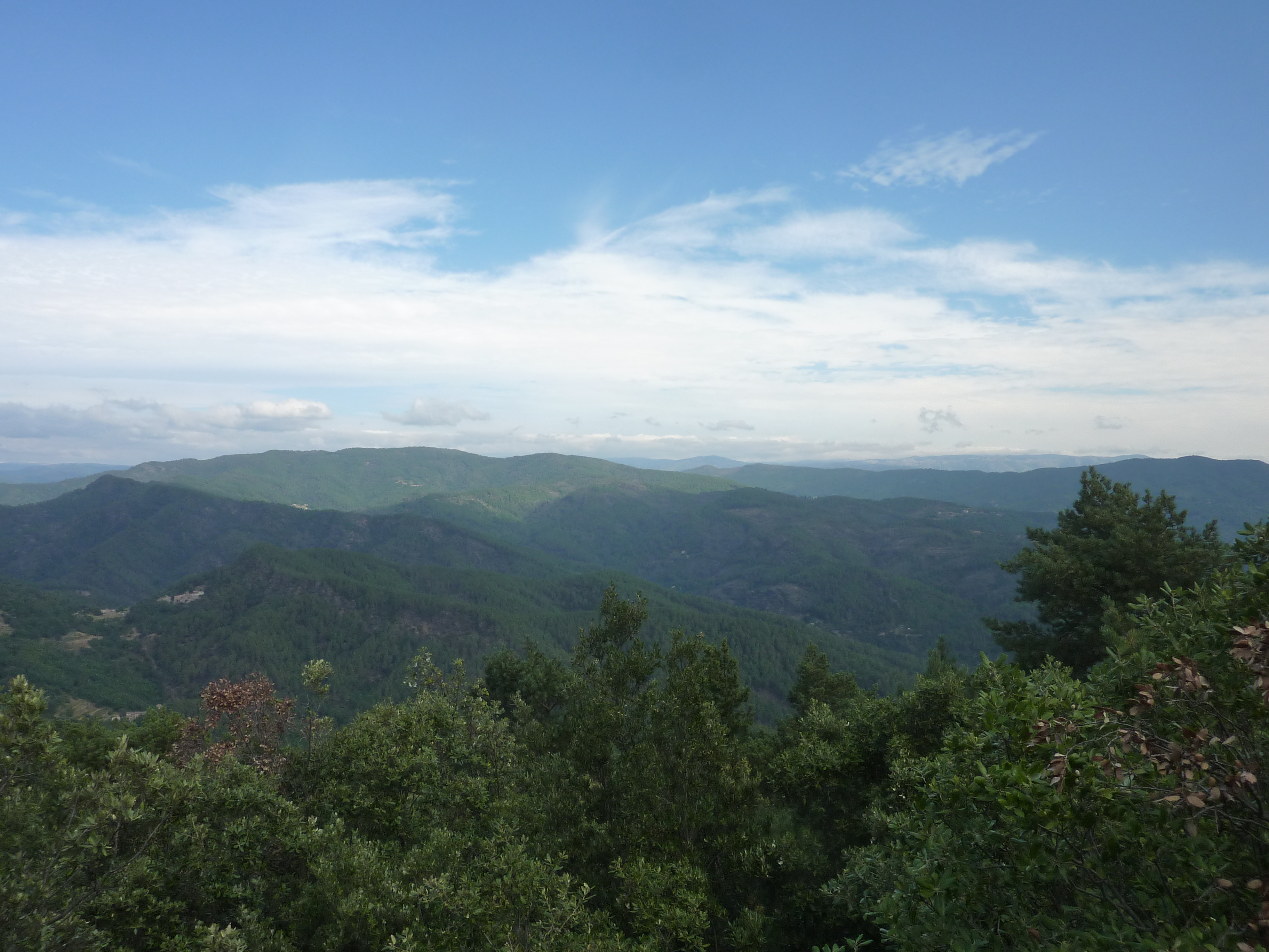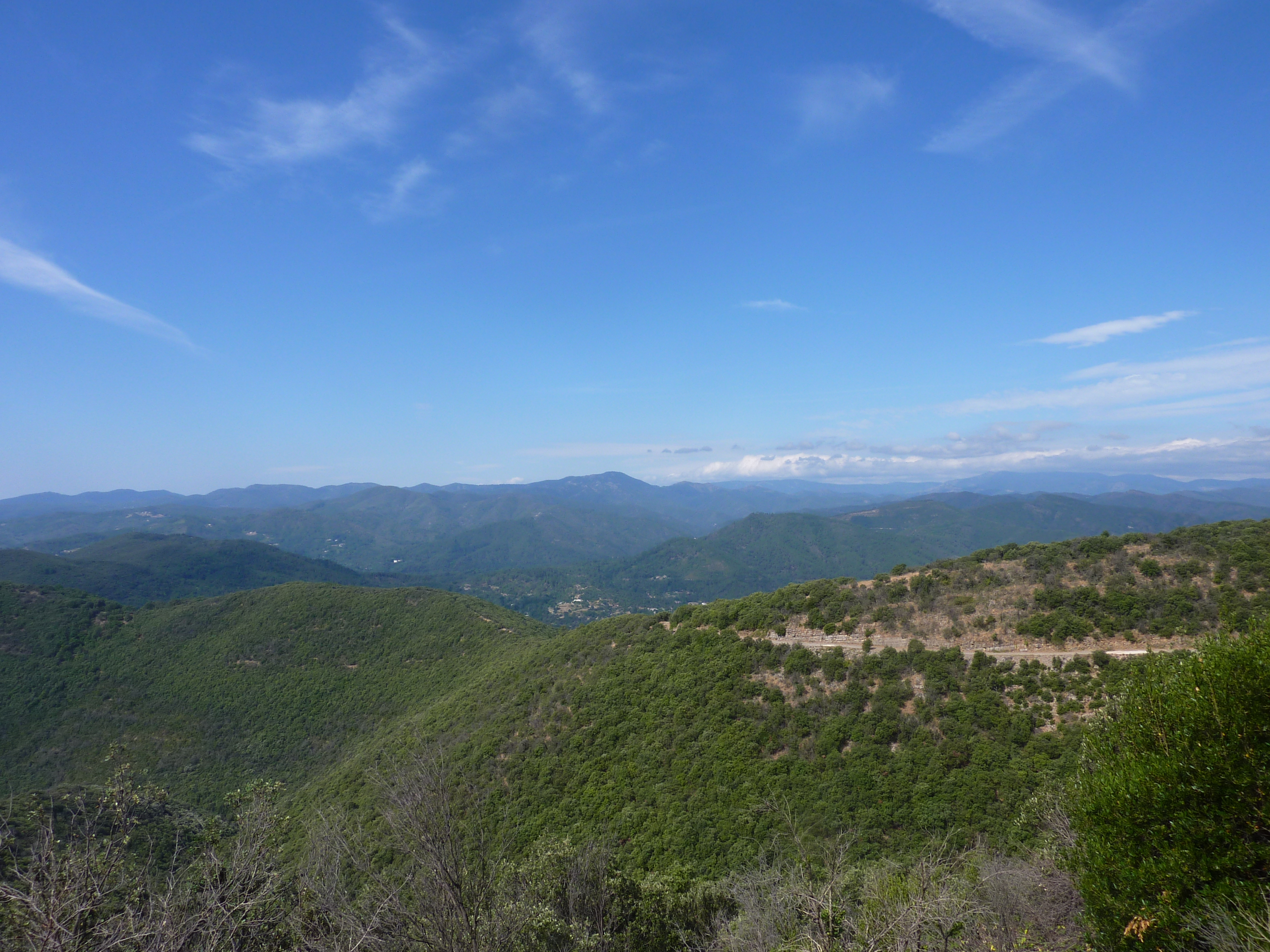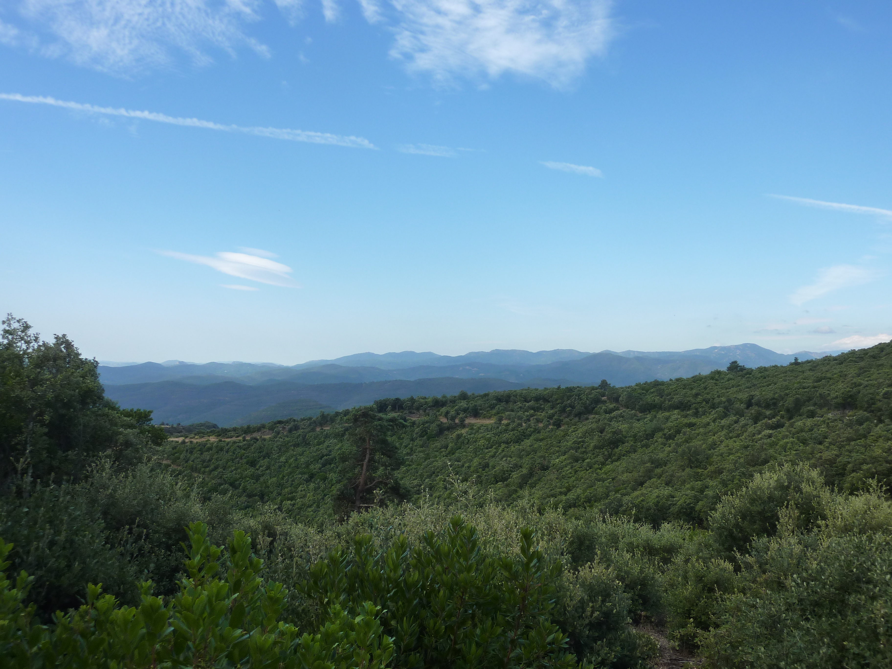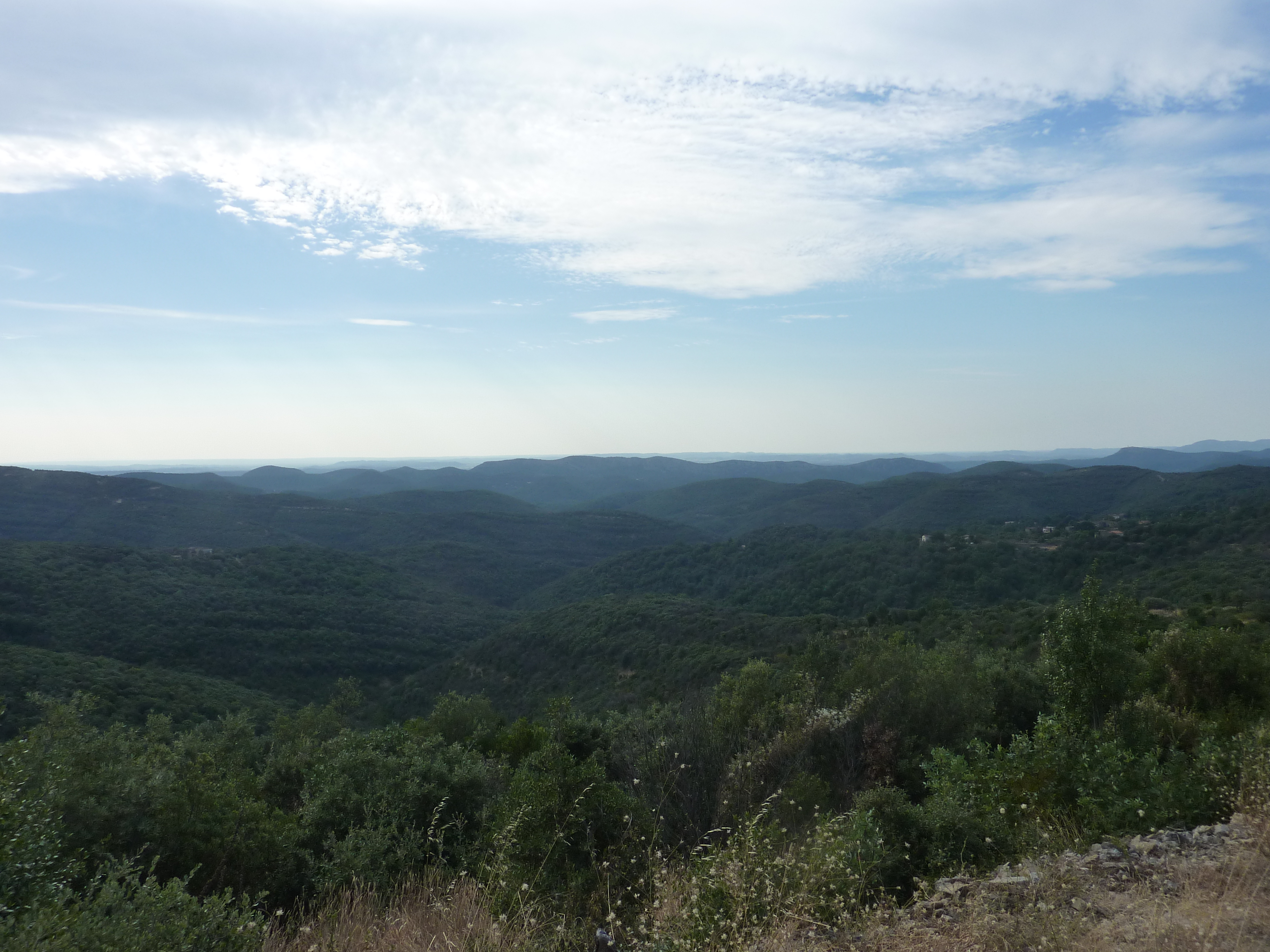 Arrivée au sommet des Suquets (558 m) : beau panorama sur les sommets de la Vallée Borgne et de la Haute Vallée de l'Hérault, sur le Piémont gardois et le Pic Saint-Loup, sur la Vallée de Mialet ...