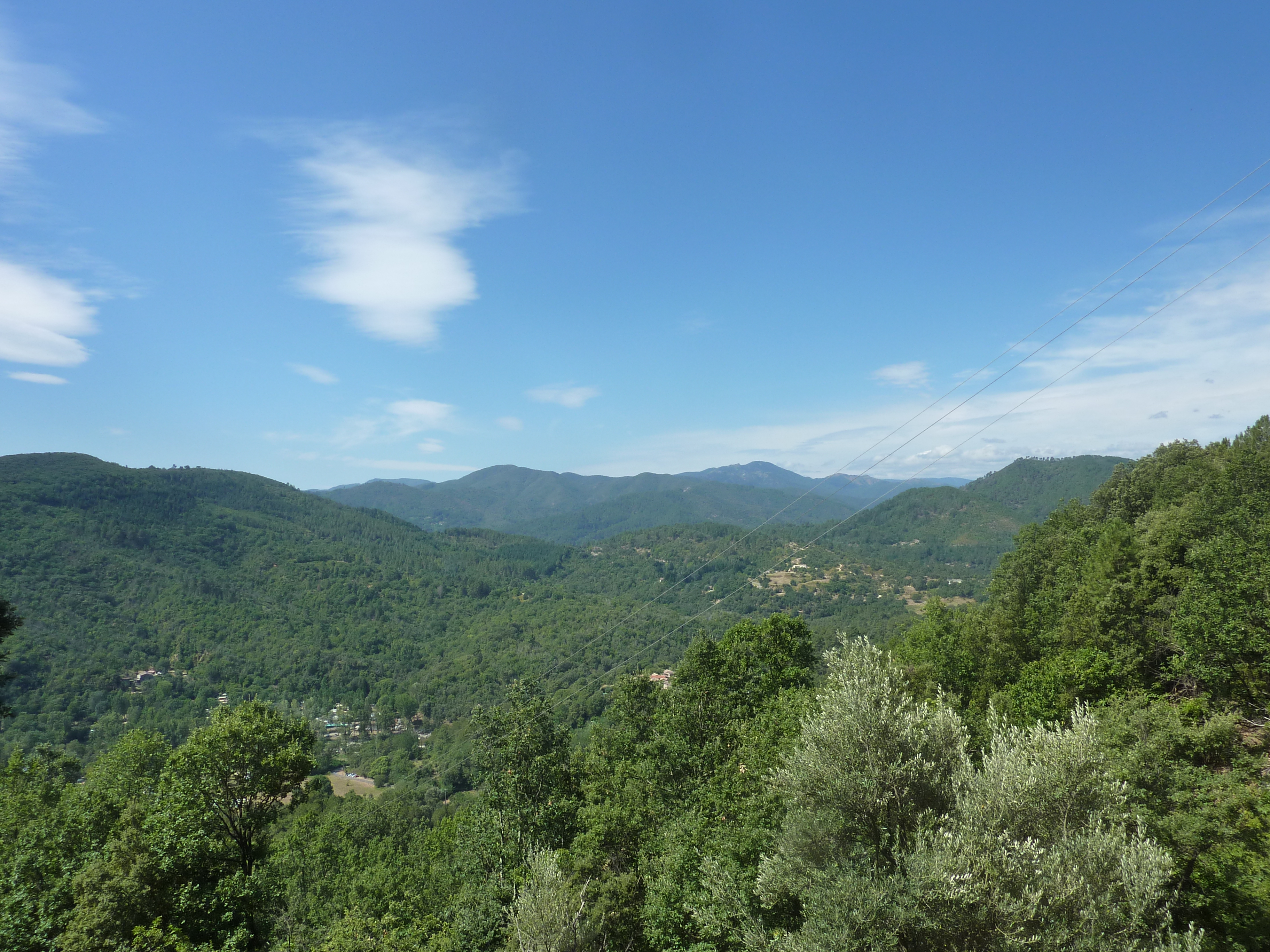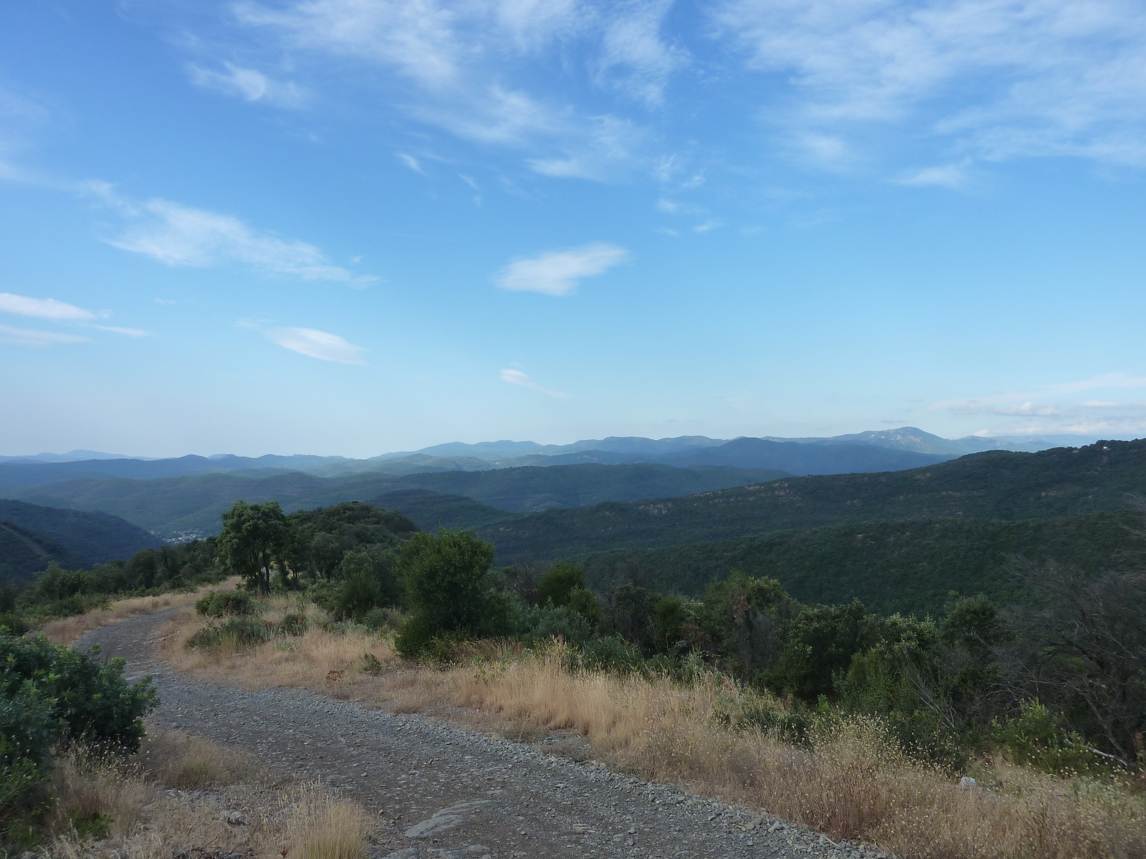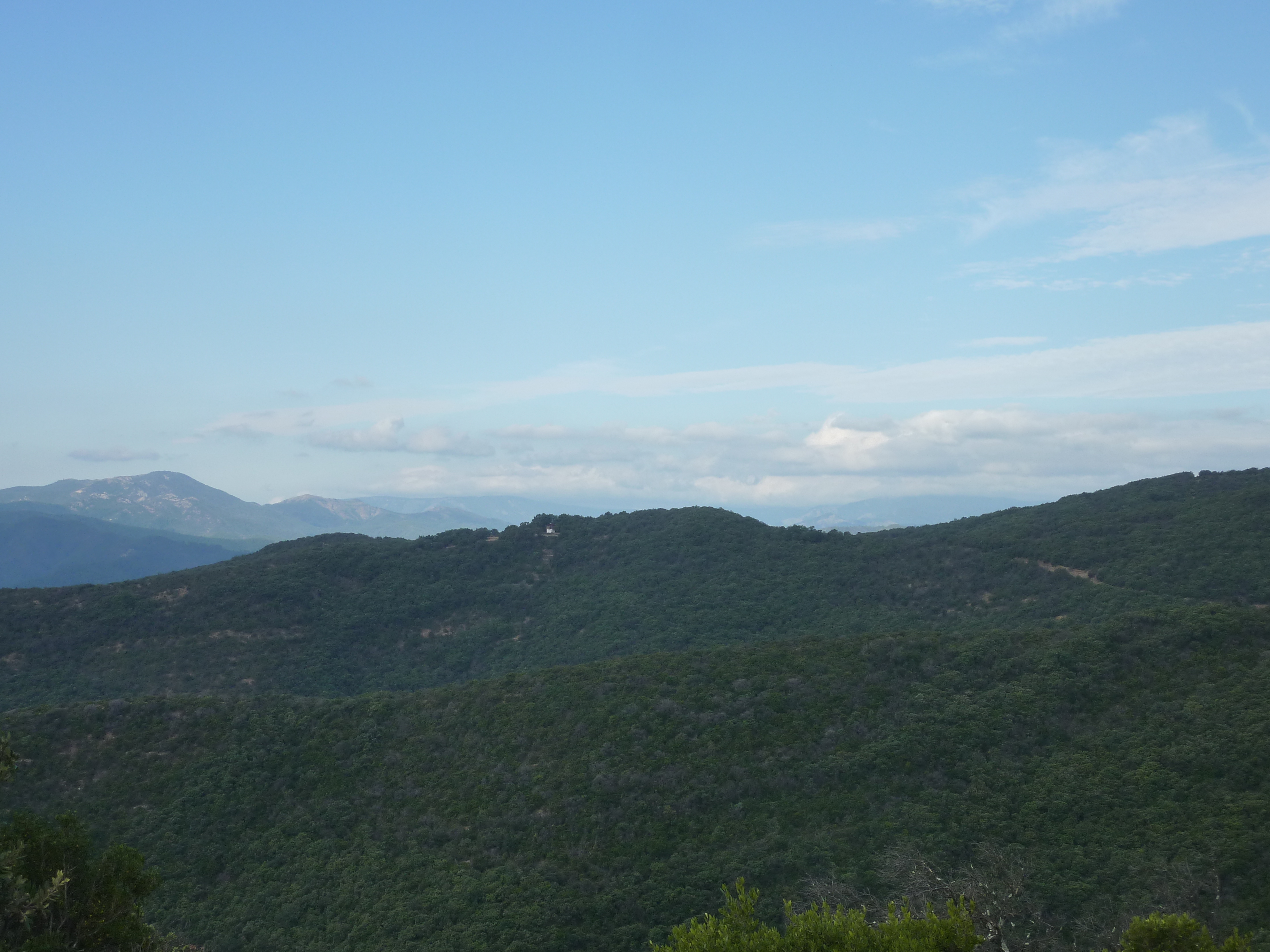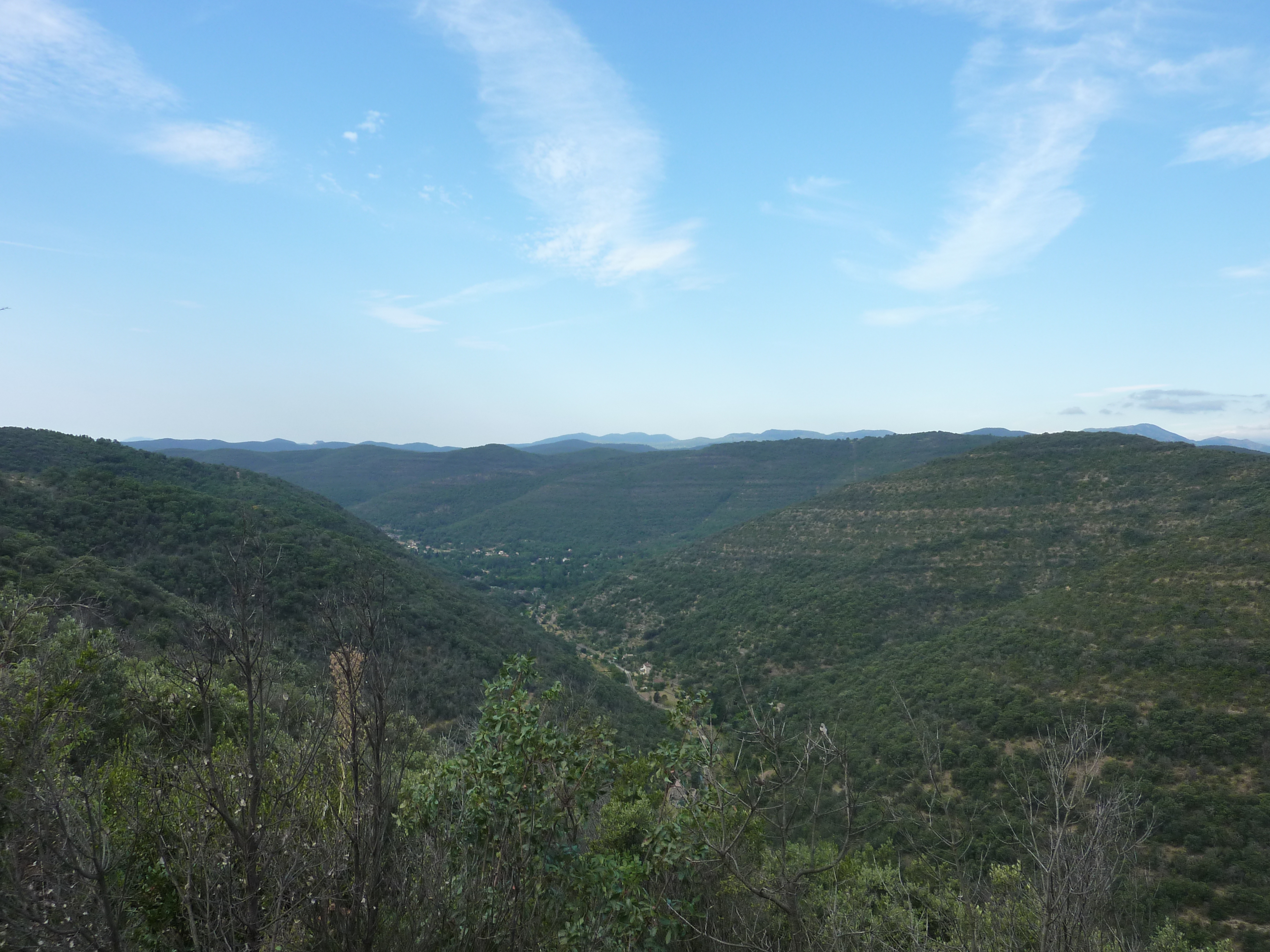 Arrivée au sommet des Suquets (558 m) : beau panorama sur les sommets de la Vallée Borgne et de la Haute Vallée de l'Hérault, sur le Piémont gardois et le Pic Saint-Loup, sur la Vallée de Mialet ...
