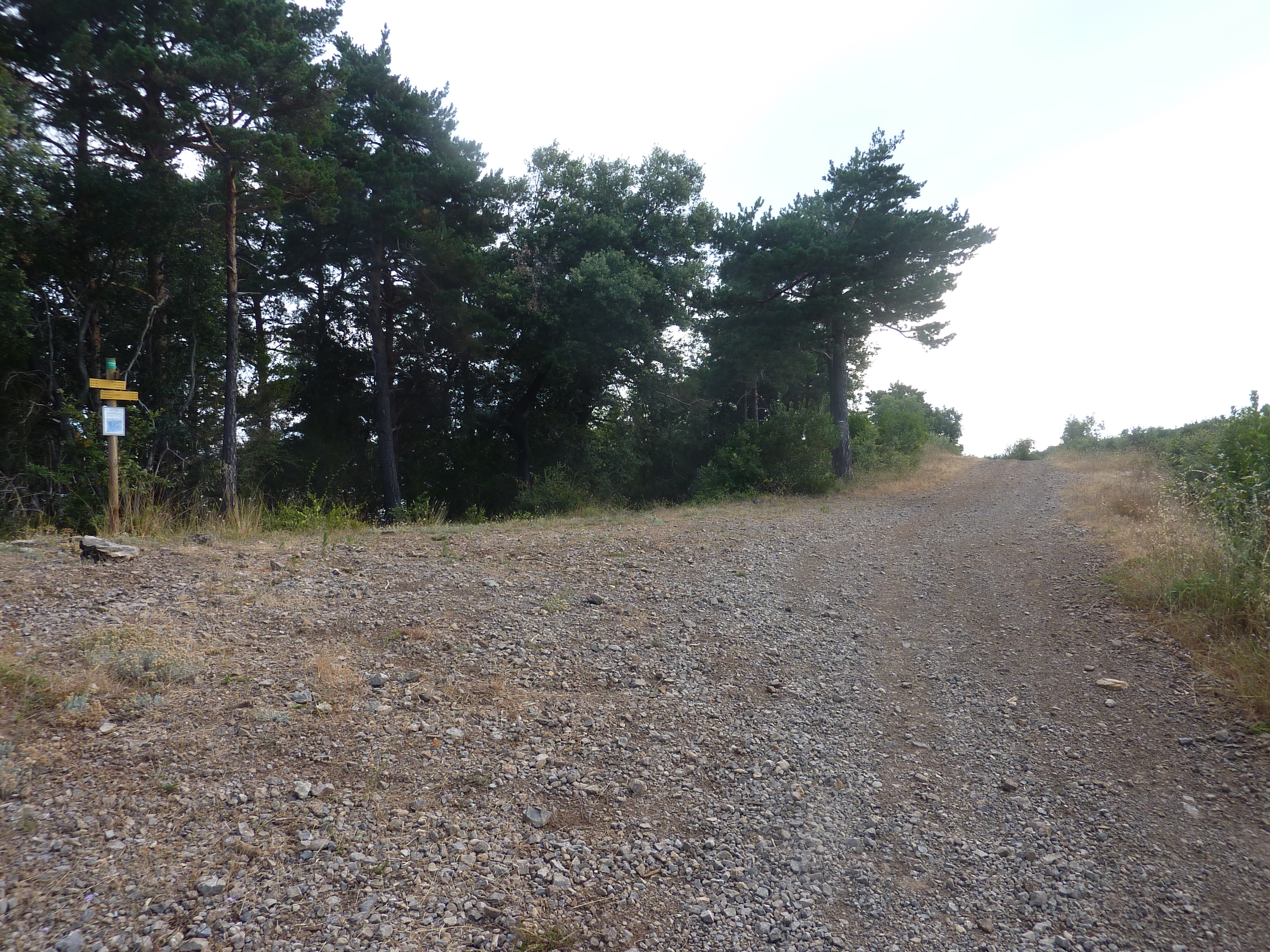 A ce croisement marqué par la présence d'un panneau directionnel "Table d'orientation" (1800 mètres après le lieu-dit "Combe Male"), quitter le GRP pour suivre le chemin descendant sur la gauche direction les Suquets, balisé uniquement en jaune dorénavant