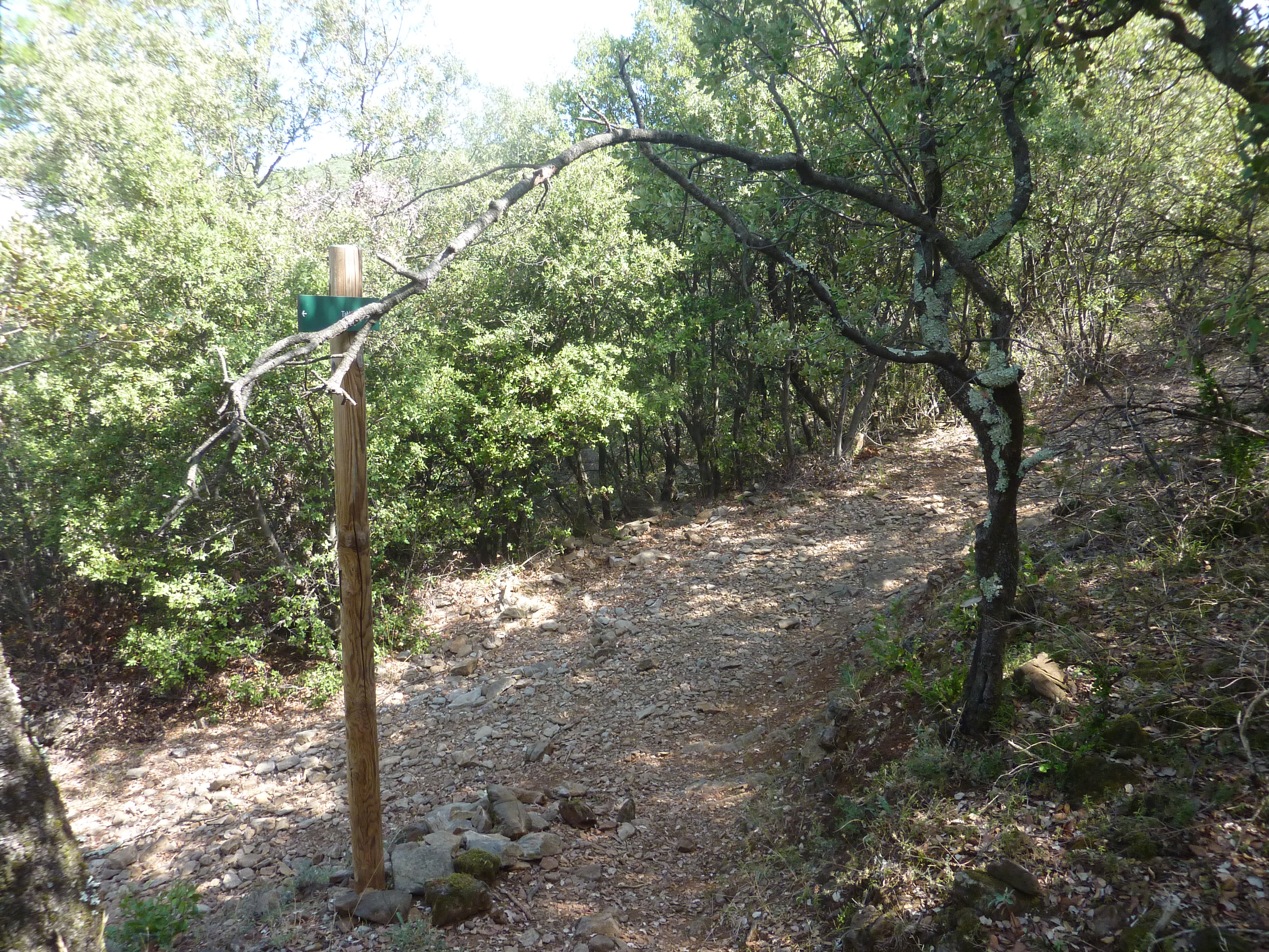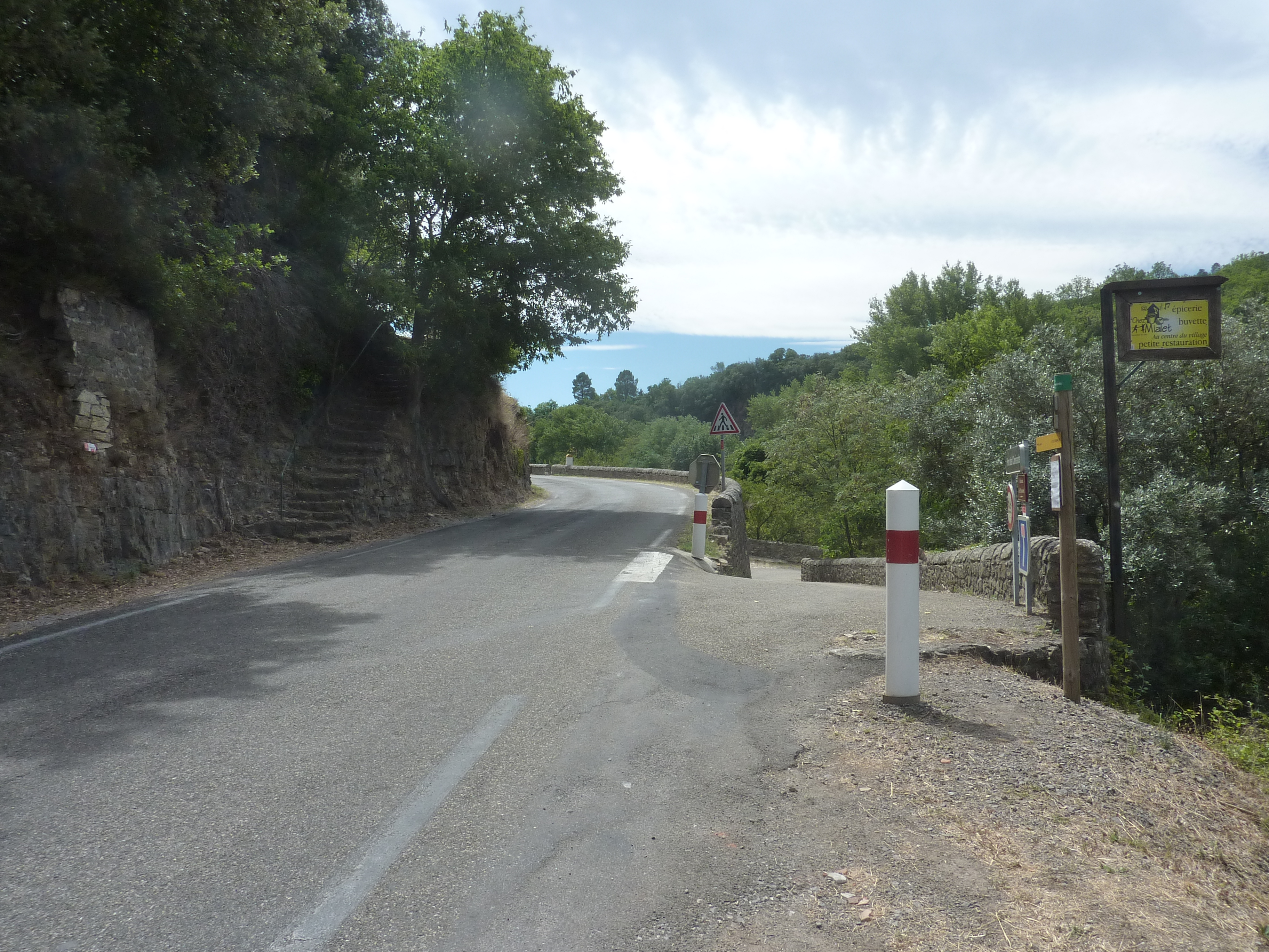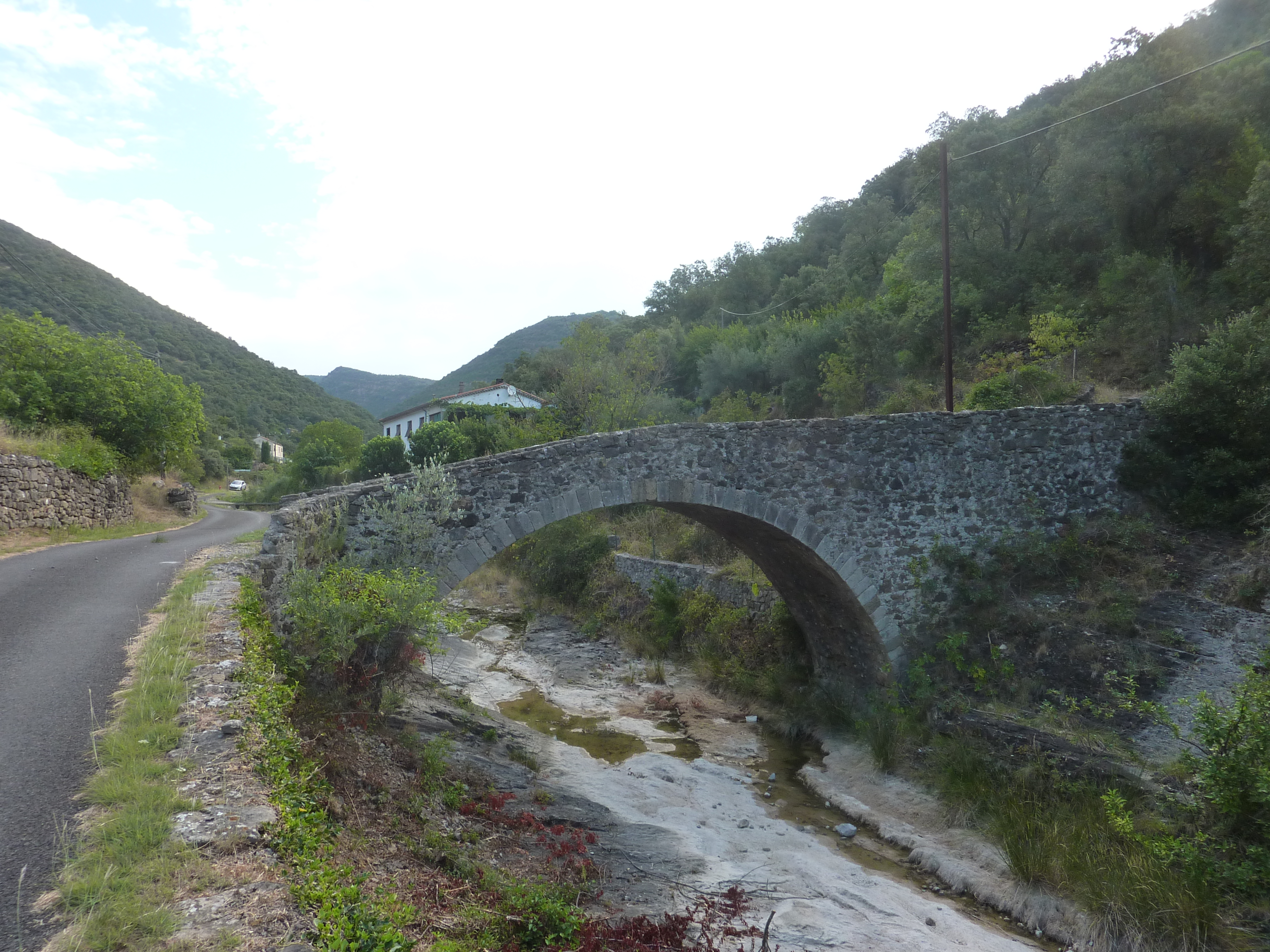 A ce croisement au niveau d'un pont en pierre (250 mètres après le précédent) (172 m), suivre le chemin montant sur la droite direction l'Escoudas, balisé en rouge et blanc, et en jaune