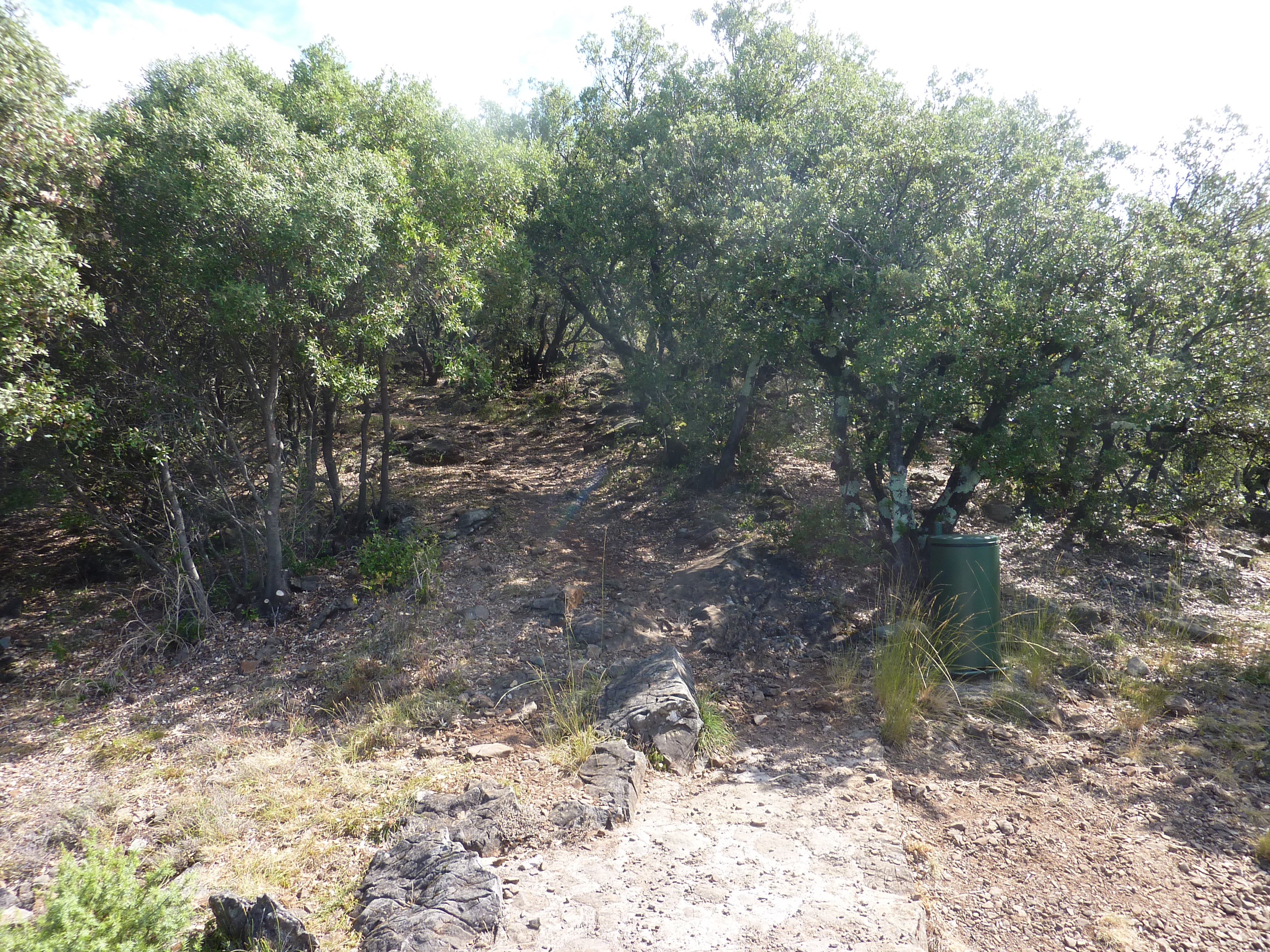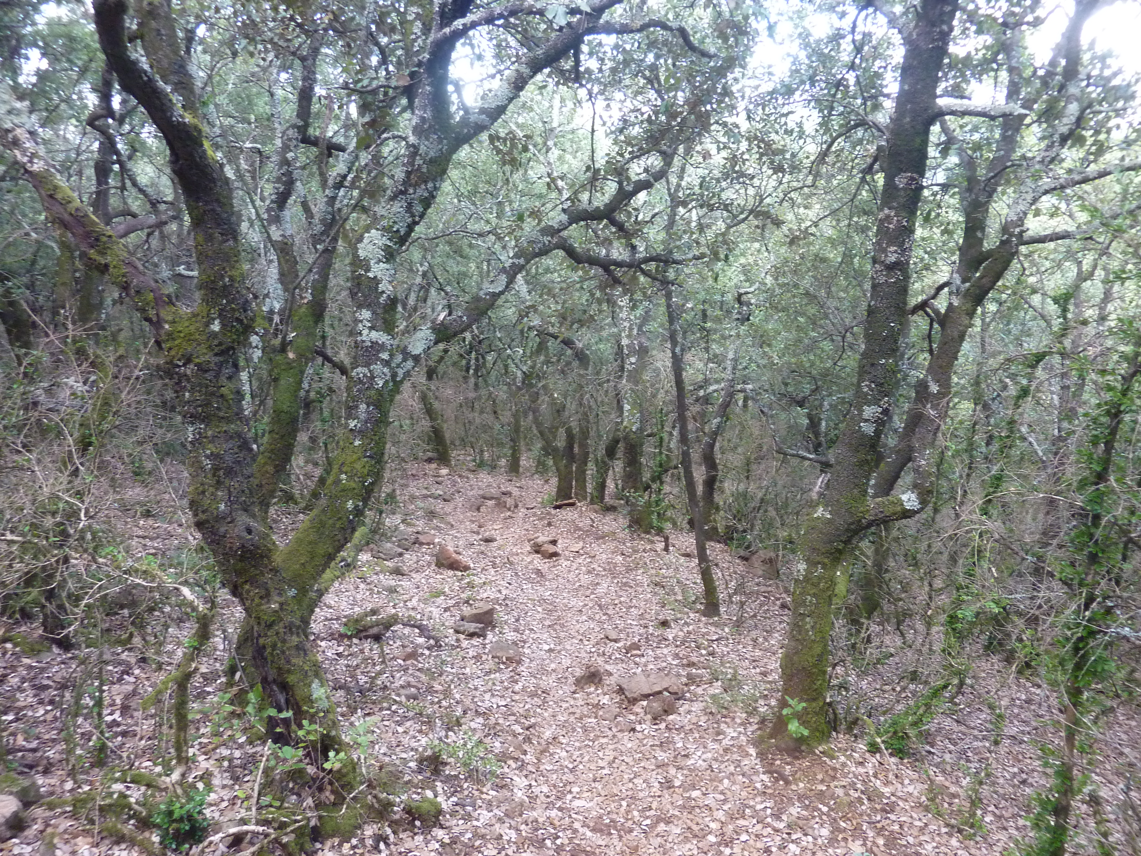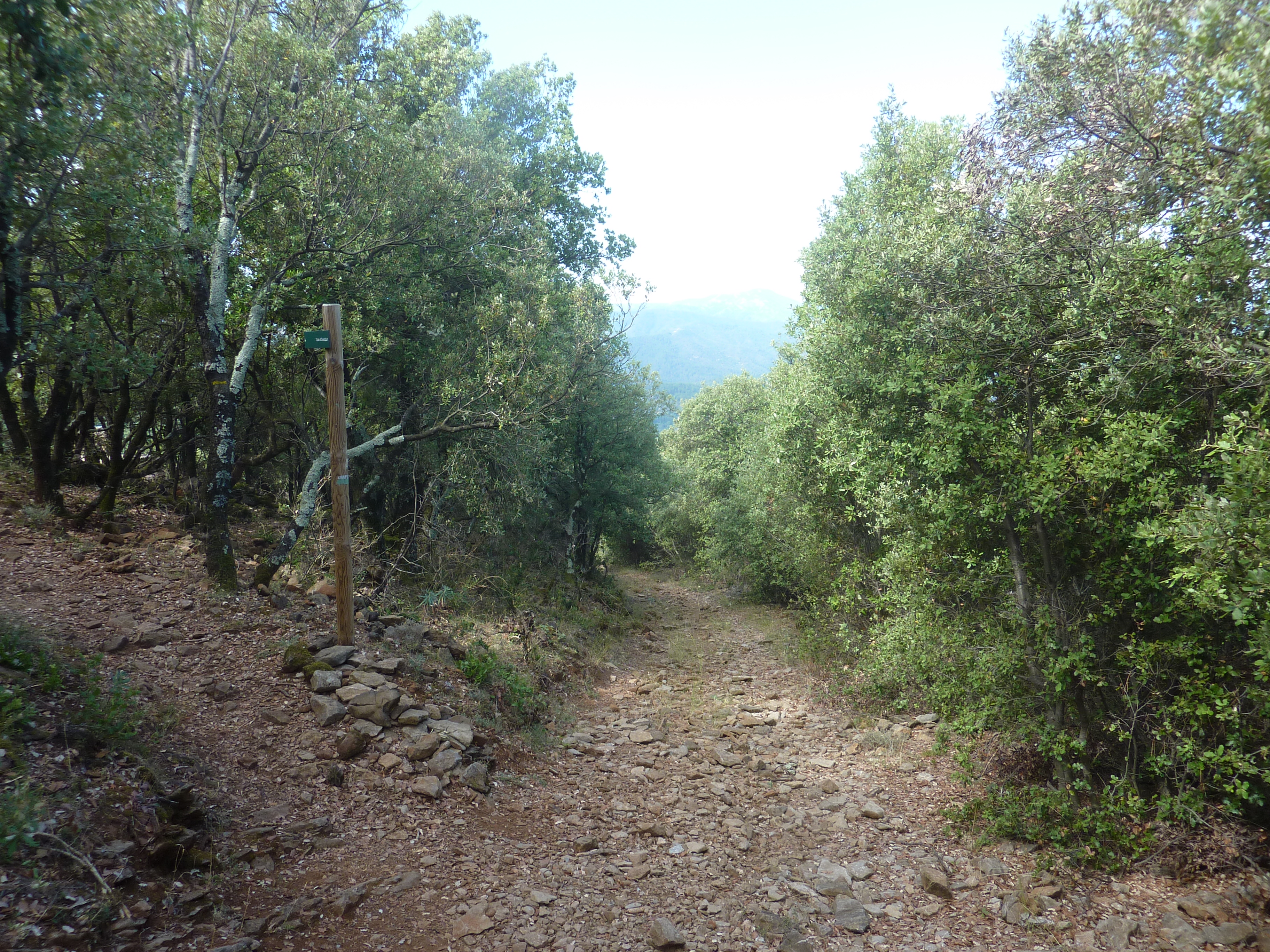 A ce croisement au niveau d'un pont en pierre (250 mètres après le précédent) (172 m), suivre le chemin montant sur la droite direction l'Escoudas, balisé en rouge et blanc, et en jaune