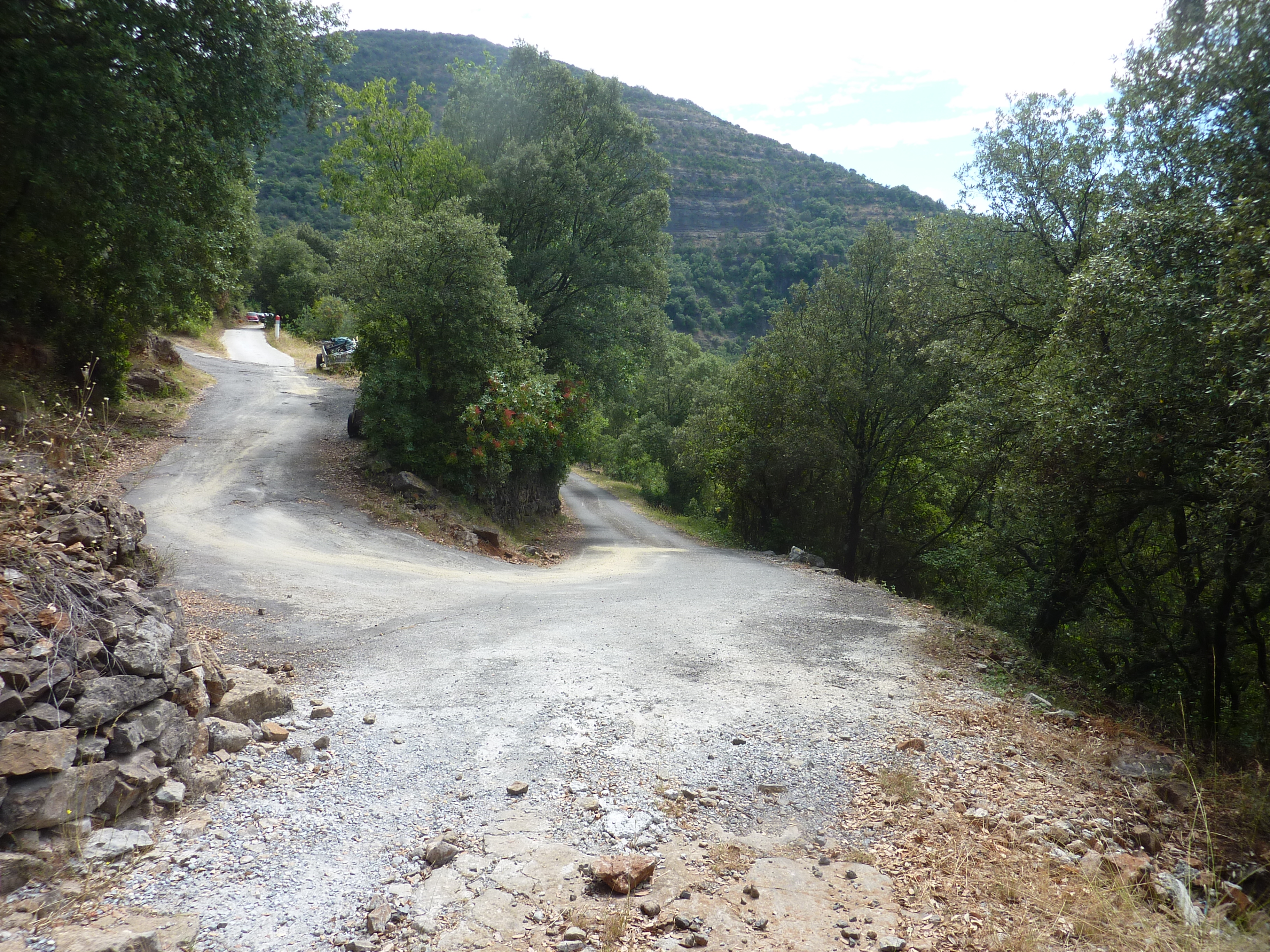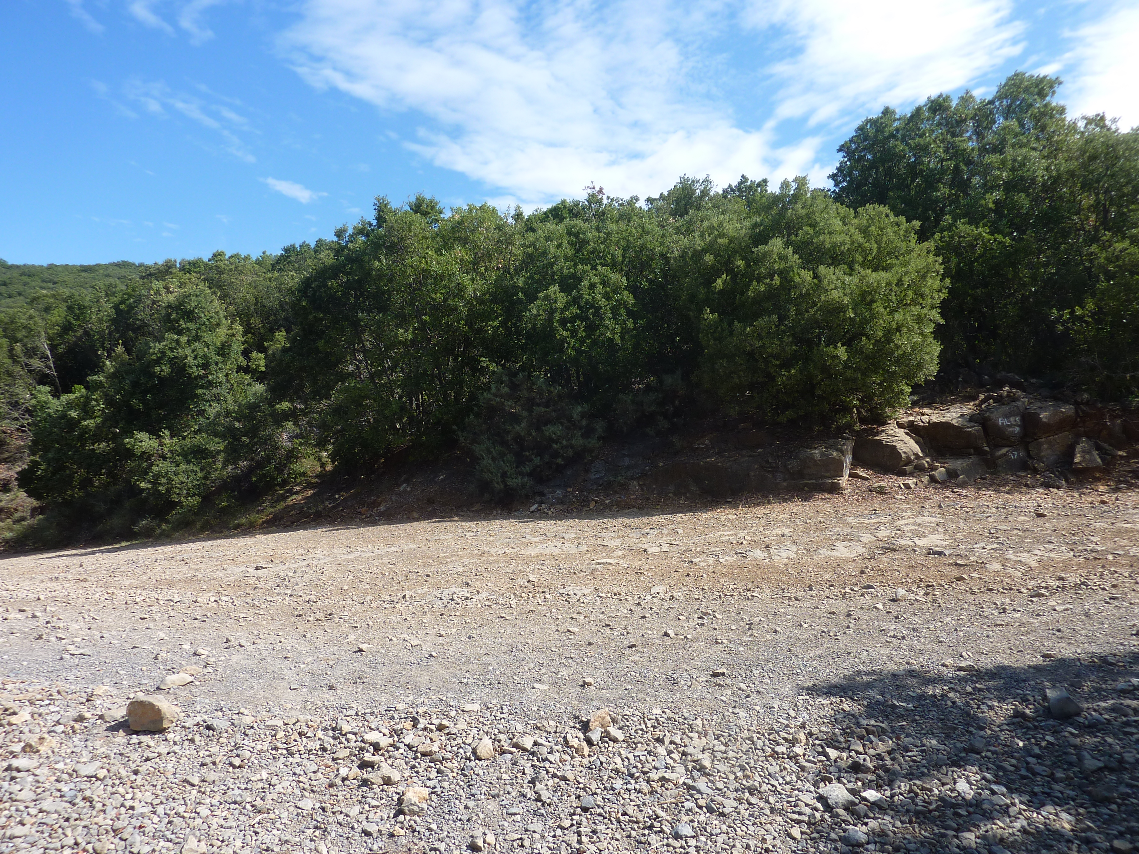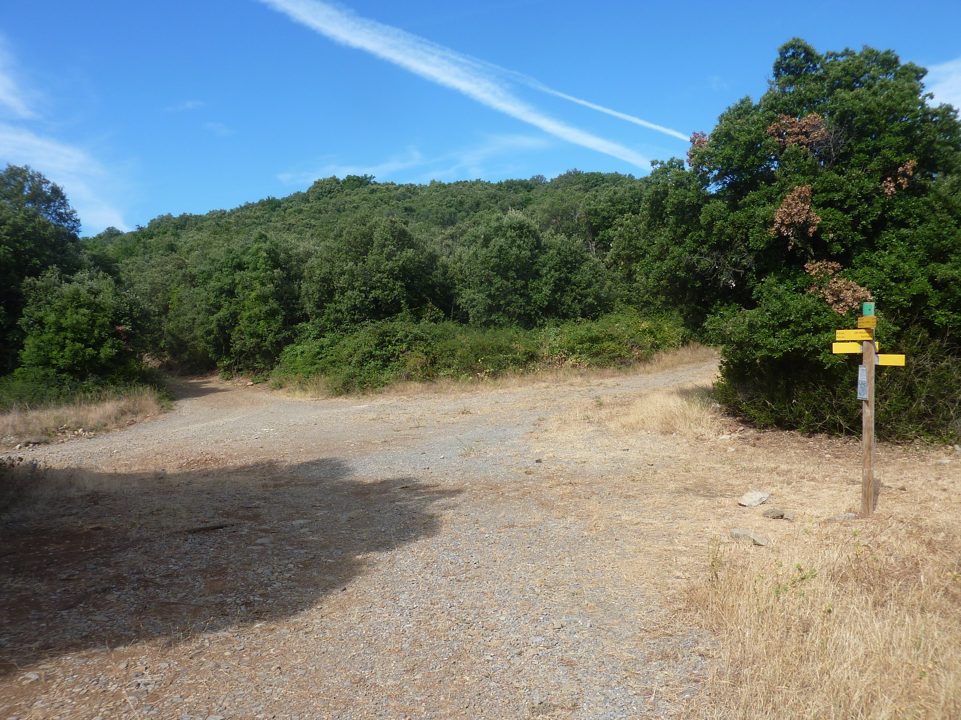 La Rouvière (428 m) : suivre la large piste partant sur la gauche direction l'Escoudas, balisé en rouge et blanc, et en jaune (la boucle emprunte ici une partie du circuit du Panoramique des Cévennes)