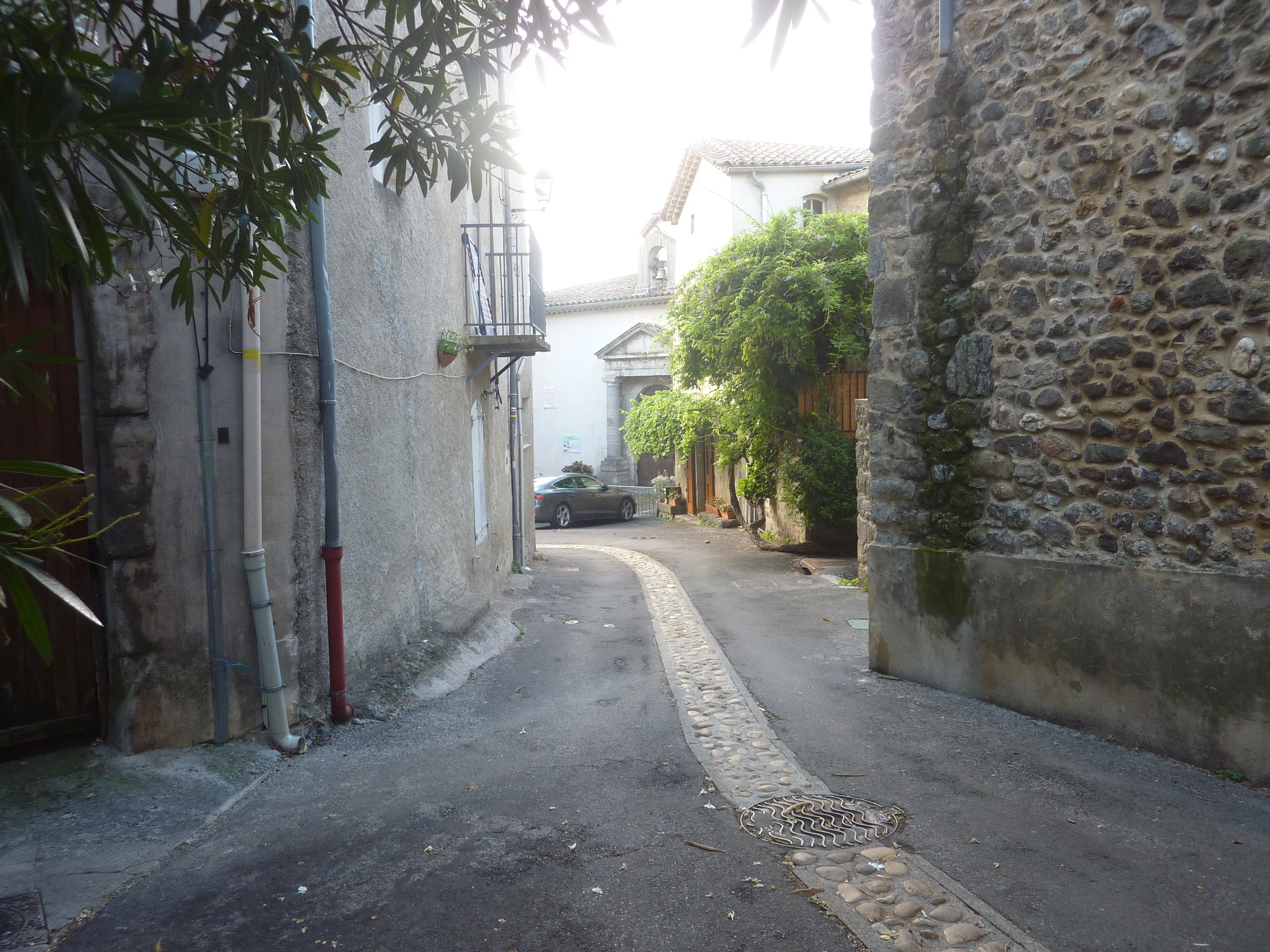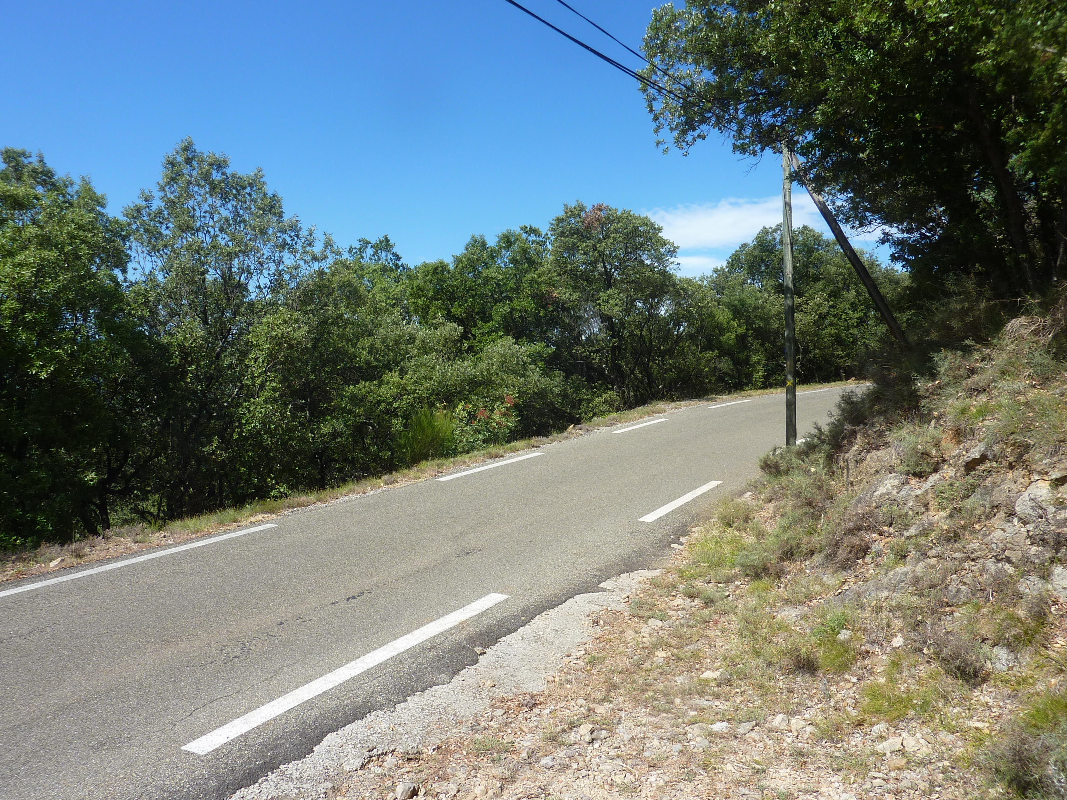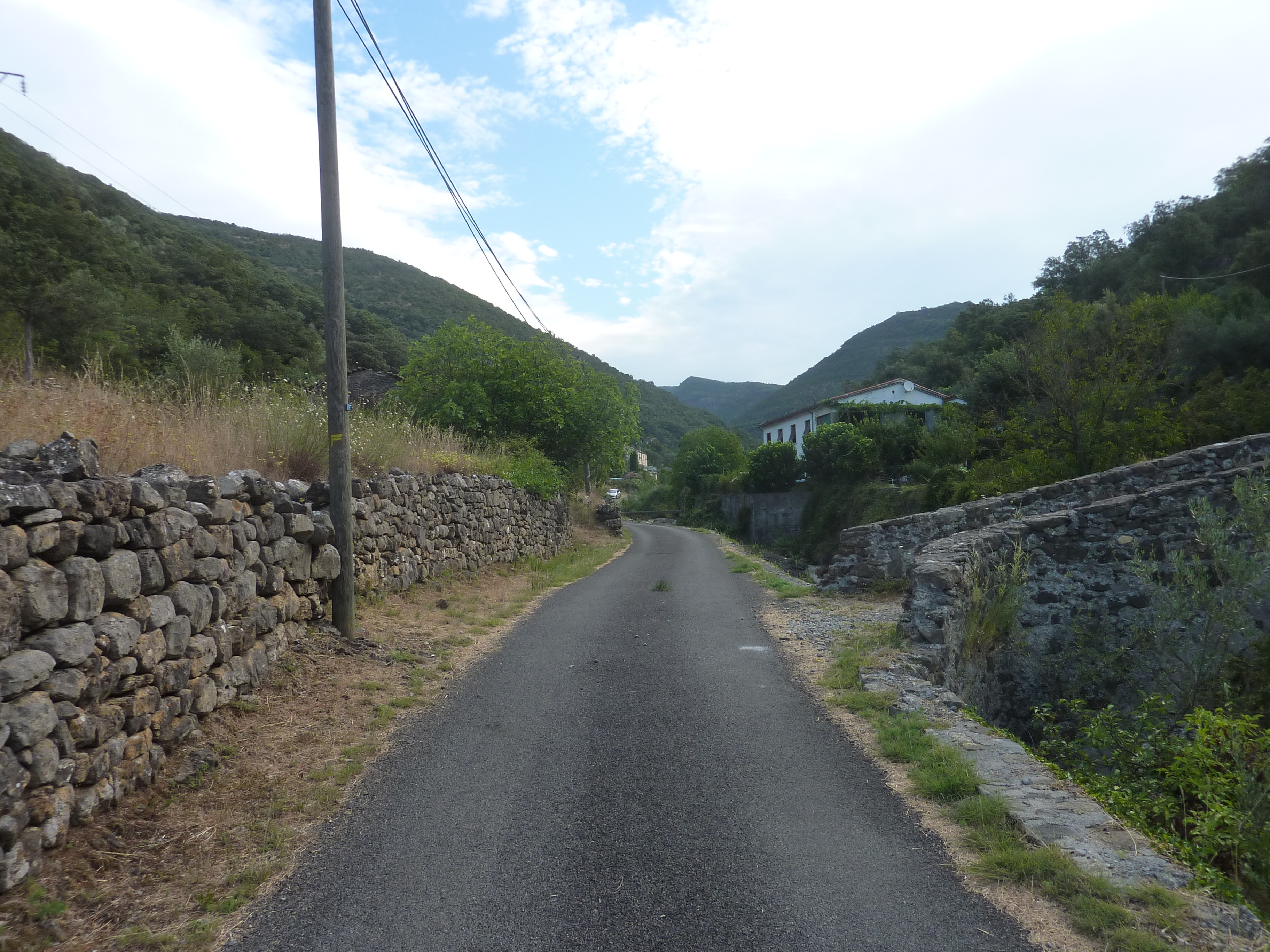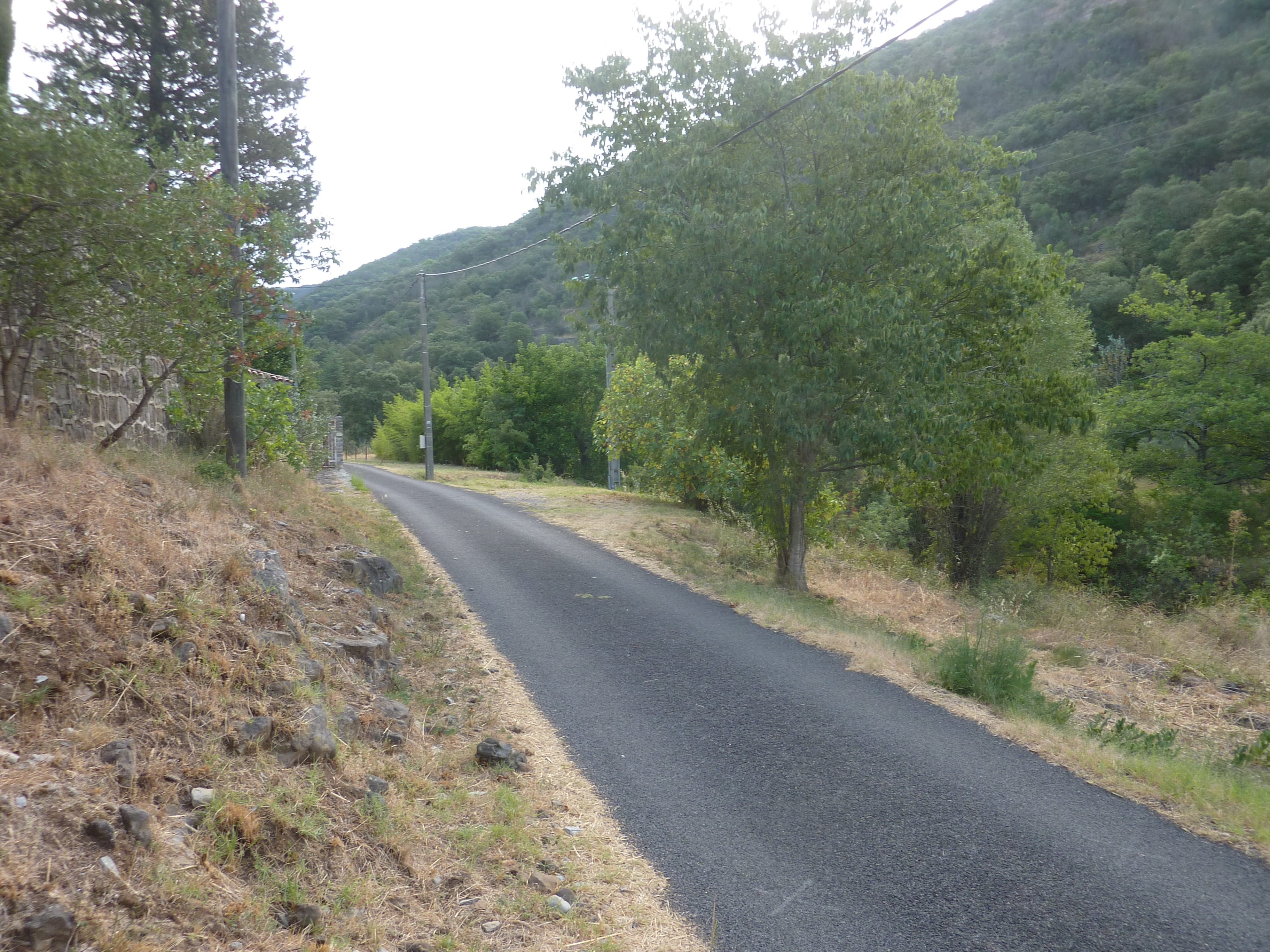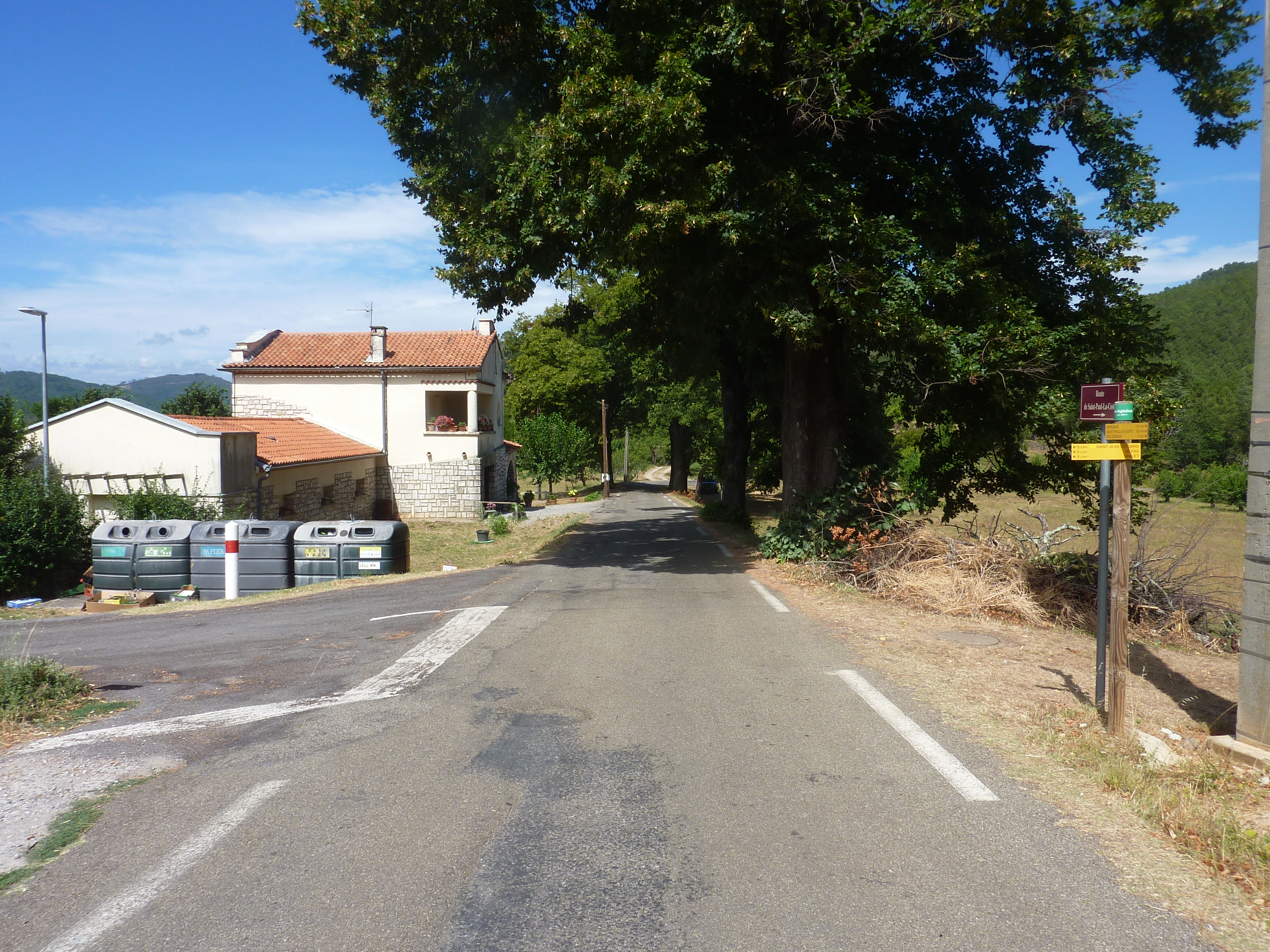 A ce croisement proche du hameau des Clapiers (208 m), suivre la route descendant tout droit direction Mialet, balisé en rouge et blanc, et en jaune