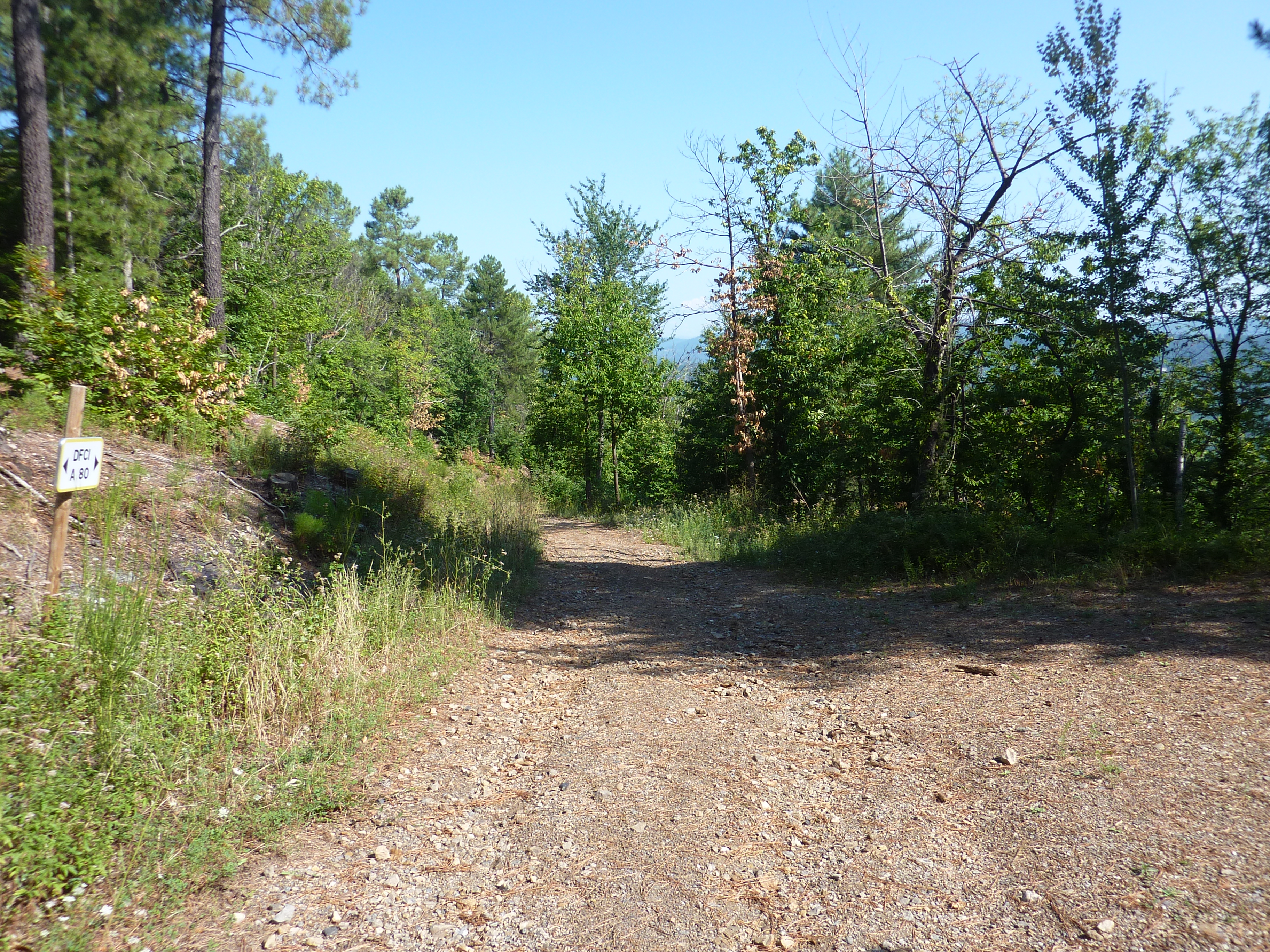 A ce croisement marqué par ce panneau "Circulation interdite dans les deux sens" (500 mètres après le Pont de Rastel), suivre la piste montant de biais sur la gauche direction Pic de la Tourette, aucun balisage dorénavant