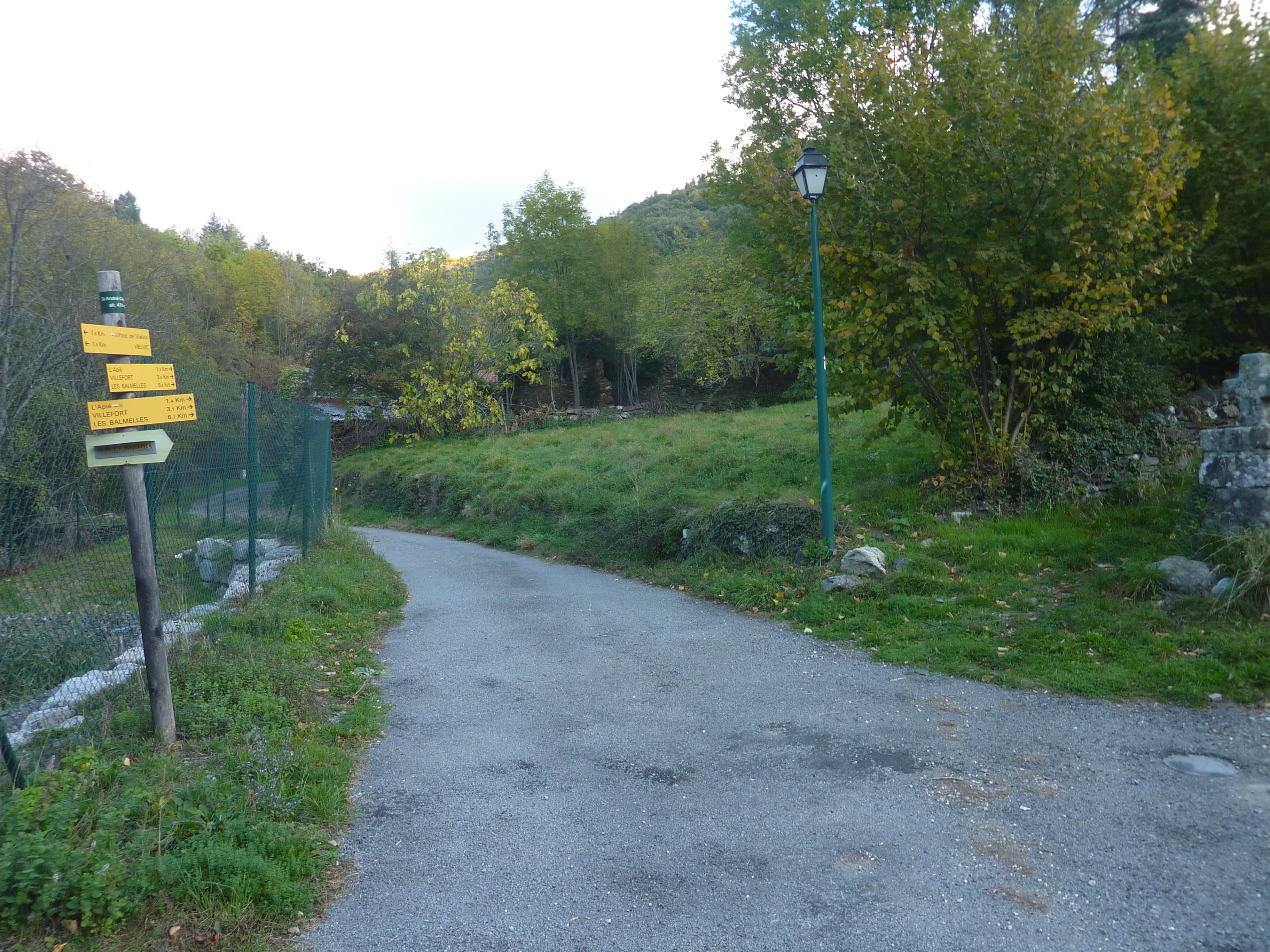 L'Apié (550 m) : suivre le large chemin partant sur la droite direction Villefort, balisé en rouge et blanc