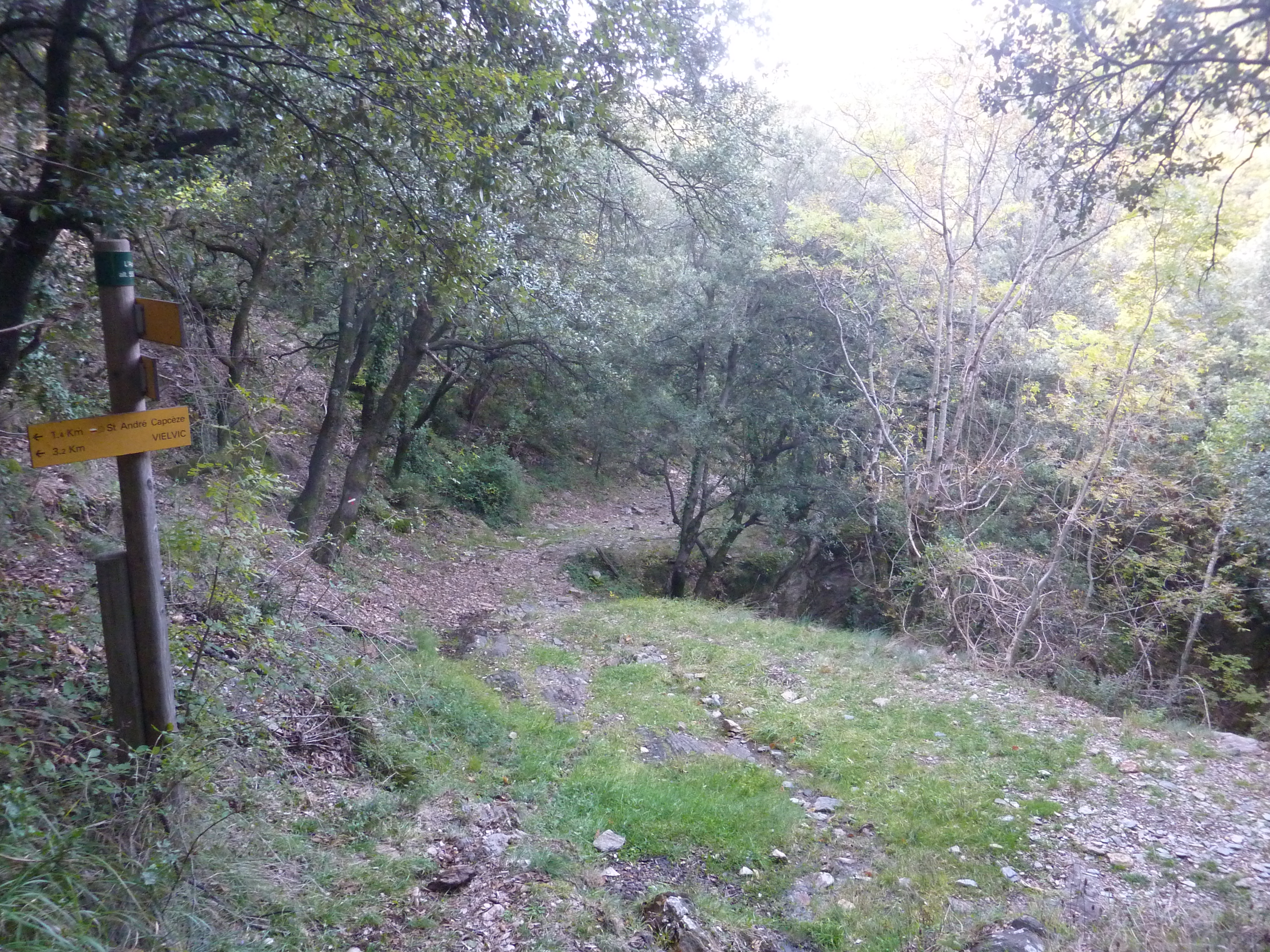 A ce croisement (50 mètres après la précédente intersection), suivre le chemin descendant sur la droite direction Saint-André-Capcèze, balisé en jaune