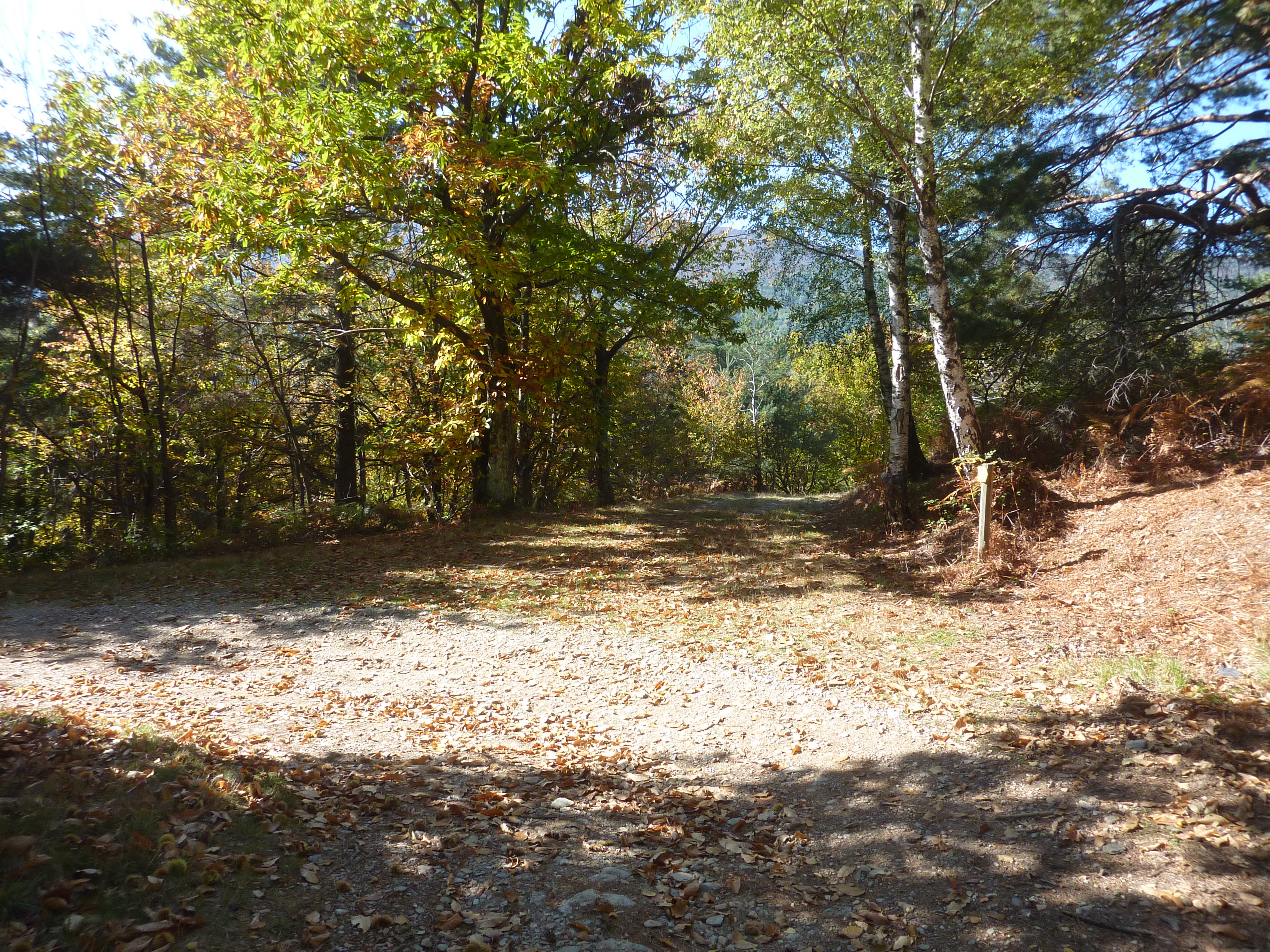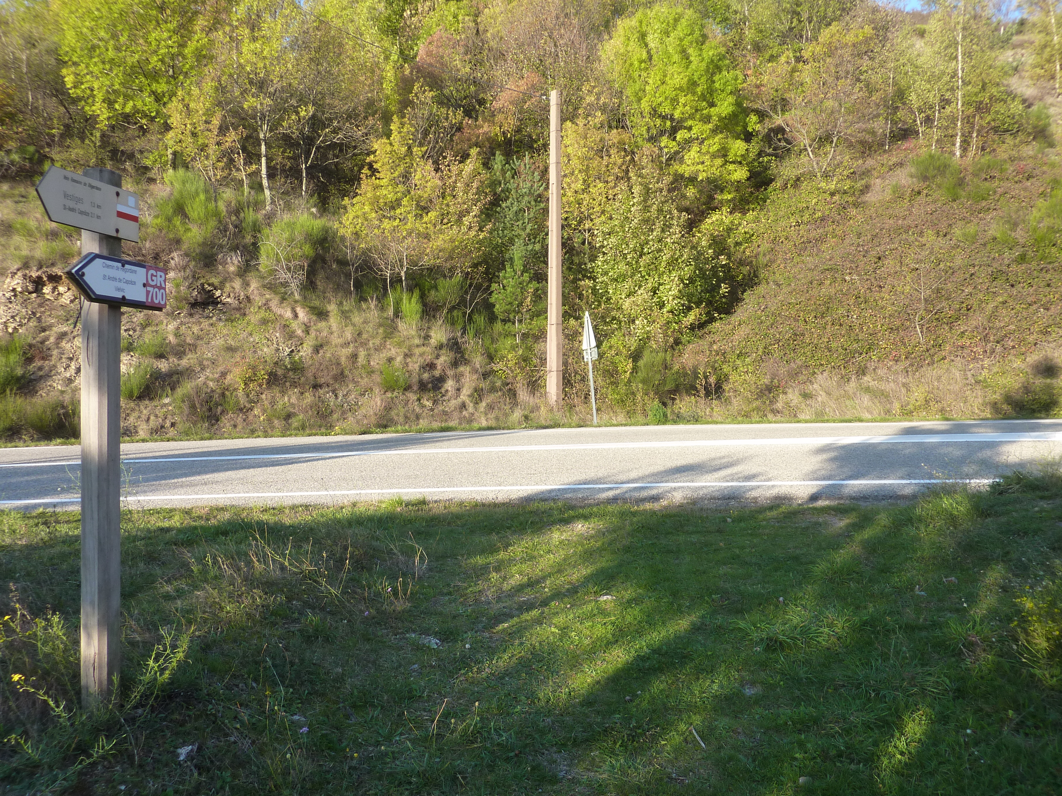 A ce croisement marqué par la présence du panneau directionnel "la Régordane" et proche du lieu-dit "Nidaucel" (2000 mètres après le précédent), suivre le chemin partant légèrement sur la droite direction Saint-André-Capcèze, balisé en jaune (attention, le chemin partant sur la gauche est aussi balisé en jaune et mène à Vielvic ...)