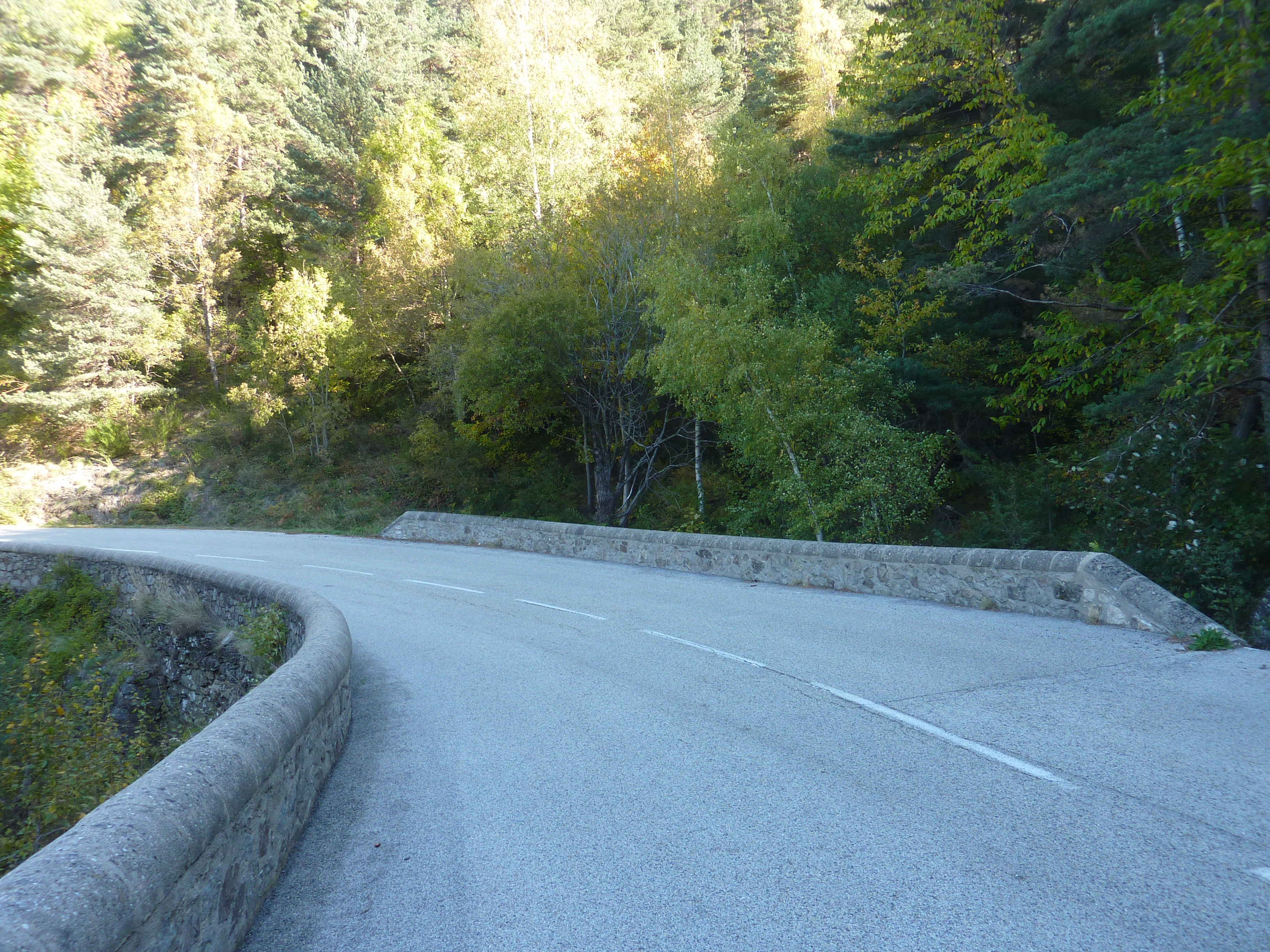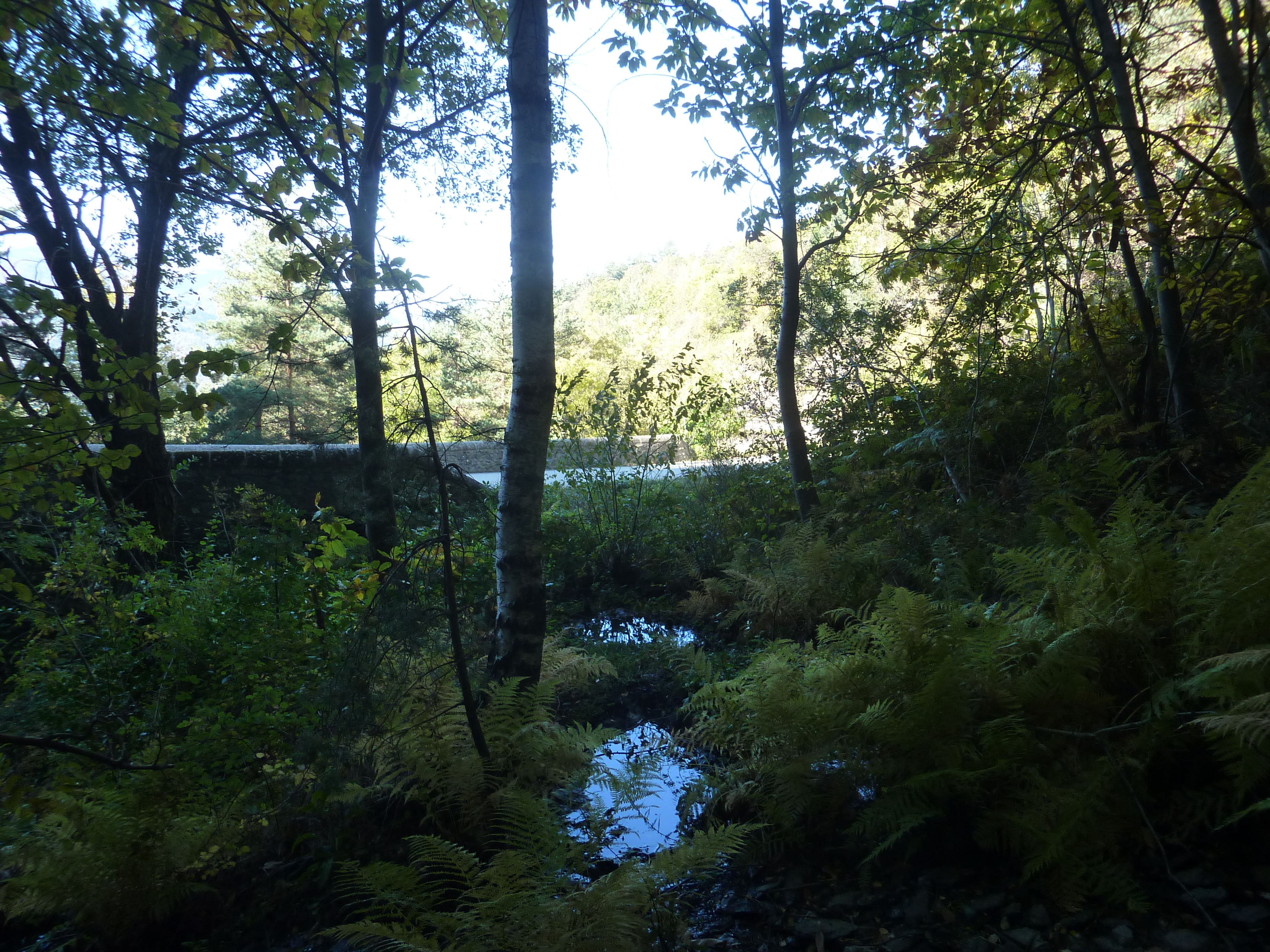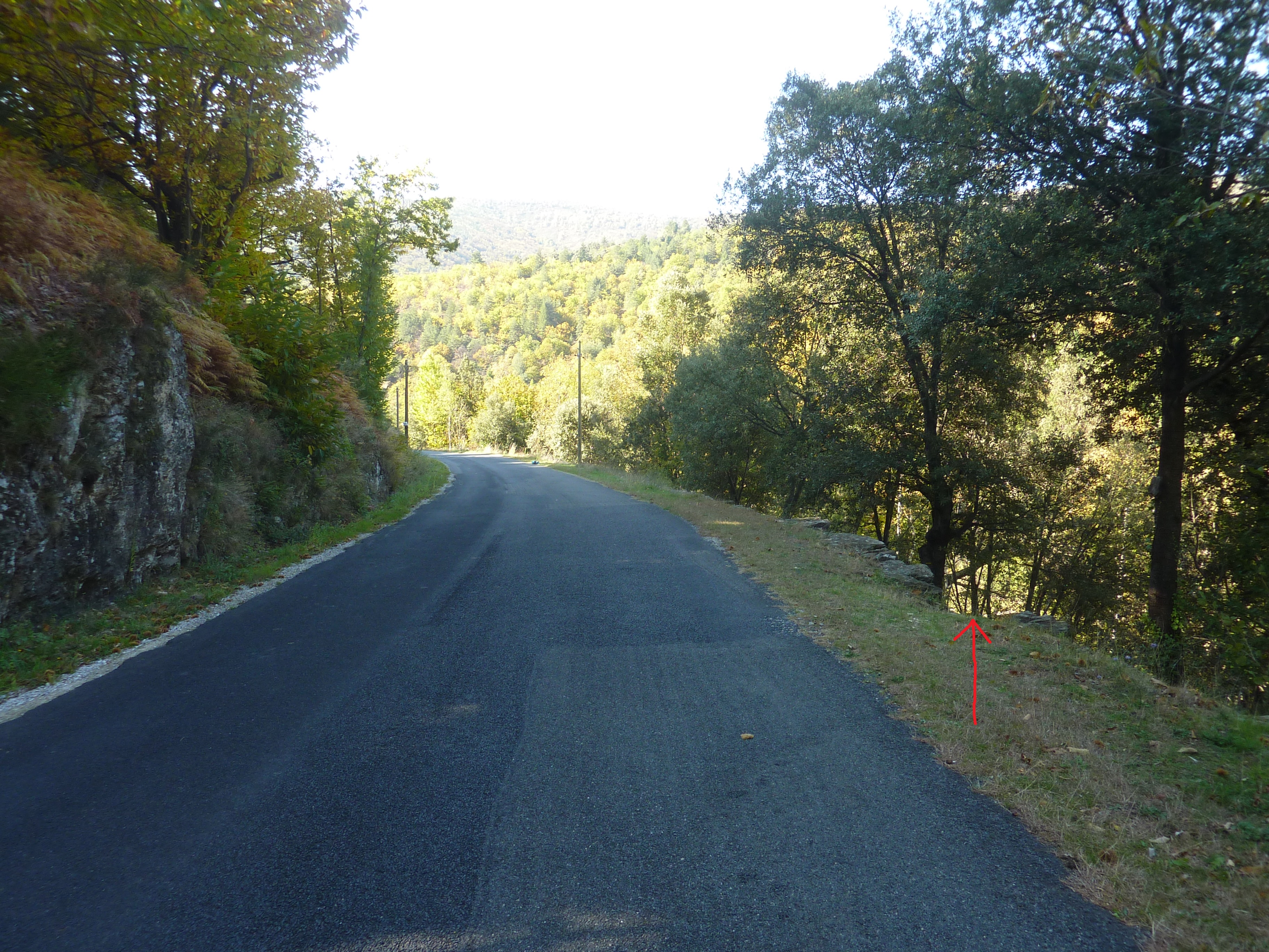 Au niveau de ce virage marqué par la présence de ce parapet en pierre (700 mètres après le précédent croisement), quitter la D901 pour entrer d'une dizaine de mètres dans le bois sur la droite afin d'accéder aux sources direction Sources de la Cèze