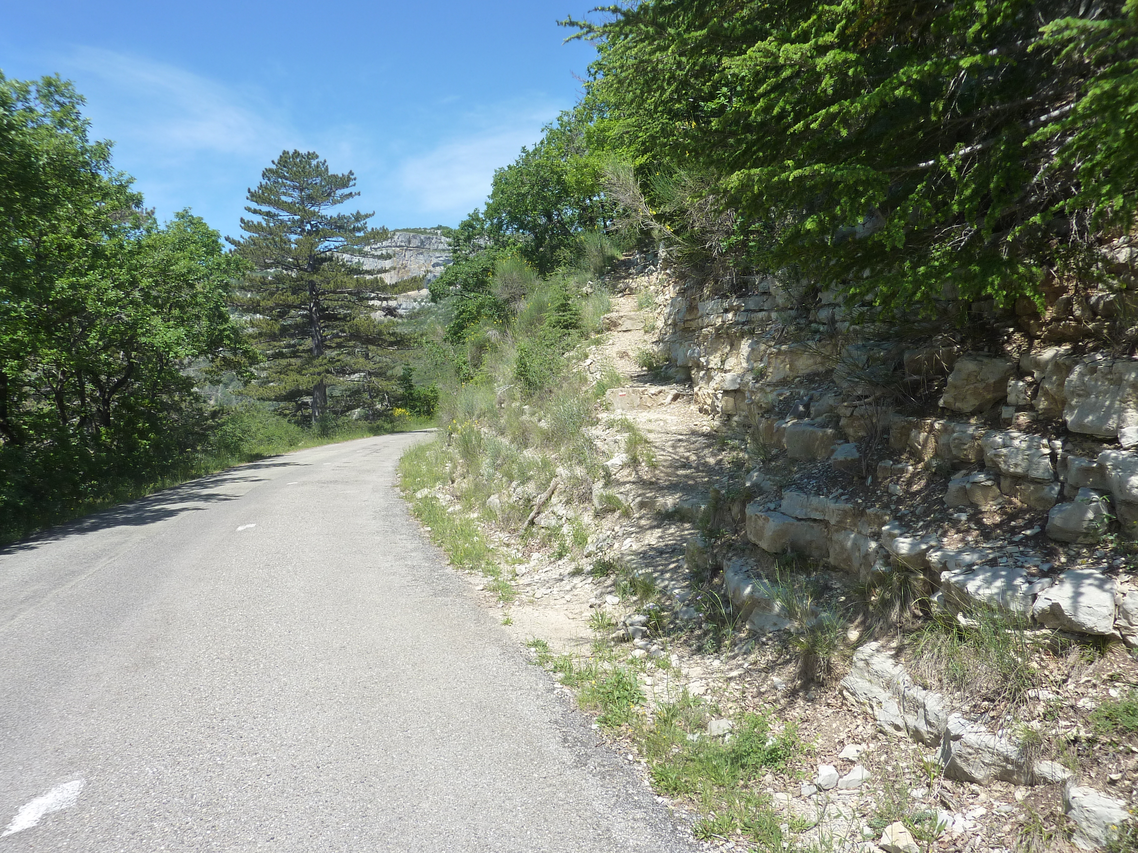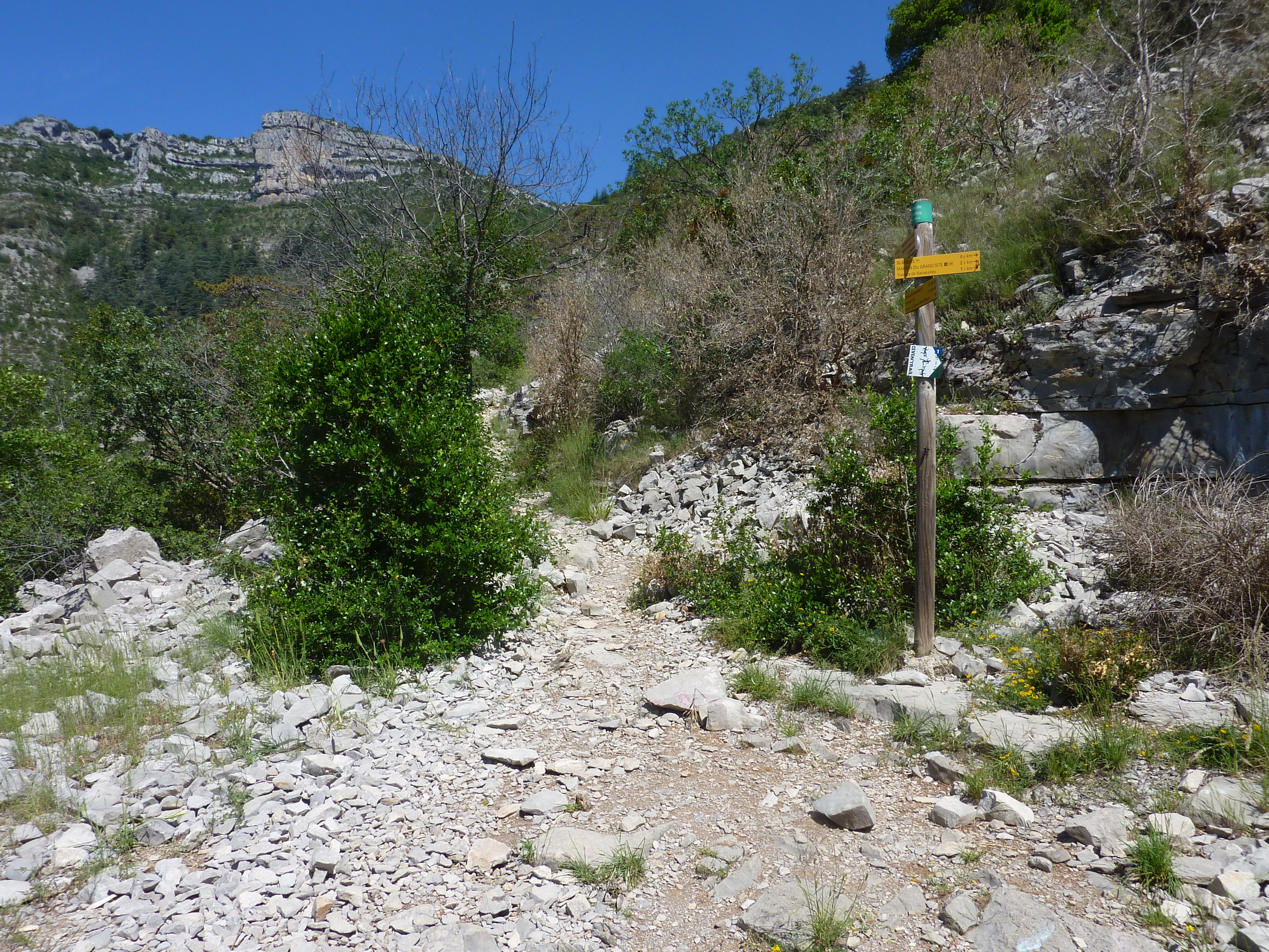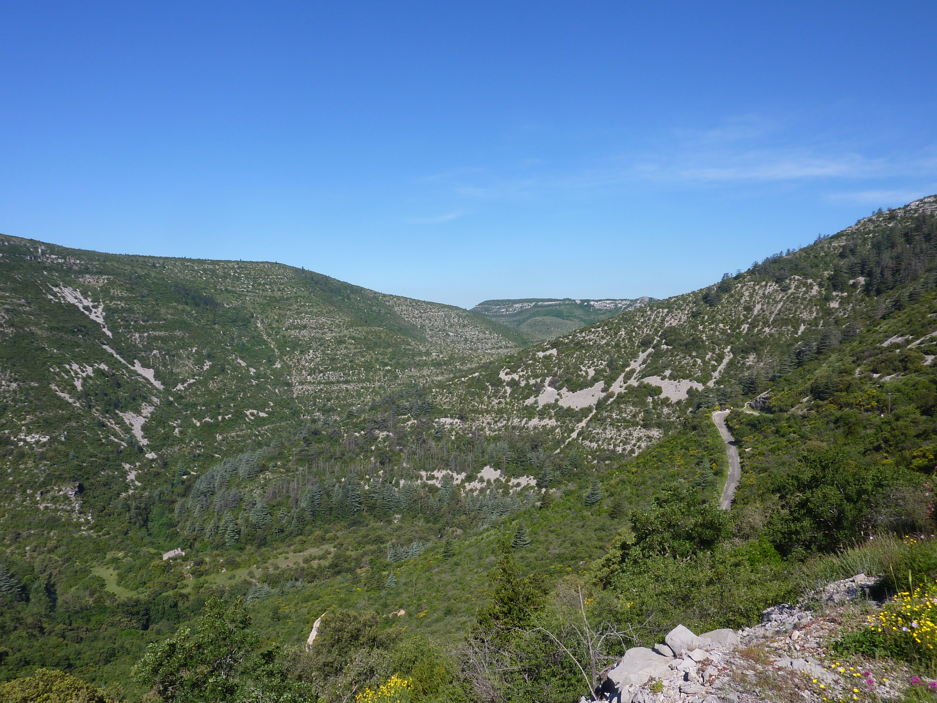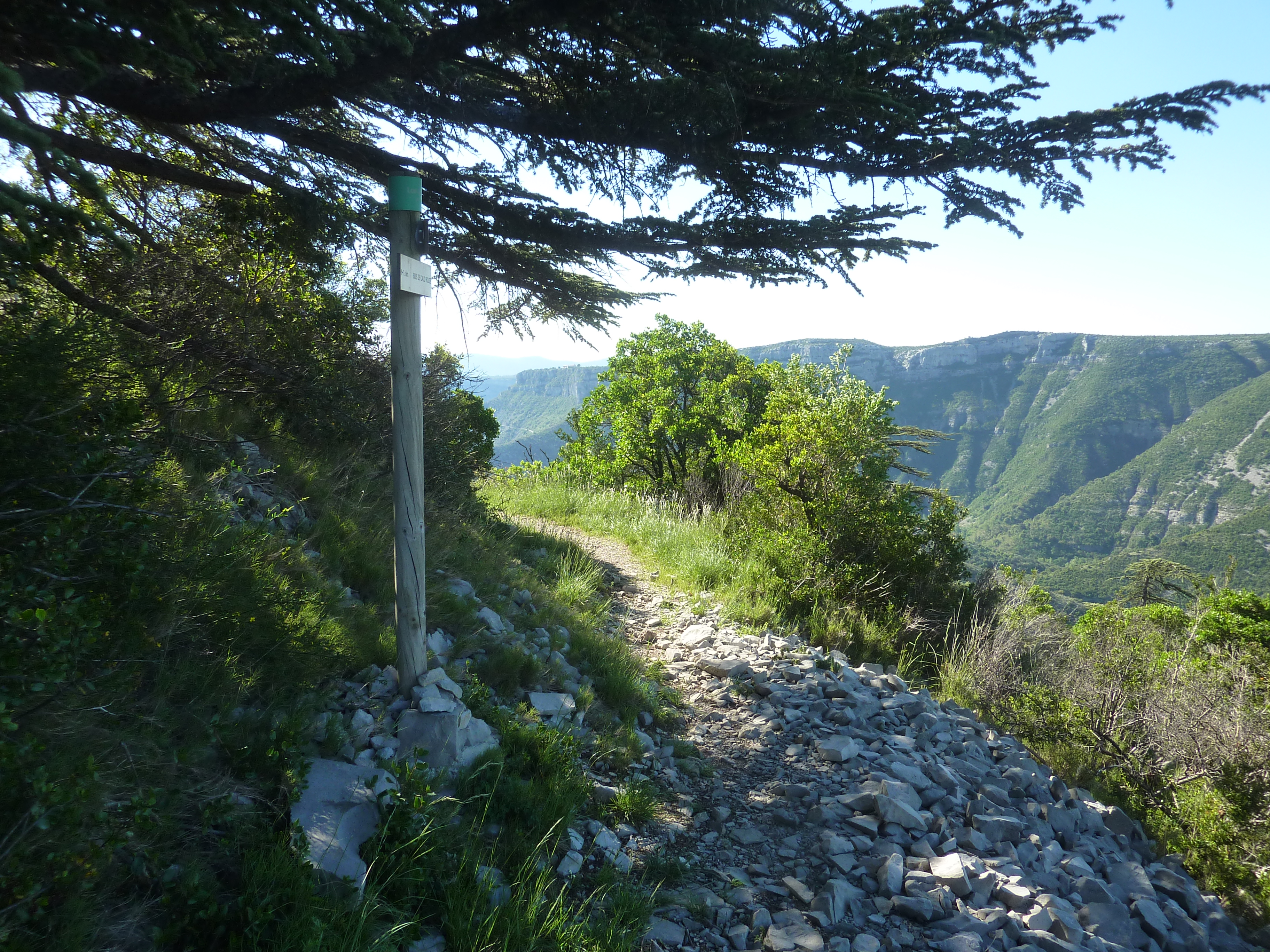 A ce croisement avec la D713, deux choix possibles : soit suivre la D713 partant sur la droite vers le Belvédère de Blandas par la route constituant une variante du GR7 moins sportive et moins technique, soit suivre la D713 partant sur la gauche vers le Belvédère de Blandas par la corniche (GR7) mais plus technique et sportif en raison de la présence de pentes raides à très raides ; deuxième option choisie direction Blandas, balisé en rouge et blanc