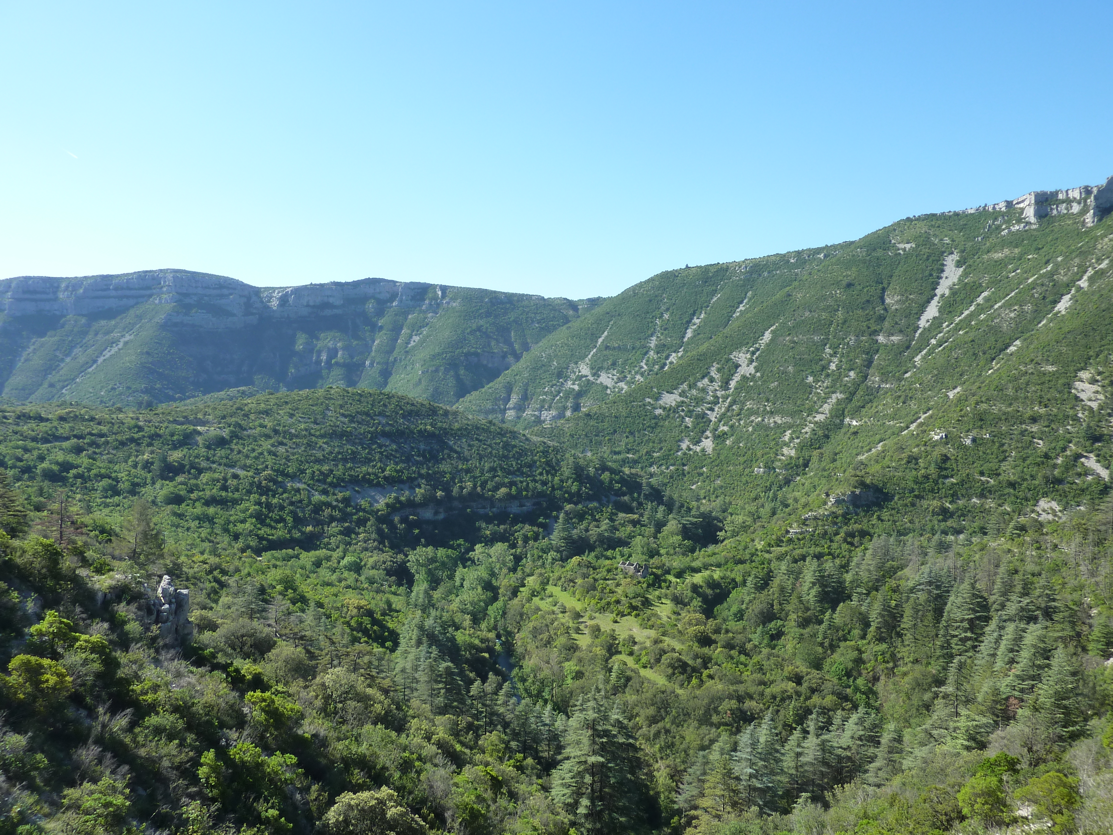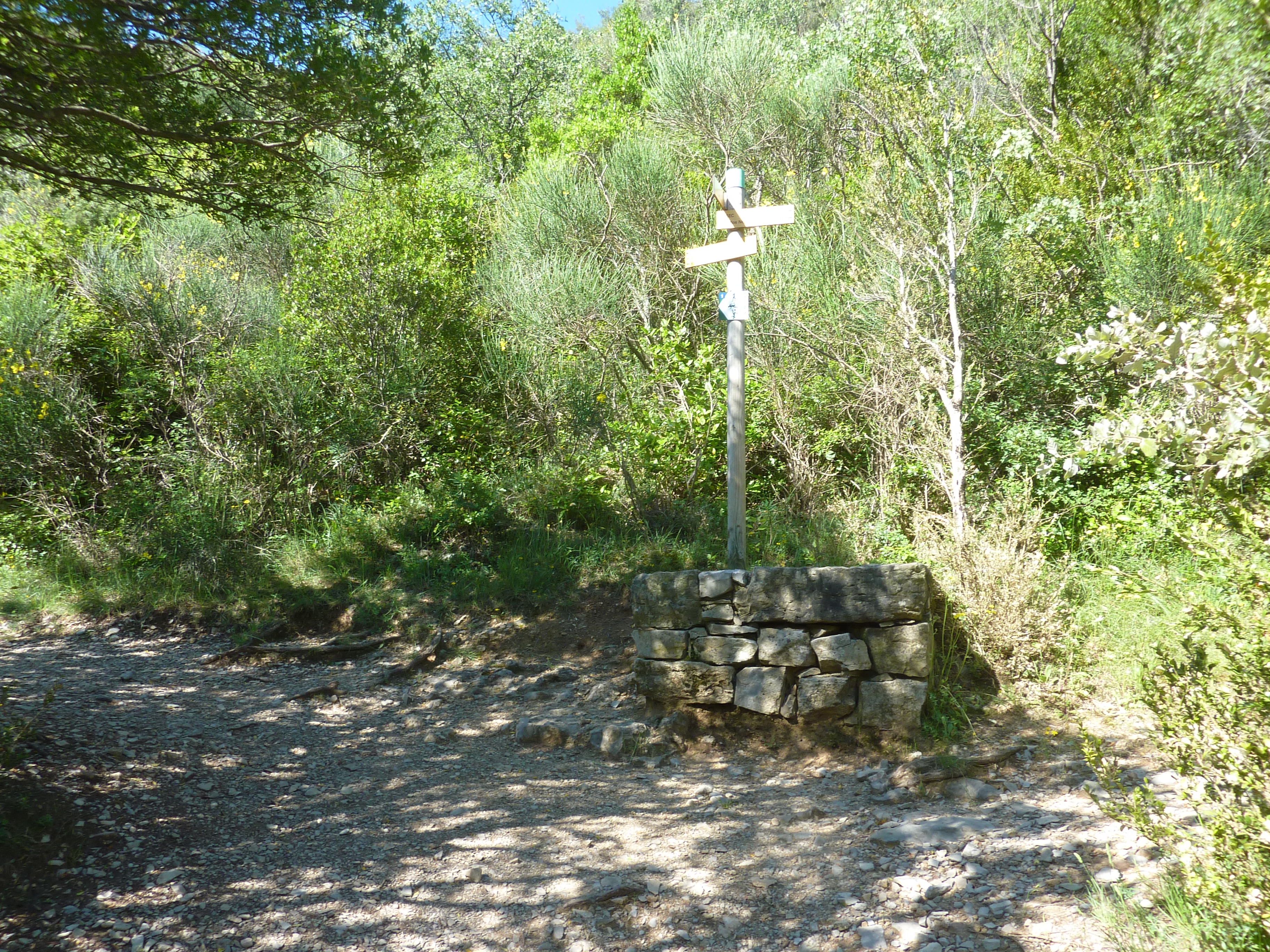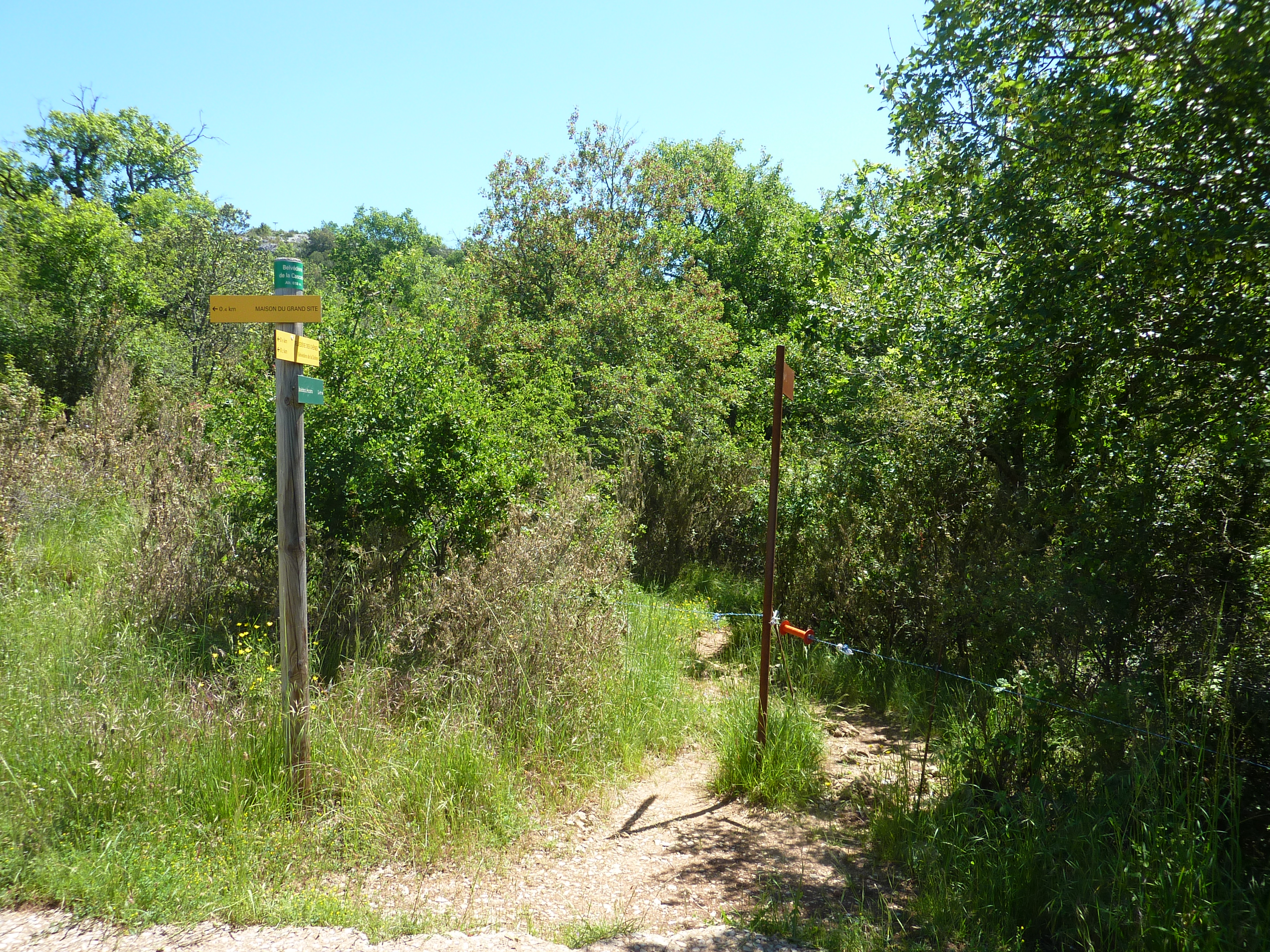 Bois de Calo Rouge (674 m) : suivre le chemin partant sur la gauche et descendant dans les Gorges de la Vis direction Moulins de la Foux, balisé en jaune