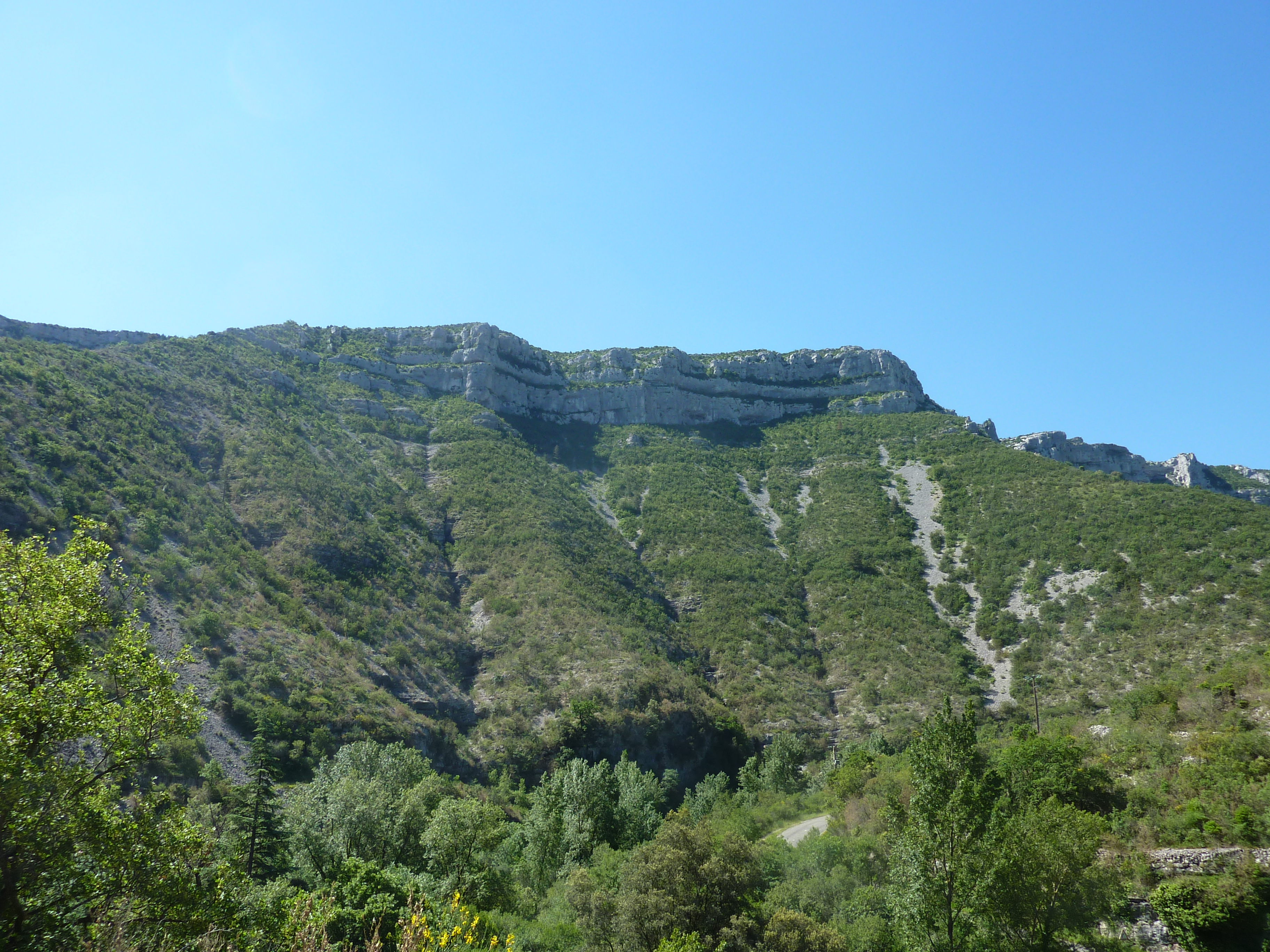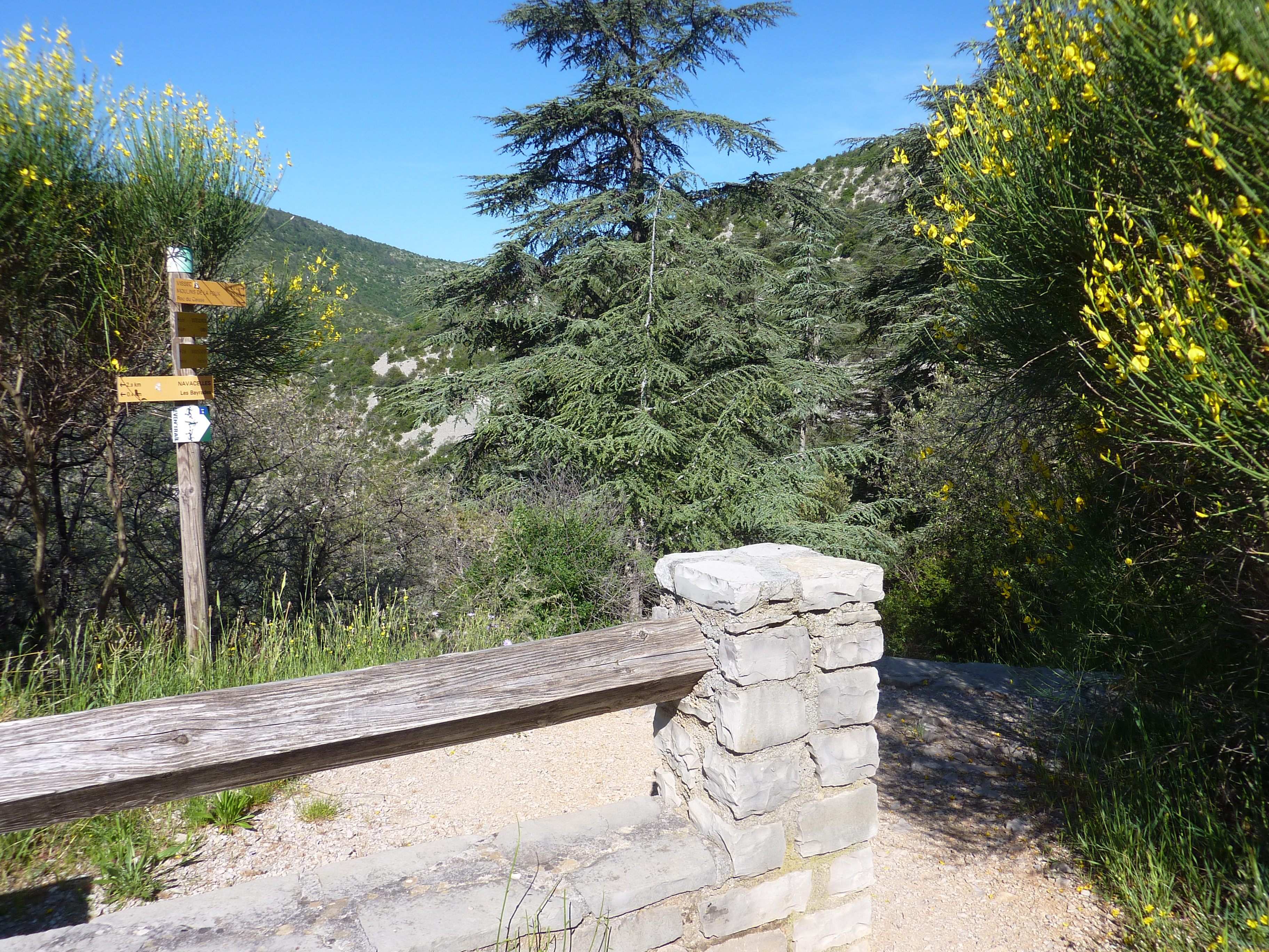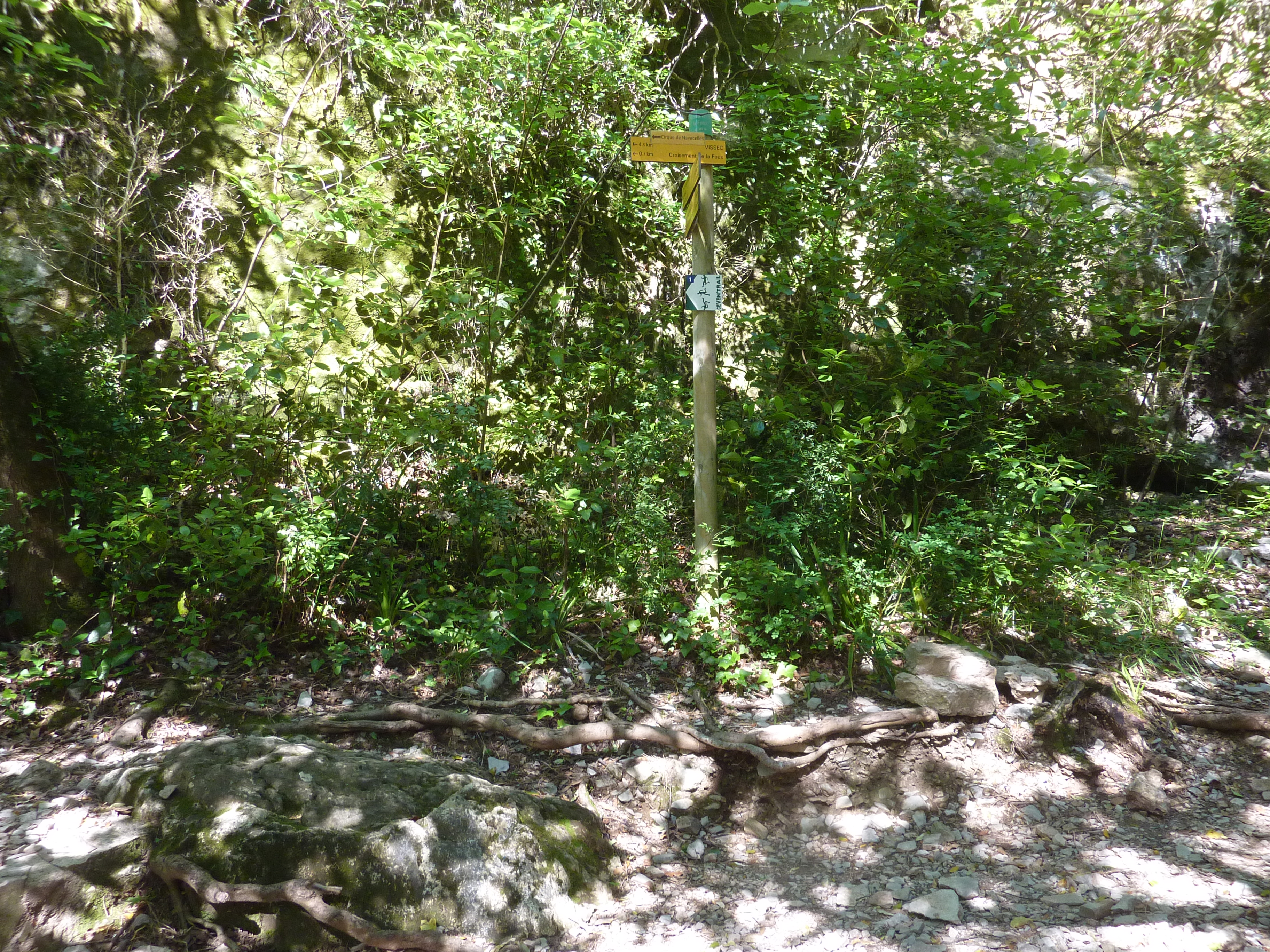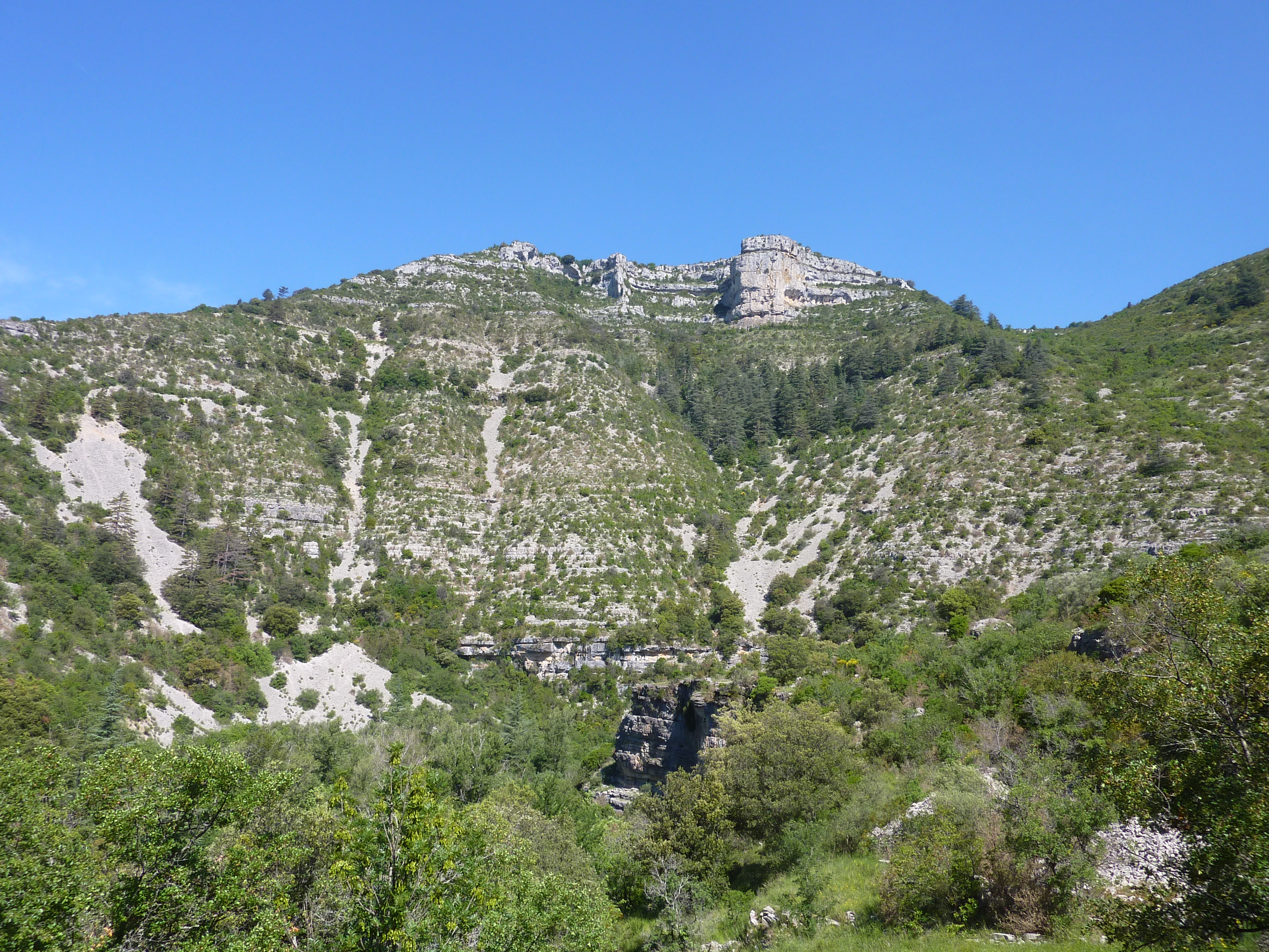 Bois de Calo Rouge (674 m) : suivre le chemin partant sur la gauche et descendant dans les Gorges de la Vis direction Moulins de la Foux, balisé en jaune