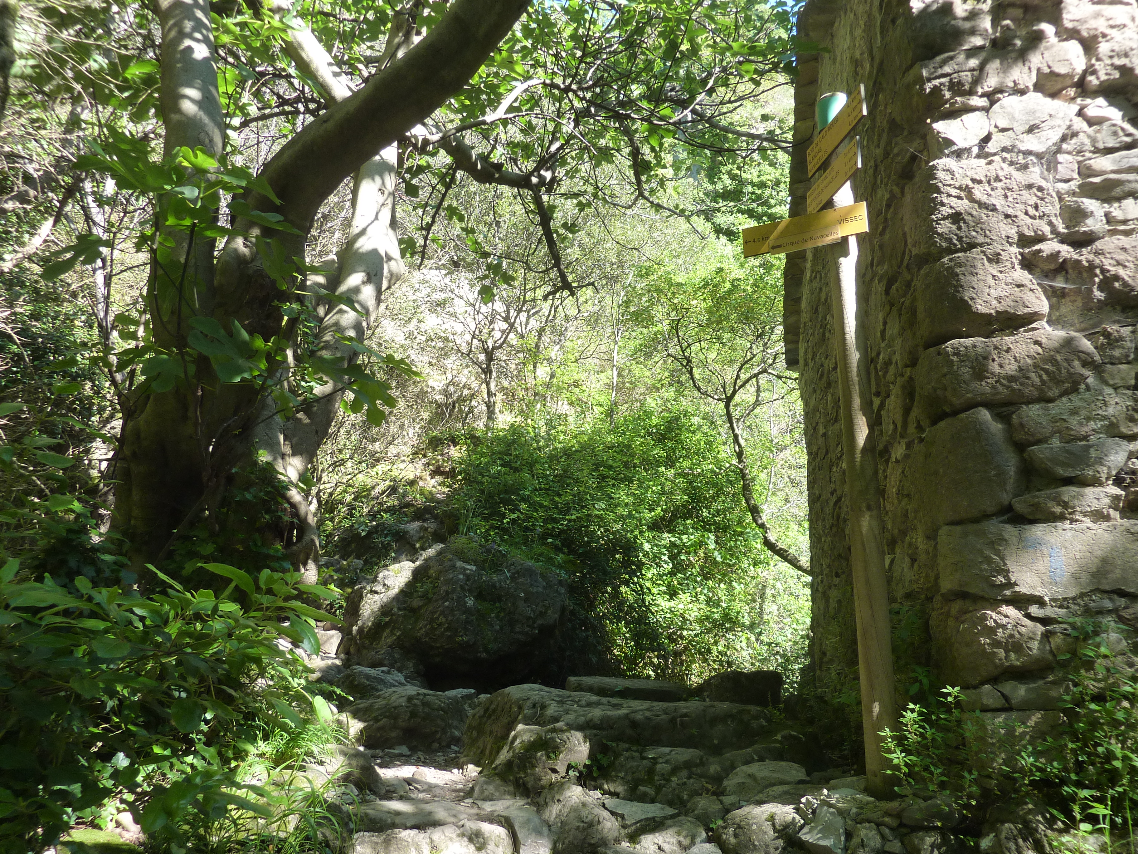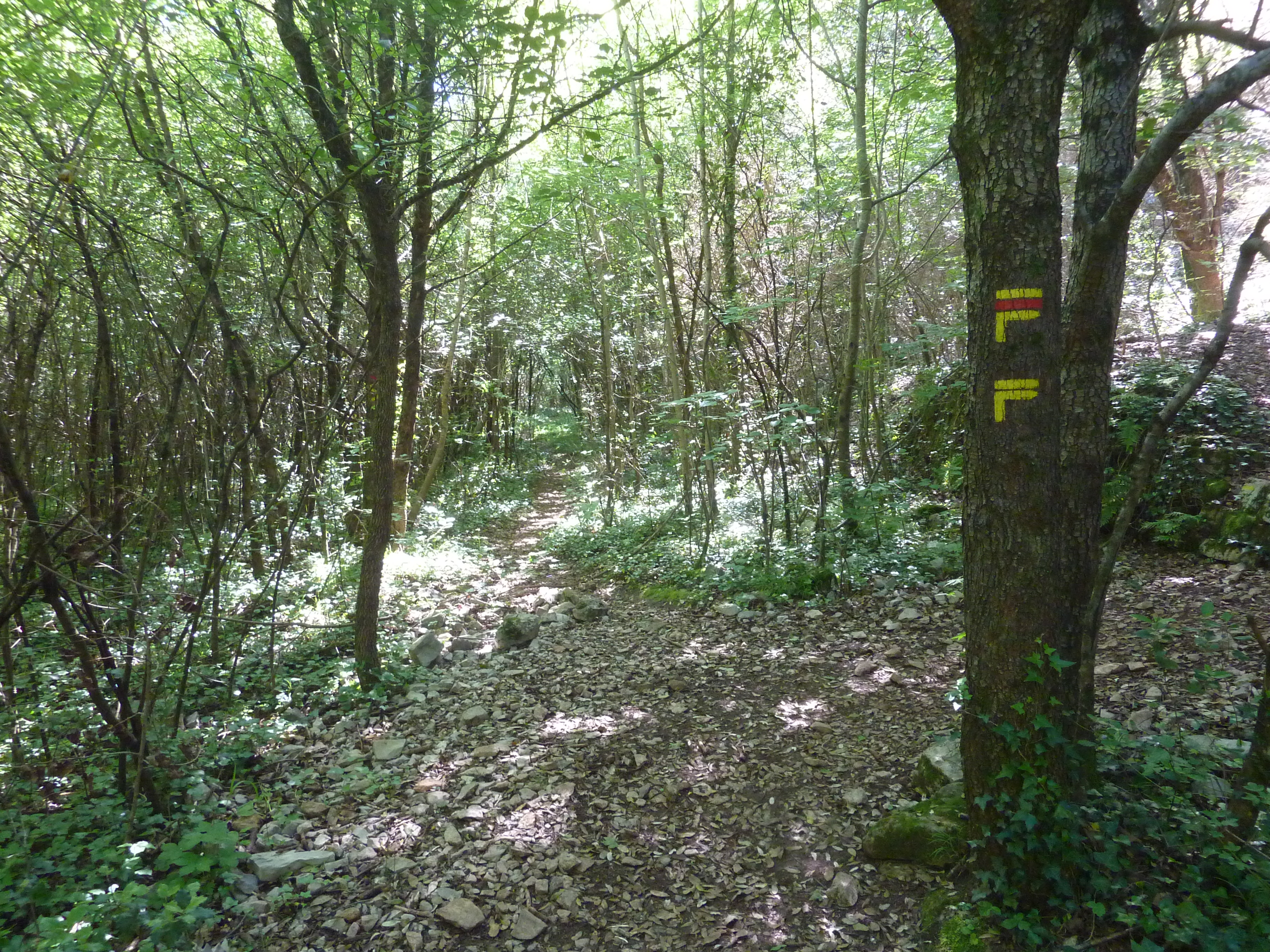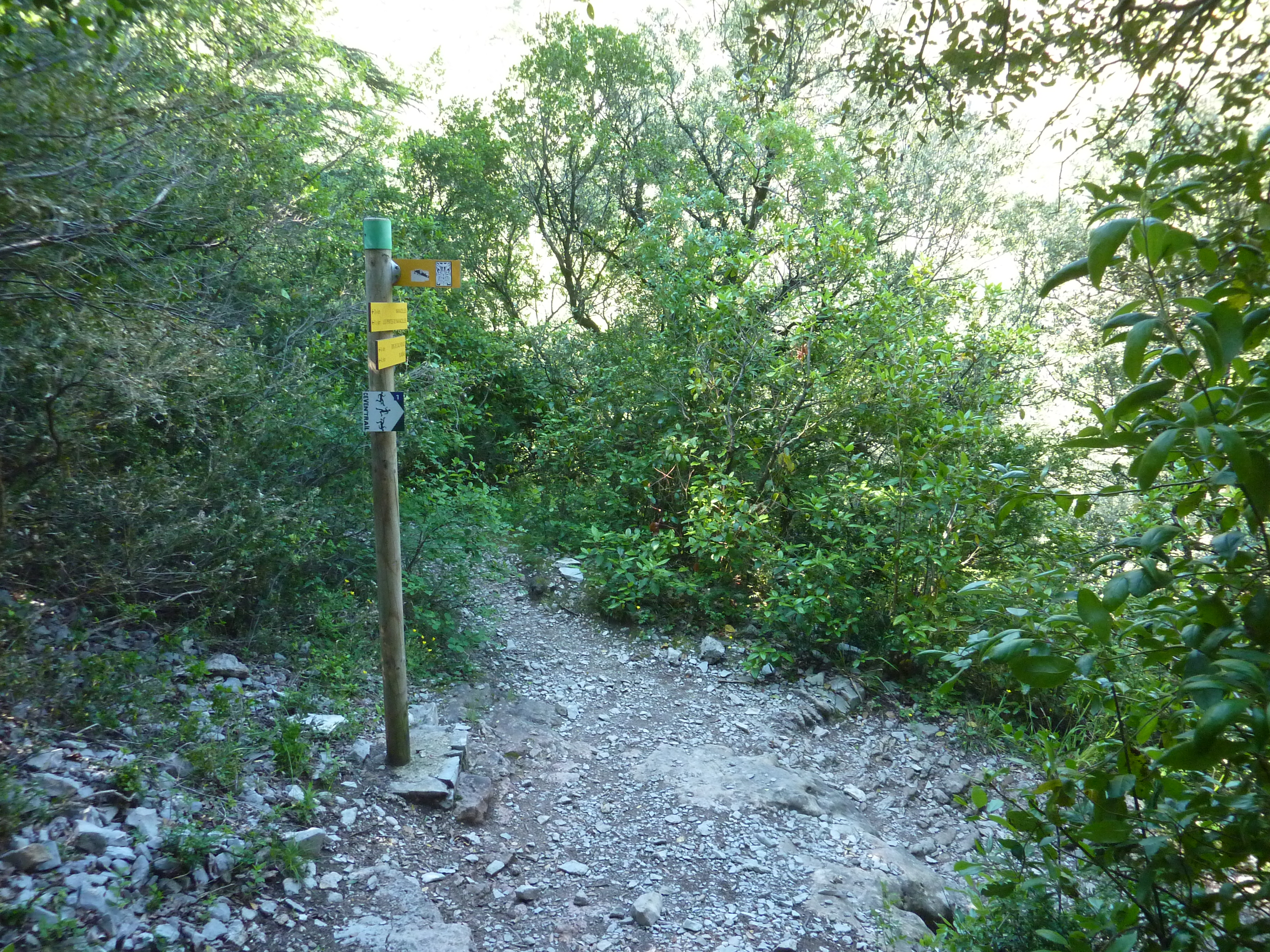 Croisement de la Foux (386 m) : suivre le GRP partant sur la gauche direction Navacelles, balisé en jaune et rouge dorénavant