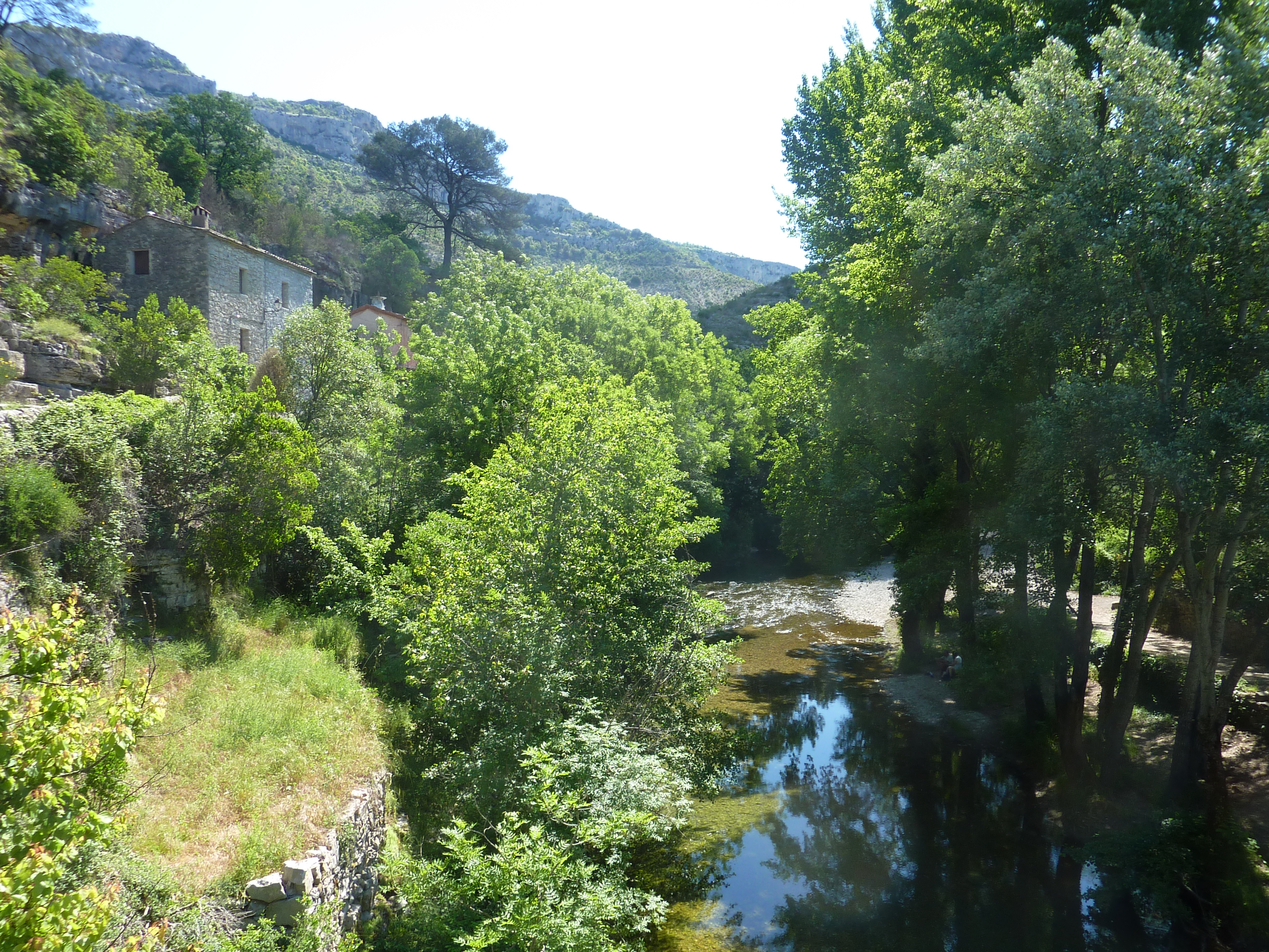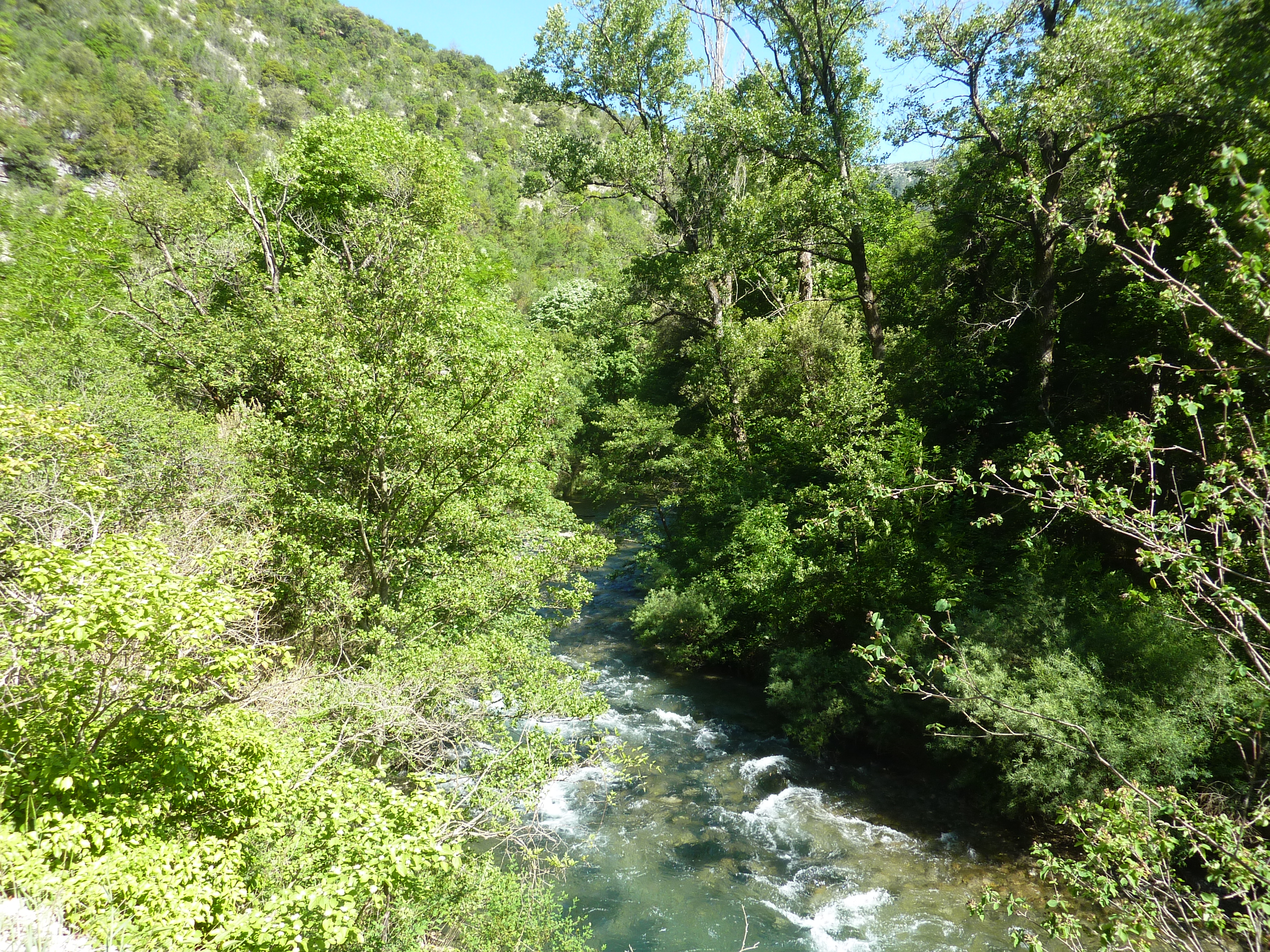 Pont sur la Vis (324 m) : suivre le chemin partant sur la gauche et empruntant le pont direction Hameau de Navacelles, balisé en rouge et blanc dorénavant (on retourne dans le département du Gard en franchissant la Vis)