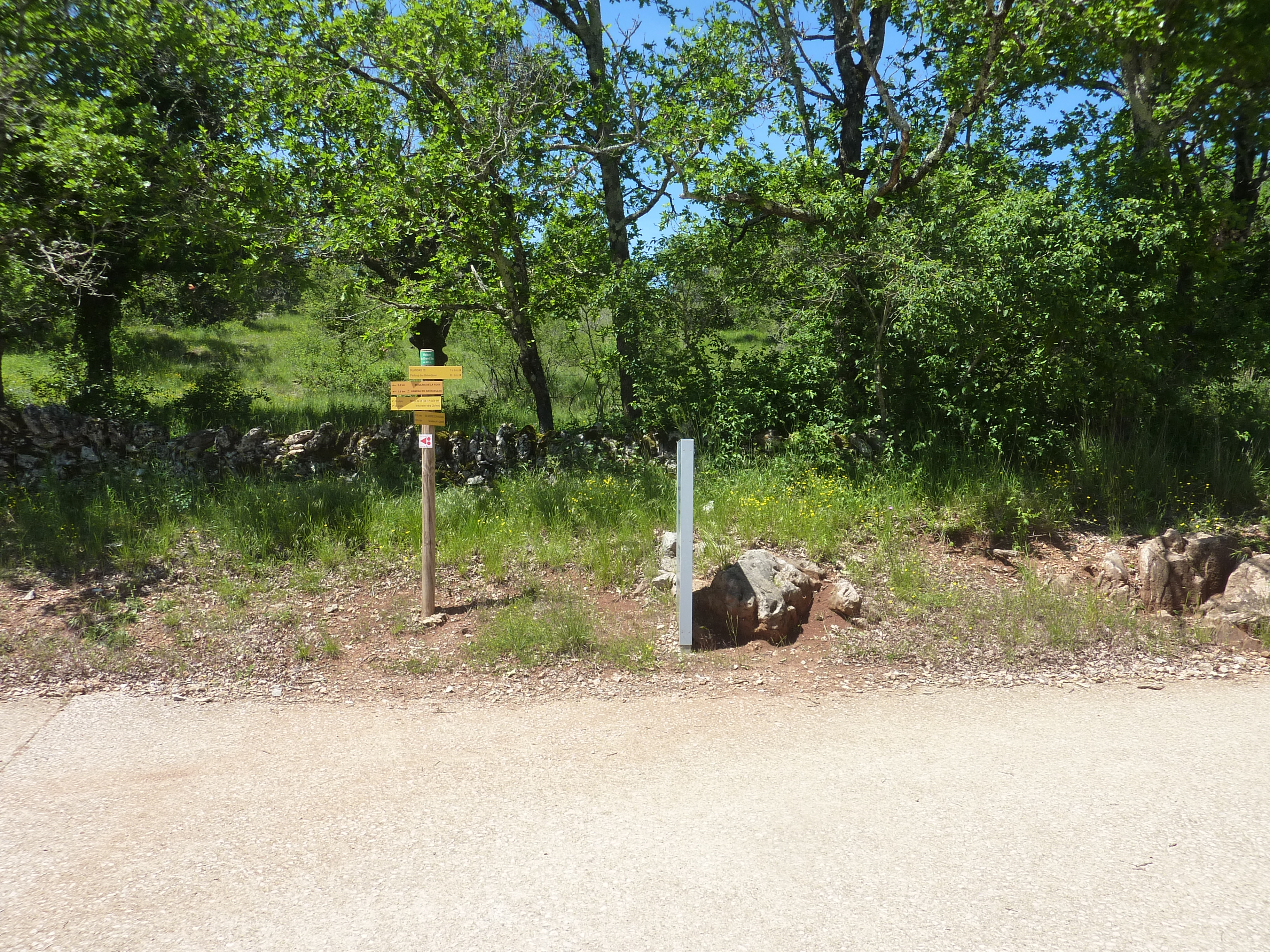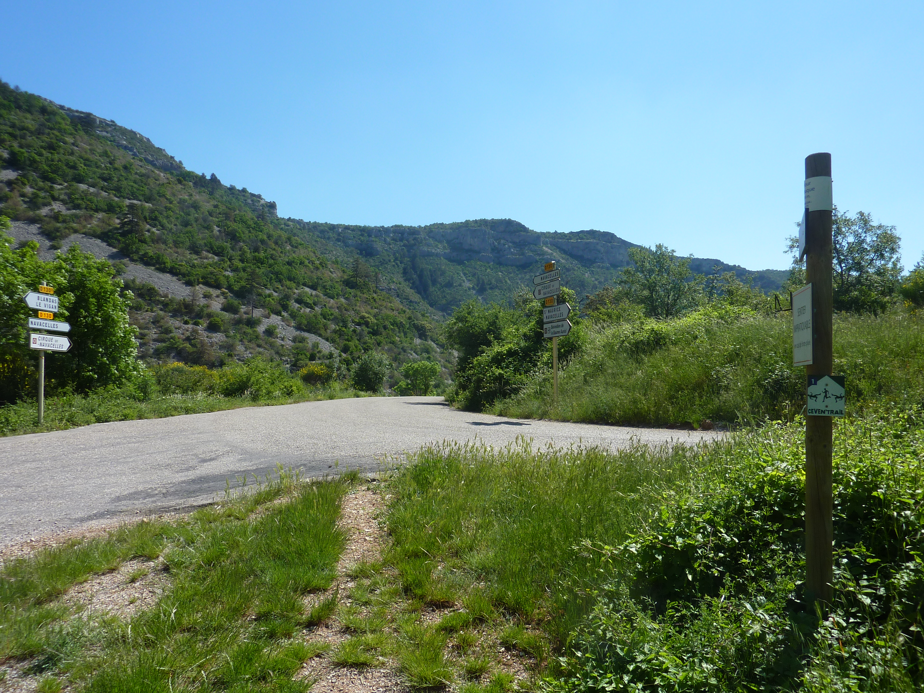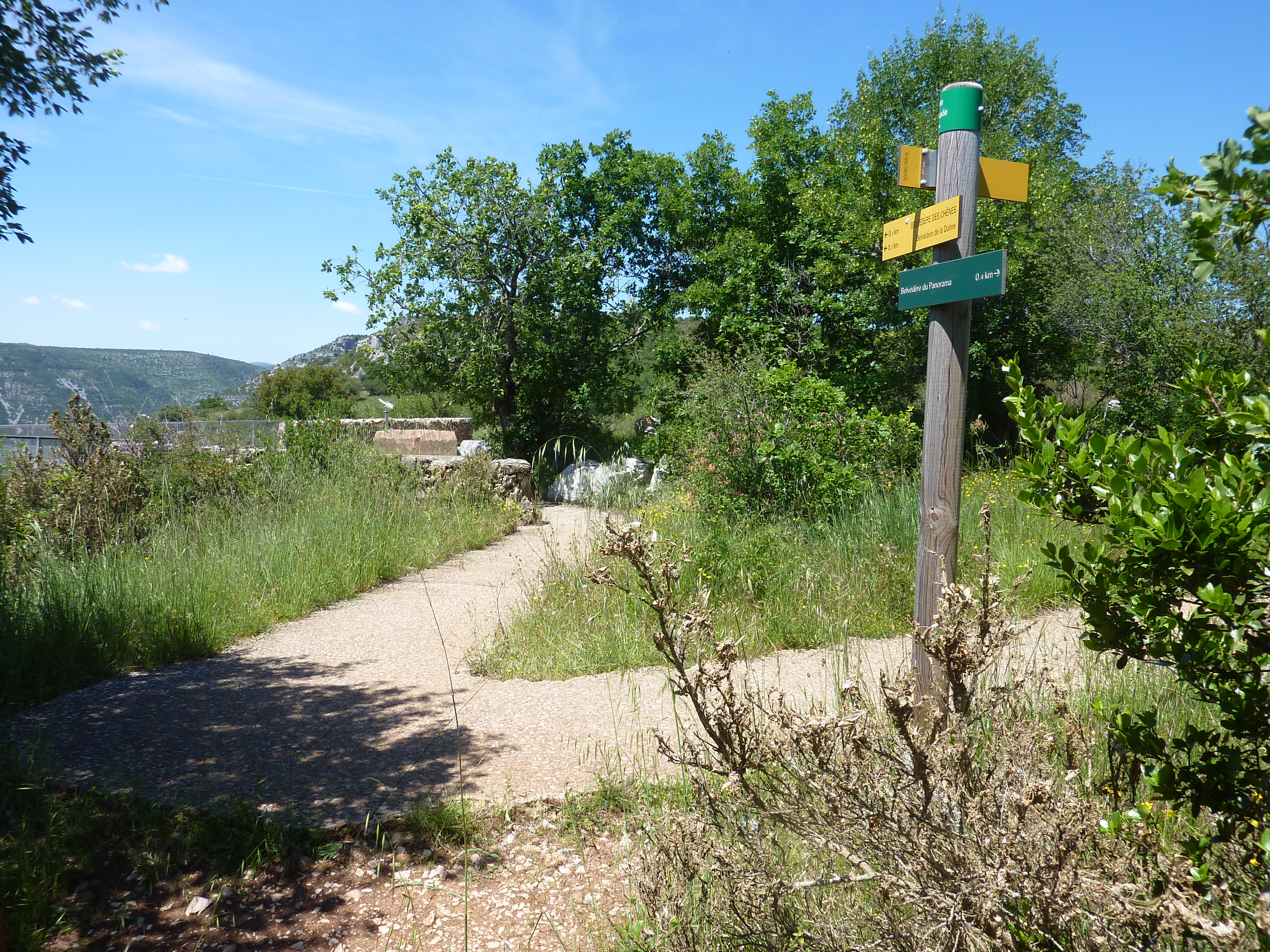 Carrefour de la Truque (374 m) : suivre la route descendant en quasi demi-tour sur la gauche direction Hameau de Navacelles, balisé en jaune et rouge