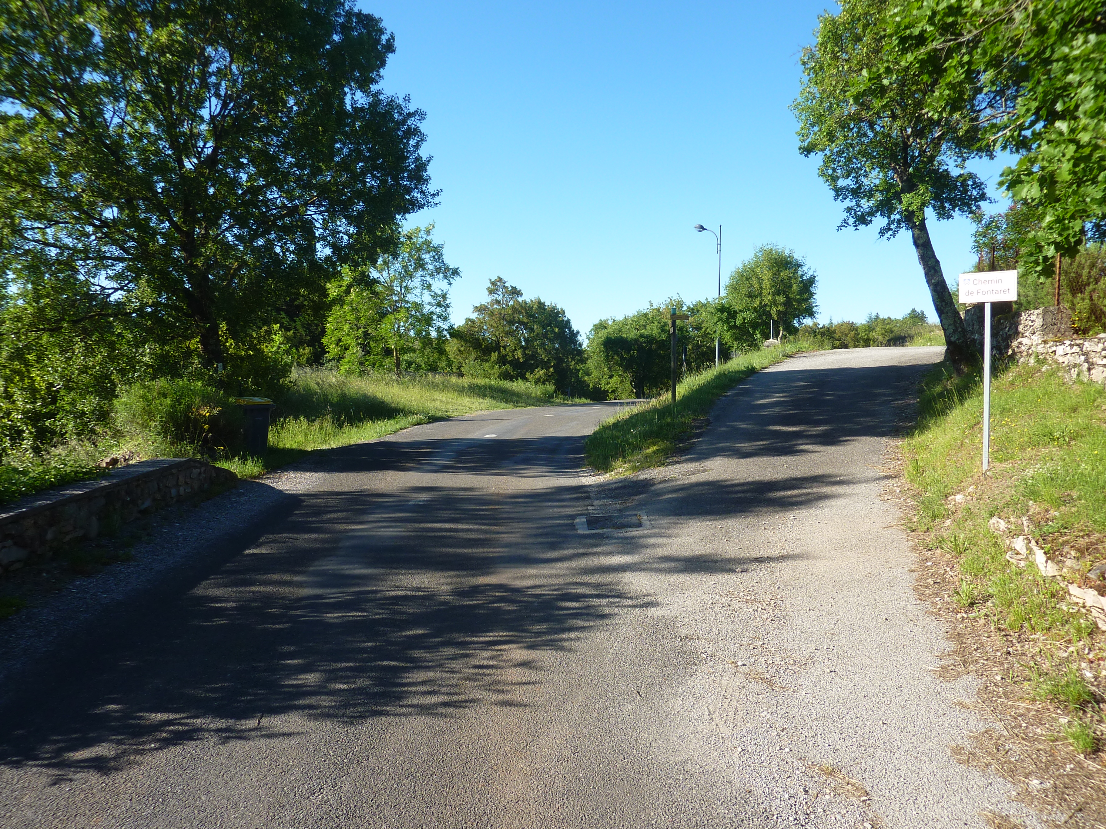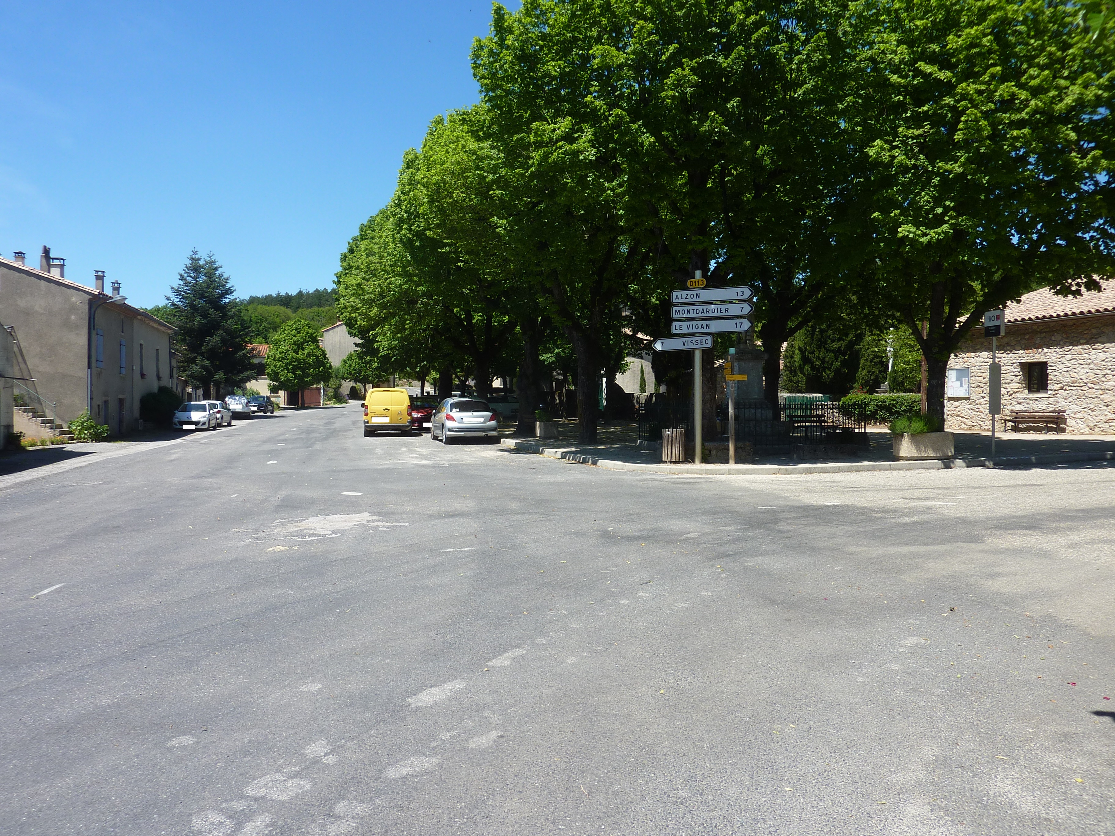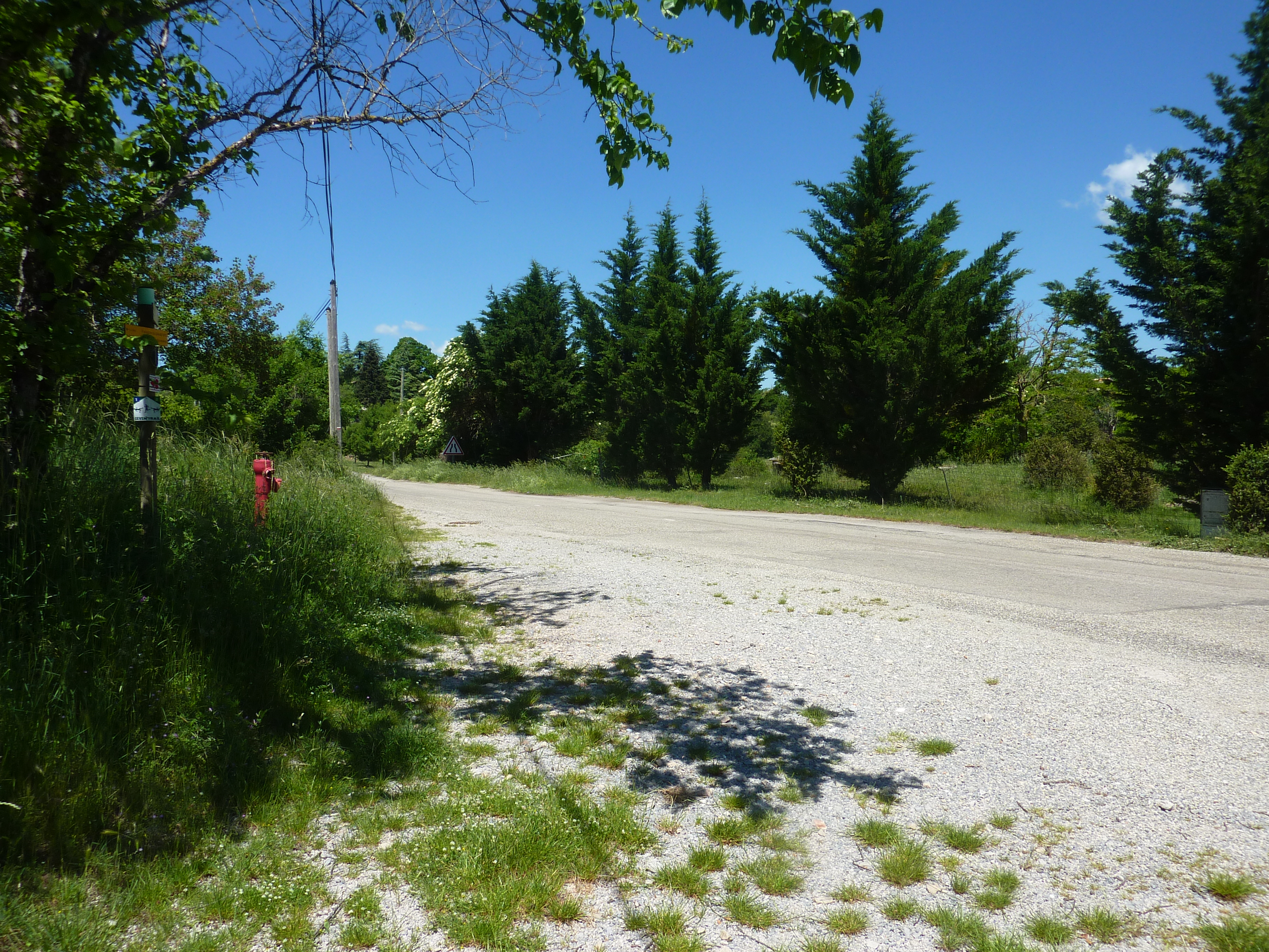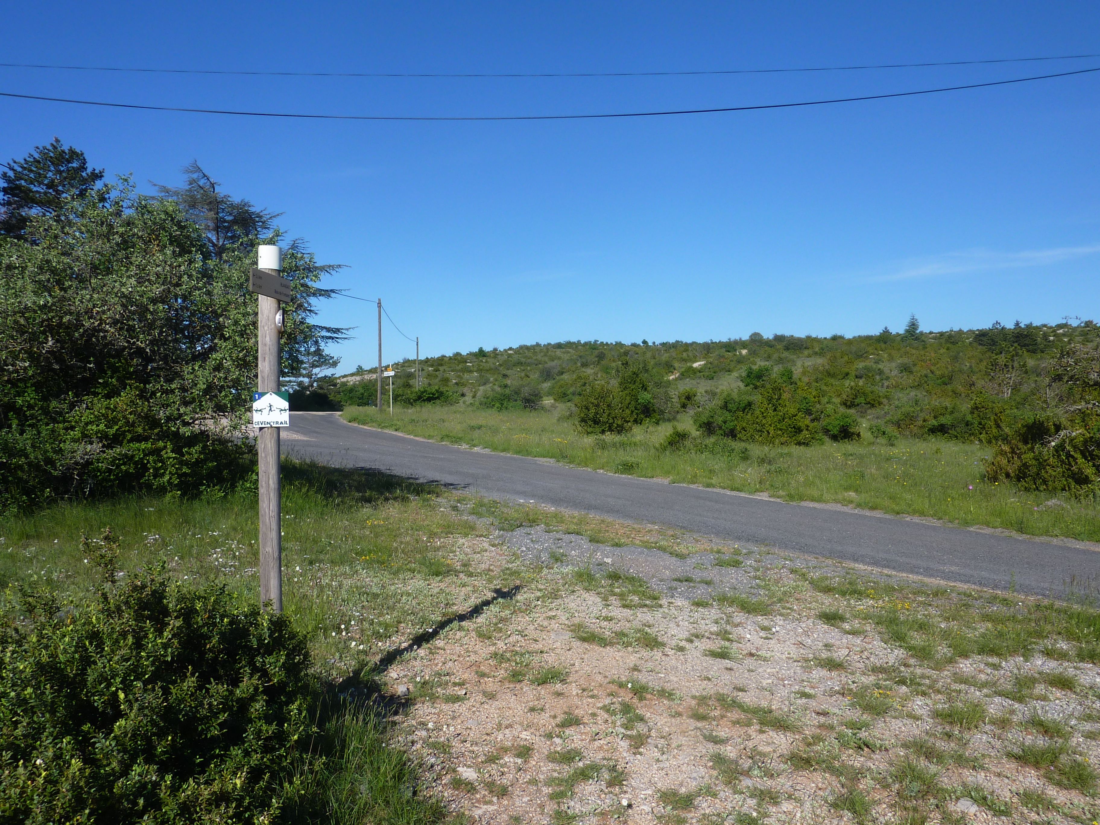 Carrefour de la Truque (374 m) : suivre la route descendant en quasi demi-tour sur la gauche direction Hameau de Navacelles, balisé en jaune et rouge