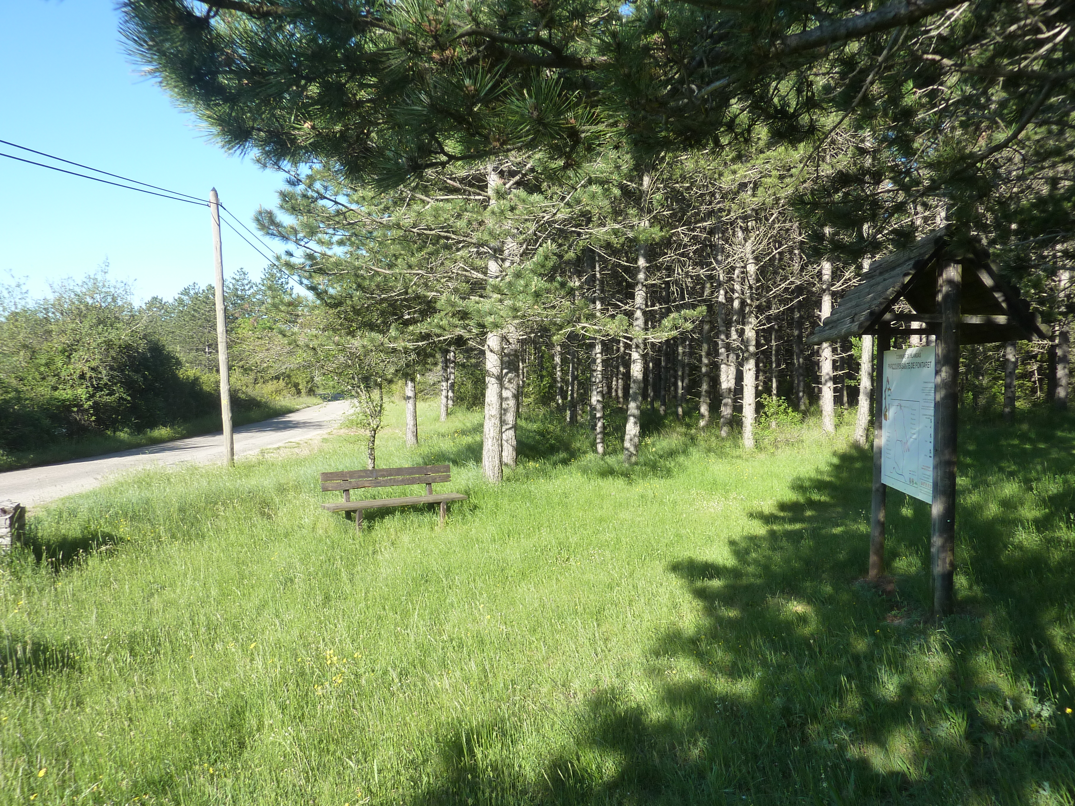 A ce croisement situé au niveau de ce panneau informatif (300 mètres après le lieu-dit "Cardabelle") (701 m), suivre le chemin partant vers la droite direction Bois de Calo Rouge, balisé en jaune (attention, l'itinéraire sur terrain réel ne suit plus la route sur 900 m)