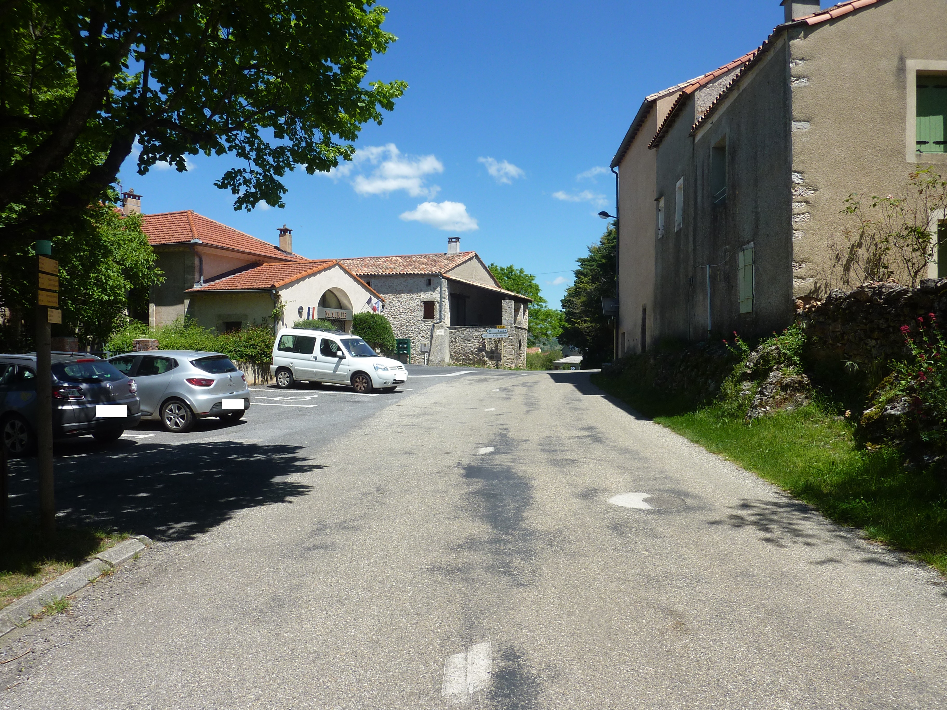 Départ Blandas - Mairie (644 m) : suivre la rue partant tout droit direction Bois de Calo Rouge, balisé en rouge et blanc, et en jaune