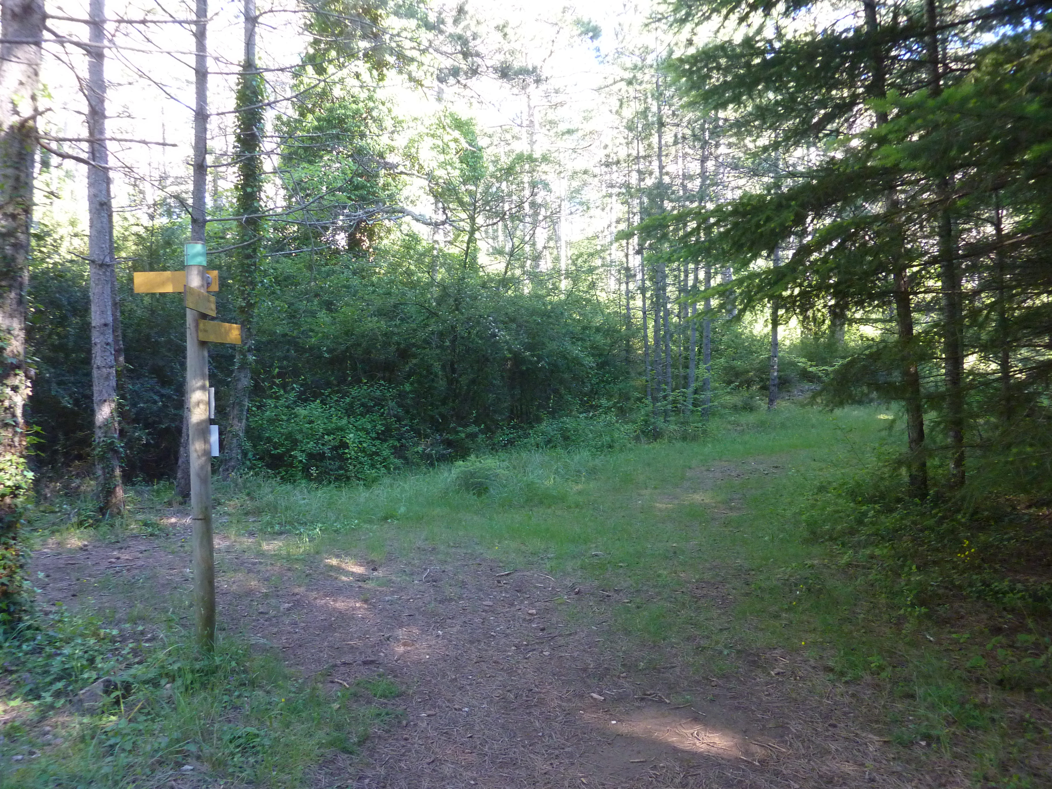 Bois de Fontaret (686 m) : suivre le chemin partant tout droit direction Bois de Calo Rouge, balisé en jaune (l'itinéraire reprend le tracé initial de la carte IGN désormais)