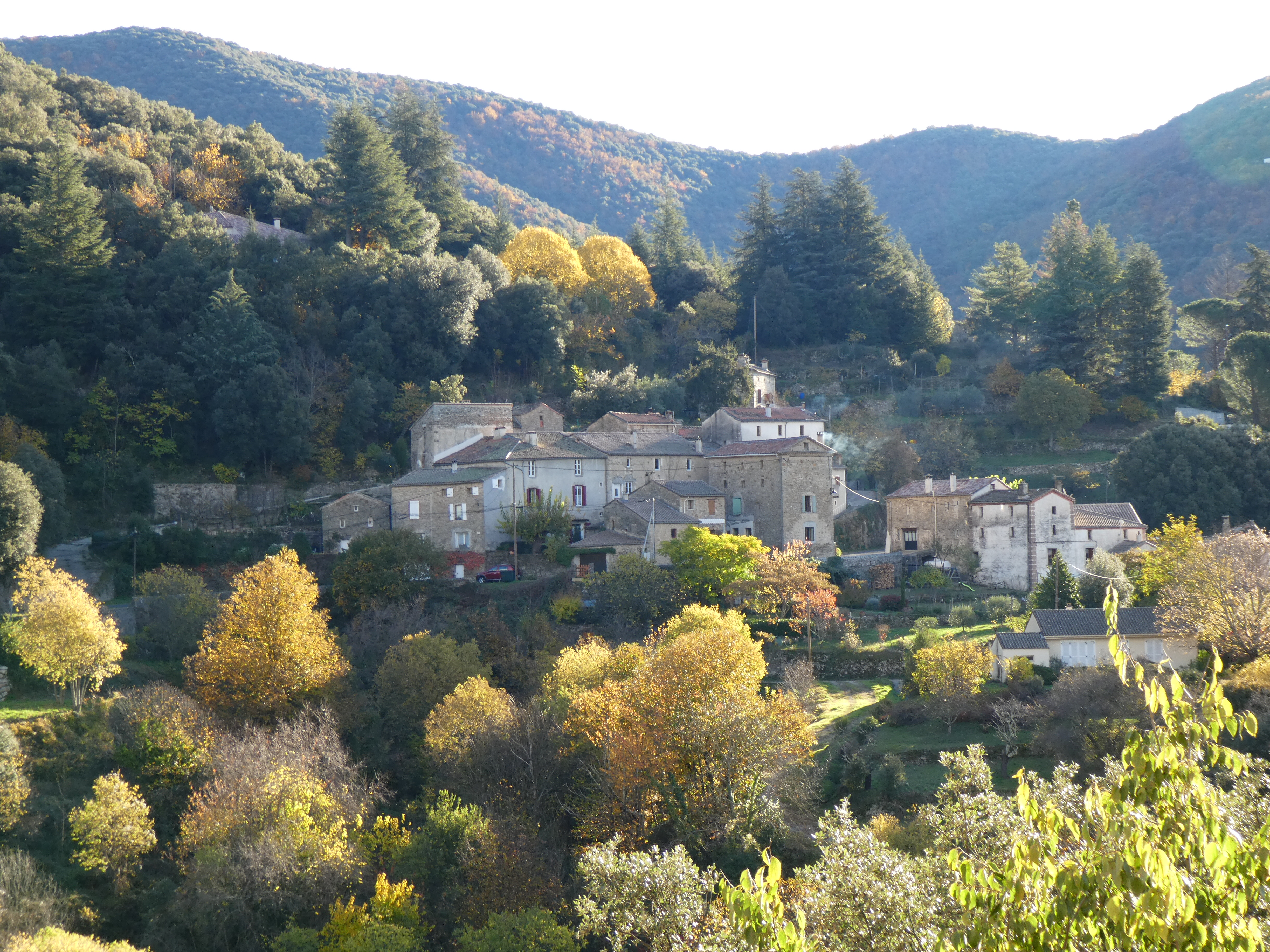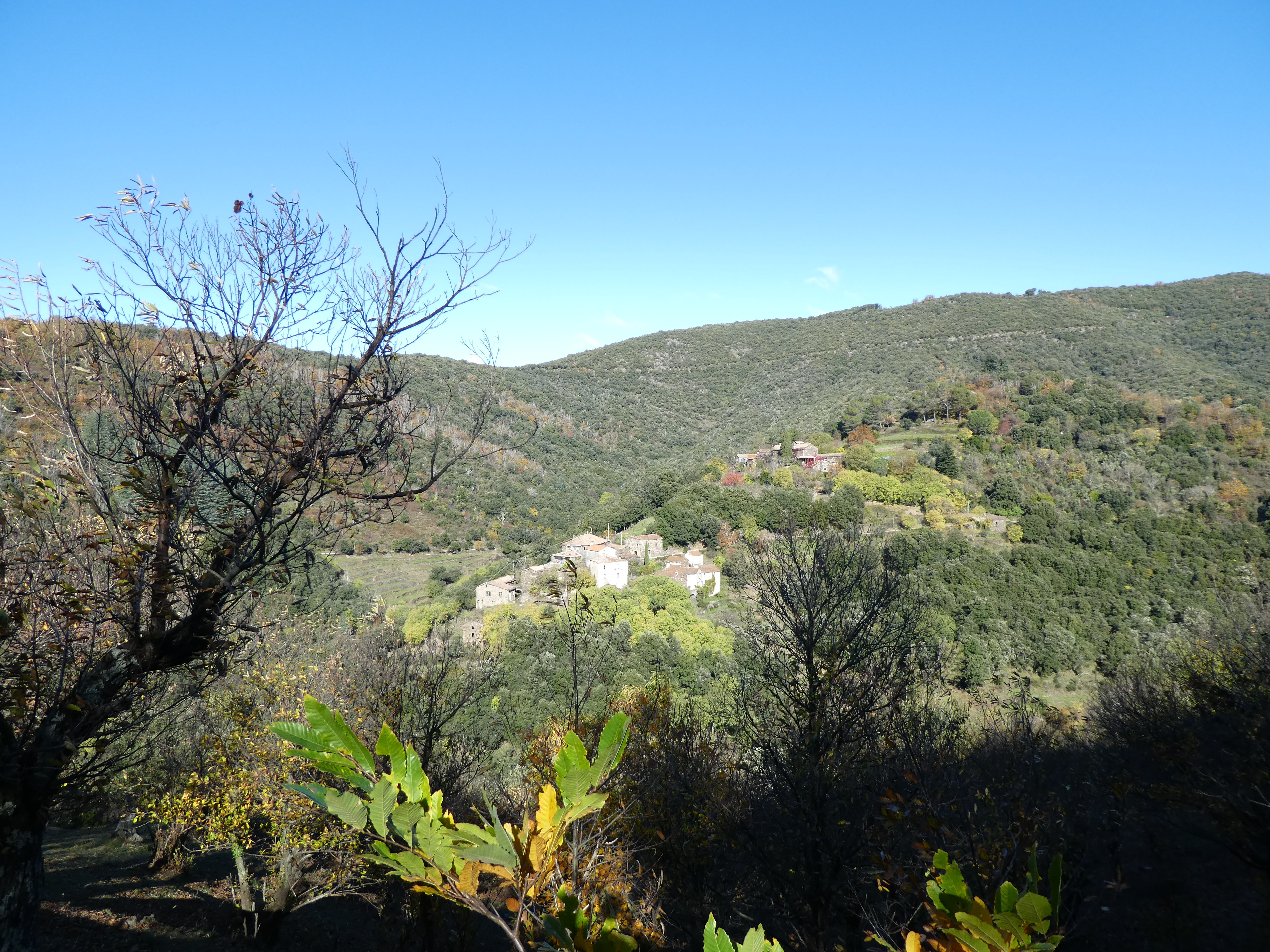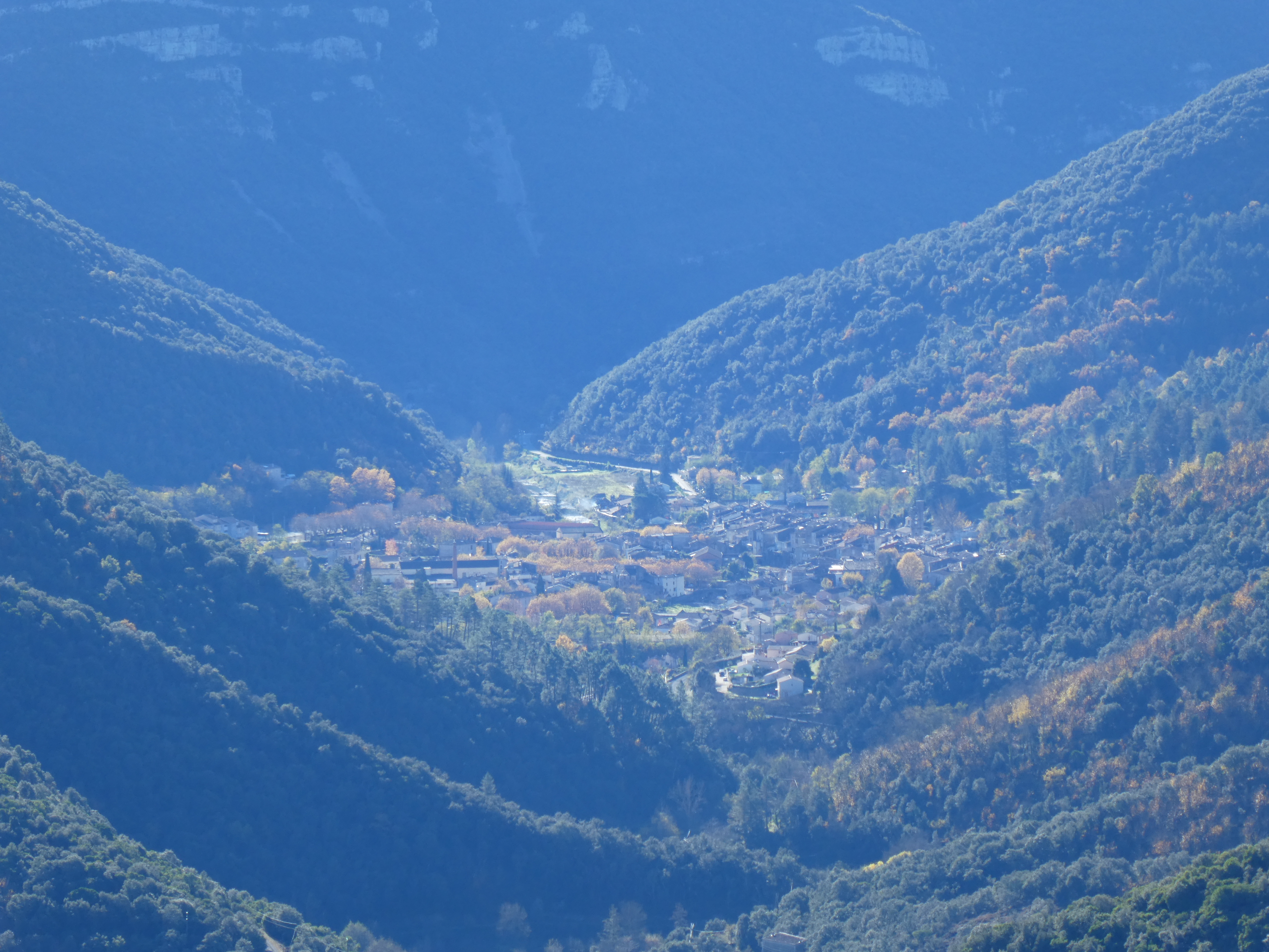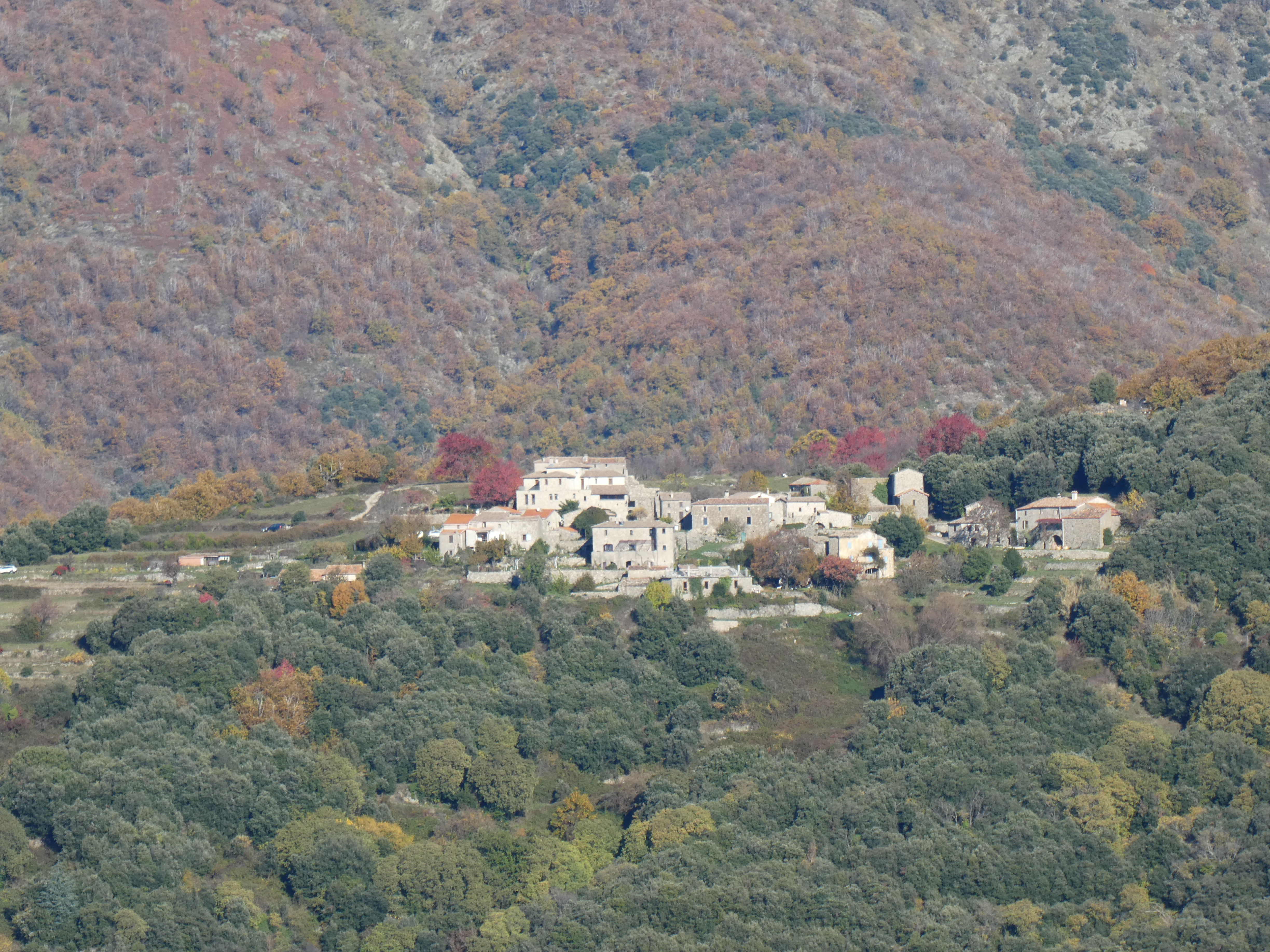 Une petite ouverture sur le village de Notre-Dame-de-la-Rouvière ainsi que sur le Serre de la Toureille et la crête du Pic de Barette au fond