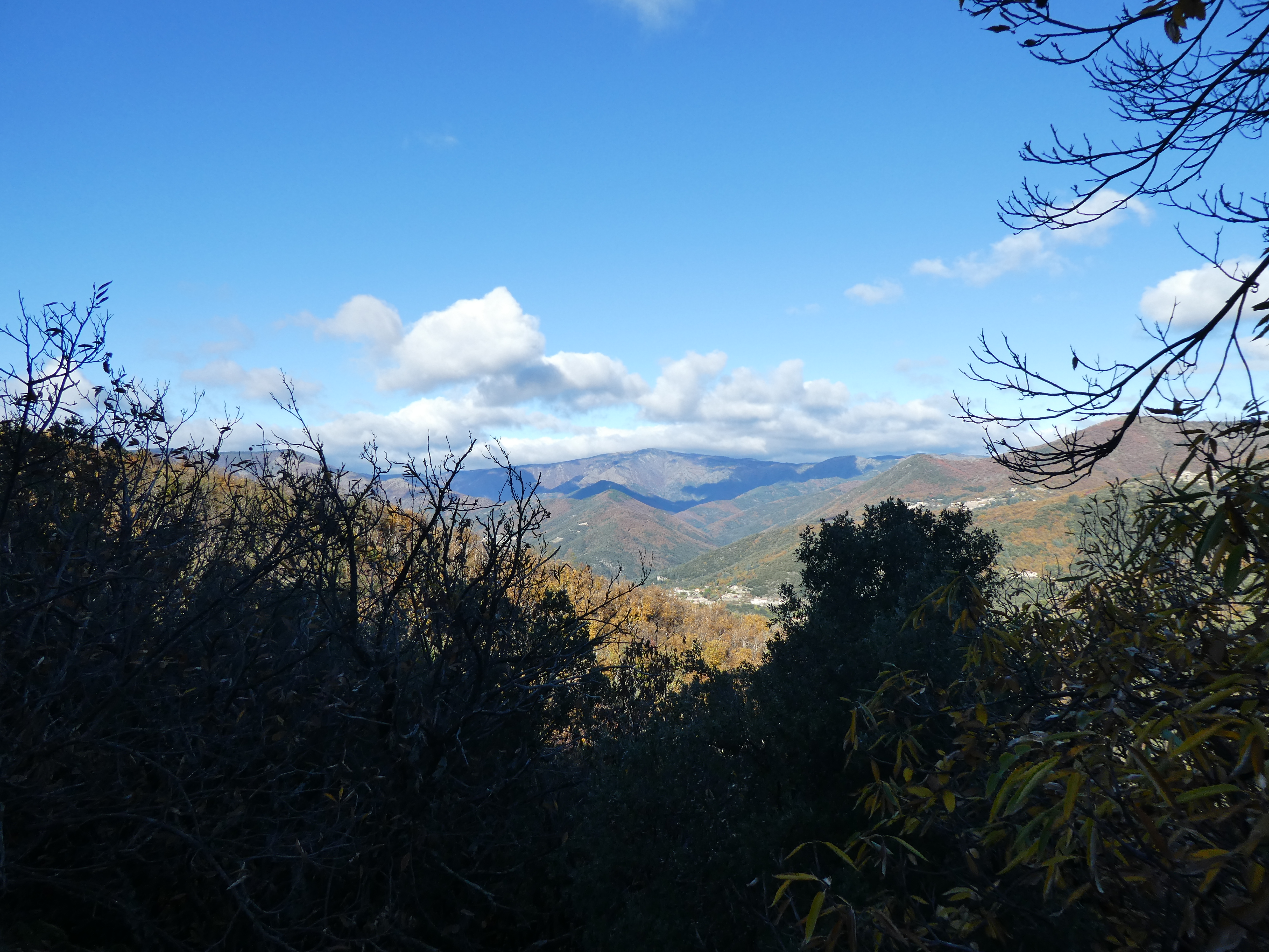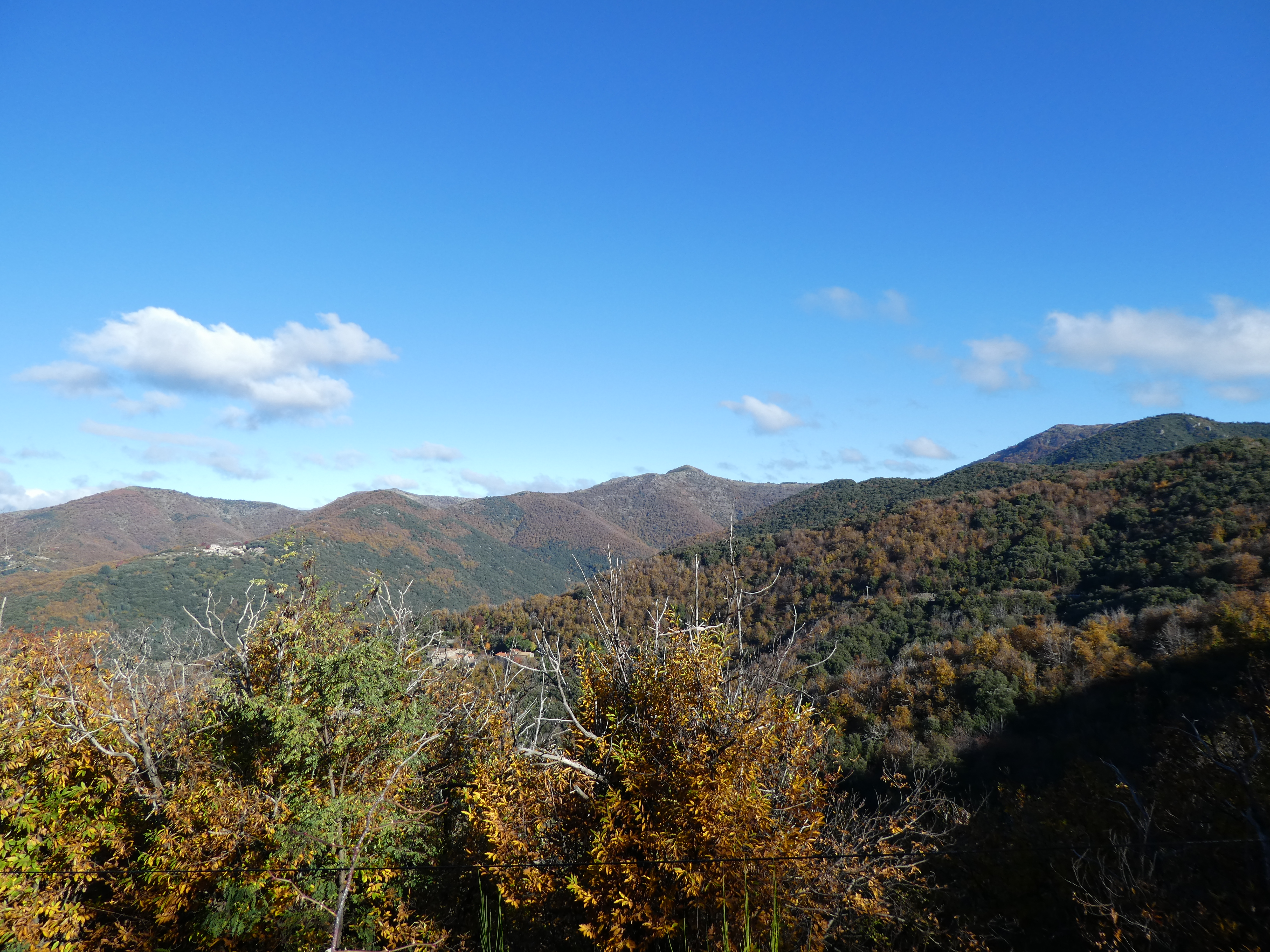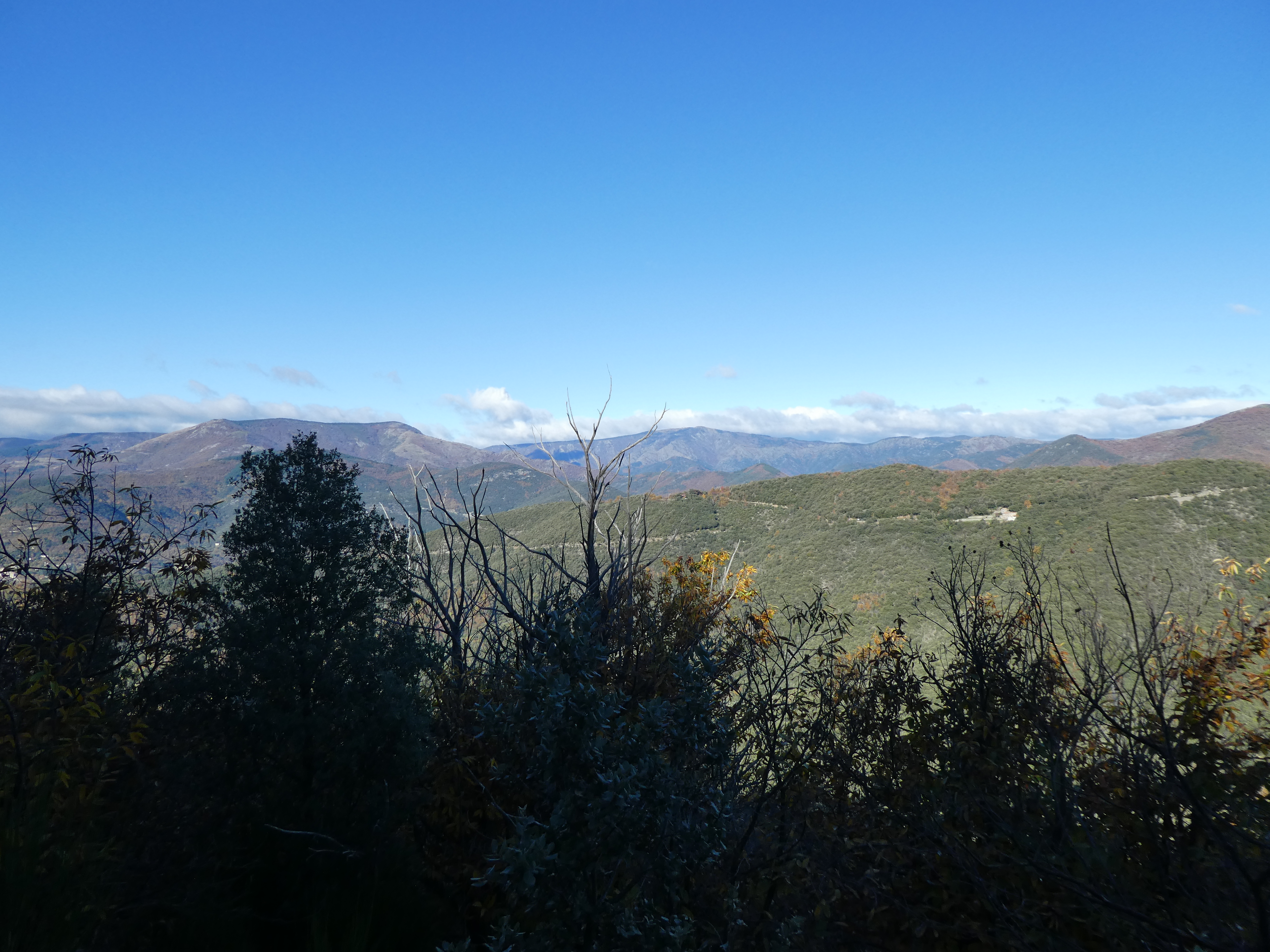La vue se dévoile sur le Serre de la Toureille (1256 m) et le Pic de Barette (1308 m) à gauche et le Mont Aigoual (1565 m) au centre