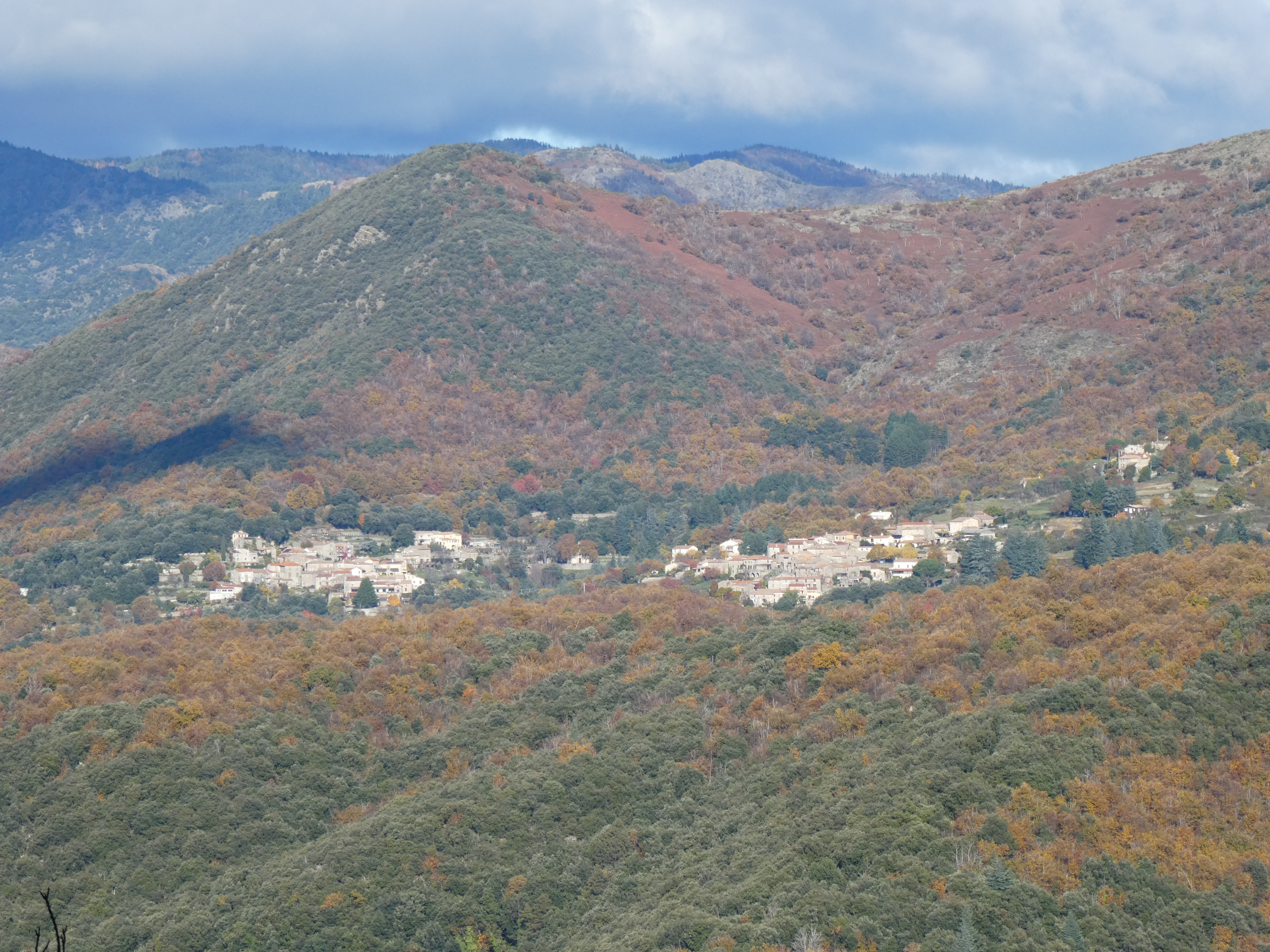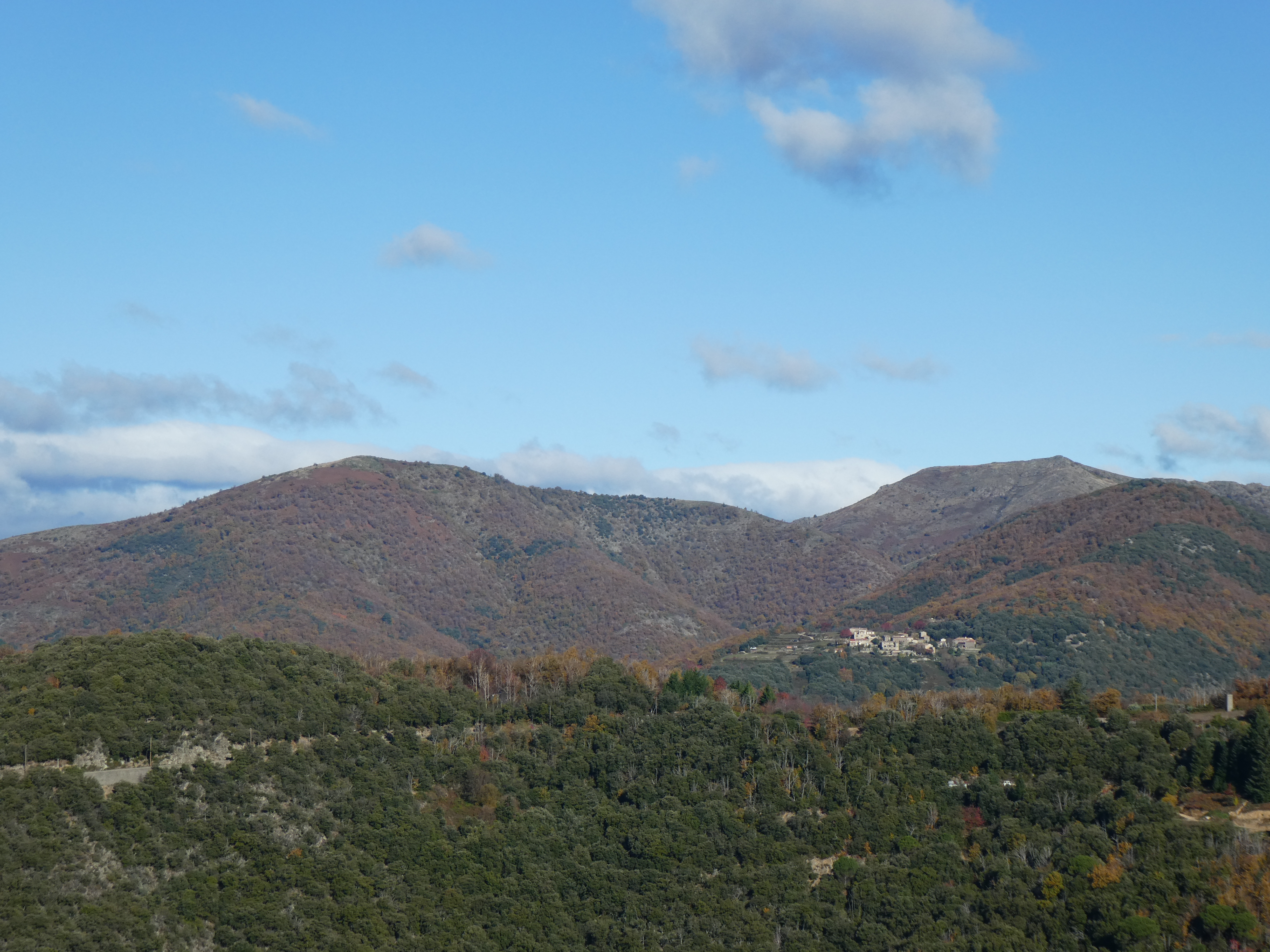 Vue sur les sommets de la Vallée du Rieutord avec le Ranc de Banes (713 m) au centre dominant le village de Sumène