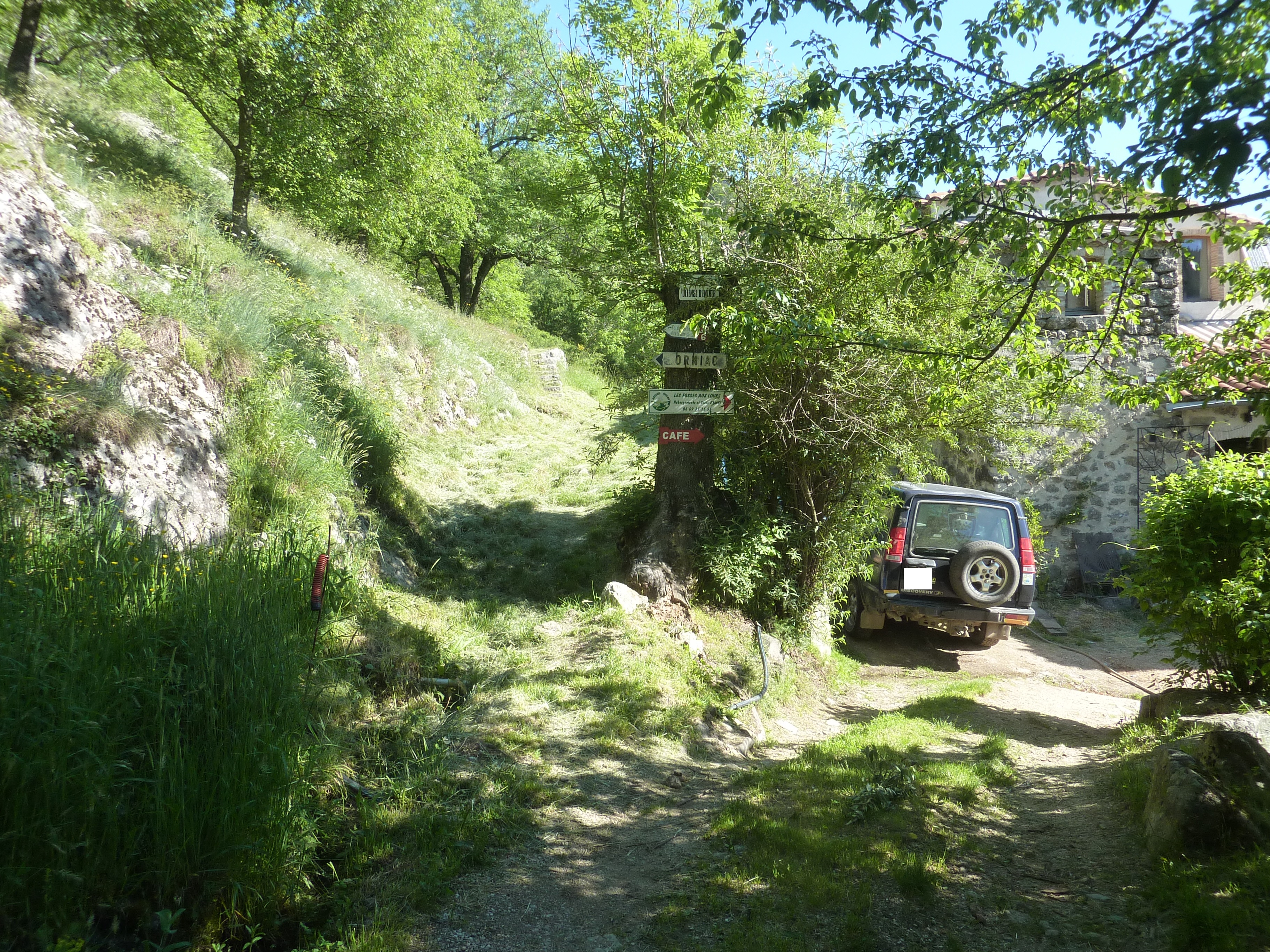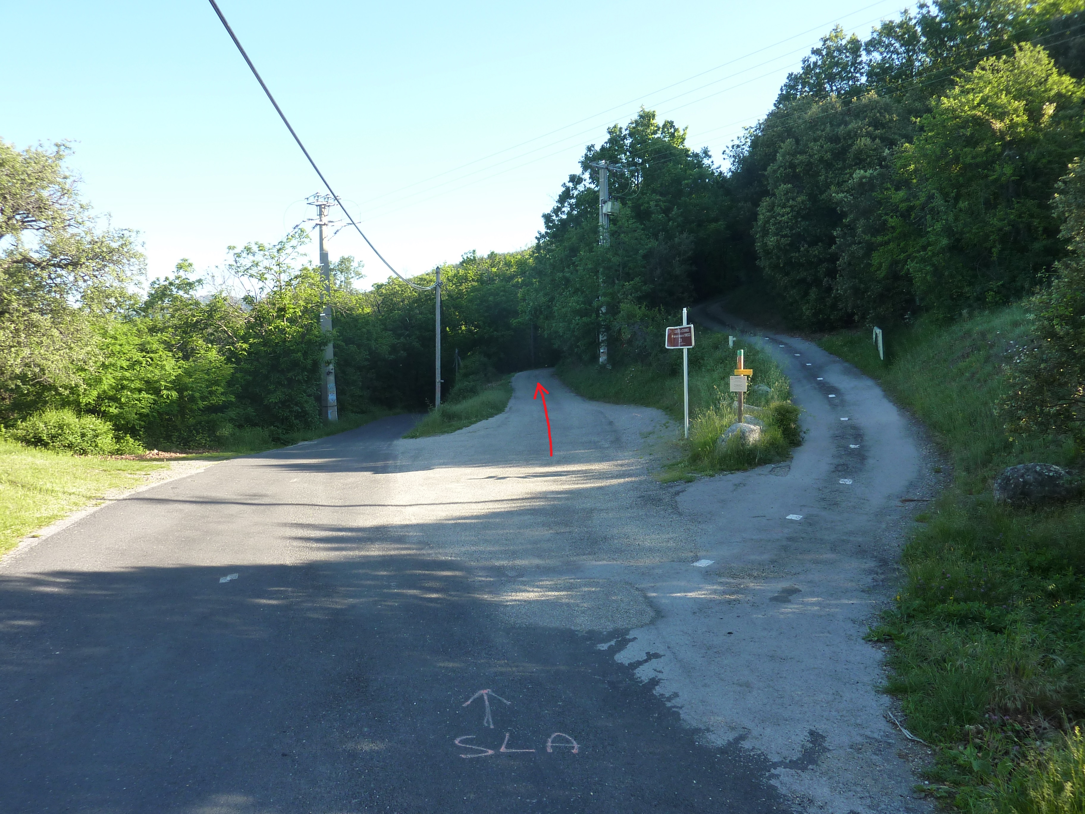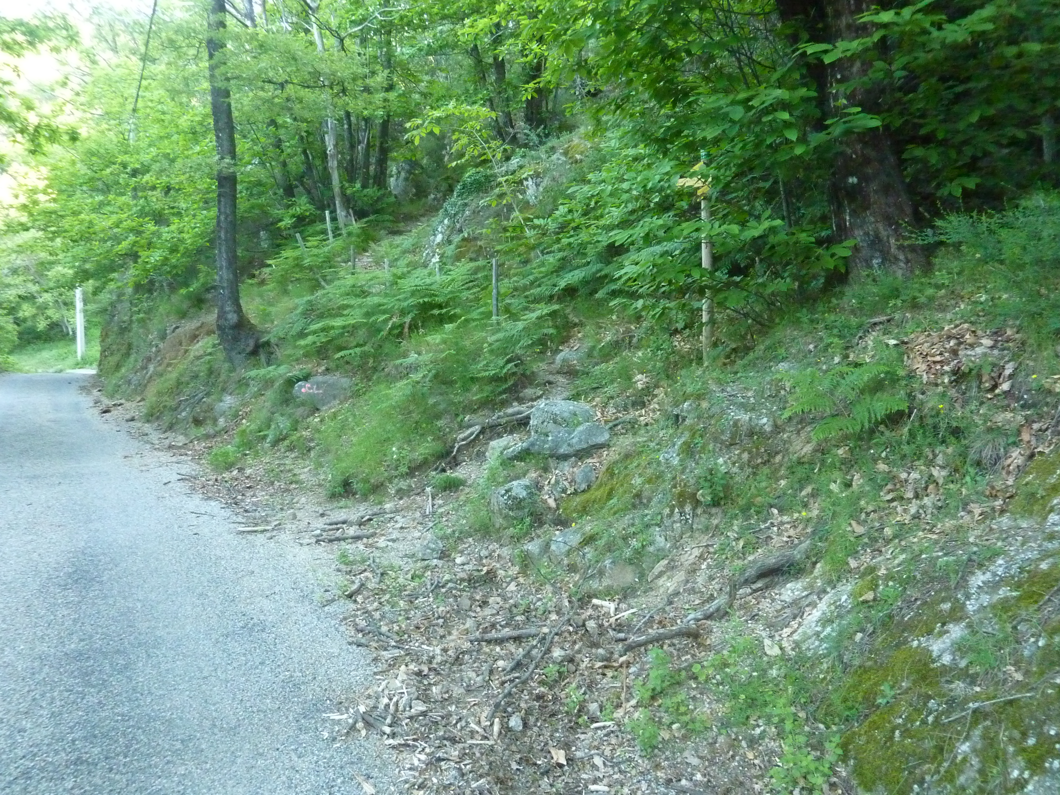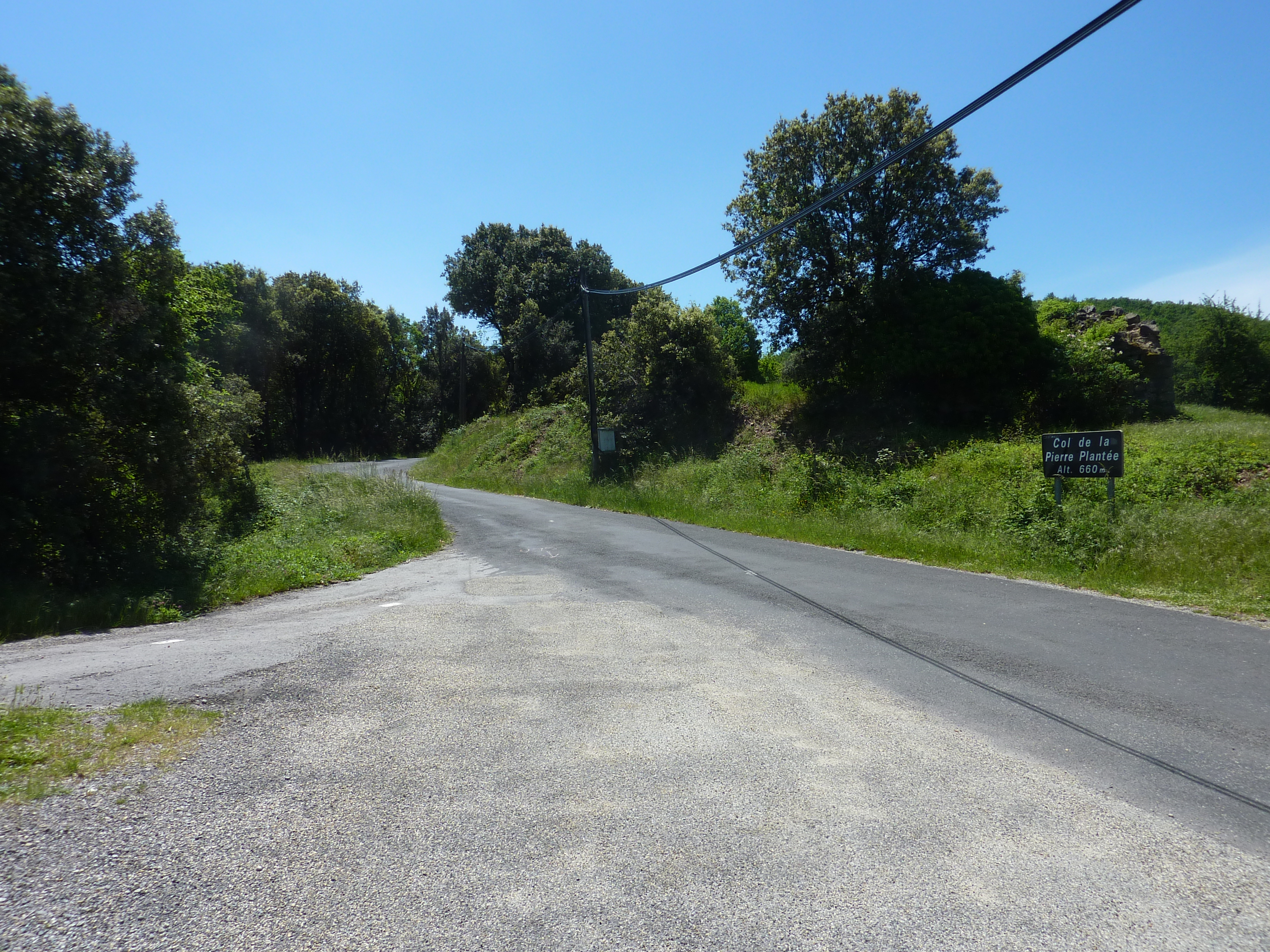 Col de la Pierre Plantée (665 m) : suivre la route partant tout droit direction Saint-Roman-de-Codières (par Baucel), balisé en jaune