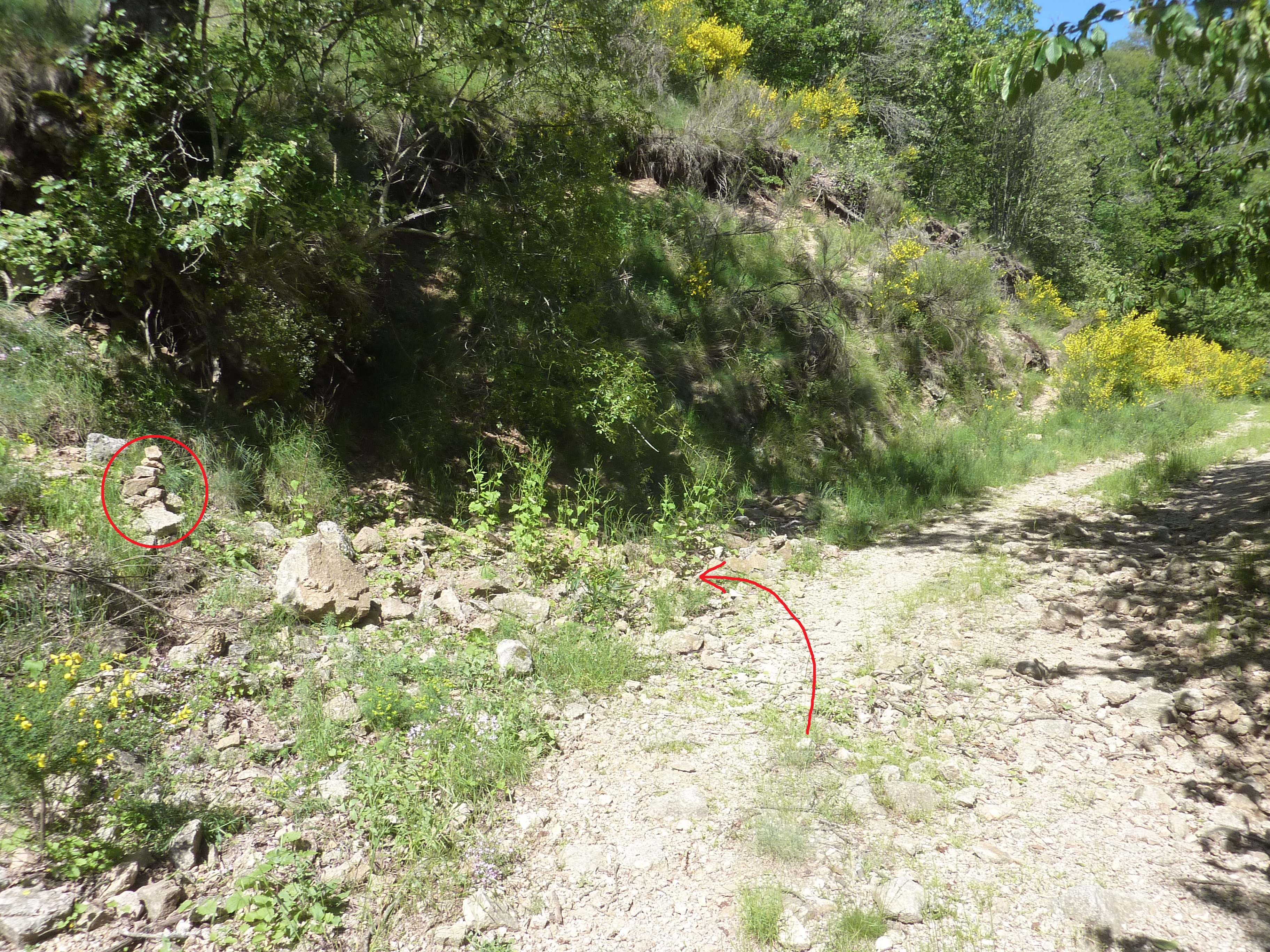 A ce croisement (200 mètres après le Col de la Pierre Plantée) (672 m), suivre la piste partant sur la droite direction Saint-Roman-de-Codières, balisé en jaune