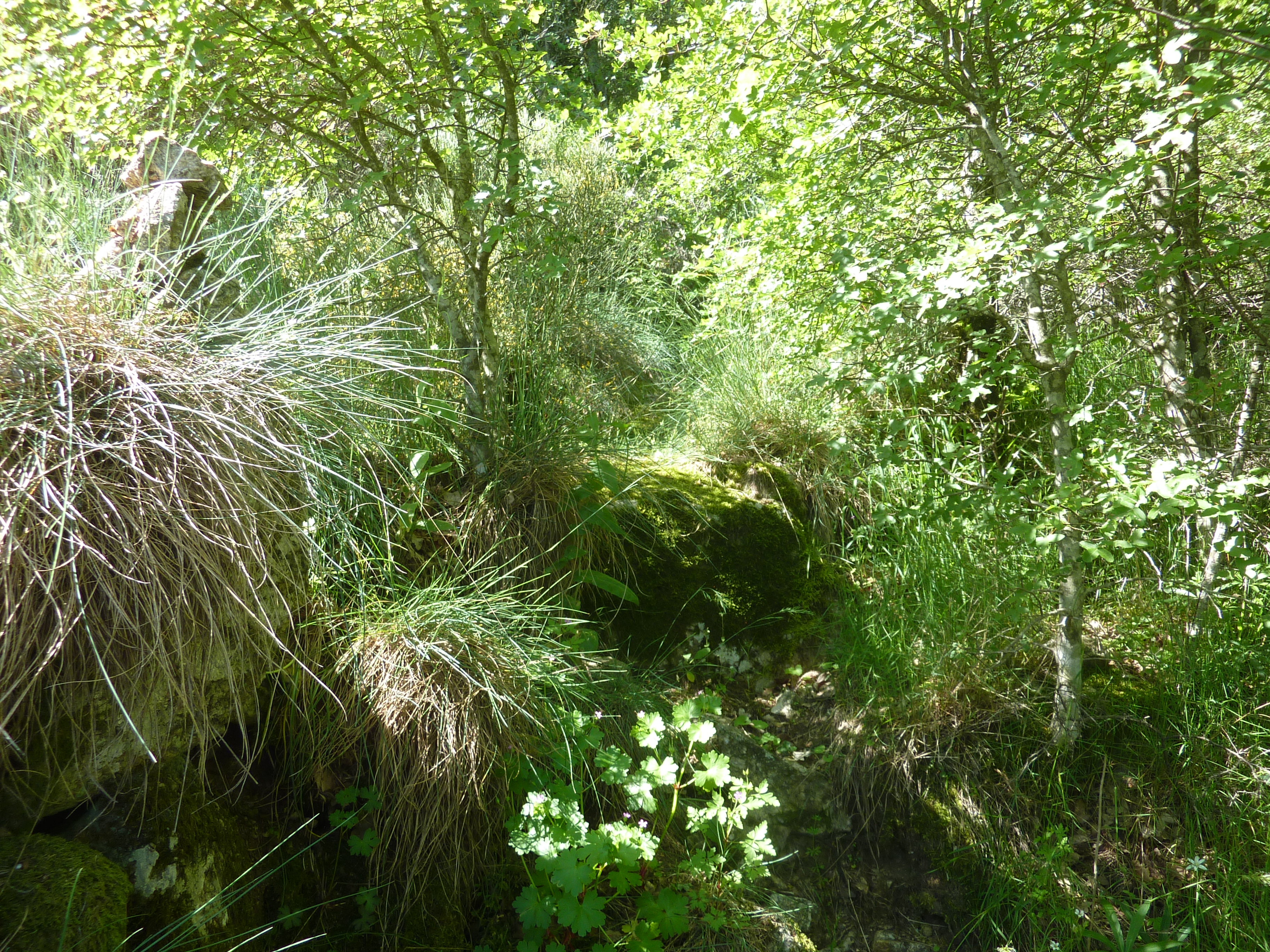 Au sommet de l'éboulement, suivre l'ancien tracé du GR6 partant sur la droite direction Col de la Baraque (la végétation est assez dense sur le chemin ... pantalon long recommandé !)