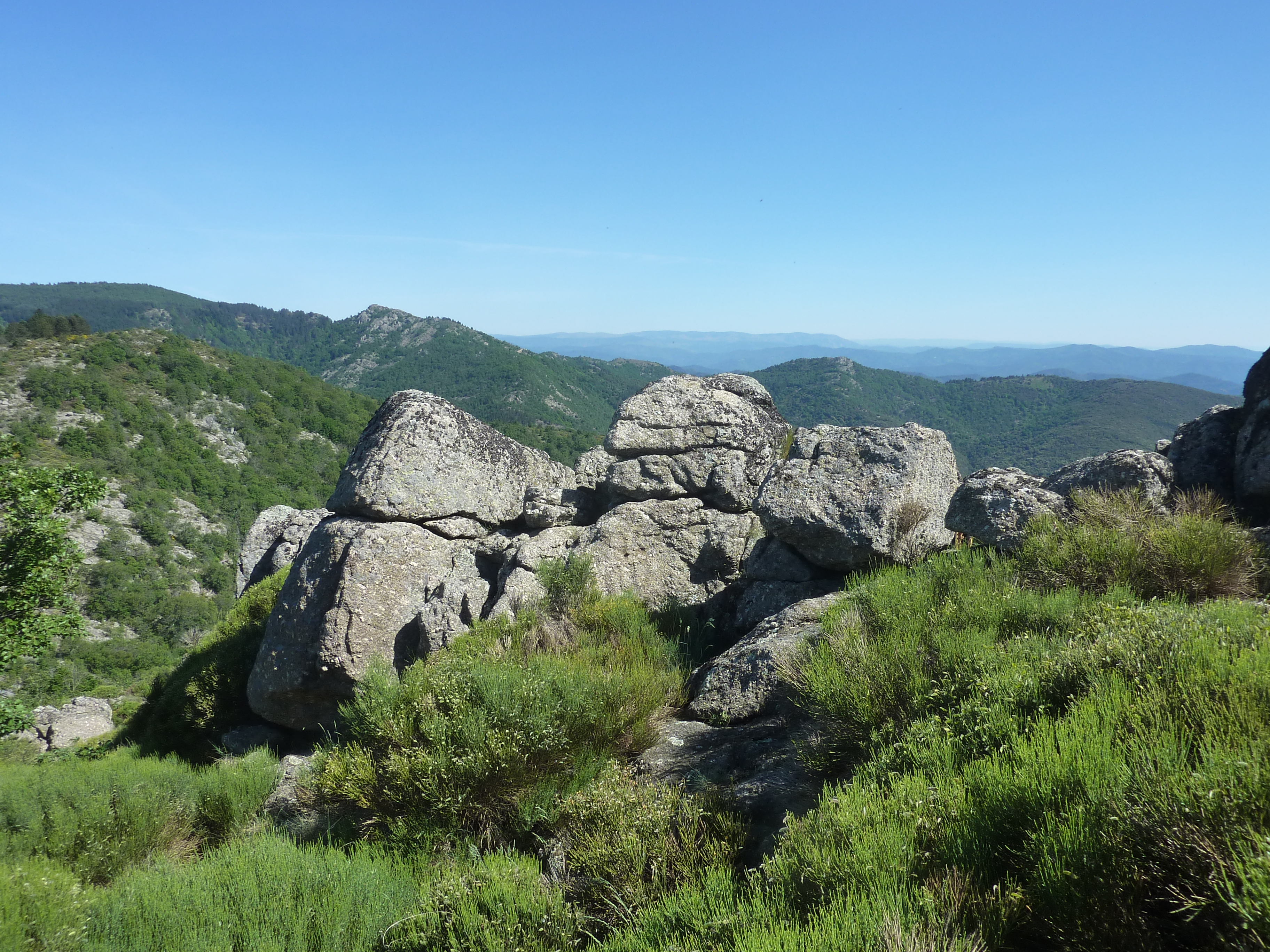 Belle vue sur le Pic de Barette, le Mont Aigoual, le Fageas, la Truque de Blaquisses et le Rocher de l'Aigle de gauche à droite