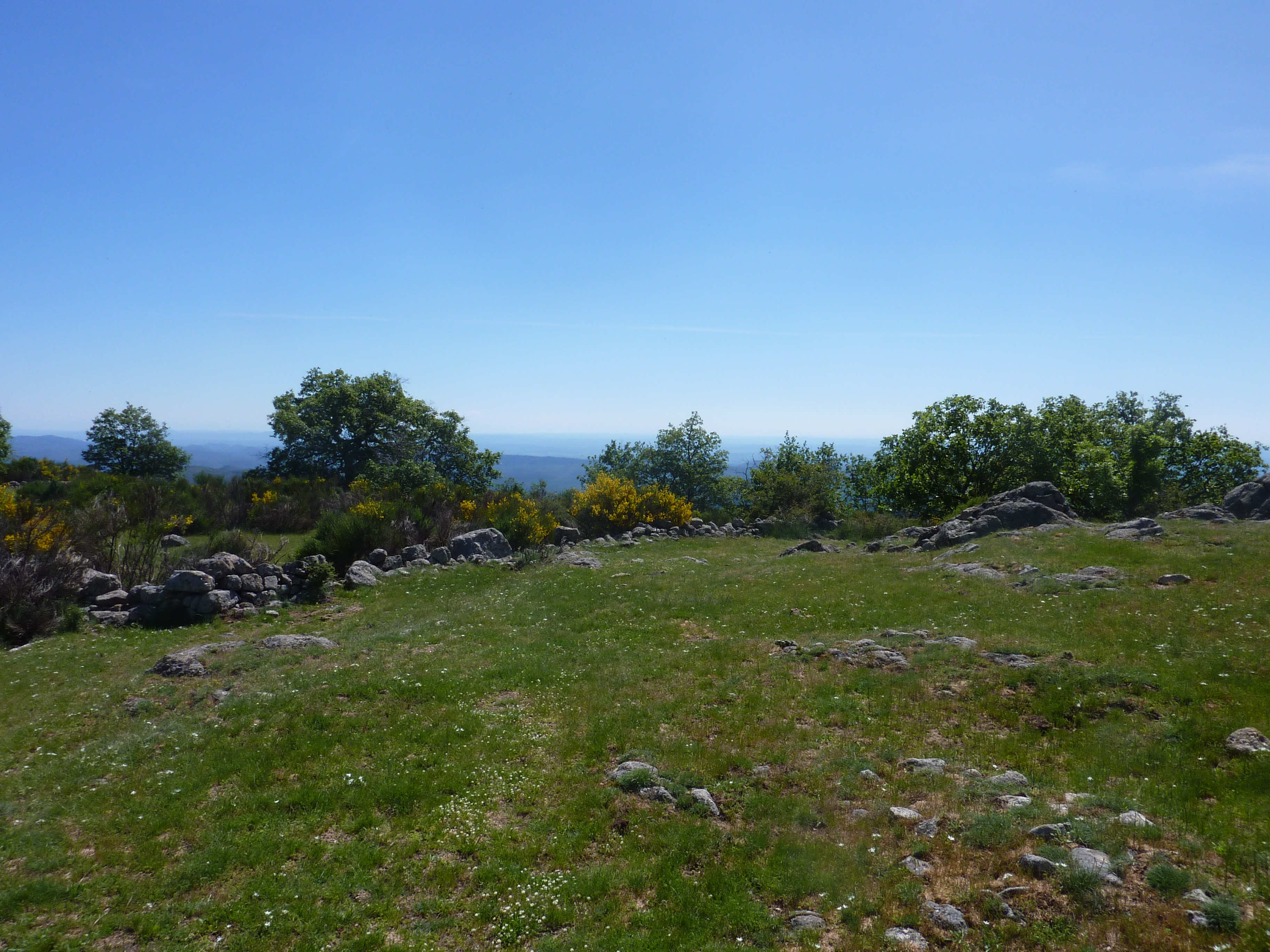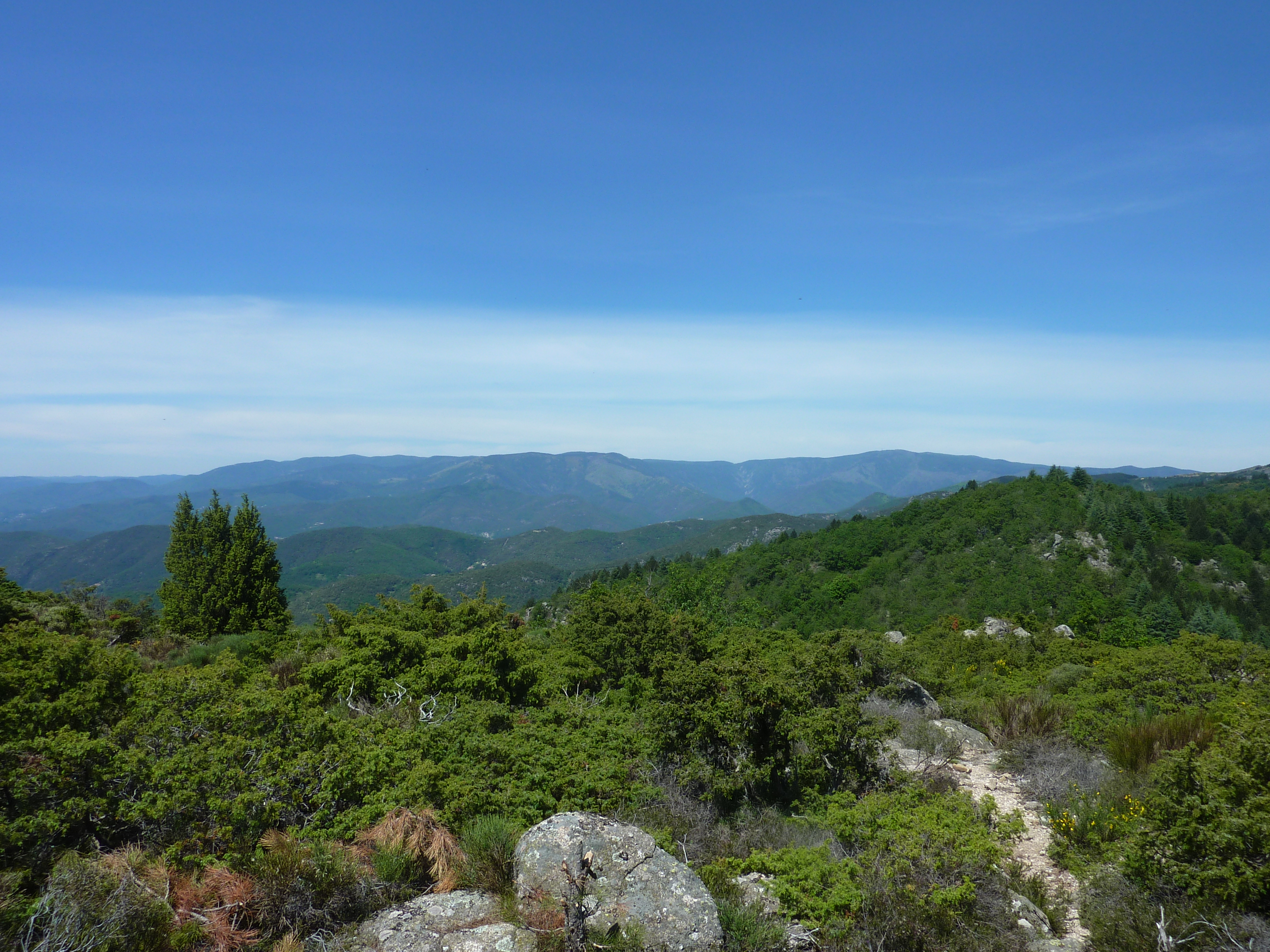 Arrivée au sommet de la Truque de Blaquisses (1001 m) : magnifique panorama sur les Cévennes gardoises (Saint-Guiral, Barette, Aigoual, Fageas, Rocher de l'Aigle, Brion, Bouquet, ...), lozériennes (Cassini, Rochers de Trenze, ...) et héraultaises (Saint-Loup, Séranne, Anjeau, ...) ... les sommets des Préalpes et le Ventoux sont distinguables malgré la brume de chaleur !