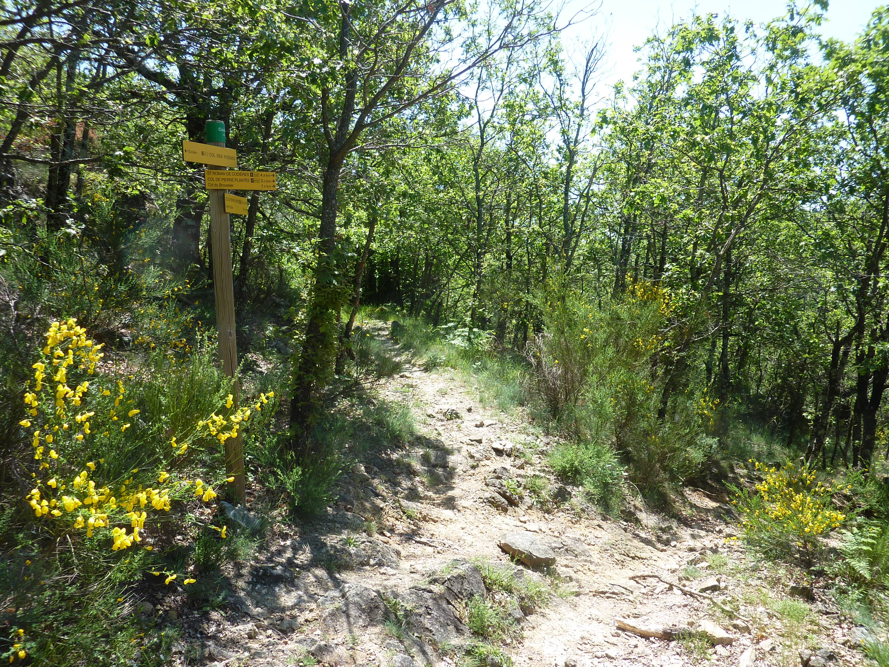 Départ Saint-Roman-de-Codières (645 m) : suivre le chemin montant raidement sur la gauche direction Col de la Pierre Plantée, balisé en jaune