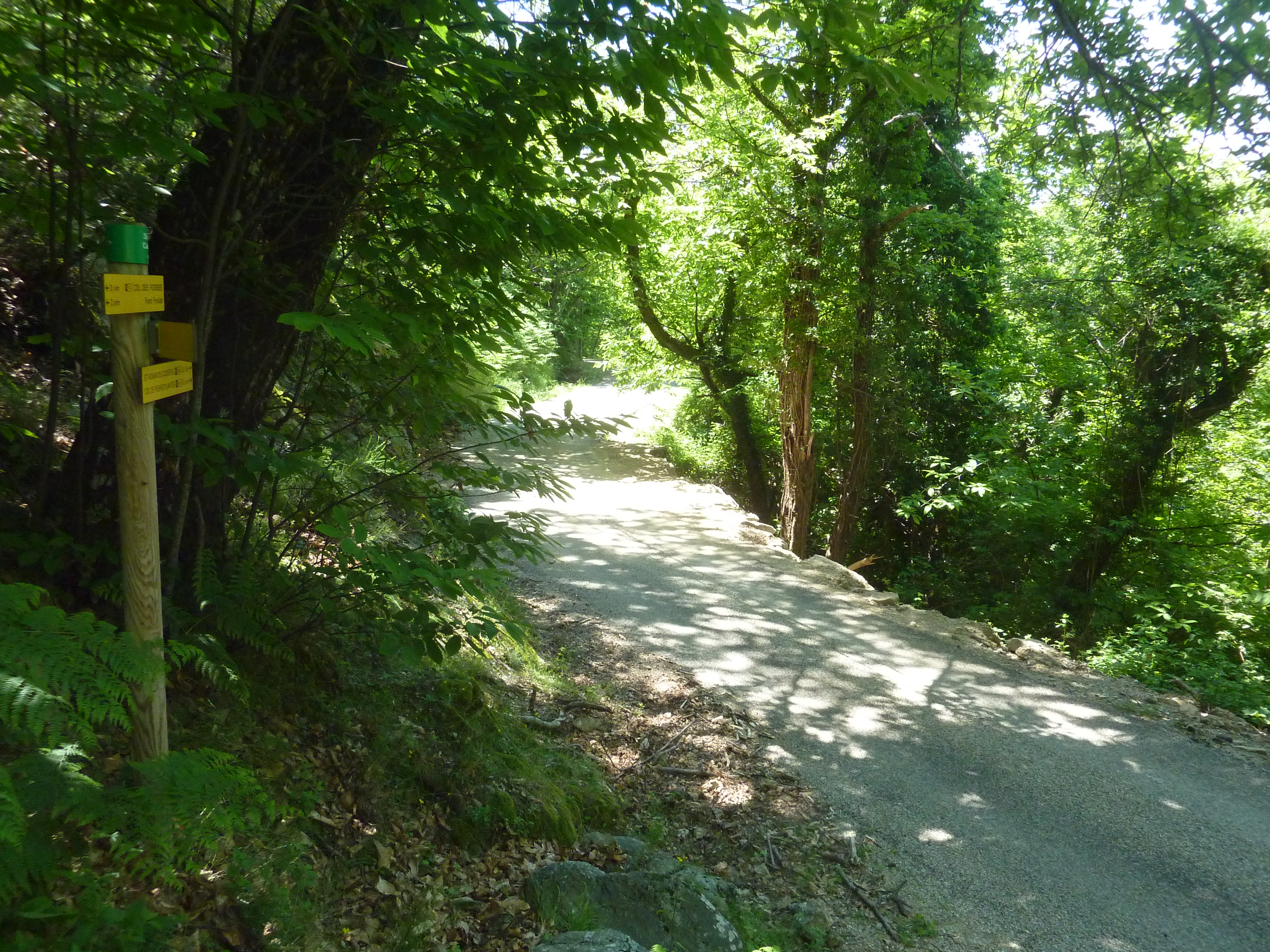 Sous la Calmette (687 m) : suivre le chemin montant sur la droite direction Col des Fosses, balisé en jaune (la route partant tout droit mène aussi au Col des Fosses et est indiqué en rose sur la carte IGN)