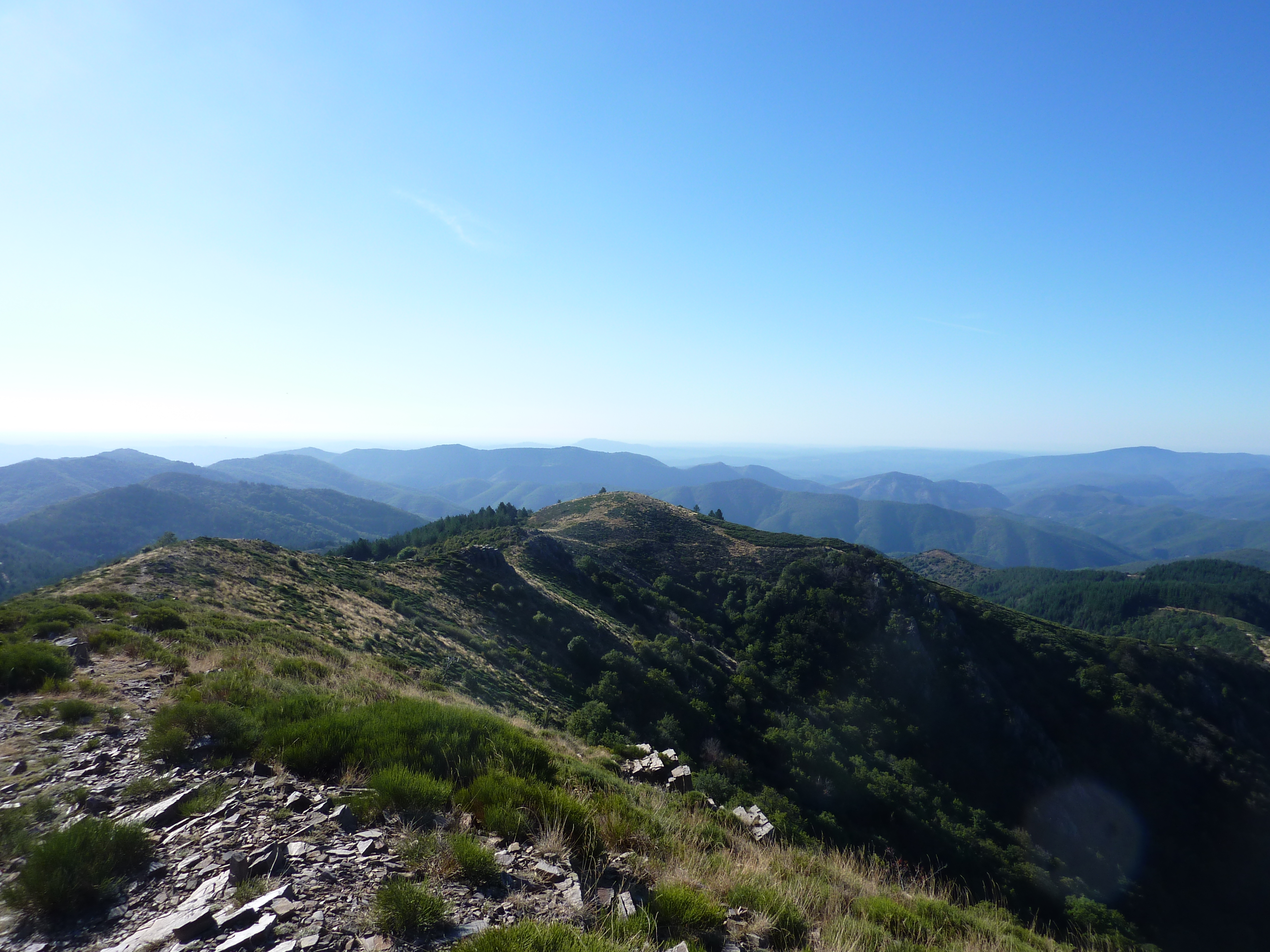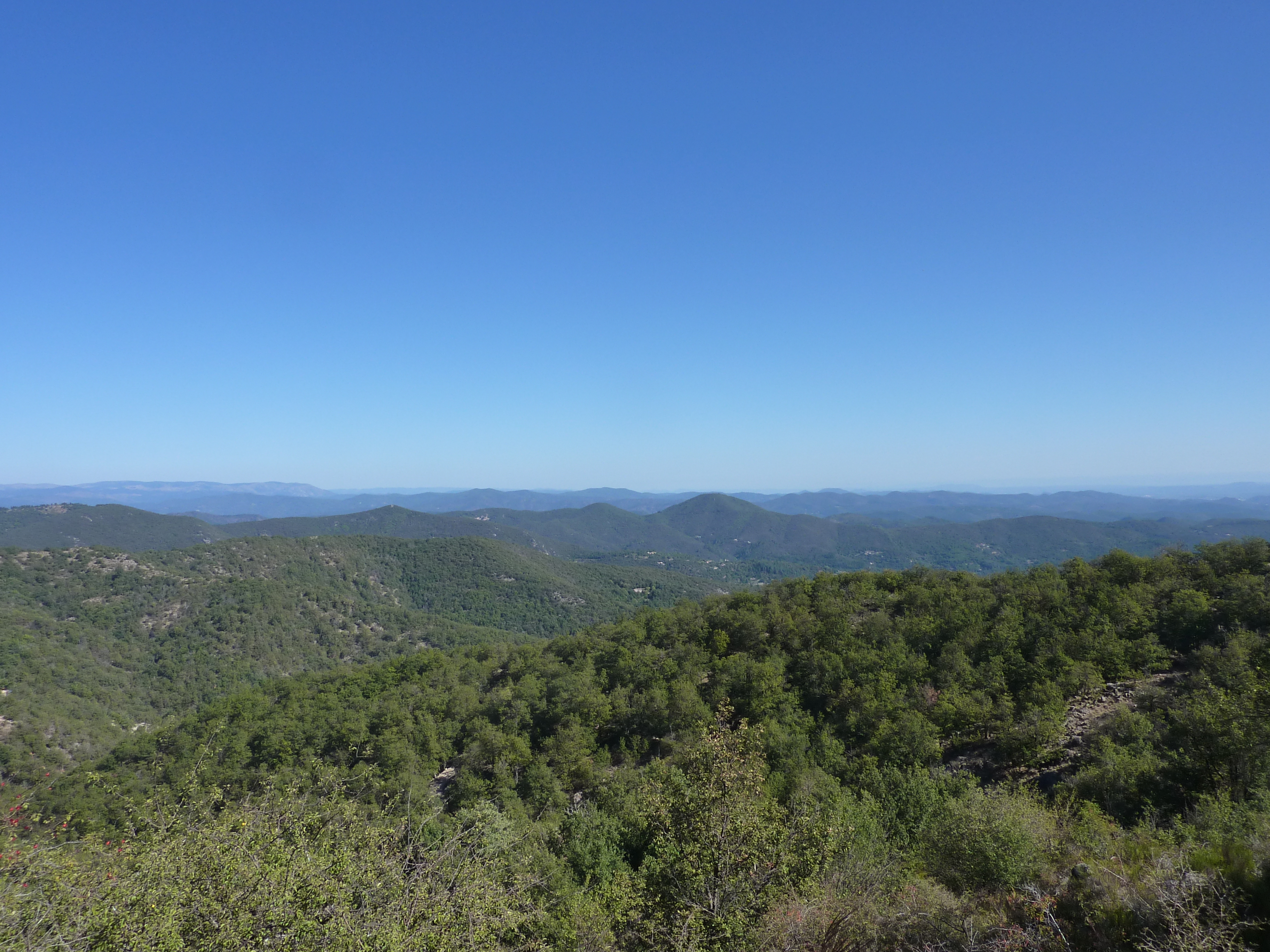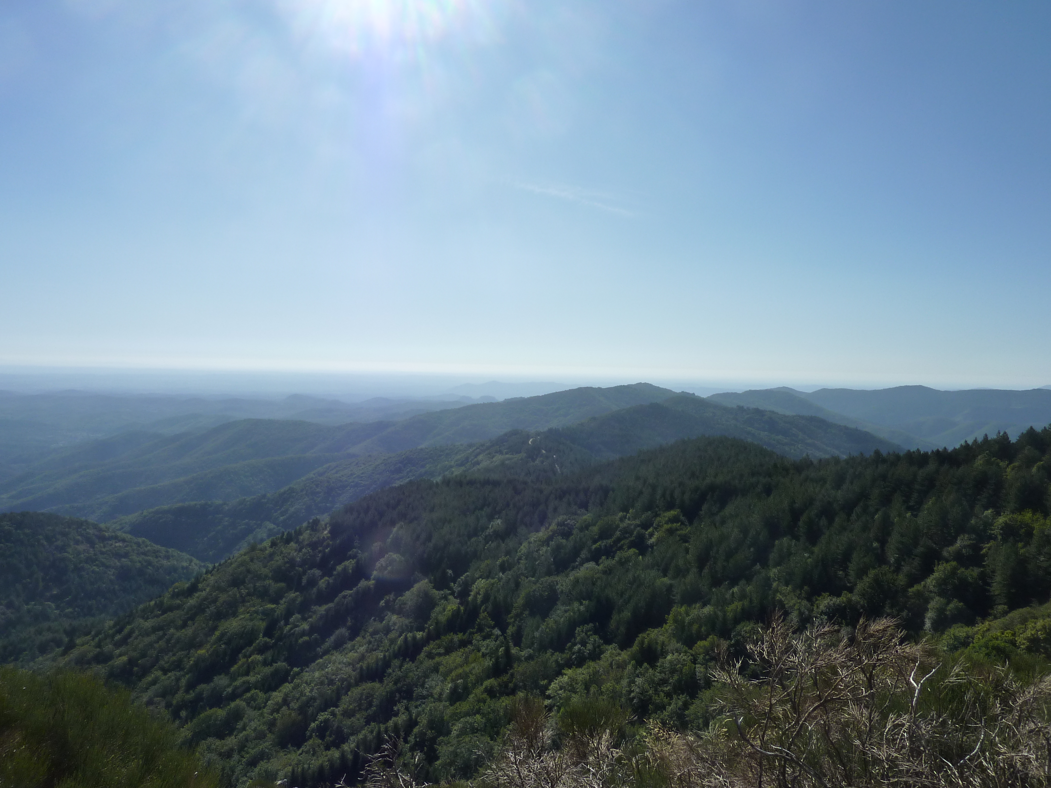 Arrivée au sommet du Fageas (1179 m) : panorama assez étendu sur les Cévennes gardoises et lozériennes ainsi que sur les sommets héraultais ... la plaine est également bien visible et au loin, on peut distinguer le Ventoux et les Préalpes provençales