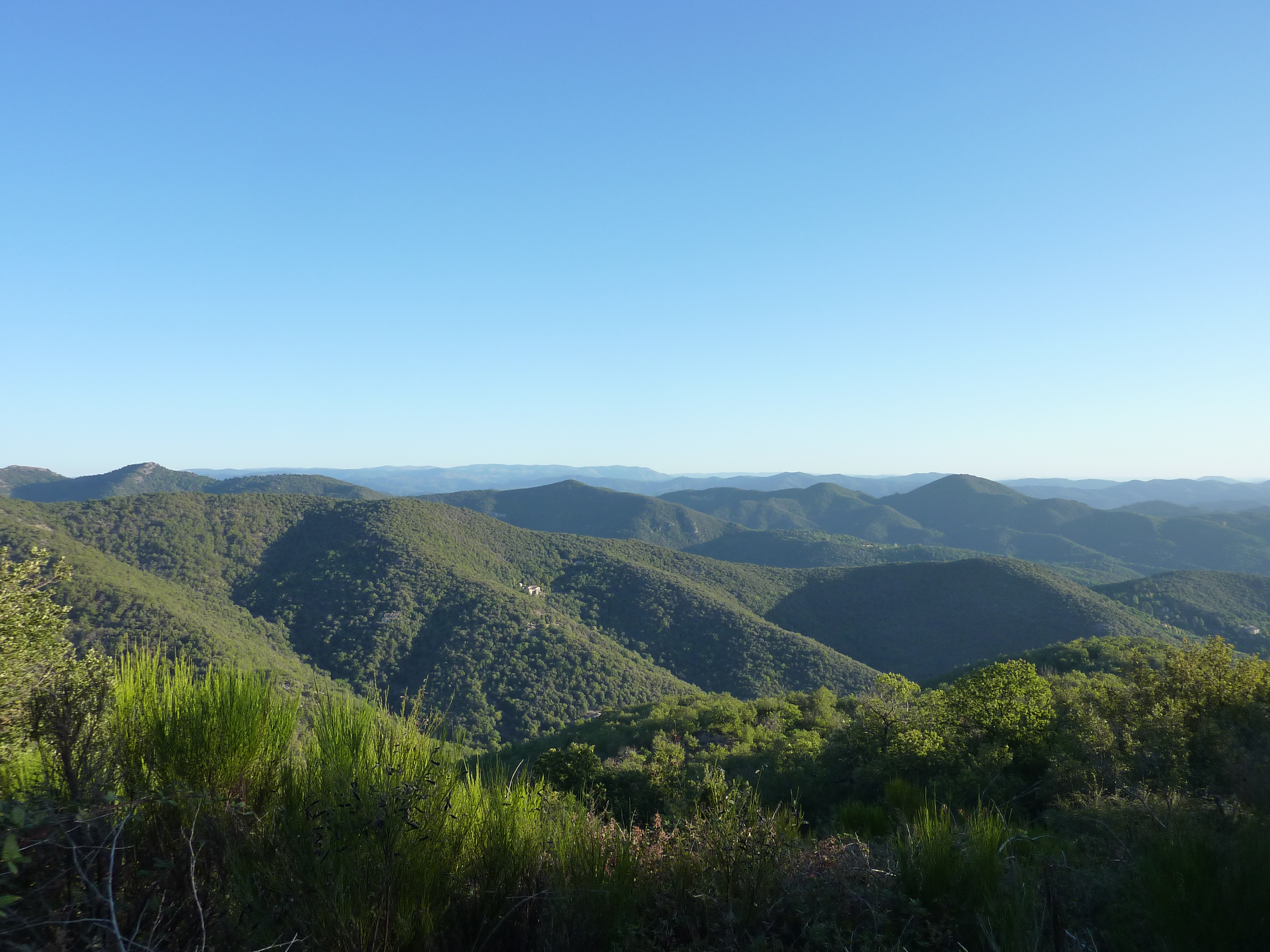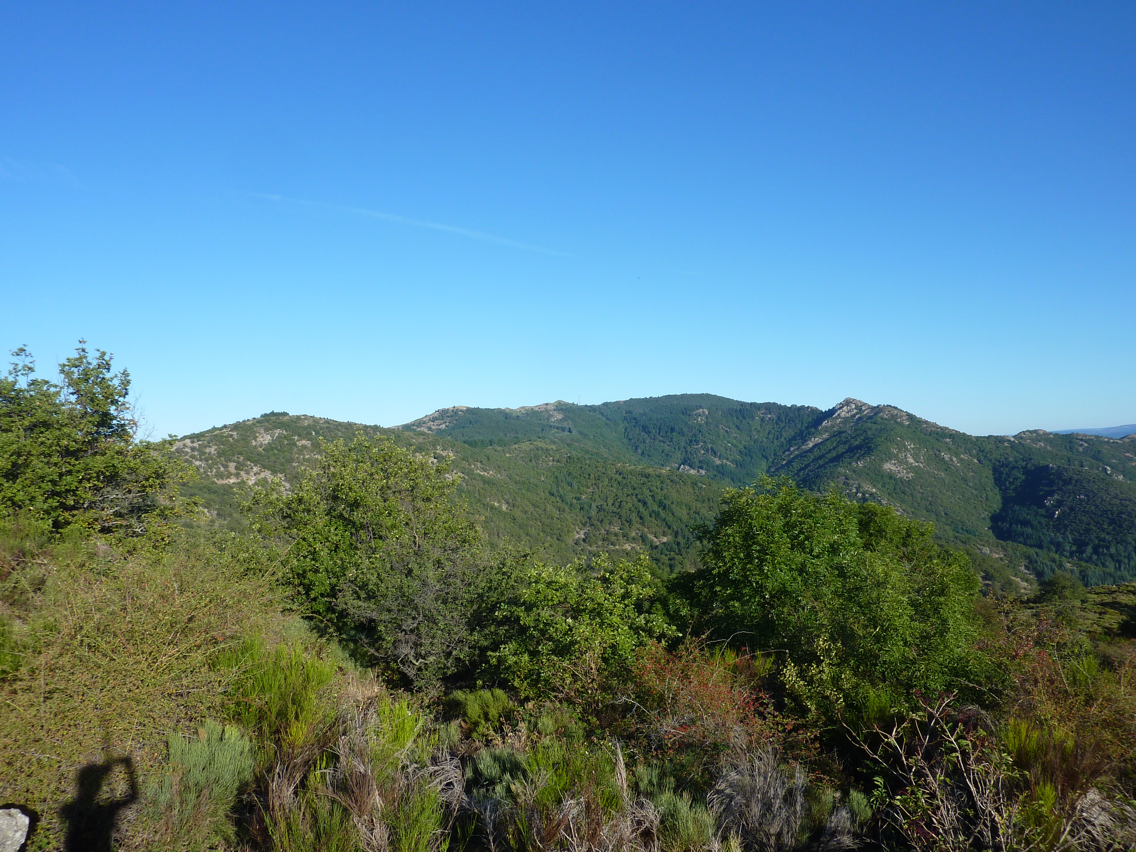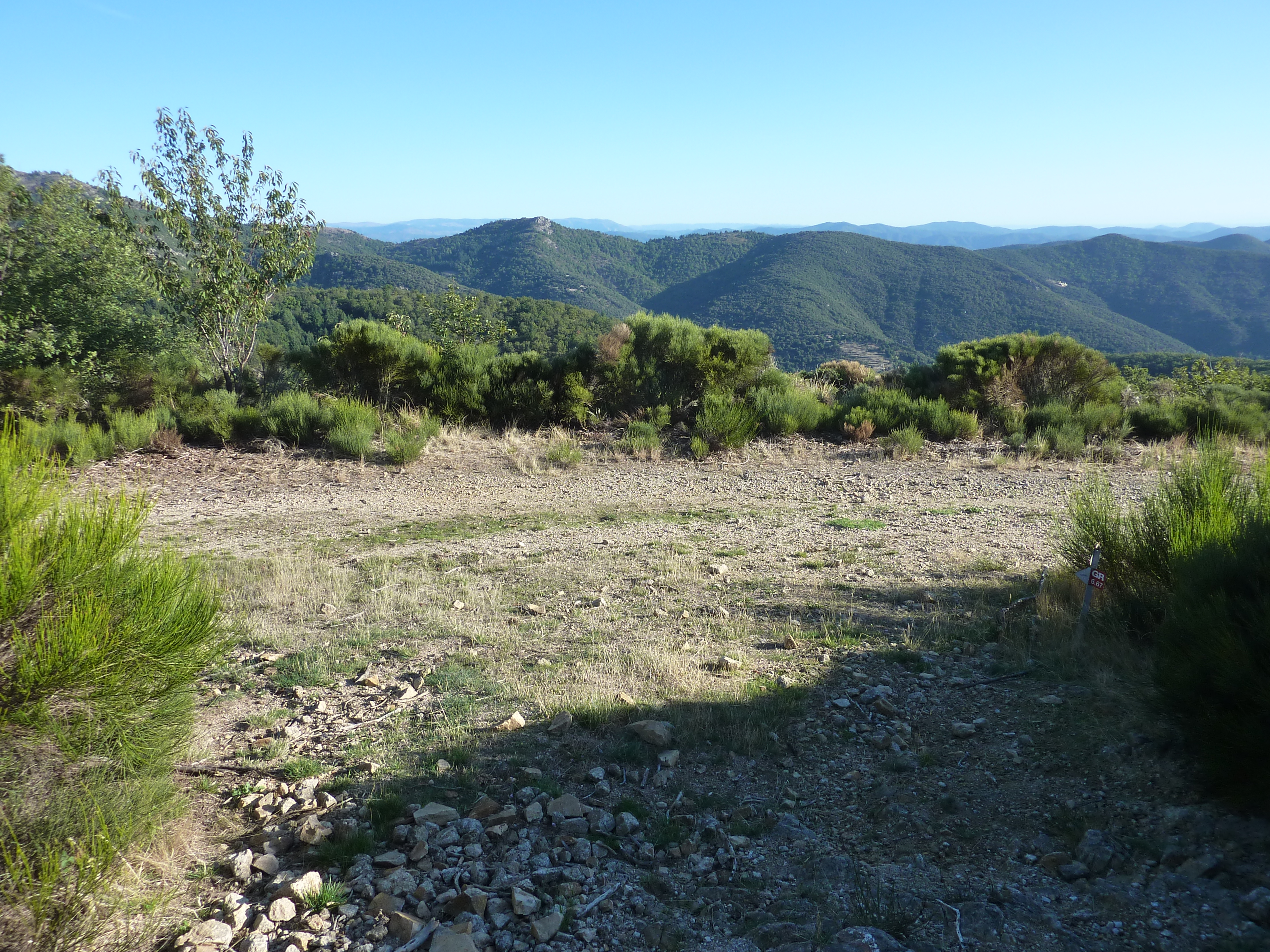 Arrivée au sommet du Fageas (1179 m) : panorama assez étendu sur les Cévennes gardoises et lozériennes ainsi que sur les sommets héraultais ... la plaine est également bien visible et au loin, on peut distinguer le Ventoux et les Préalpes provençales