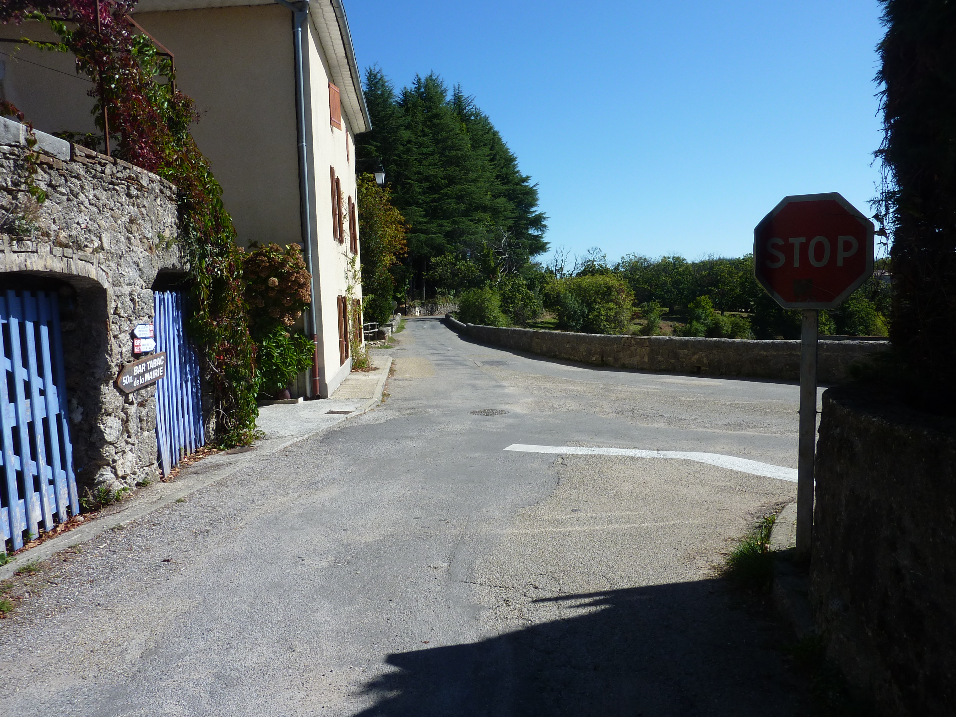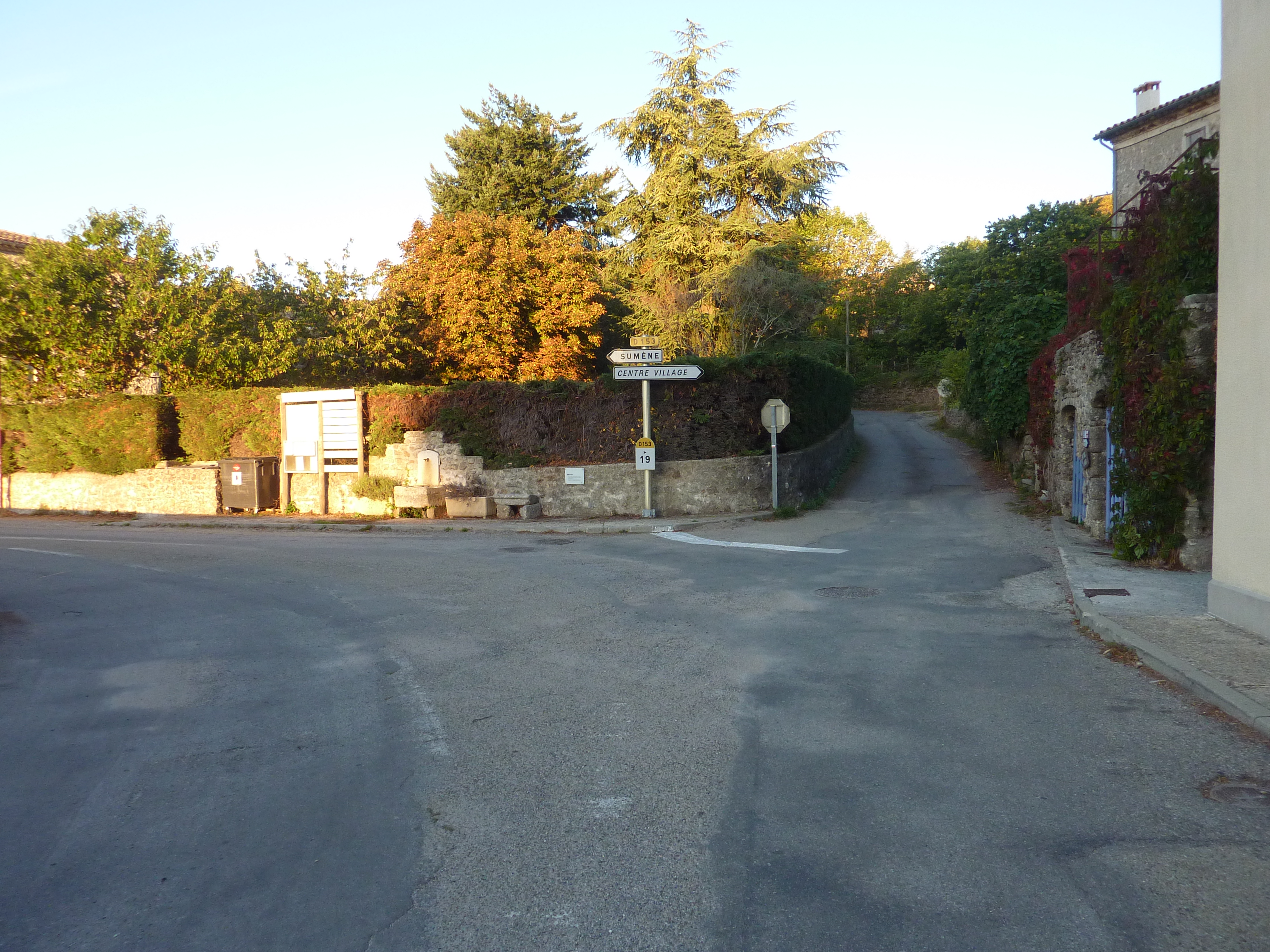 A cette intersection à l'entrée de Colognac, suivre la route partant sur la droite vers le centre du village direction Colognac, balisé en rouge et blanc