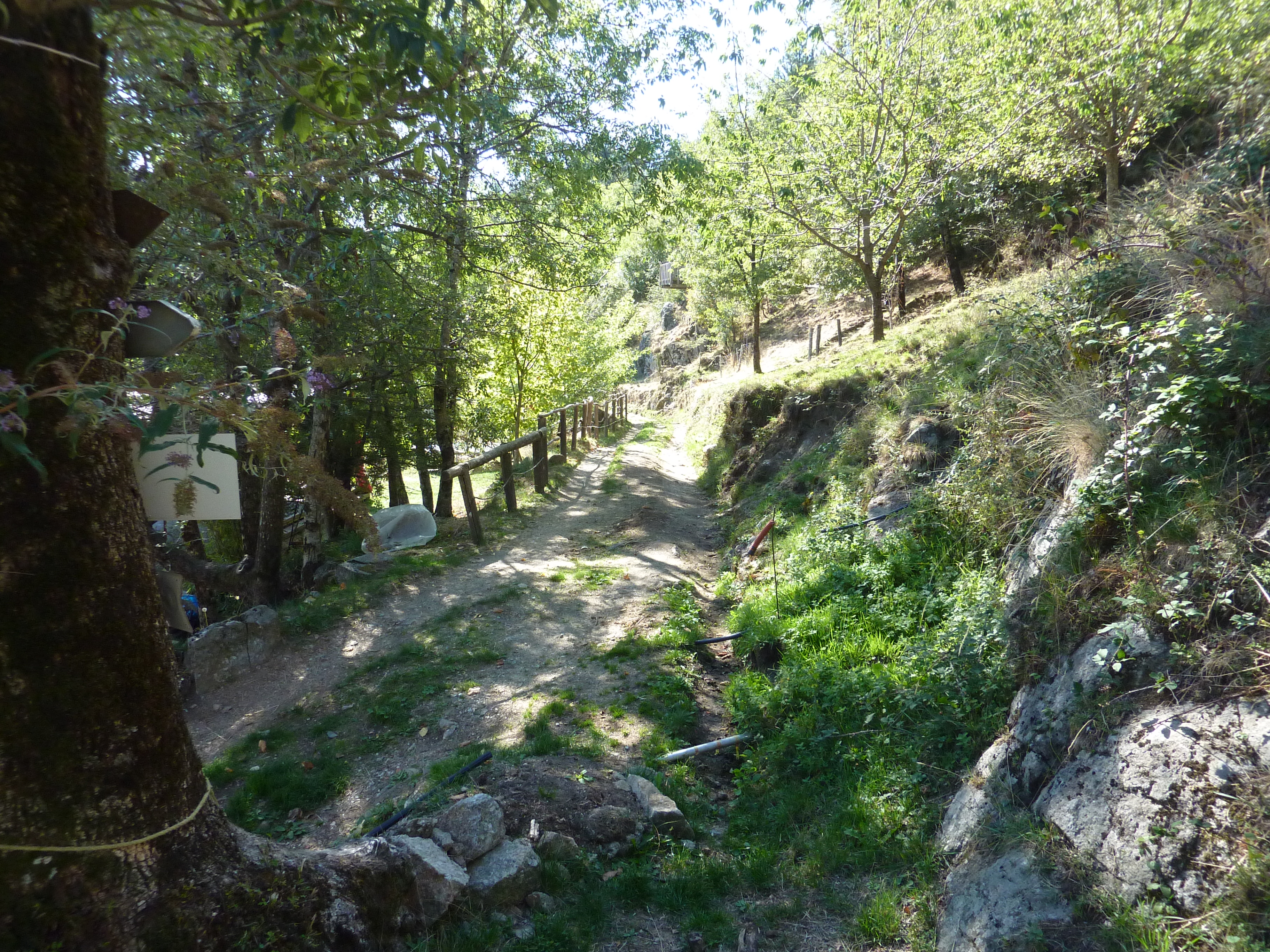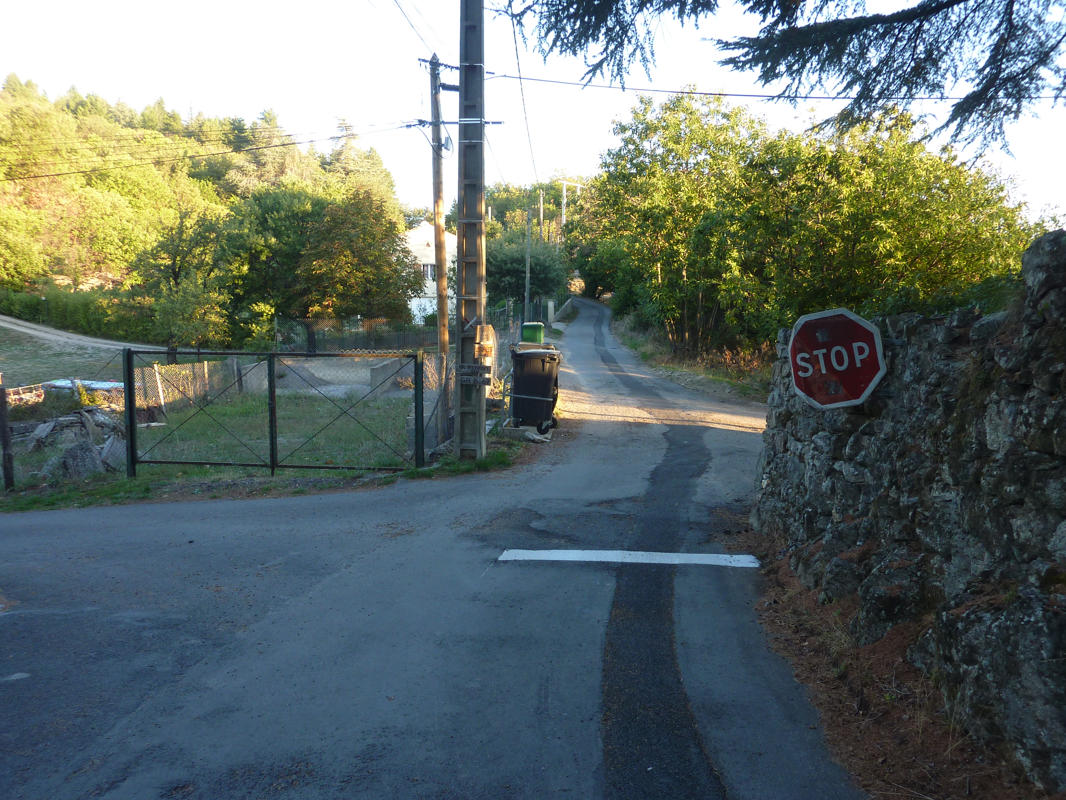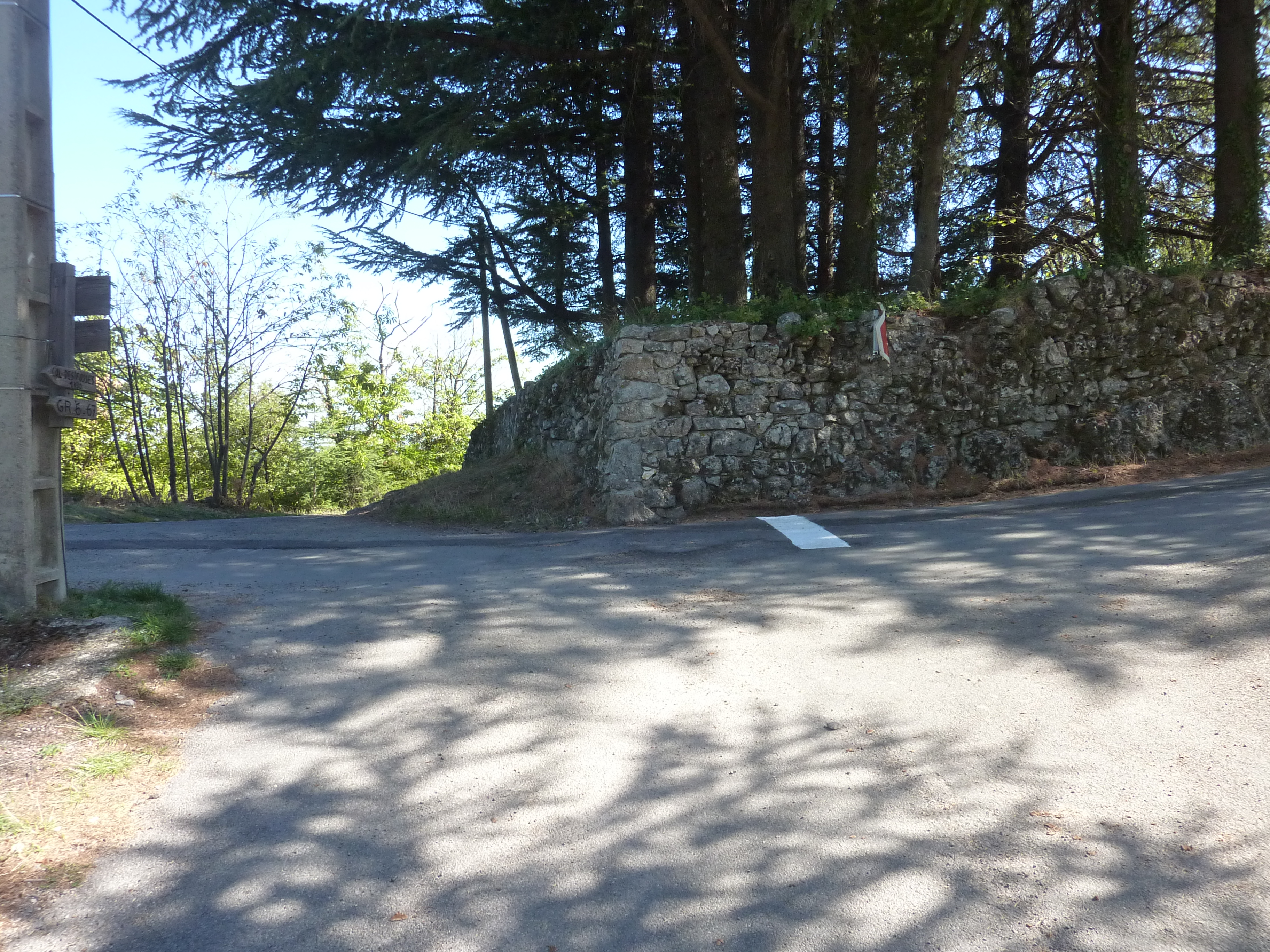 A cette intersection à la sortie du village, suivre la route partant sur la gauche direction Col des Fosses, balisé en rouge et blanc
