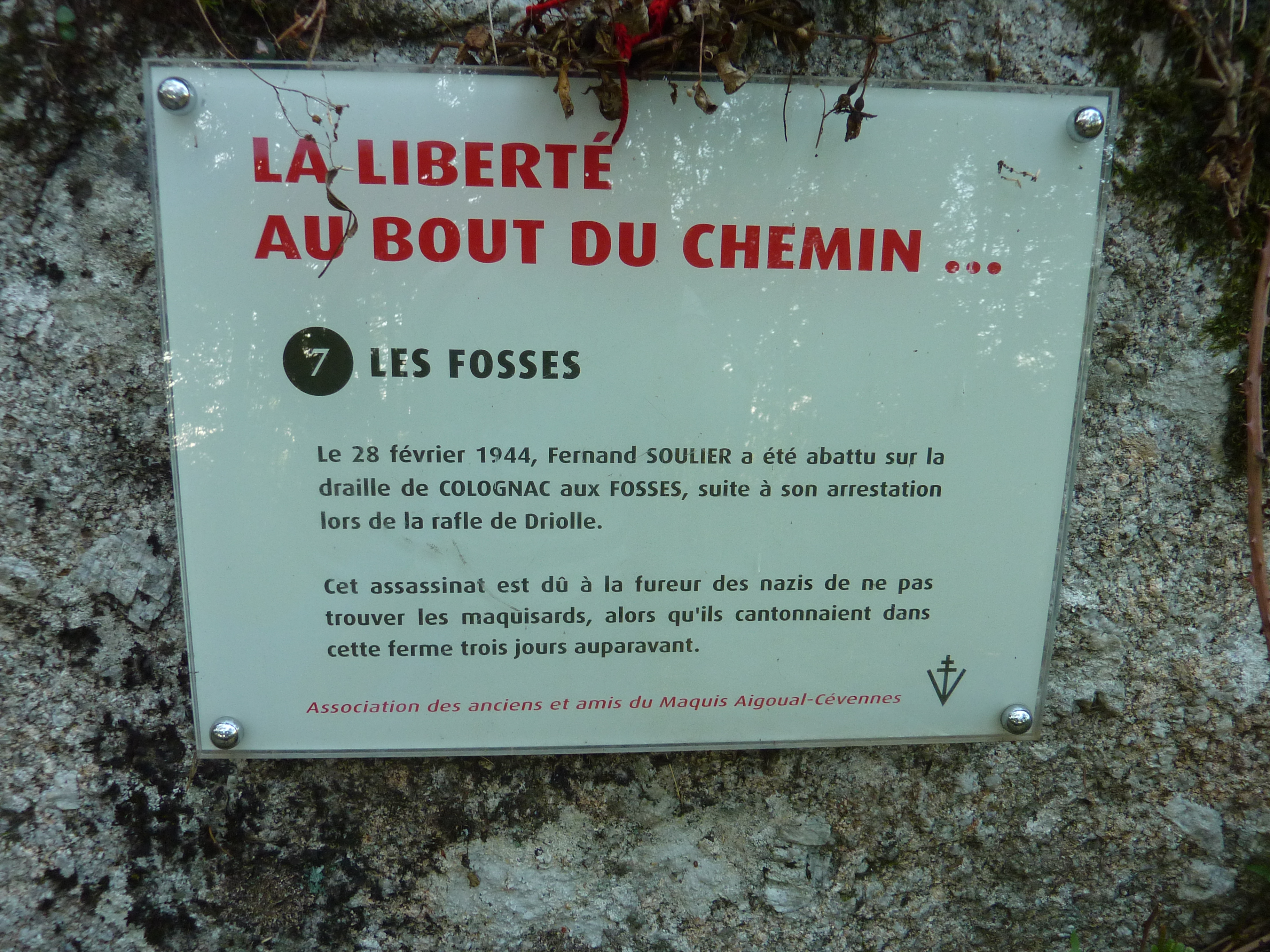 Les Fosses (895 m) : suivre le chemin partant tout droit direction Colognac, balisé en rouge et blanc