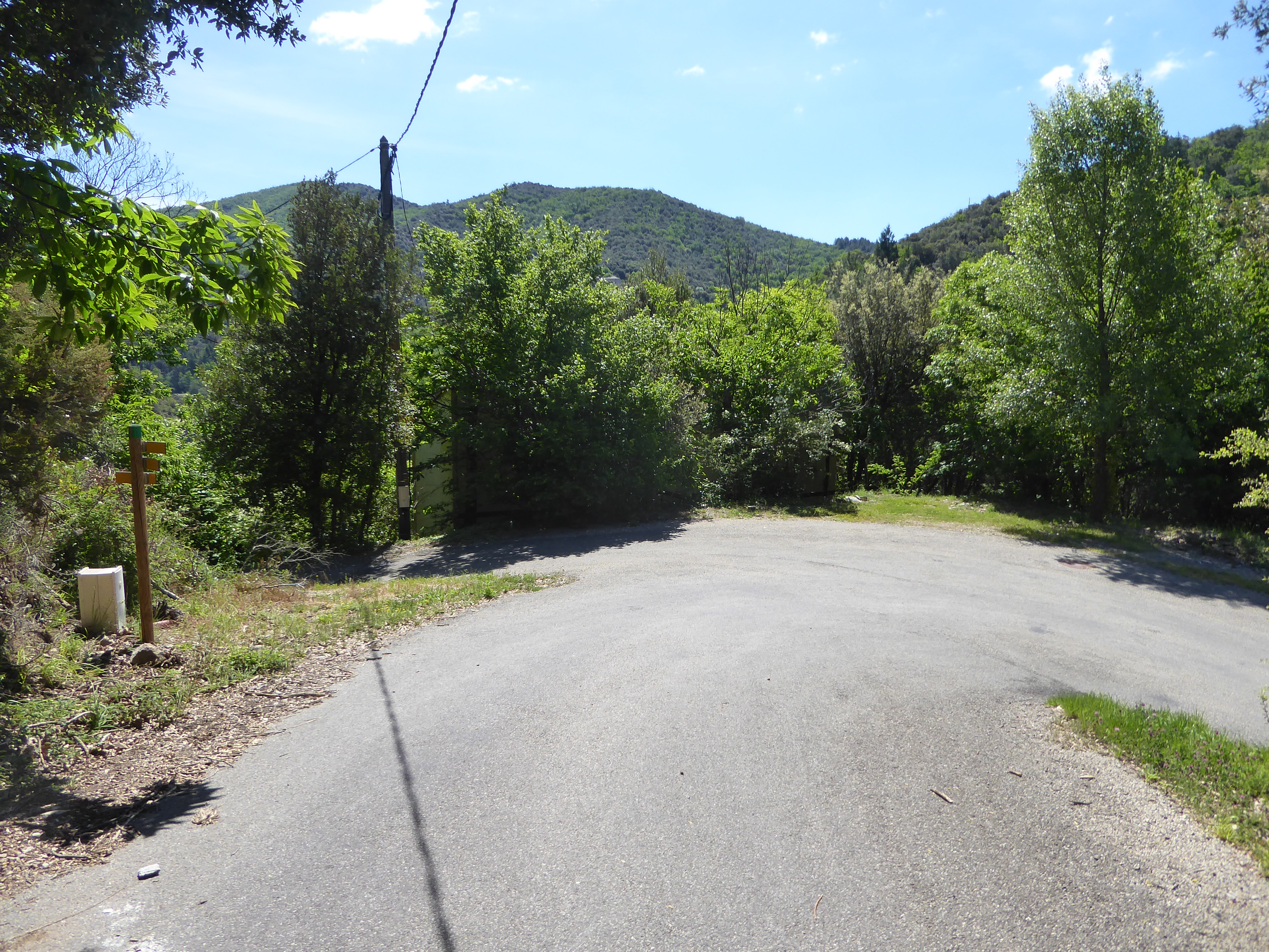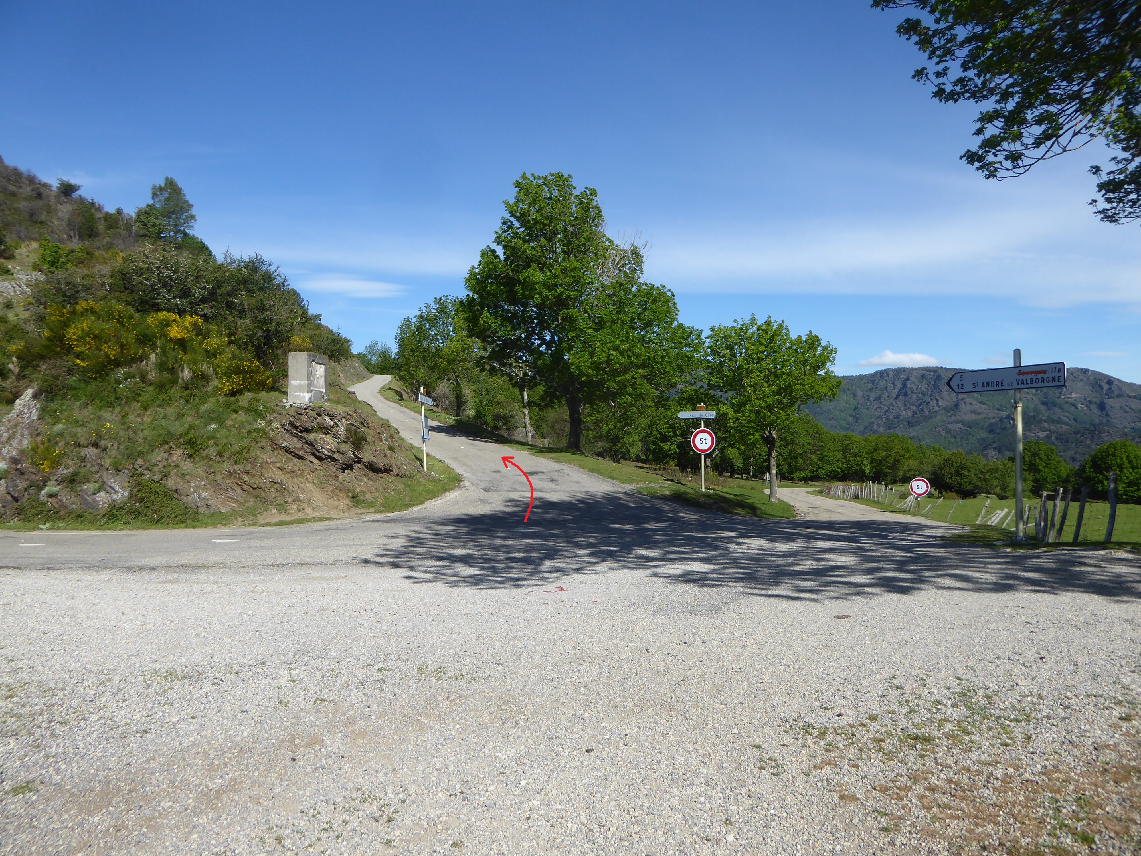 A cette intersection (20 mètres après le départ), continuer à suivre la rue partant tout droit direction Col de l'Espinas, aucun balisage dorénavant (il est possible de suivre le chemin montant sur la droite et balisé en jaune en suivant la direction "Col de l'Espinas")