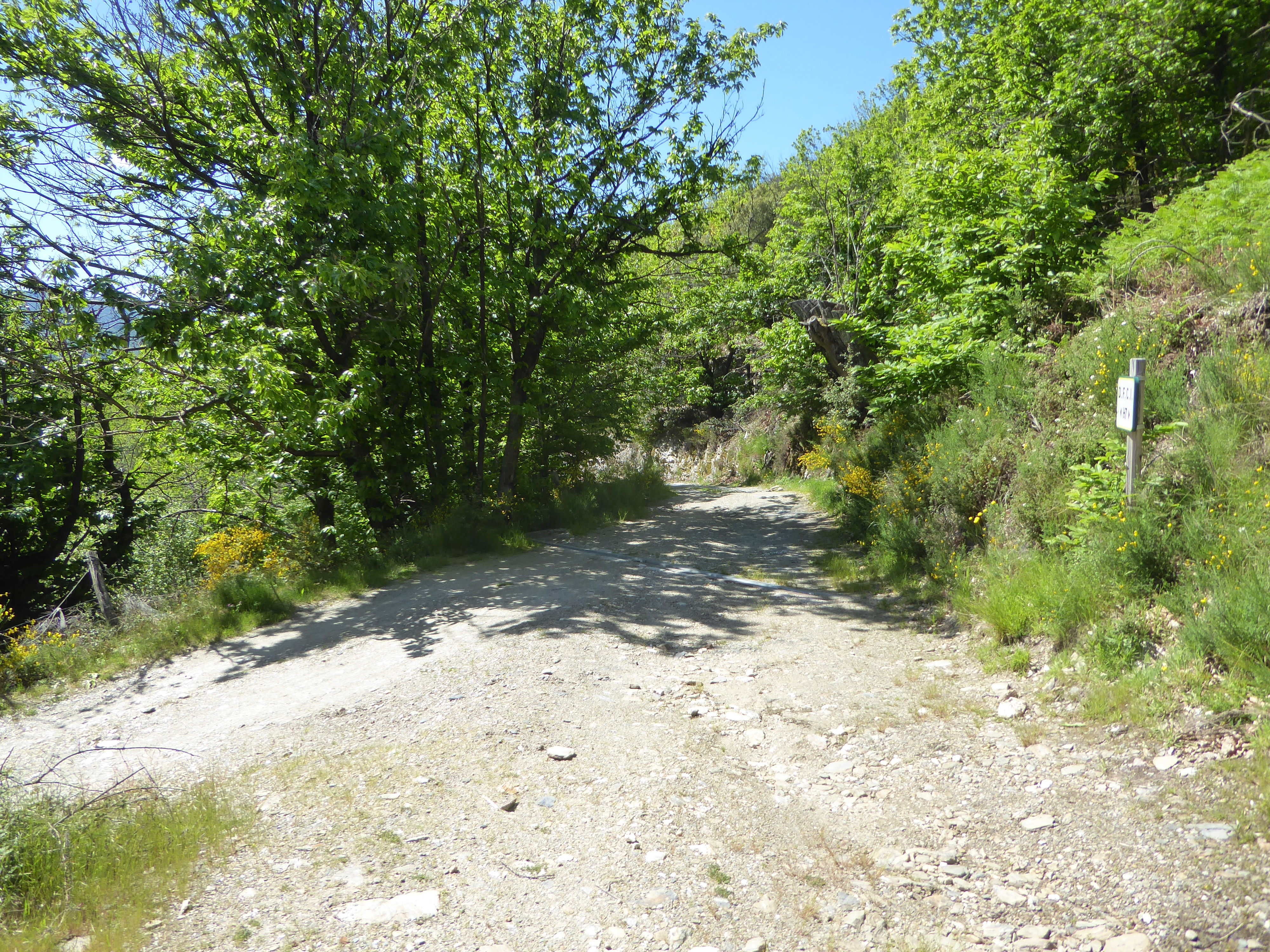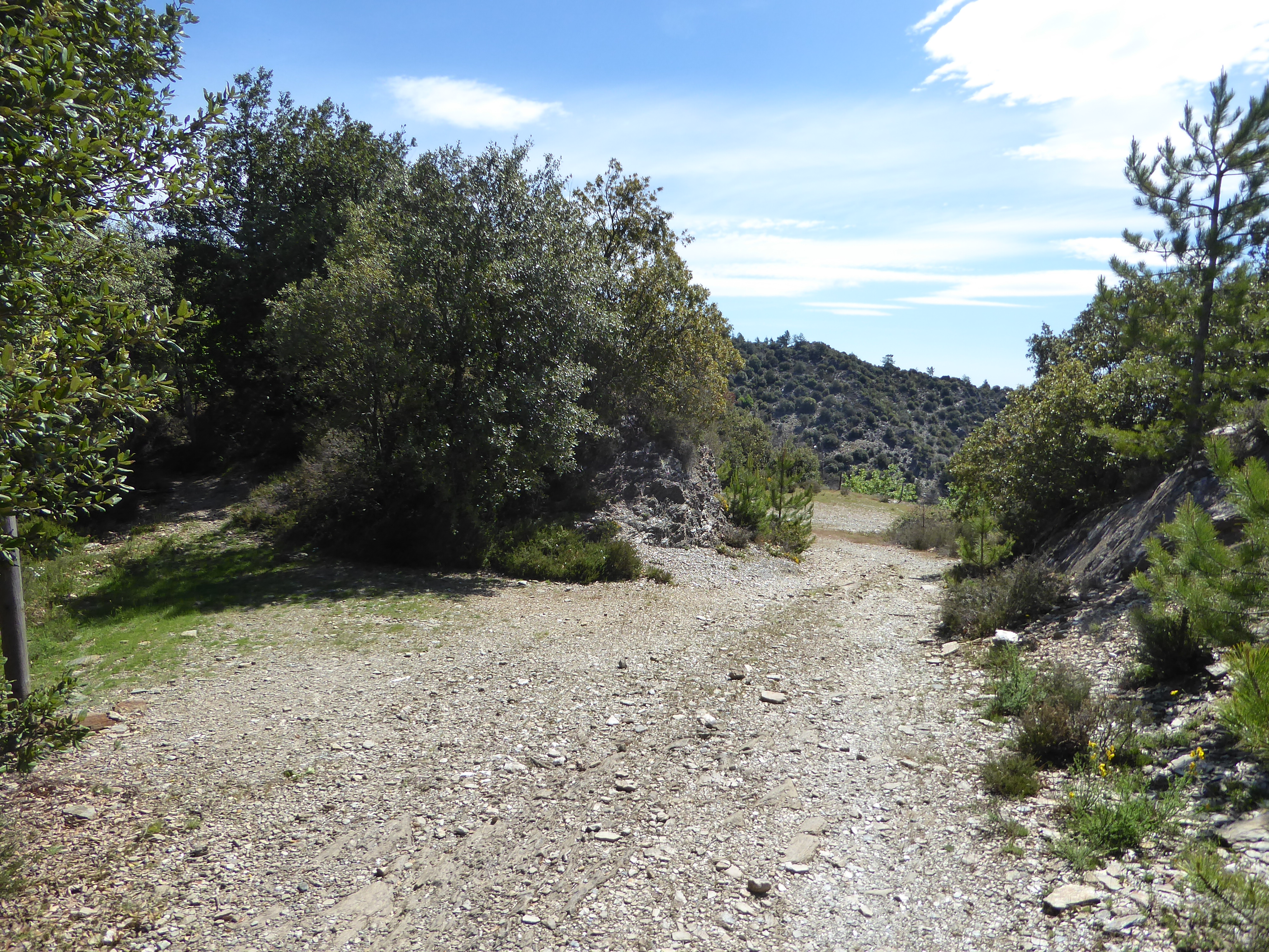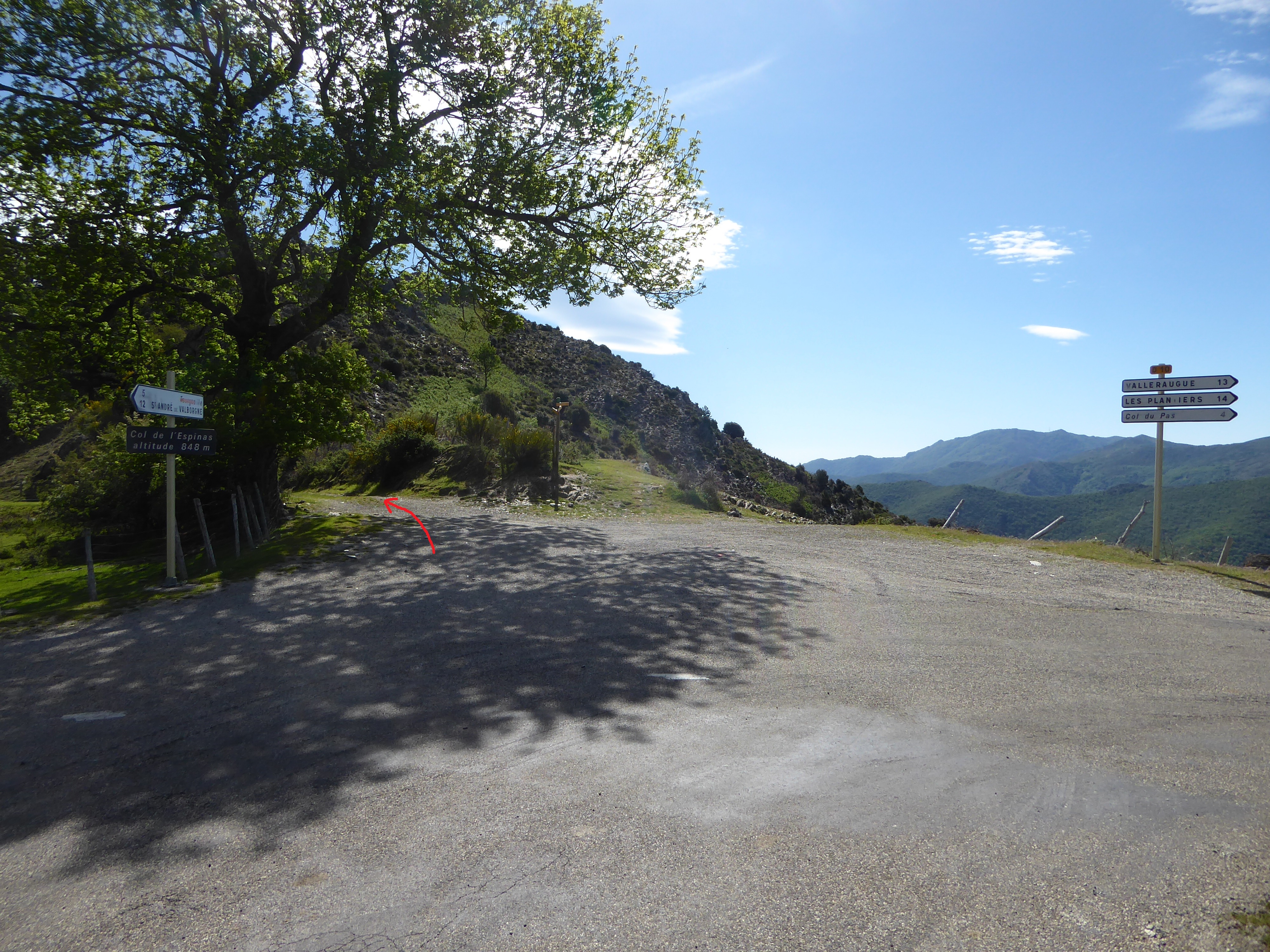 Col de l'Espinas (849 m) : suivre la piste partant légèrement sur la gauche direction Pic de Borgne, balisé en rouge et blanc dorénavant