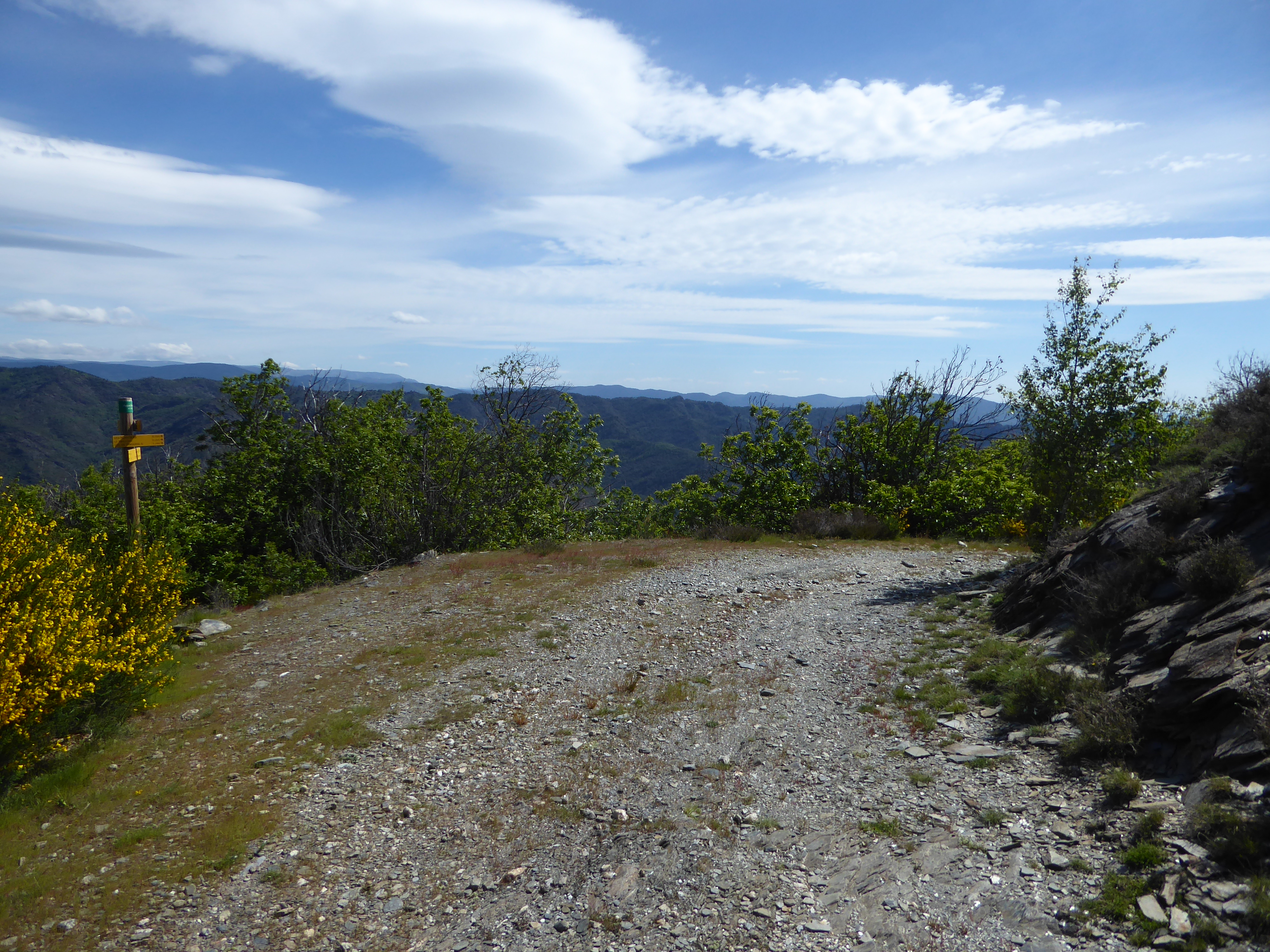 Col de l'Espinas (849 m) : suivre la route partant tout droit vers l'Aire de Côte direction direction le Mouisset, balisé en rouge et blanc dorénavant