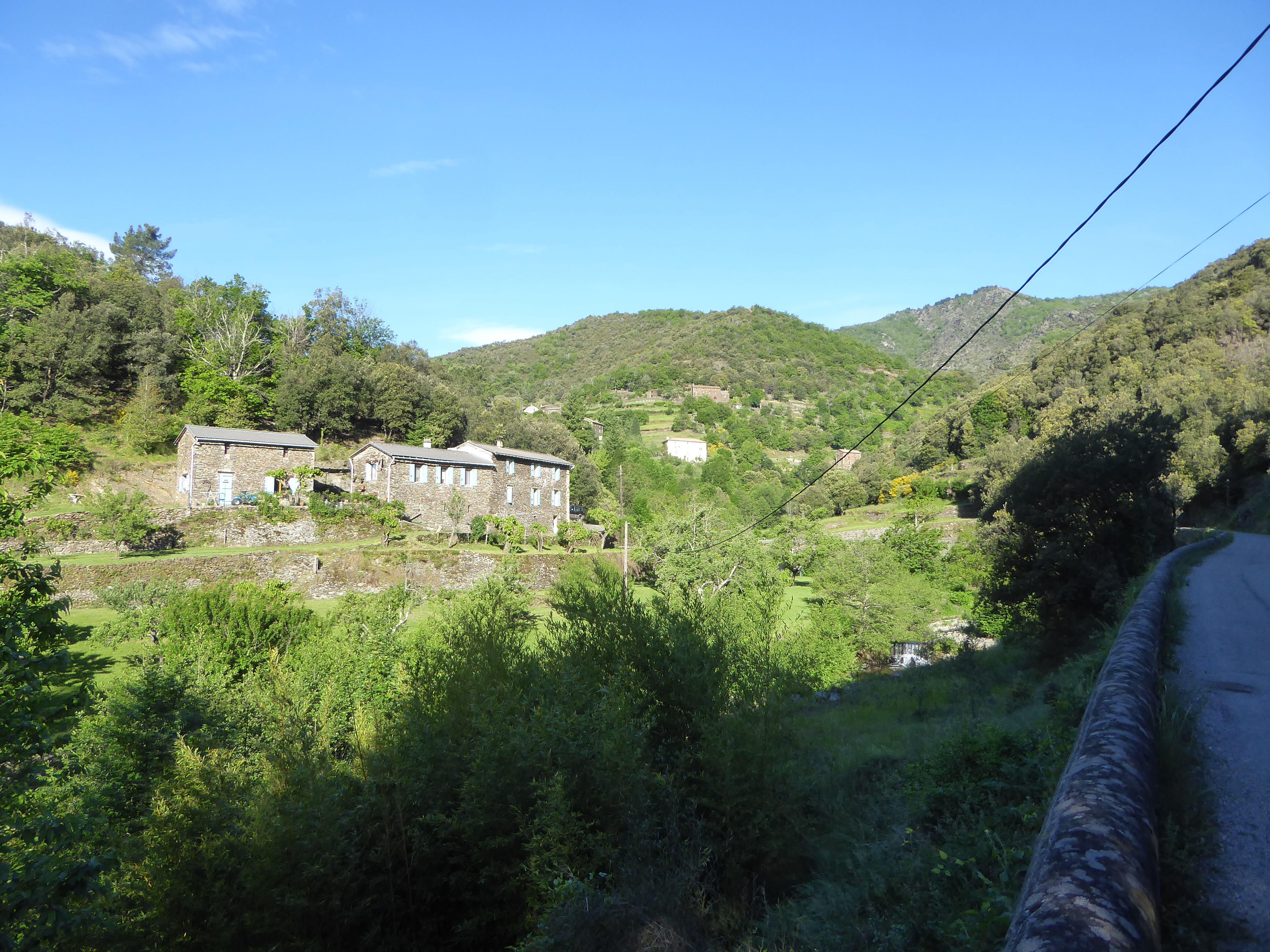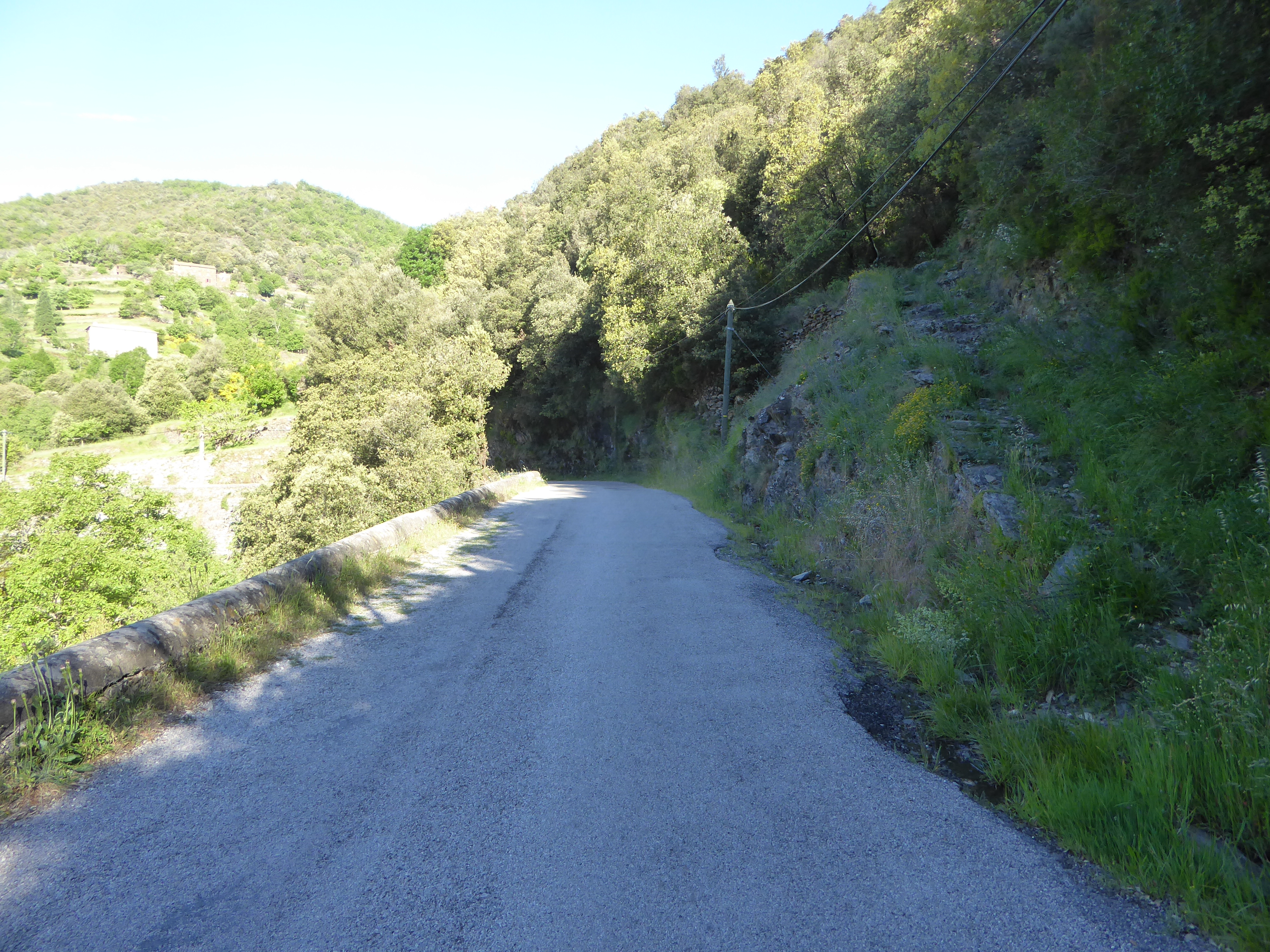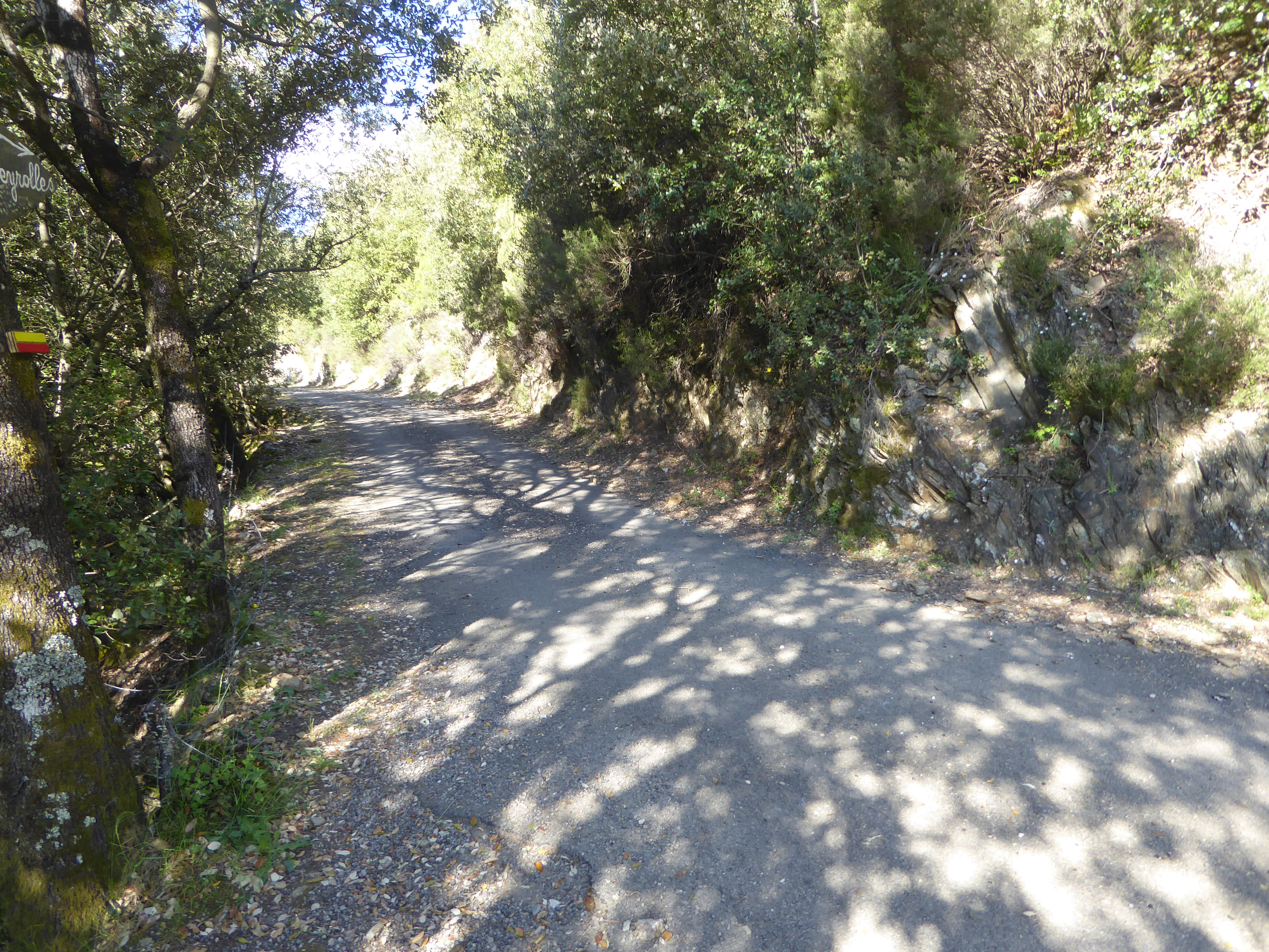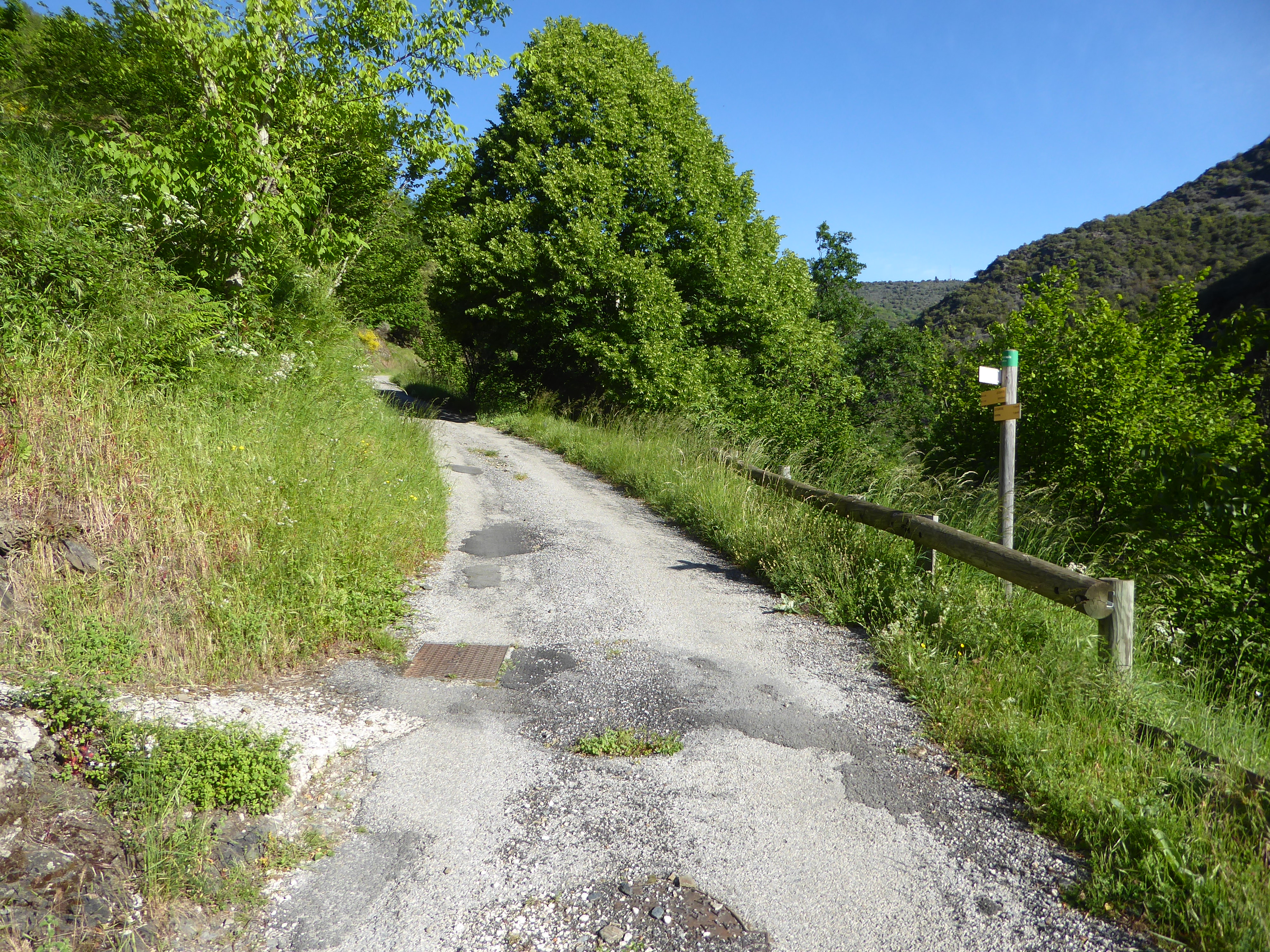 A ce croisement avec la route (522 m), suivre cette dernière sur la gauche direction Col de l'Espinas, balisé en rouge et jaune, et en jaune