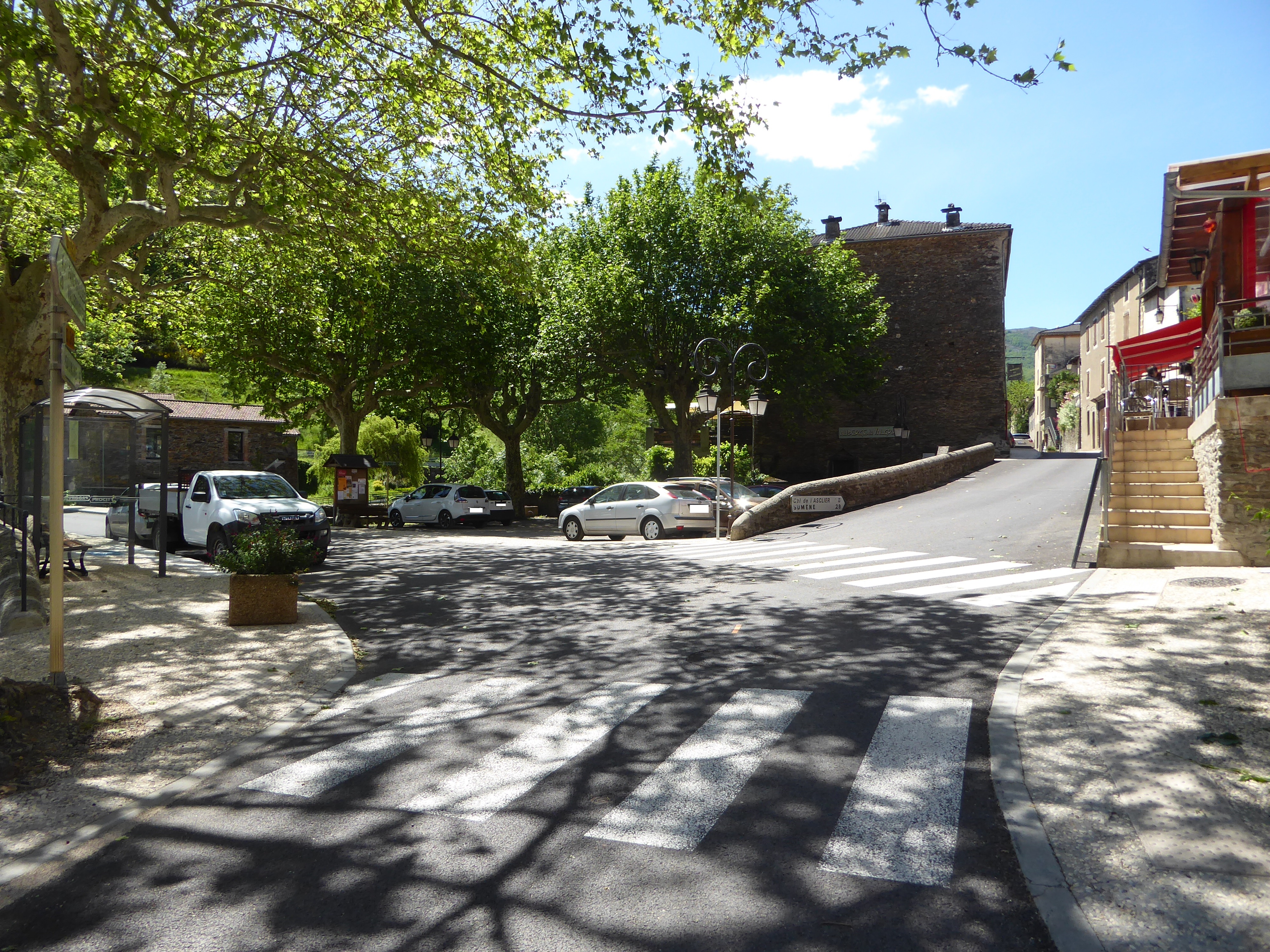 A ce croisement au centre du village, suivre la route partant sur la gauche direction les Plantiers, balisé en rouge et blanc