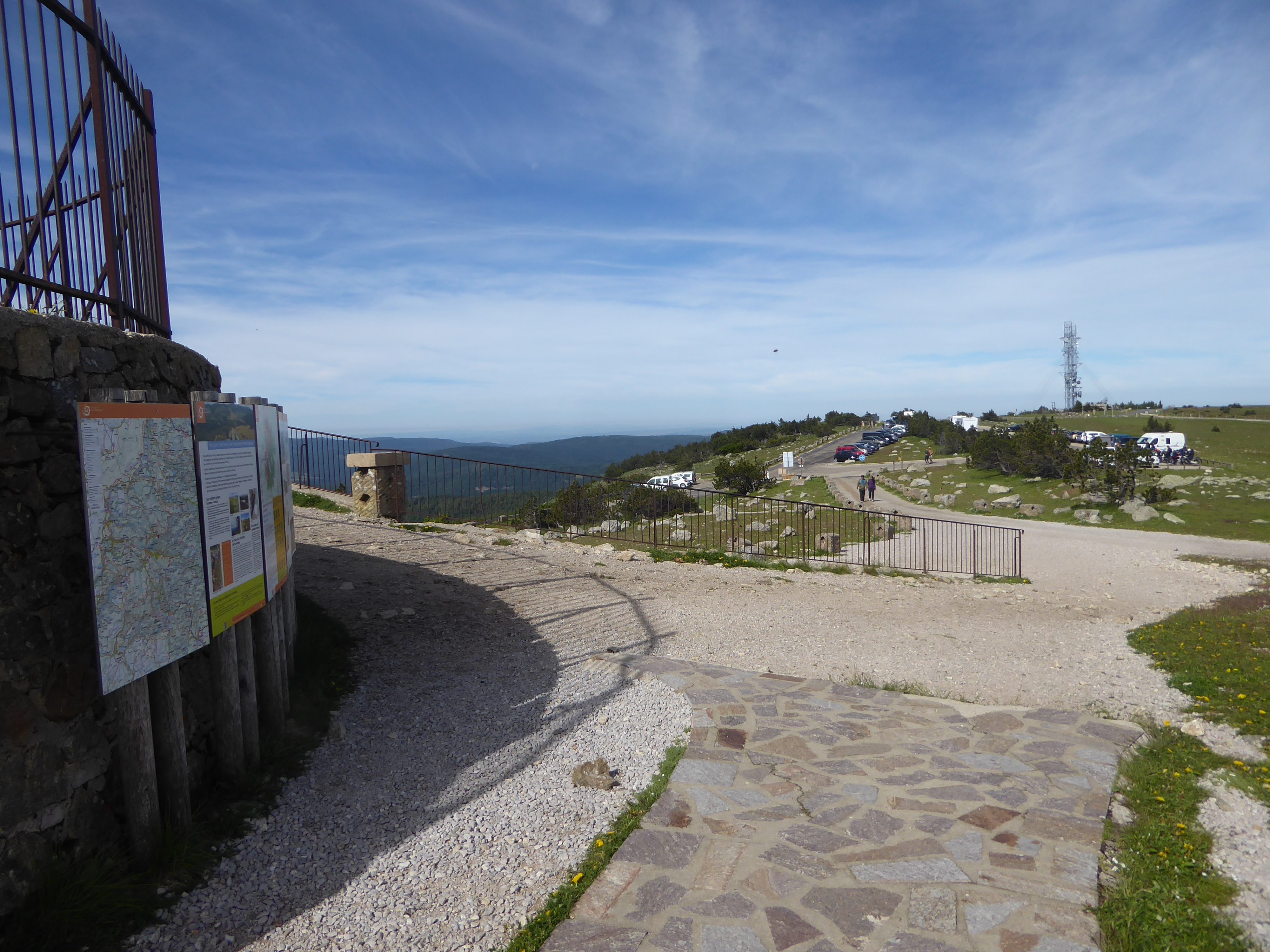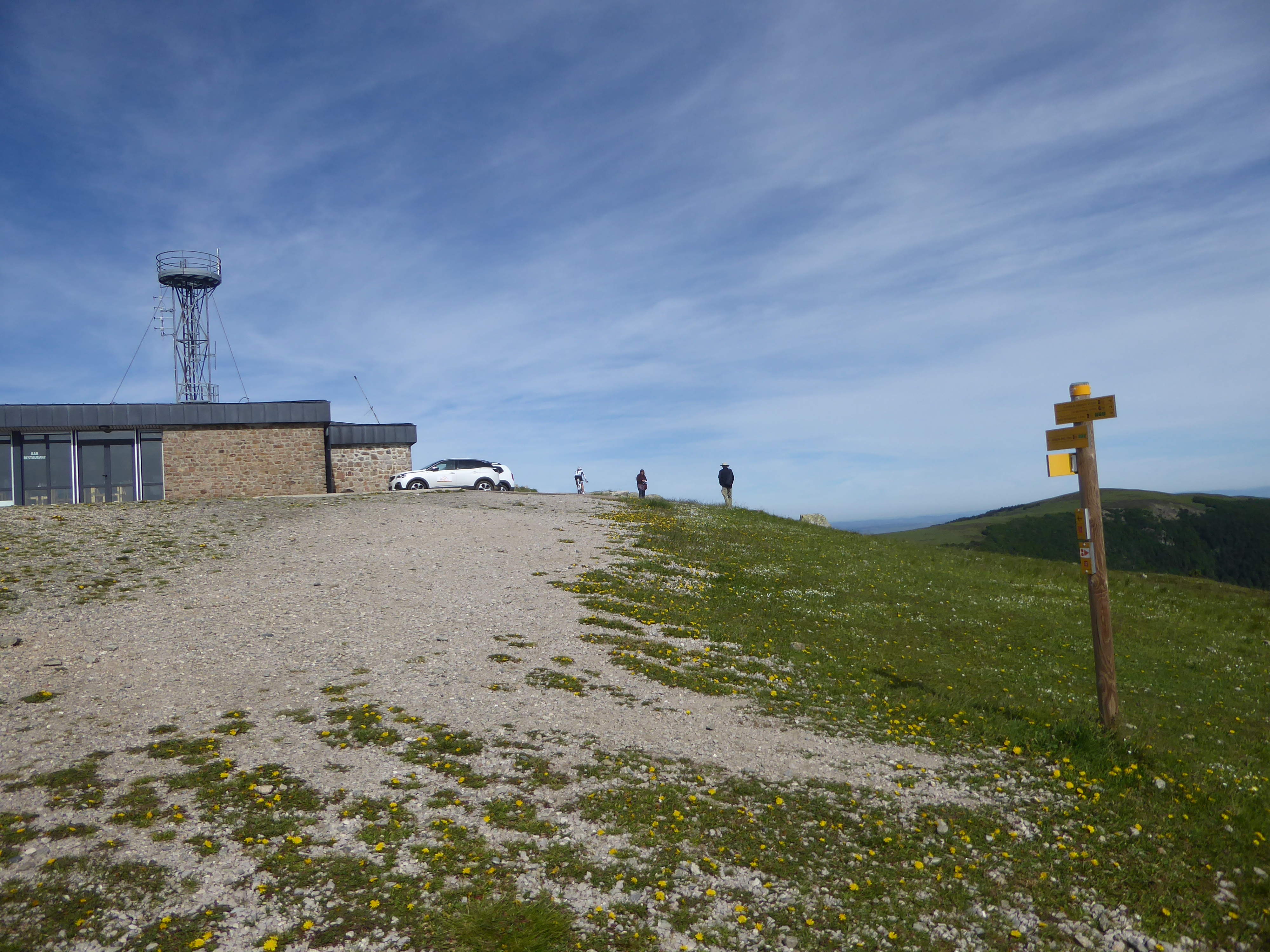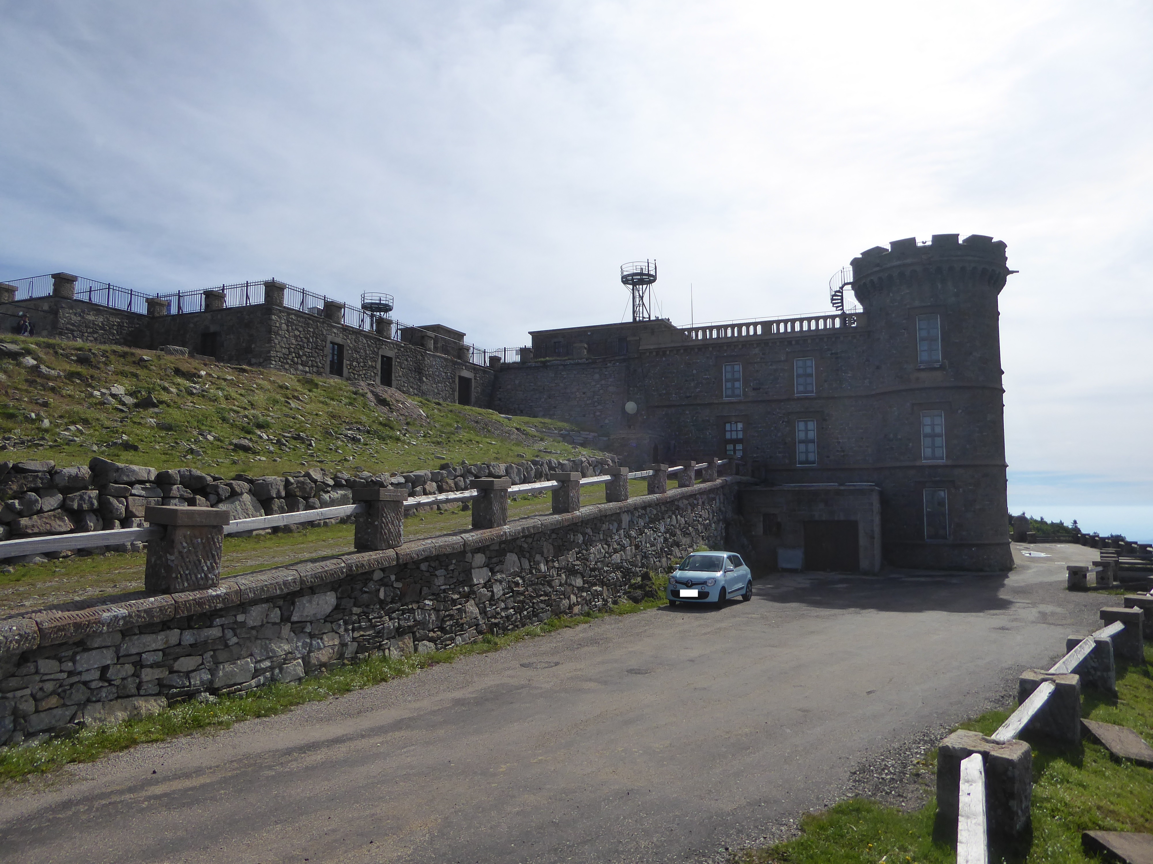 Arrivée au sommet du Mont Aigoual (1567 m) : panorama un peu brumeux aujourd'hui avec une vue quasi complète sur les Cévennes et sur la plaine jusqu'au littoral ... la station météorologique est omniprésente !