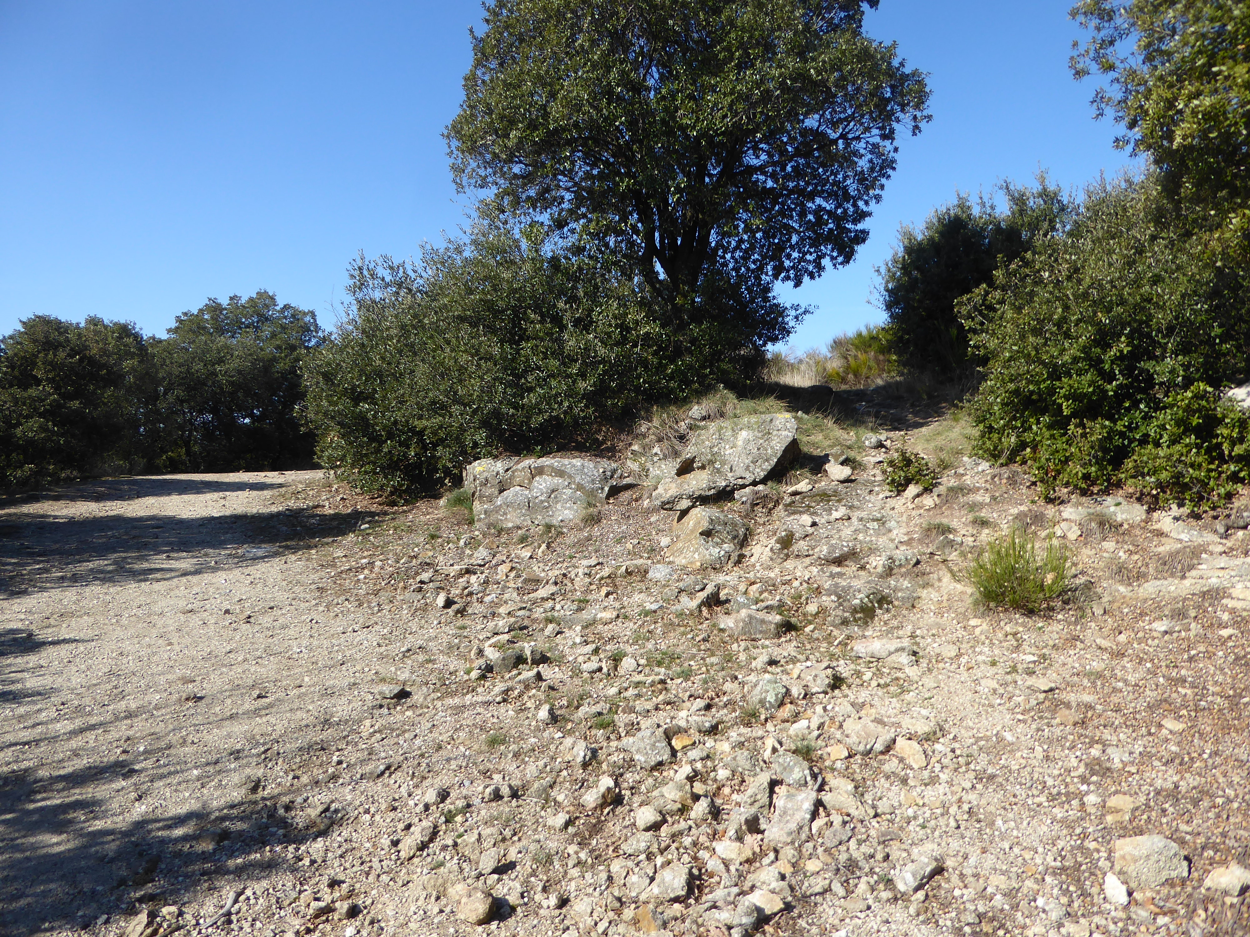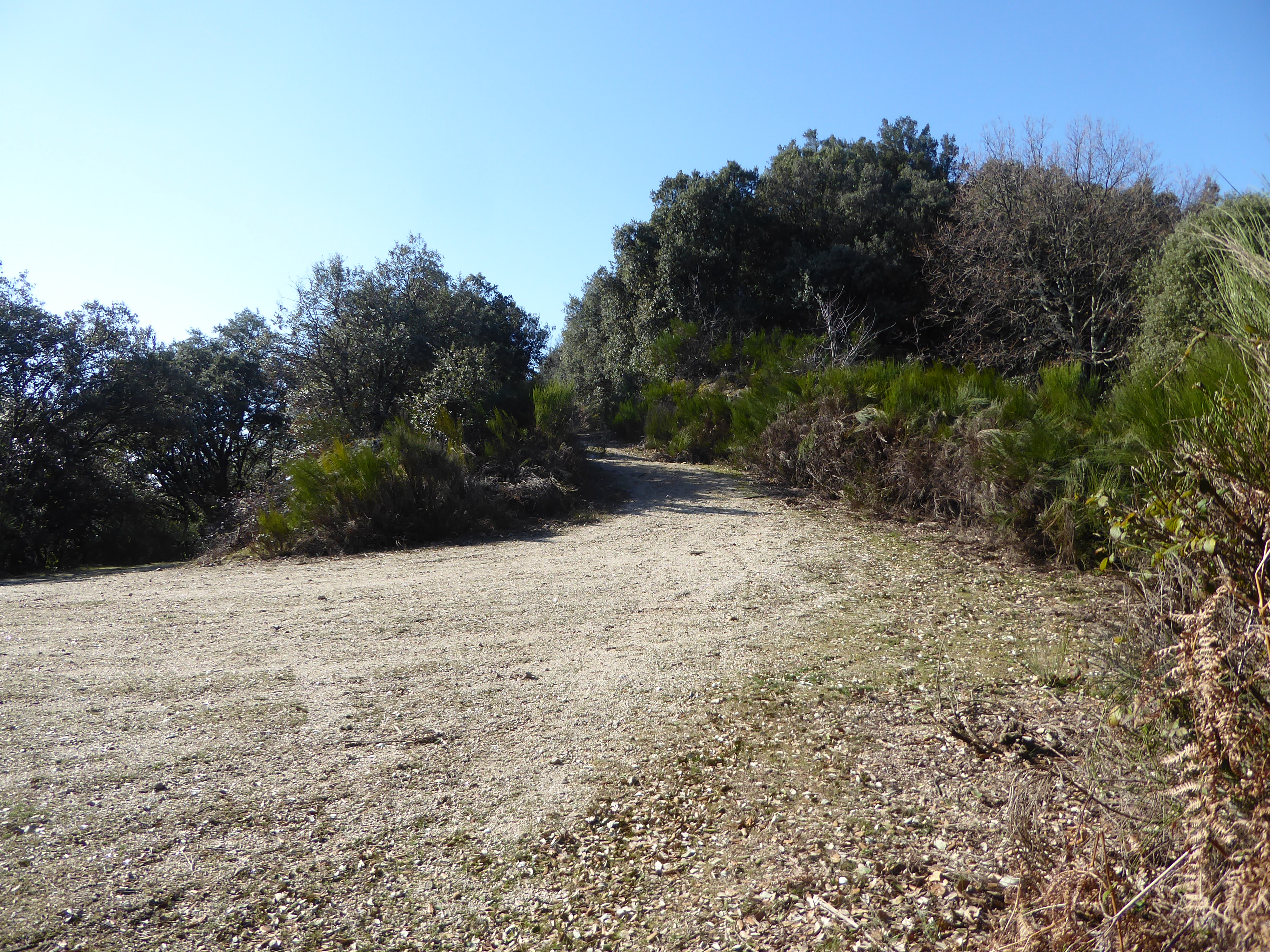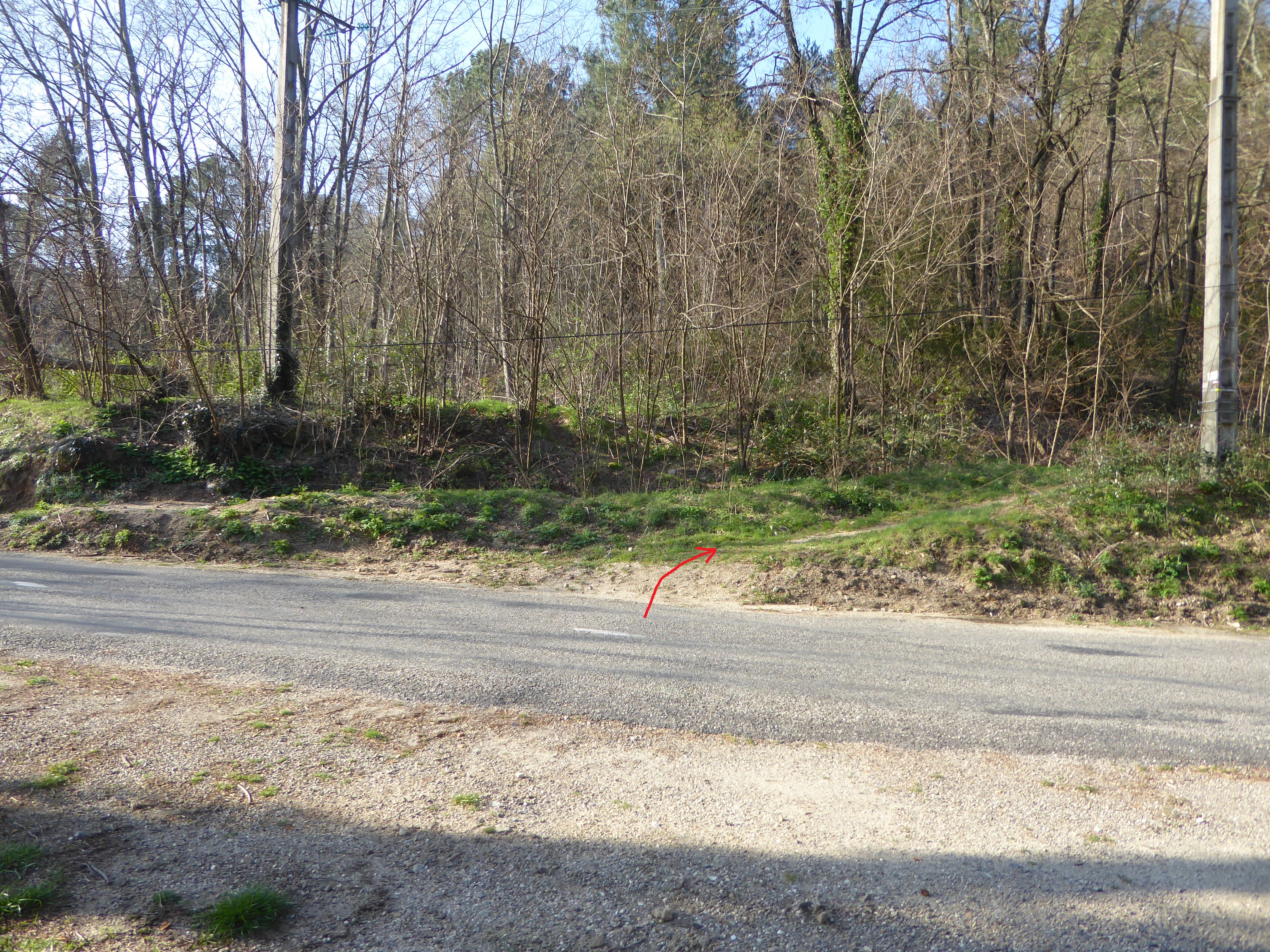 A ce croisement (200 mètres après avoir rejoint la route), suivre le chemin partant légèrement sur la gauche et longeant la route direction Saint-Jean-du-Gard, balisé en rouge et blanc, et jaune
